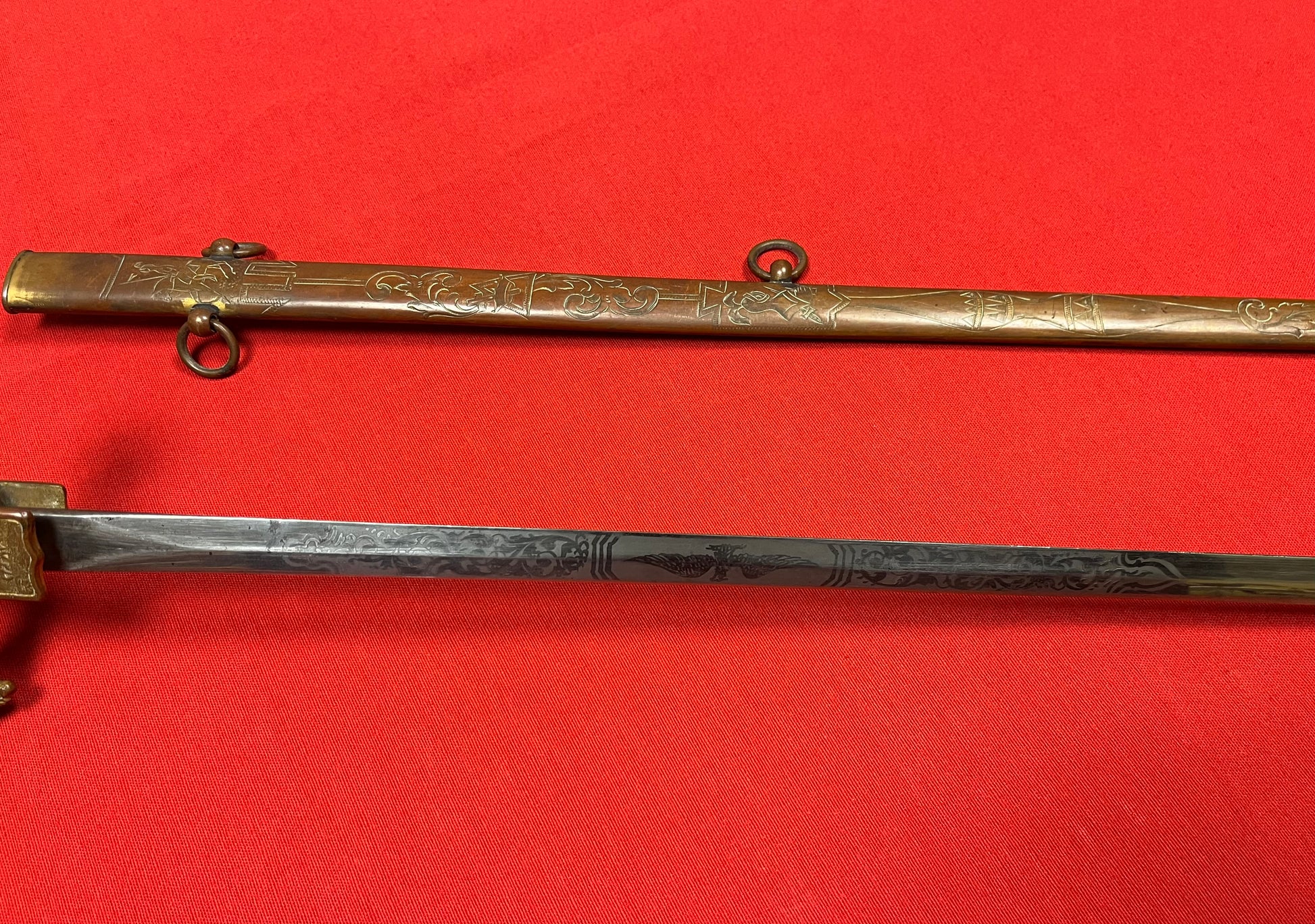 German made blade engraved on both sides by SCHNITZLER. Scabbard is also beautifully engraved (light dent near the drag) Overall size 35.50” Blade 28”