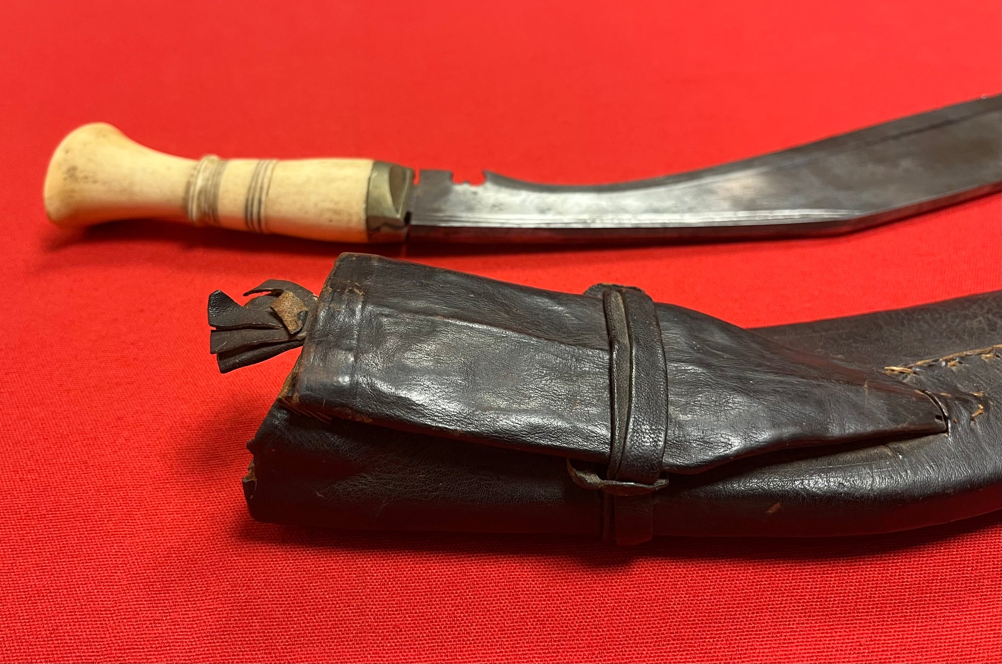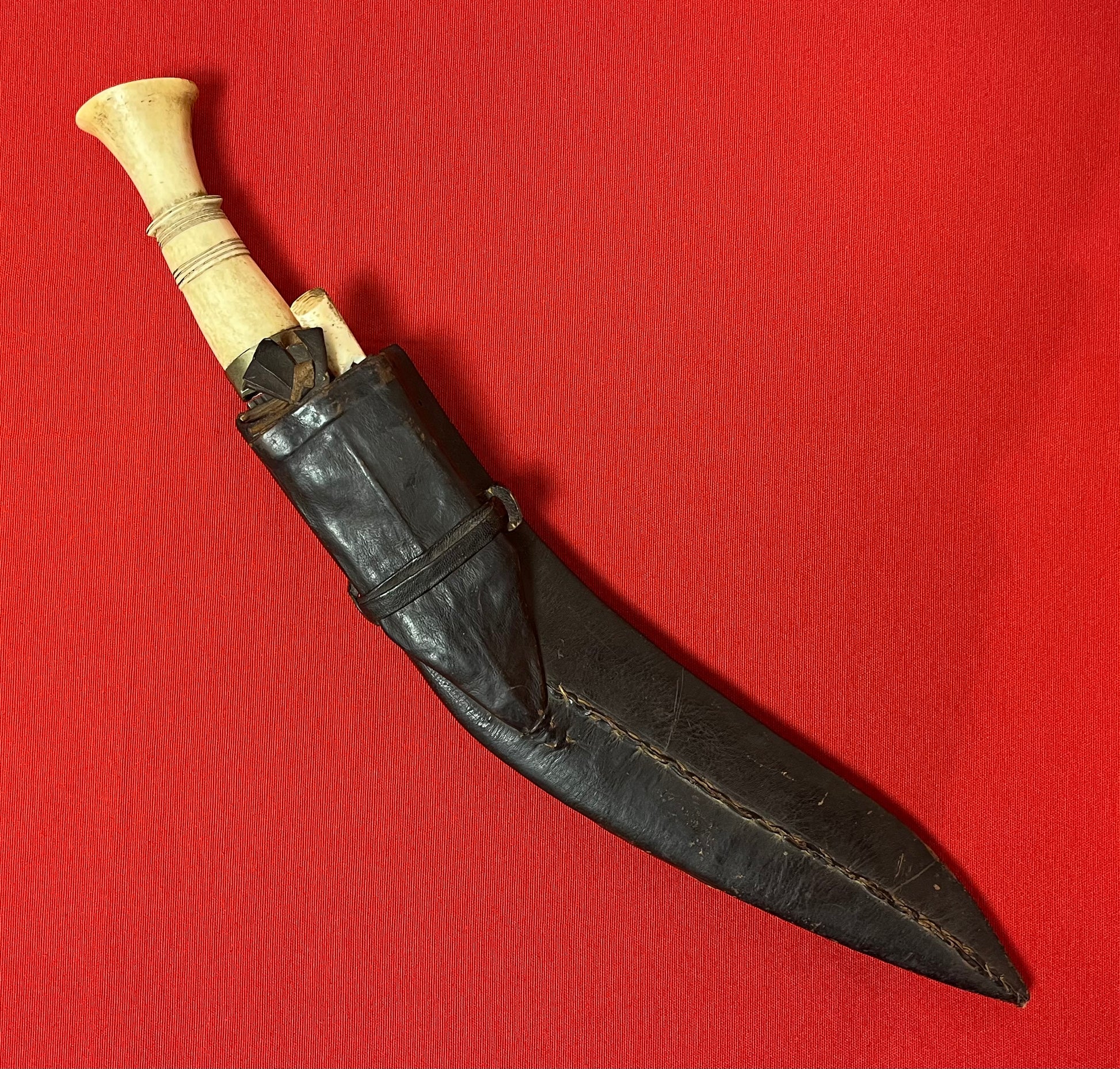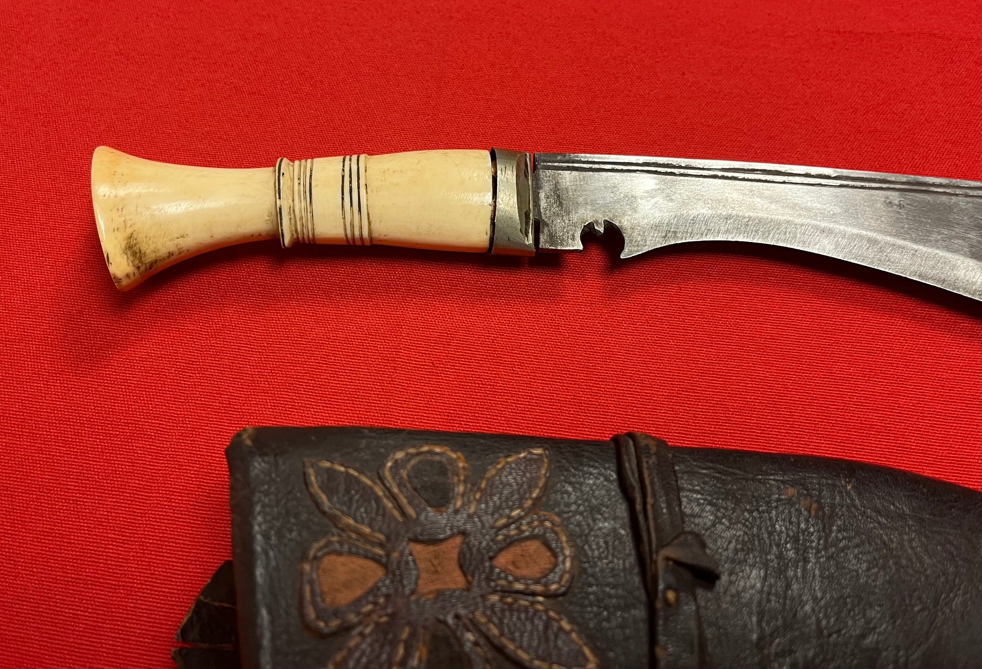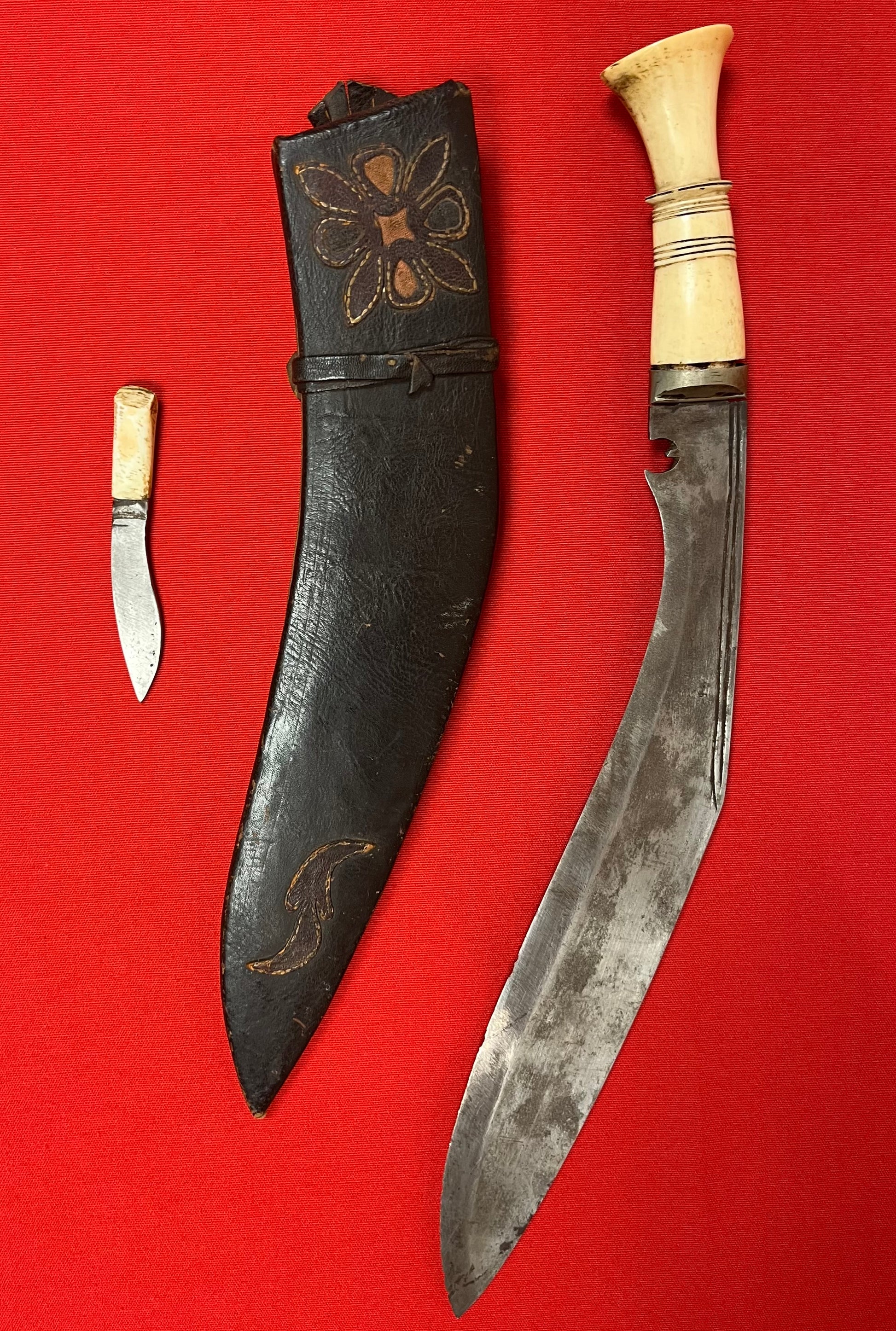 Circa 1880’s Nepal / Fighting knife / 18 inches long overall / 13 1/4 inch blade / Bone handle is engraved with original owners initials on the pommel / Some imperfections with age and use in combat… Silver end-cap is loose where blade connects to handle on the larger knife, smaller blade has a bone piece missing, leather scabbard has two non-structural cuts on both sides from being drawn in and out, second smaller knife is missing