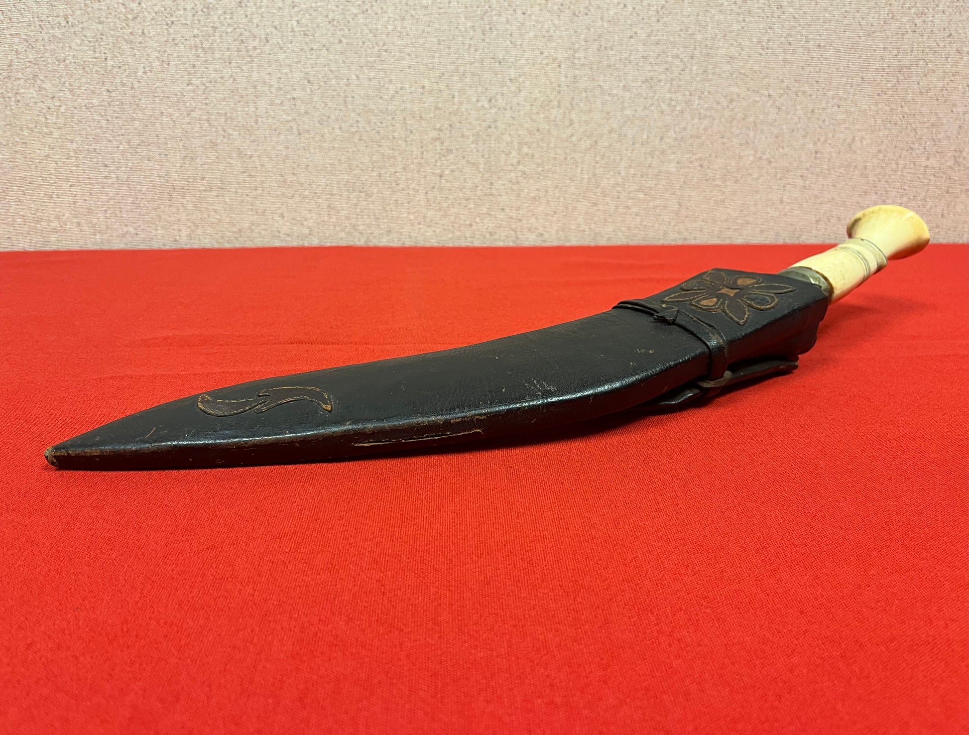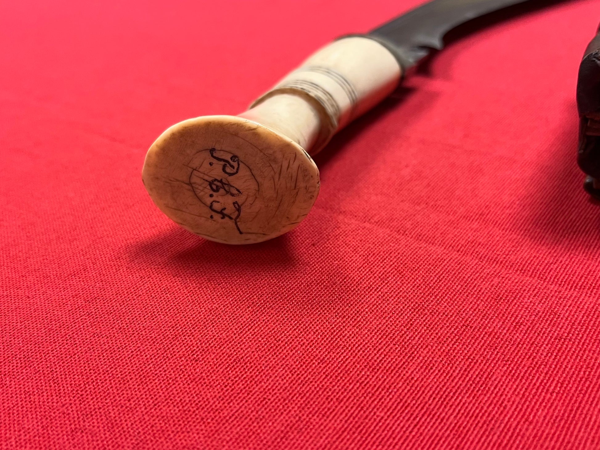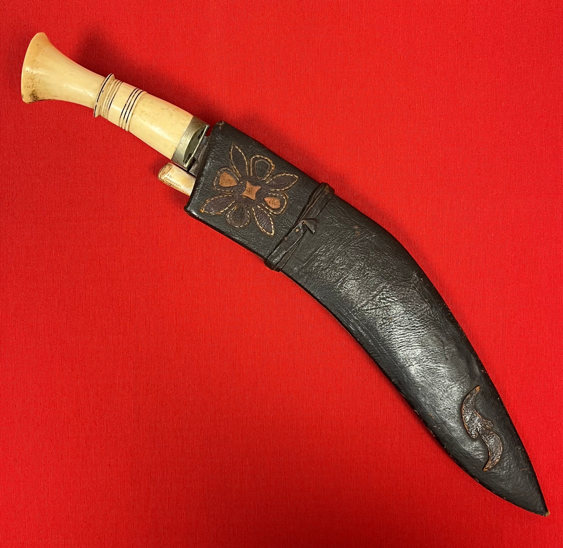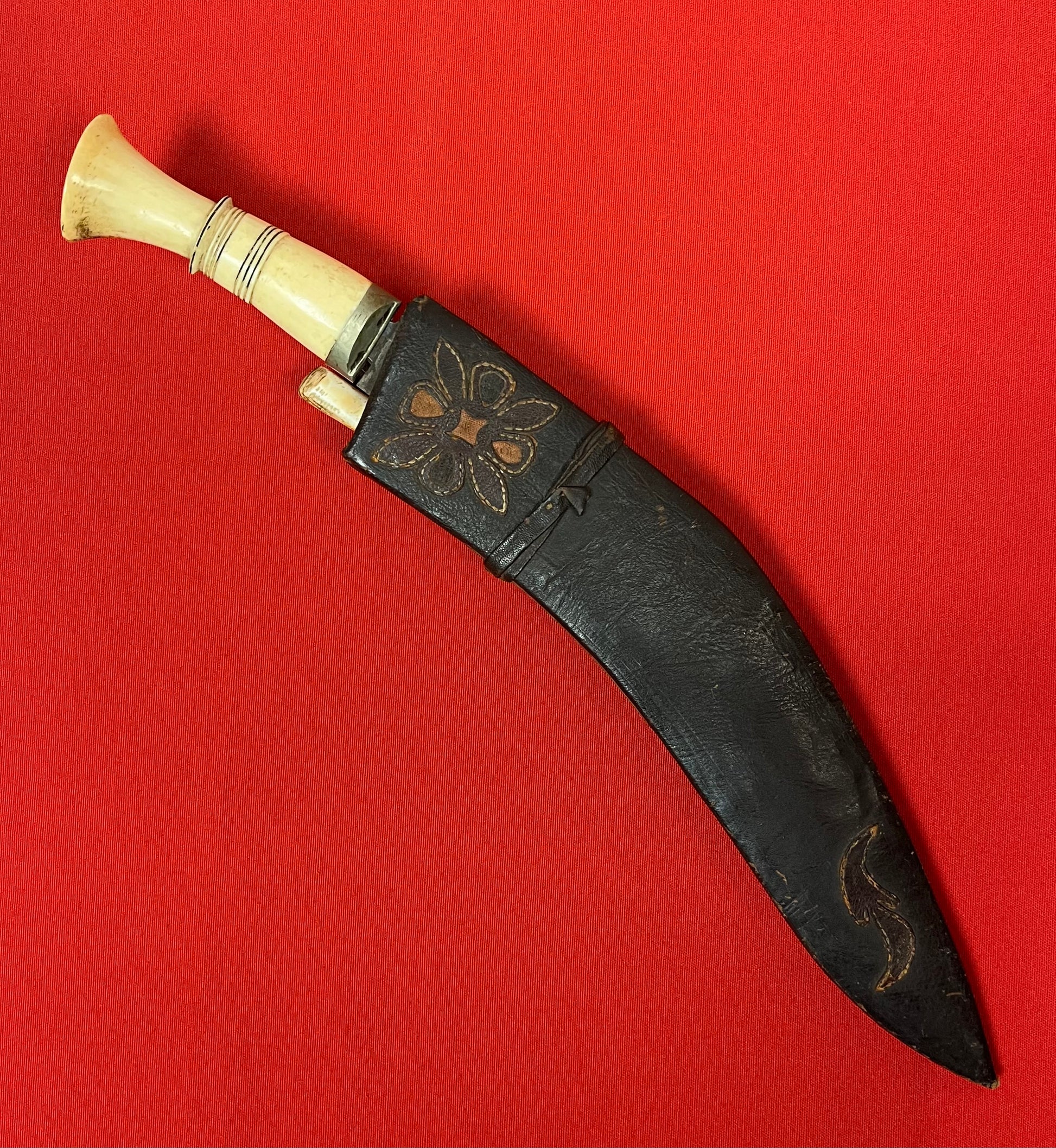 Circa 1880’s Nepal / Fighting knife / 18 inches long overall / 13 1/4 inch blade / Bone handle is engraved with original owners initials on the pommel / Some imperfections with age and use in combat… Silver end-cap is loose where blade connects to handle on the larger knife, smaller blade has a bone piece missing, leather scabbard has two non-structural cuts on both sides from being drawn in and out, second smaller knife is missing
