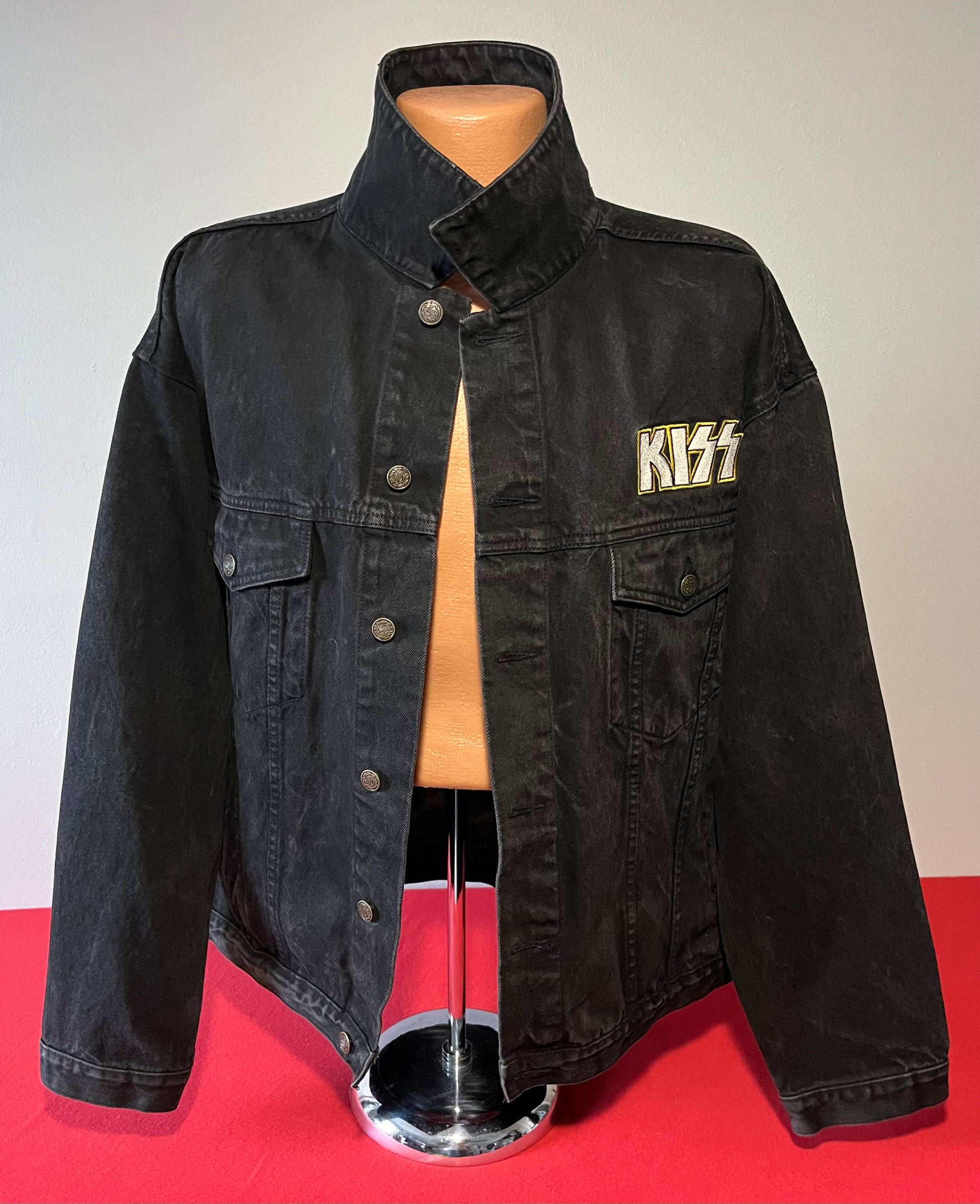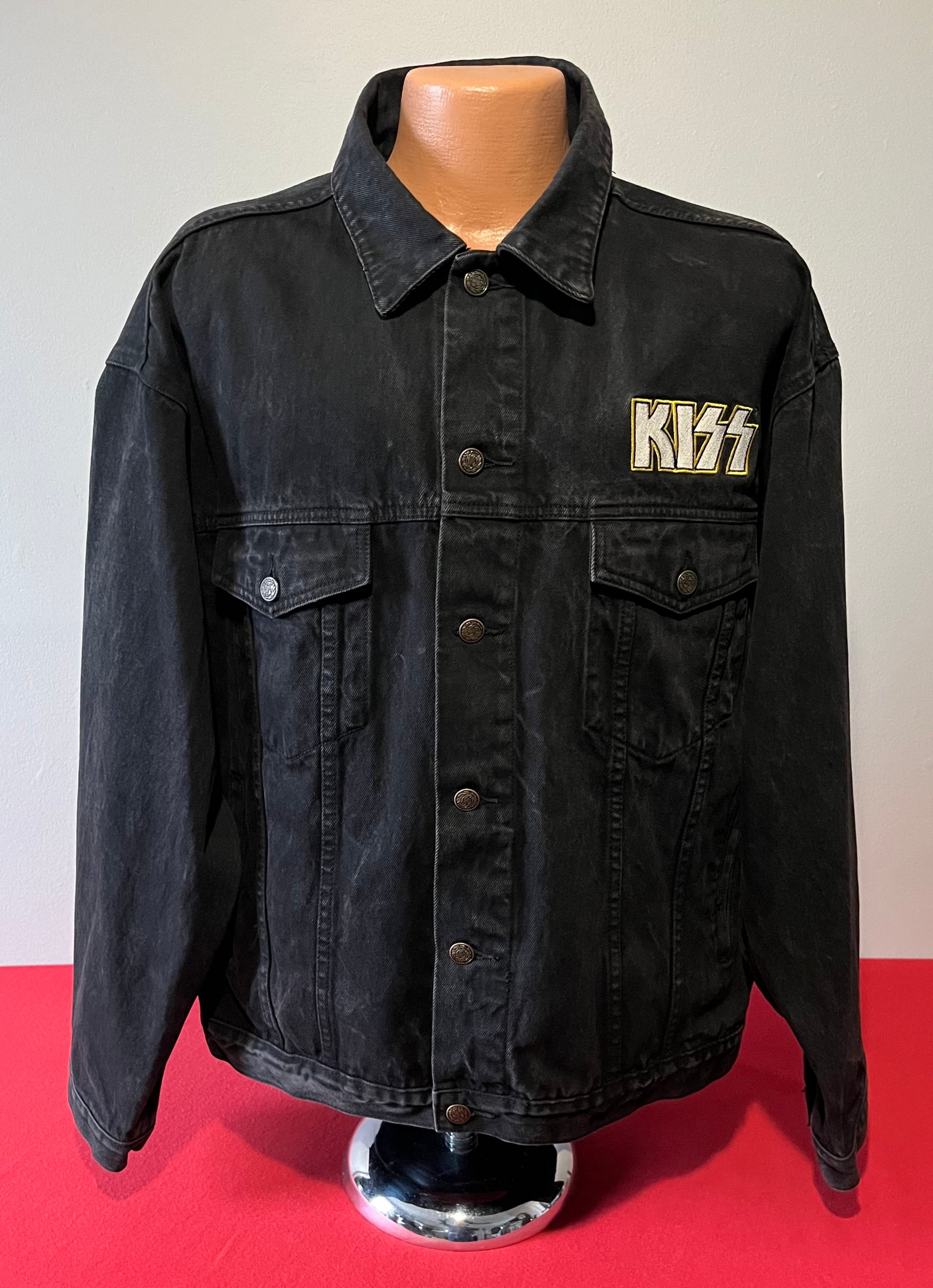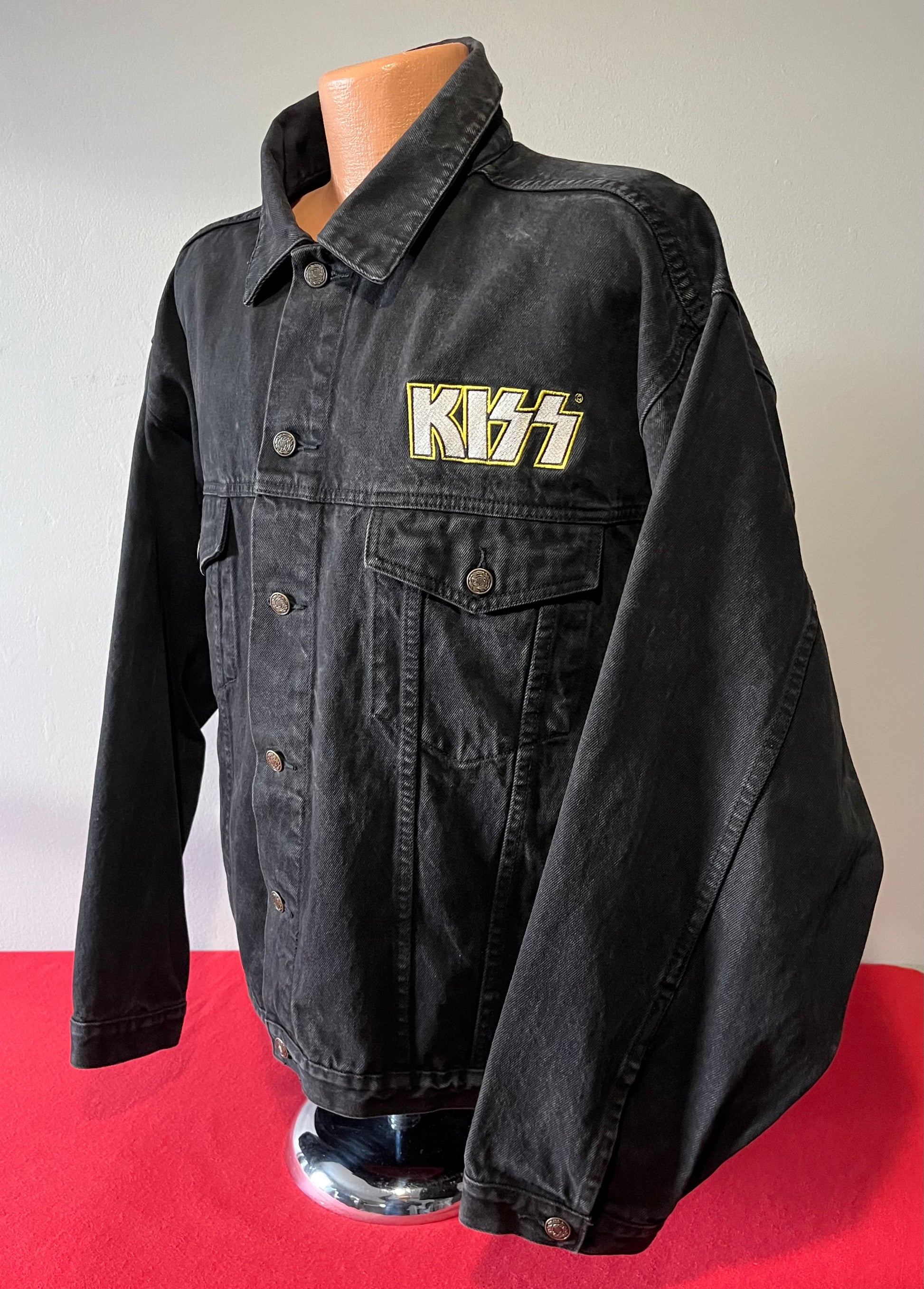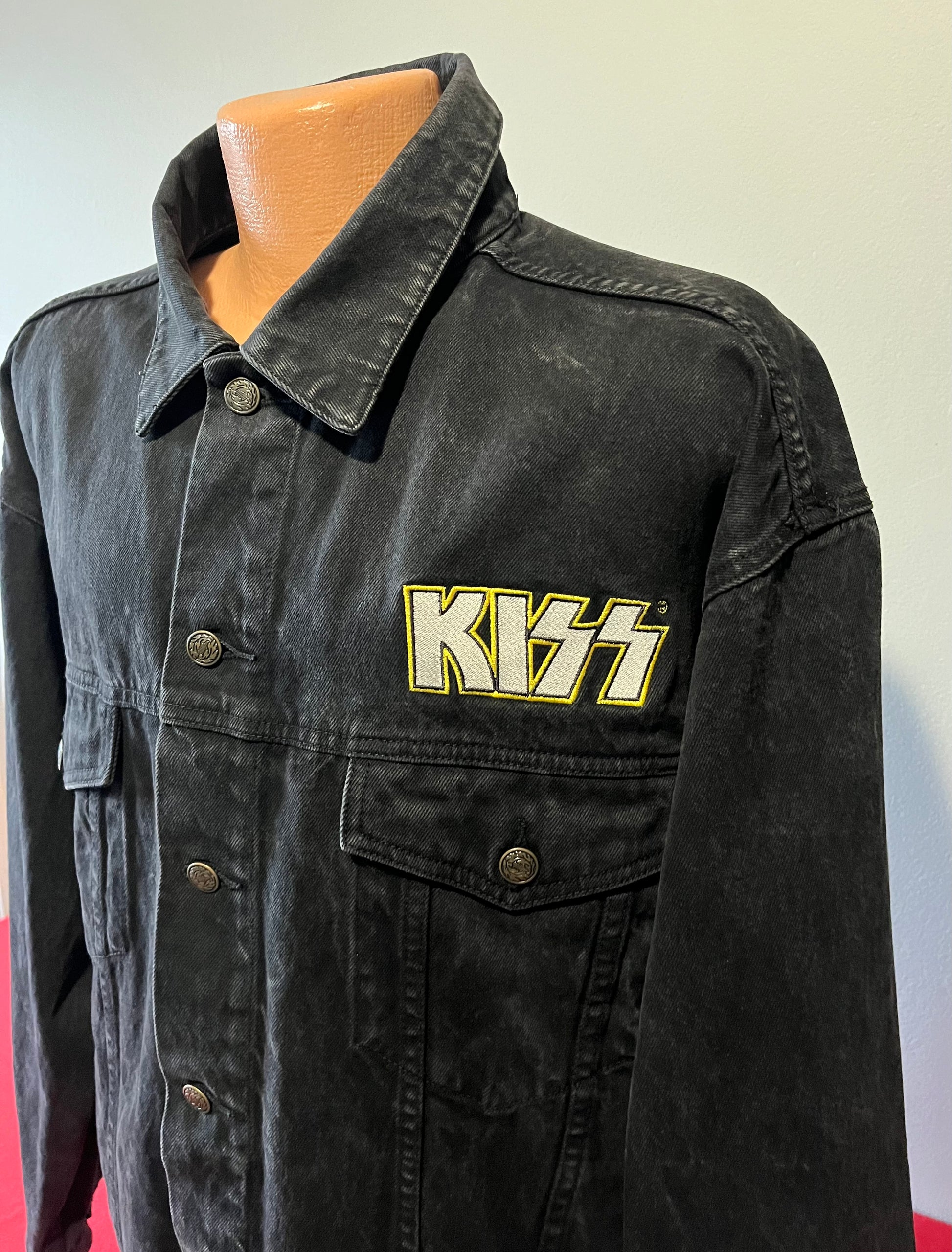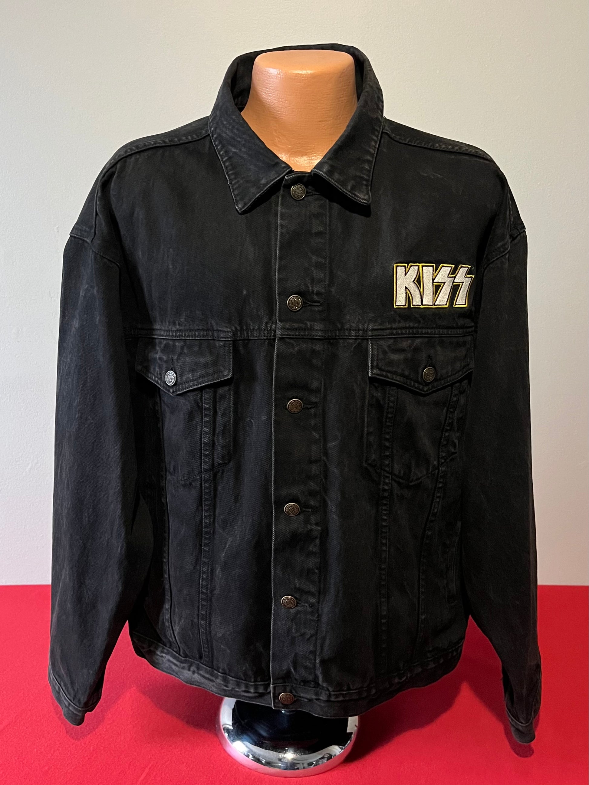 1990's / Kiss Catalog LTD / Black / Denim Jacket / Vintage / 100% Cotton with labels / Made by PRIME PIME Merchandise RN # 94576 Size XL / Dimensions 24" shoulder seam to shoulder seam / 24" arm / 26" long / 24" across chest