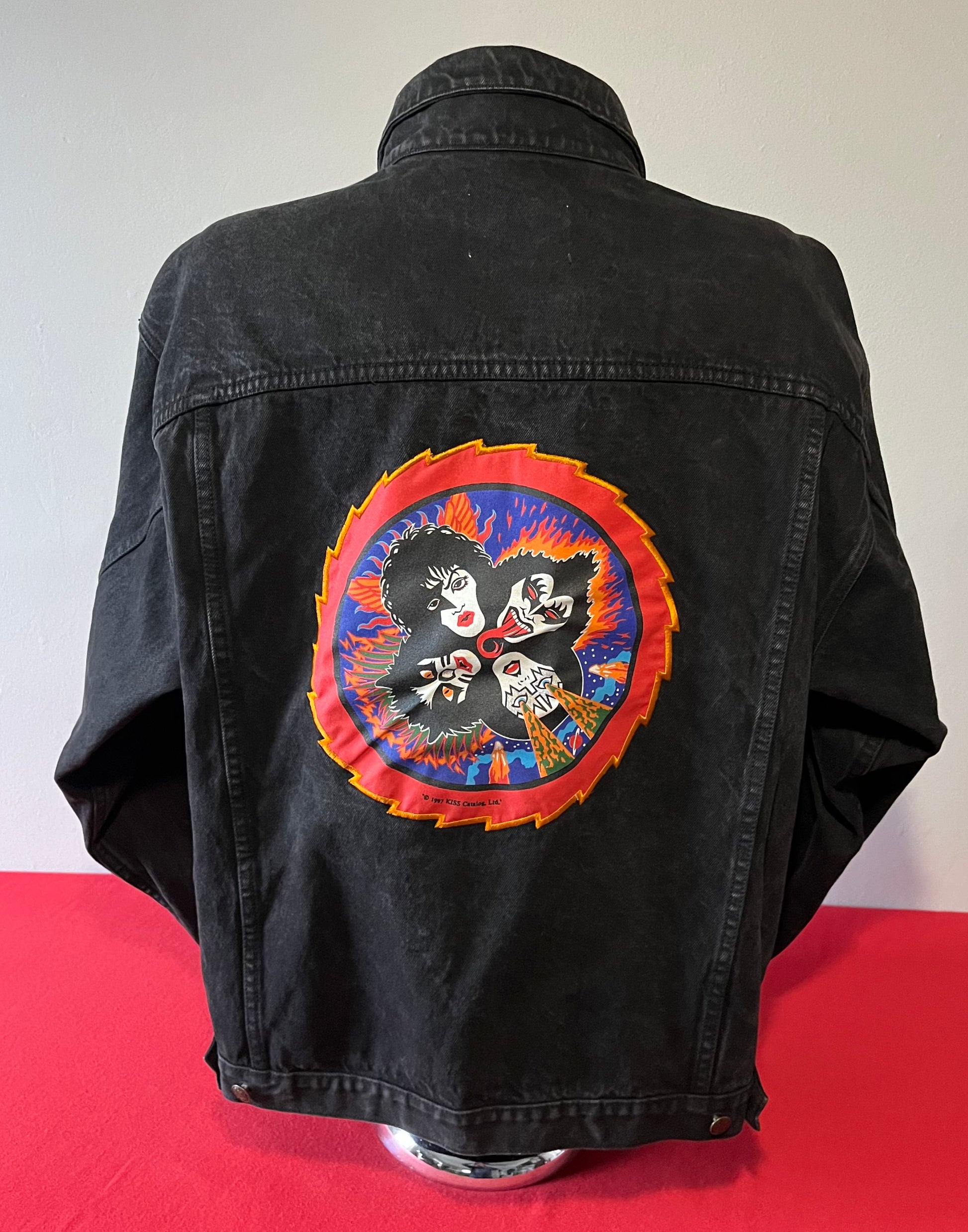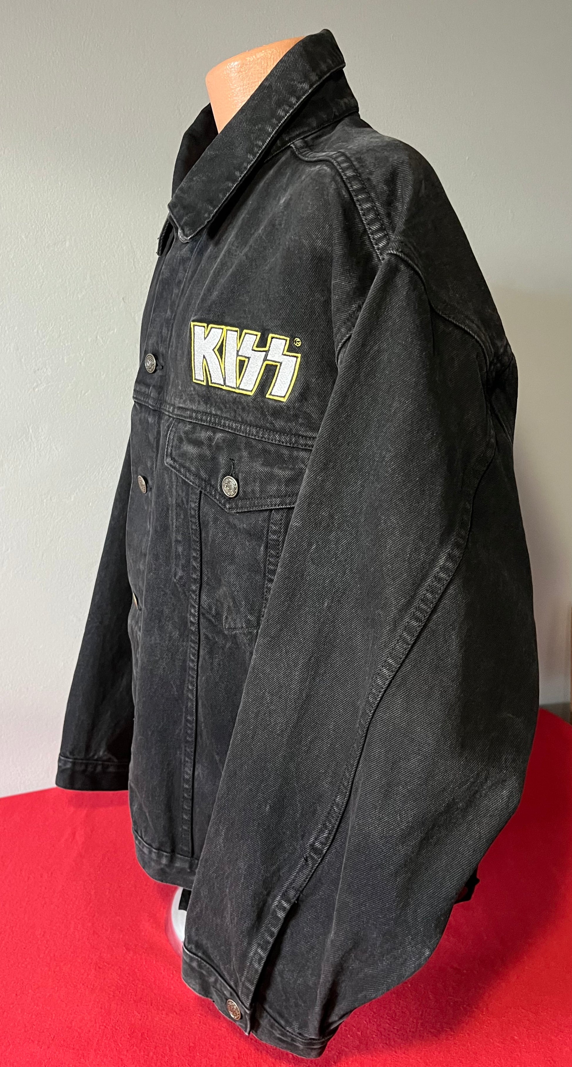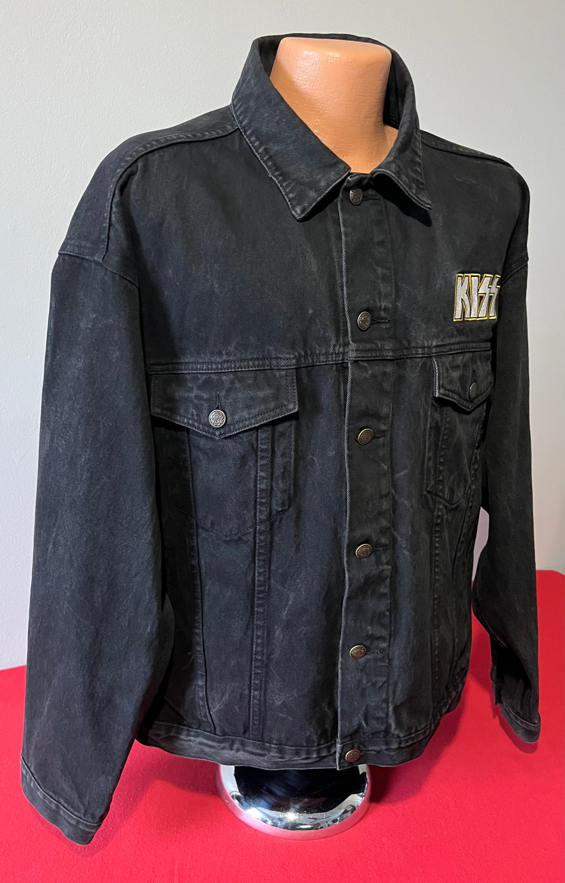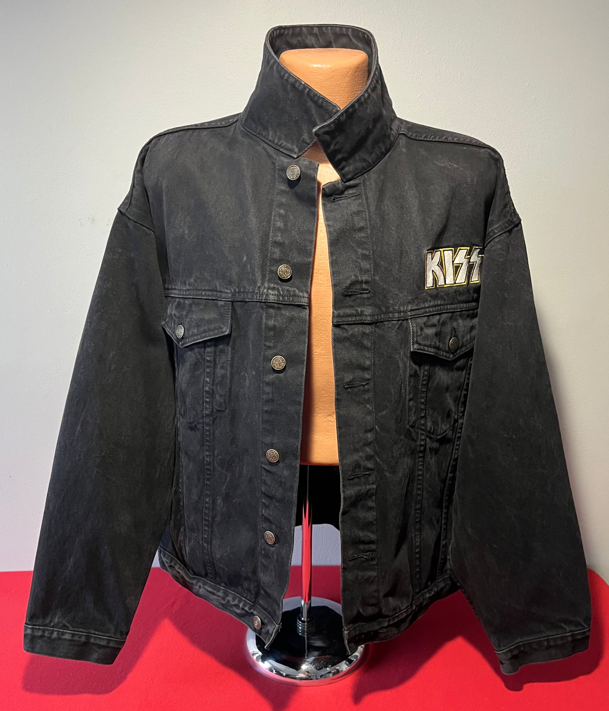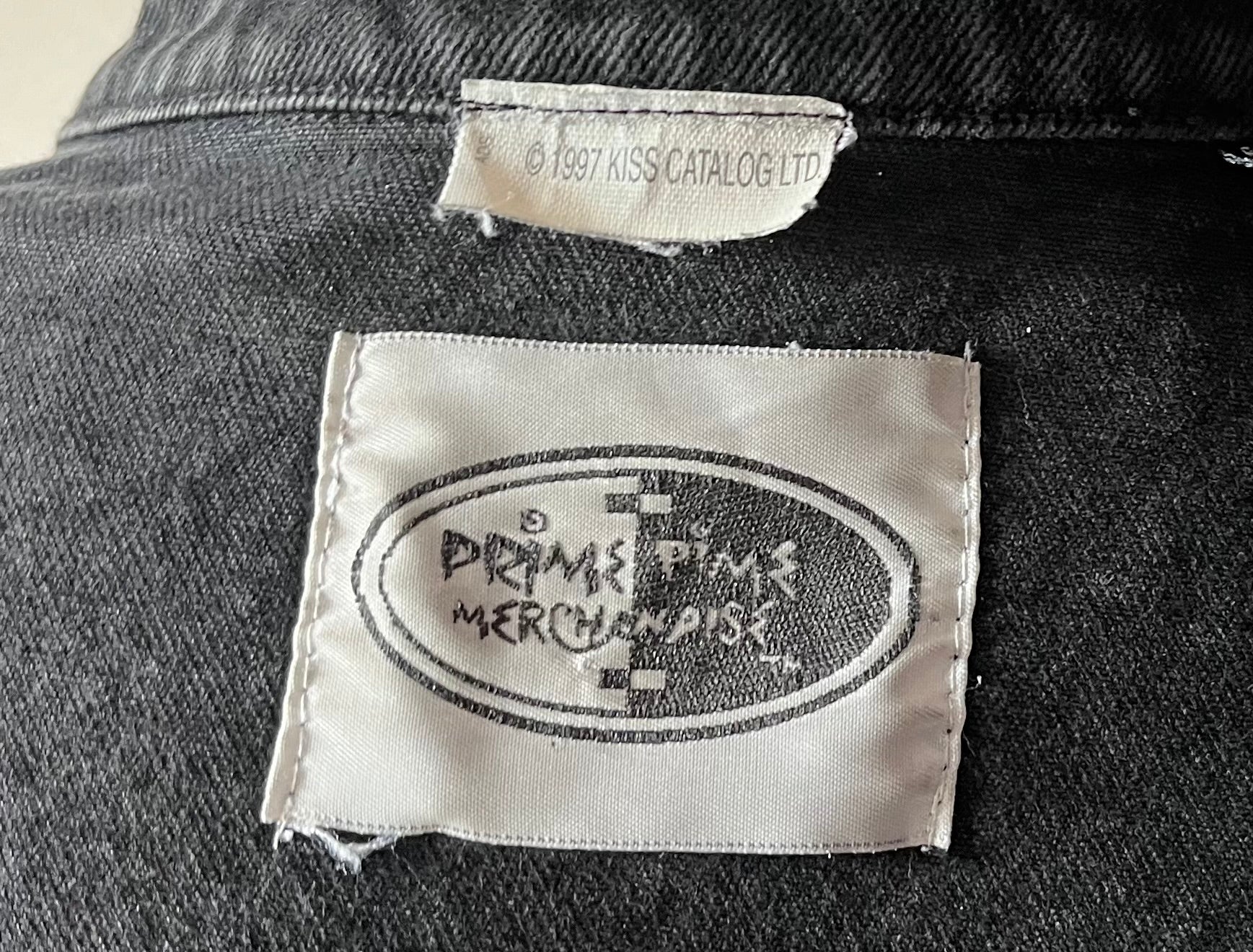 1990's / Kiss Catalog LTD / Black / Denim Jacket / Vintage / 100% Cotton with labels / Made by PRIME PIME Merchandise RN # 94576 Size XL / Dimensions 24" shoulder seam to shoulder seam / 24" arm / 26" long / 24" across chest