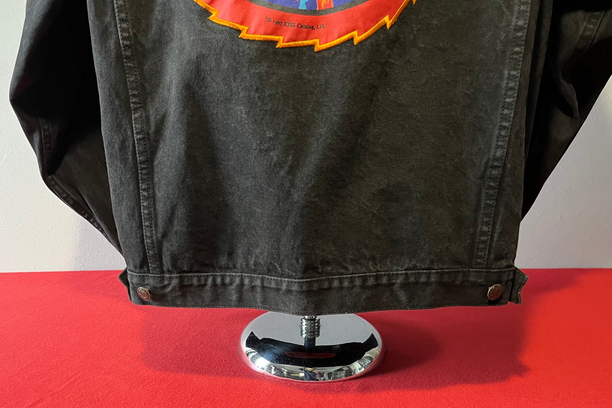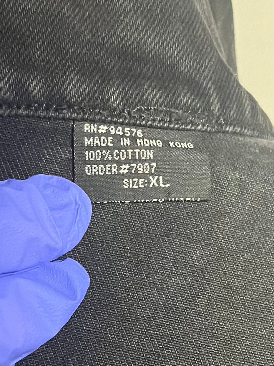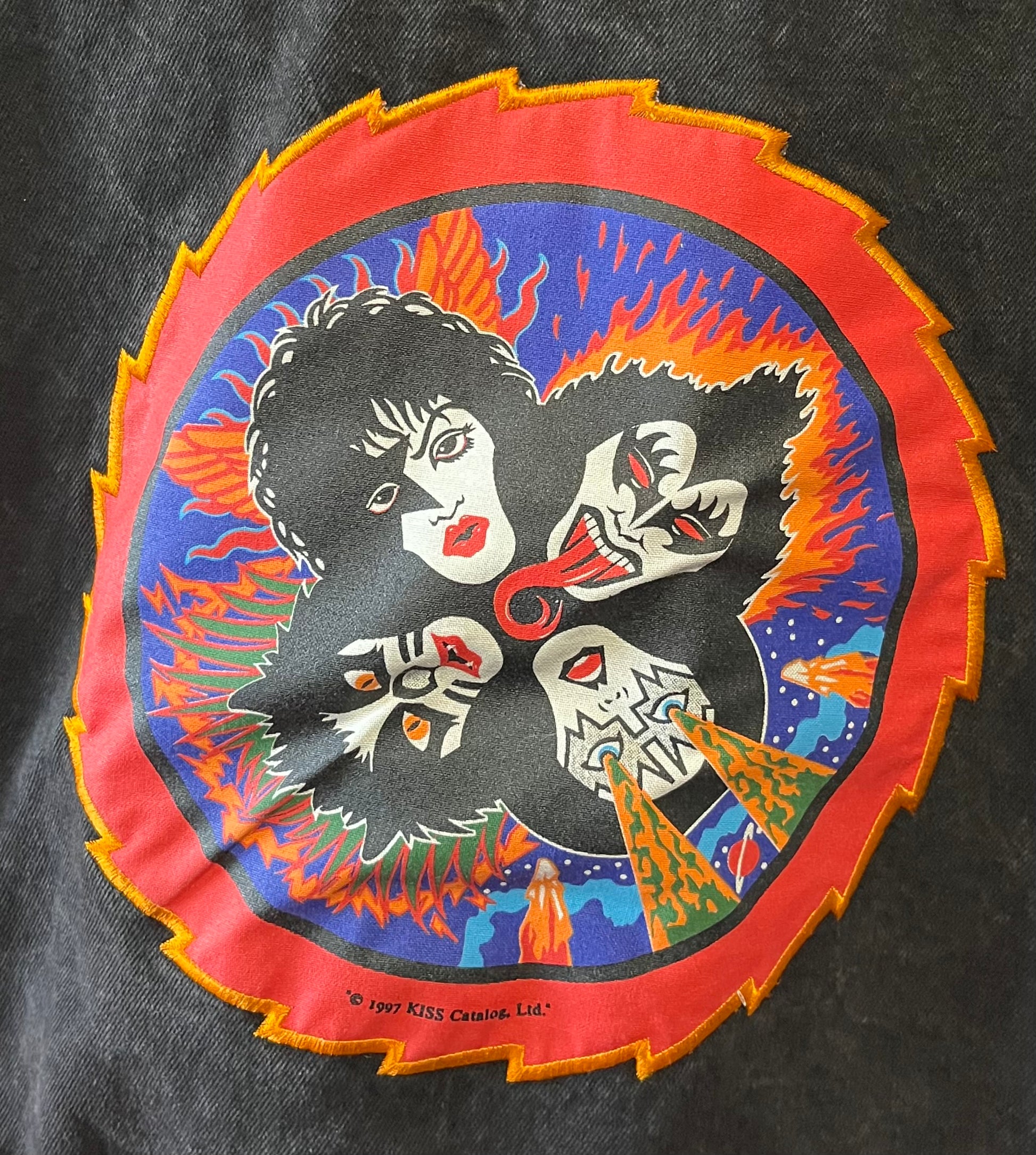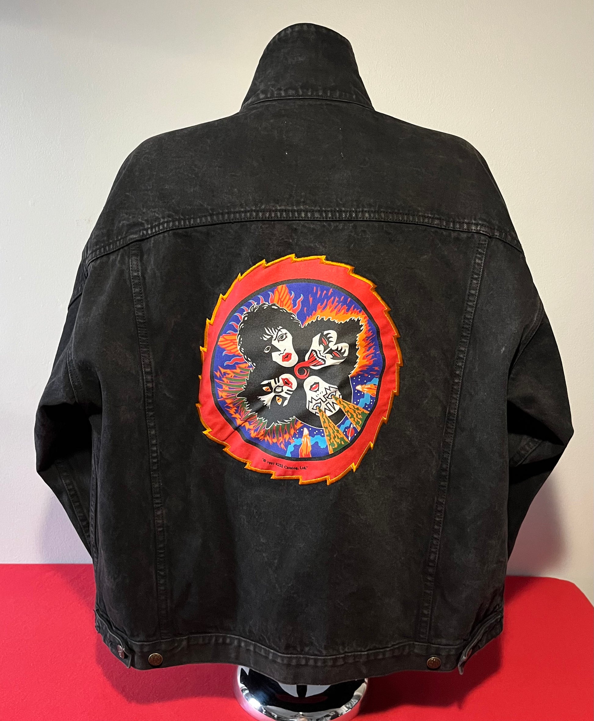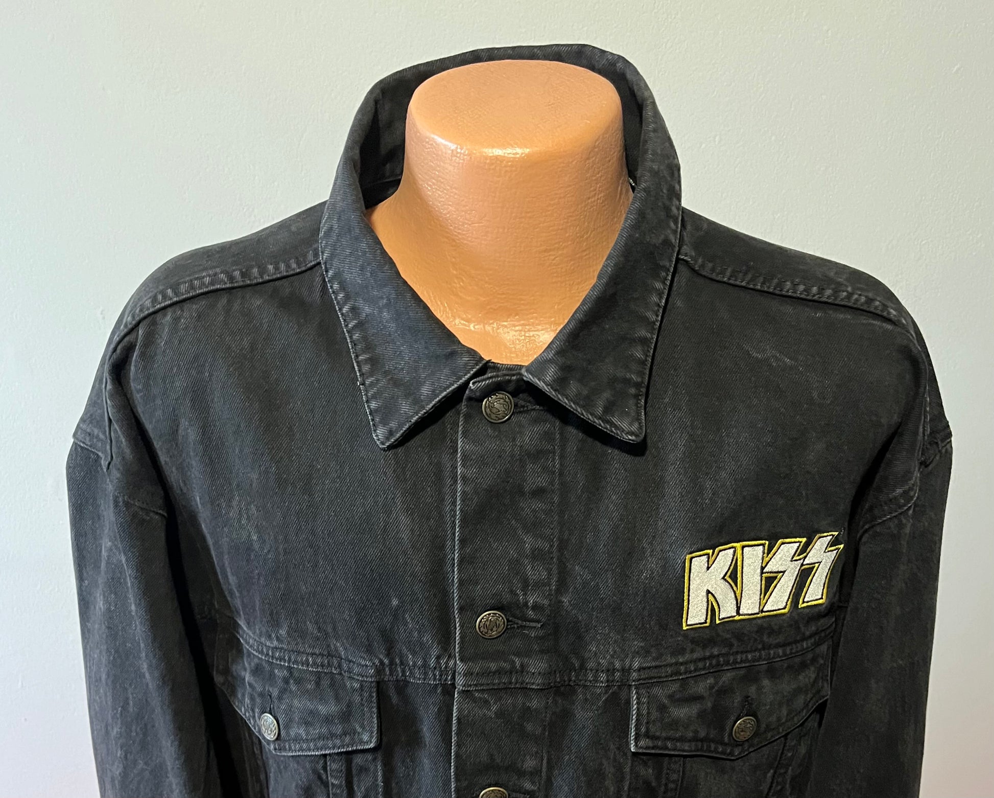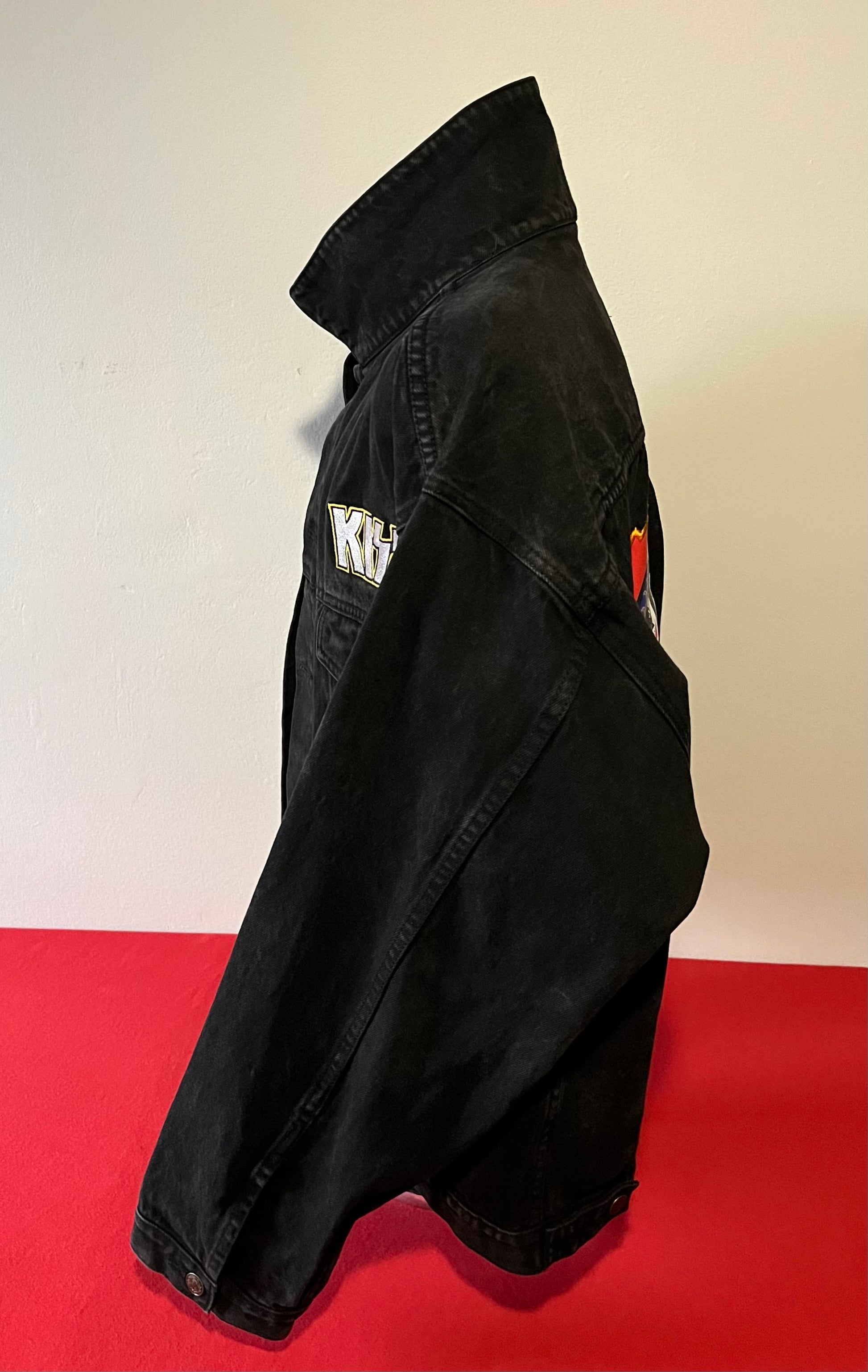 1990's / Kiss Catalog LTD / Black / Denim Jacket / Vintage / 100% Cotton with labels / Made by PRIME PIME Merchandise RN # 94576 Size XL / Dimensions 24" shoulder seam to shoulder seam / 24" arm / 26" long / 24" across chest