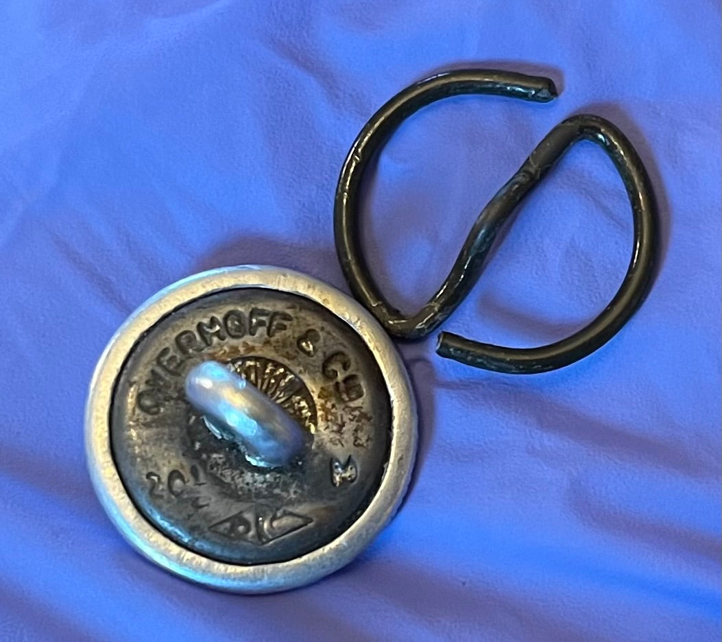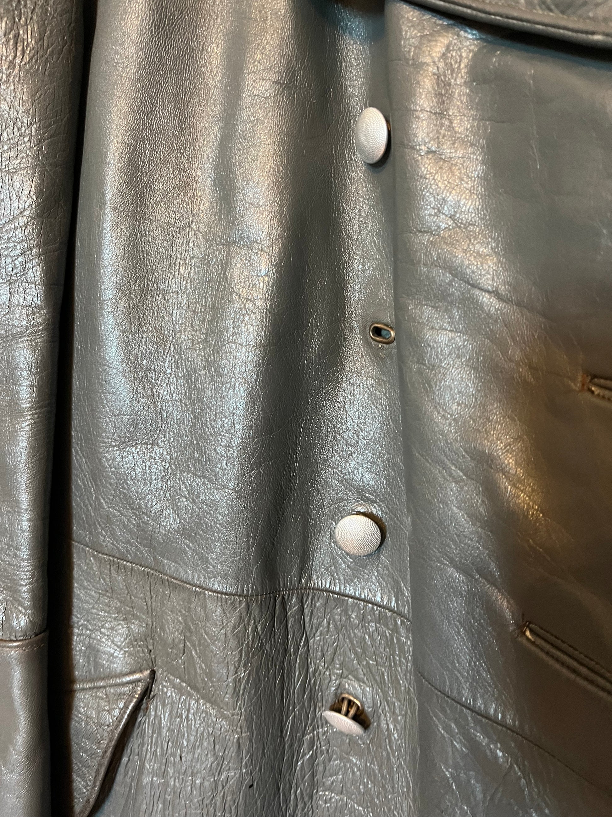 Original WW2 German / Leather (heavy) trench coat / Complete with inner hanger and shoulder board mounts / Grey in color / All buttons present / Maker- Omerhoff & Co) on the one I removed for photographing "shown" in pictures / Silver in color with a pebbled face / Smaller snaps back marked PRYM / Blacklight test passed on threaded areas / Size of coat- 53" long / 21" shoulder to shoulder / 26" Arm / Back of coat has a pulled seam where leather strap is fixed "Left side" shown in pictures / Authenticity GuaranteedÂ