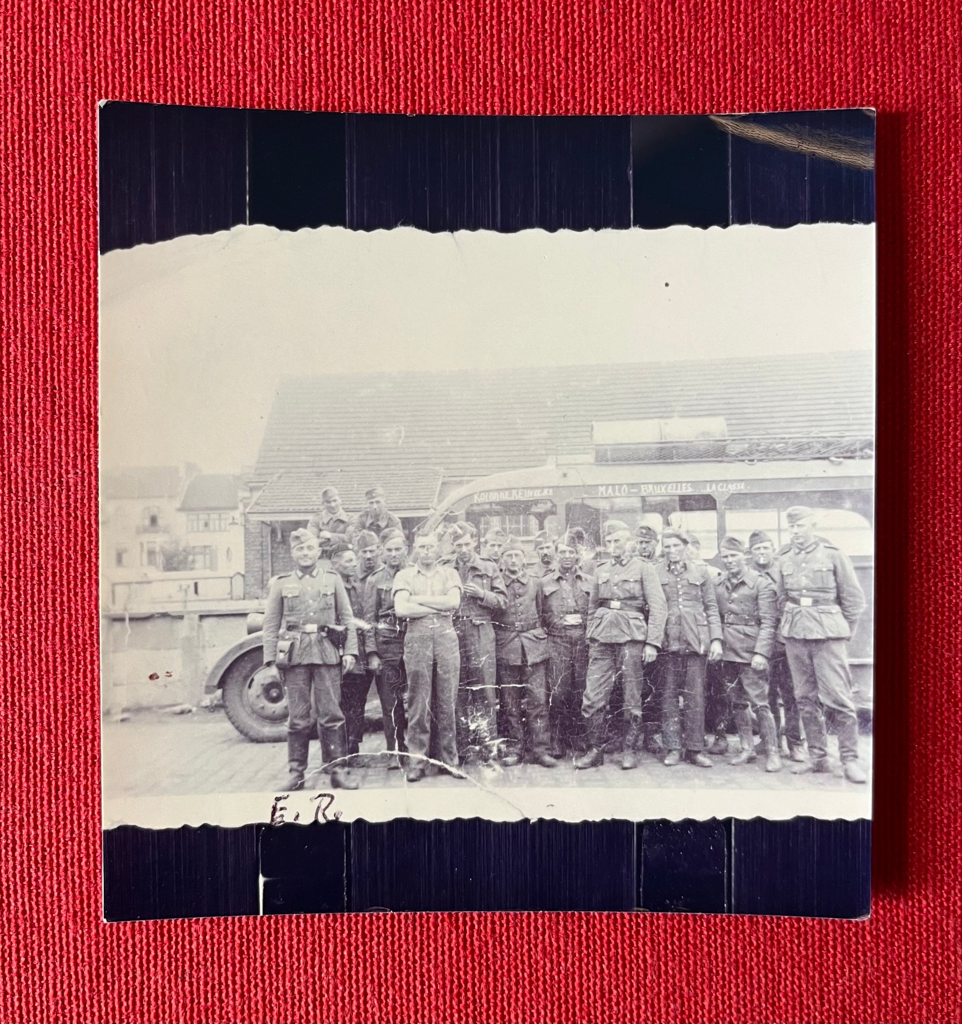 1937 Issued and stamped until 1945 “named” Erich Reinecke (Bus Driver) of French prisoners of war / 2 photos - Self portrait and Reinecke with his bus “name above drivers door” standing on the left, with his French prisoners of war / German to English translation on the back of the photo as well as translated pages from the WEHRPAK shown in pictures / Bus photo size 3 3/8” x 3 2/8” Portrait photo 5 3/8” x 3 3/8” lots of stamps located inside / NSKK “transportation workers” dagger (As typically seen in its black scabbard) Stamped RZM 7/102 blade is “tipped” and cross guard “halved” as well as a crack in the hand guard that has some light repair / In original condition untouched by us (replacement cross guard is an option) We left it authentic / Amazing piece of history… (Time really stands still on this one) Own it today!