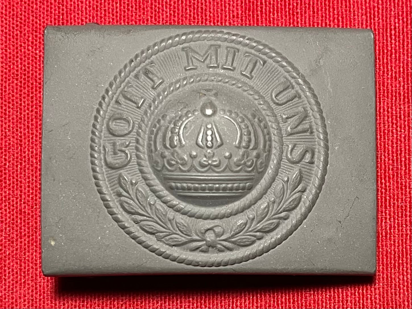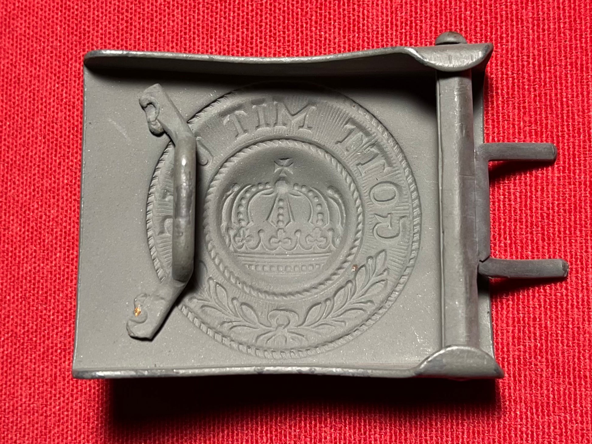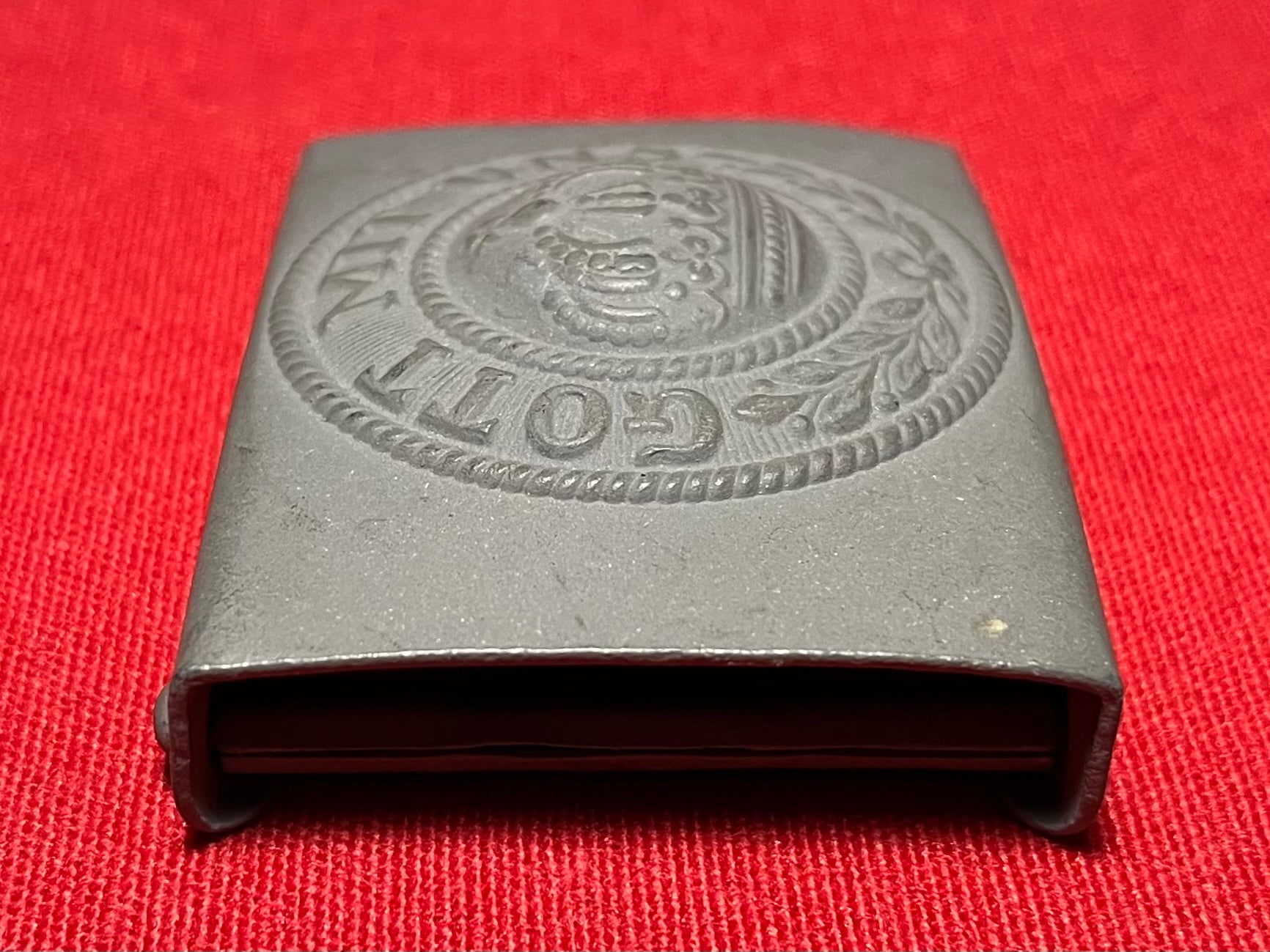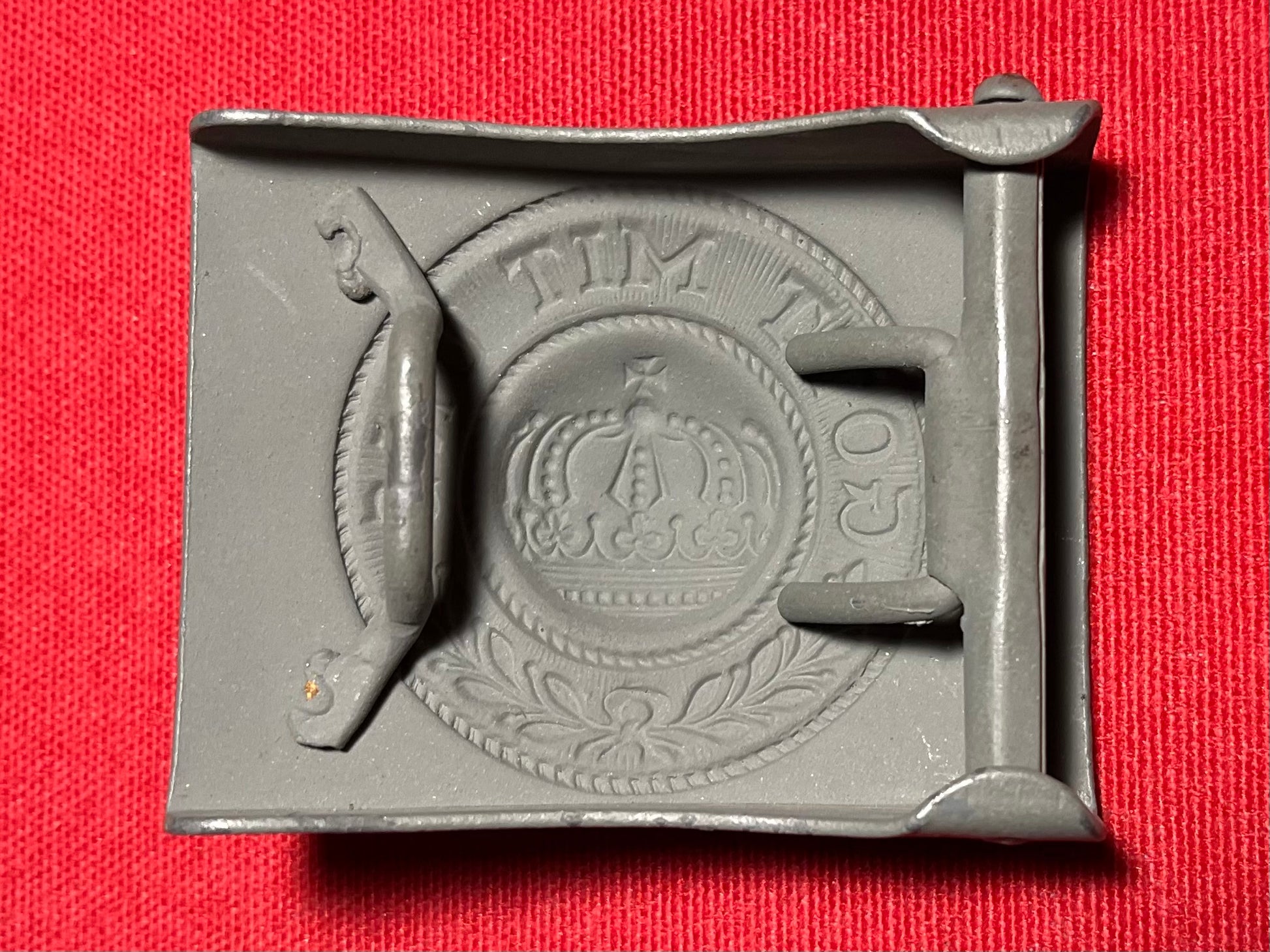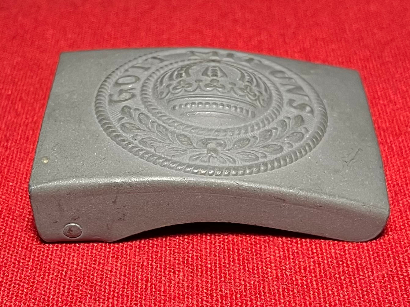 WW1 German "Prussian" Gott Mit Uns "God is with us" crest / Size 2 4/8 x 1 7/8 Inches / Taken from an unissued (original) pack of wrapped buckles. "Minty" examples like these are getting harder to come by / Please inquire with any questions