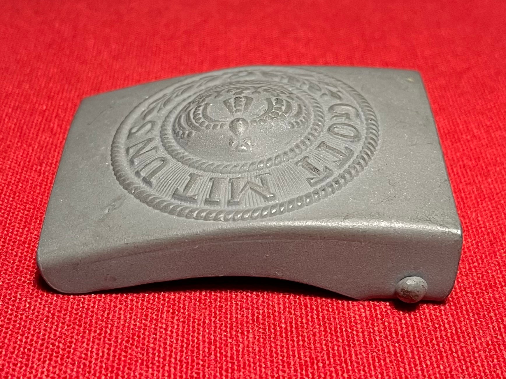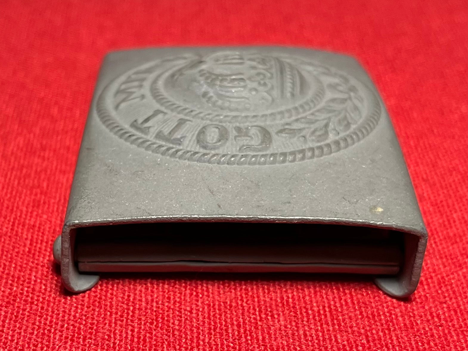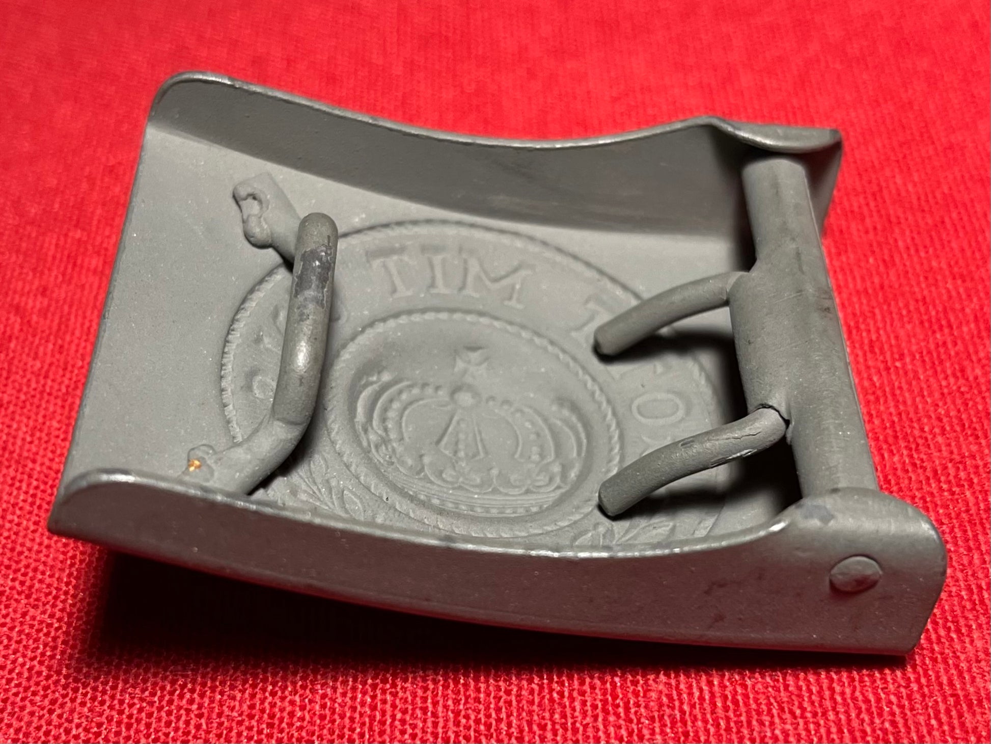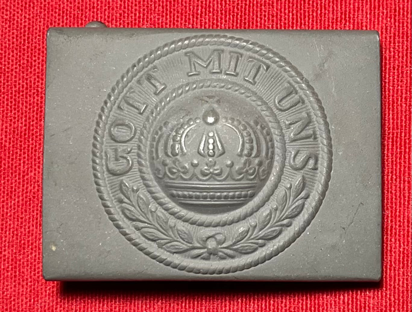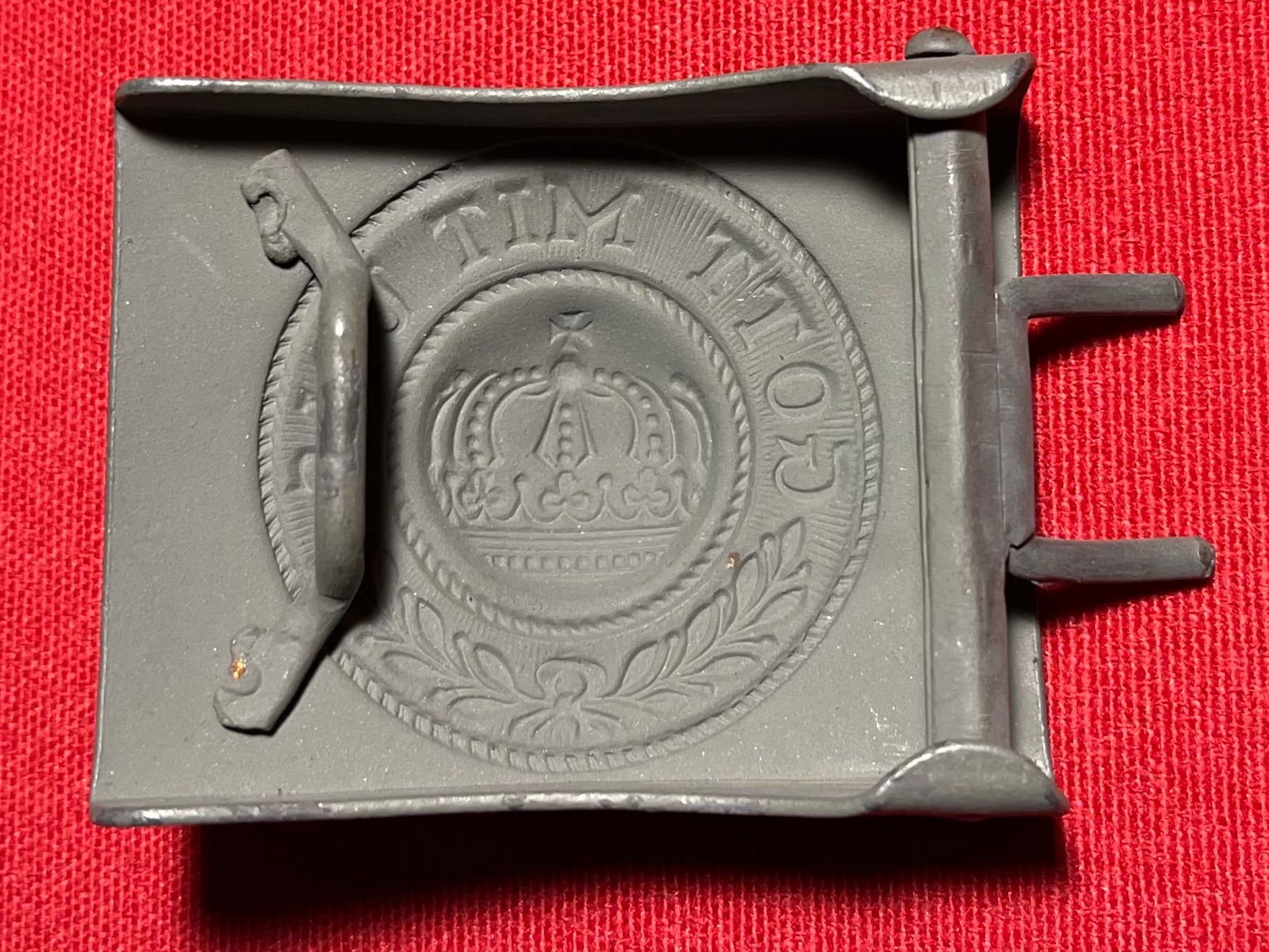 WW1 German "Prussian" Gott Mit Uns "God is with us" crest / Size 2 4/8 x 1 7/8 Inches / Taken from an unissued (original) pack of wrapped buckles. "Minty" examples like these are getting harder to come by / Please inquire with any questions