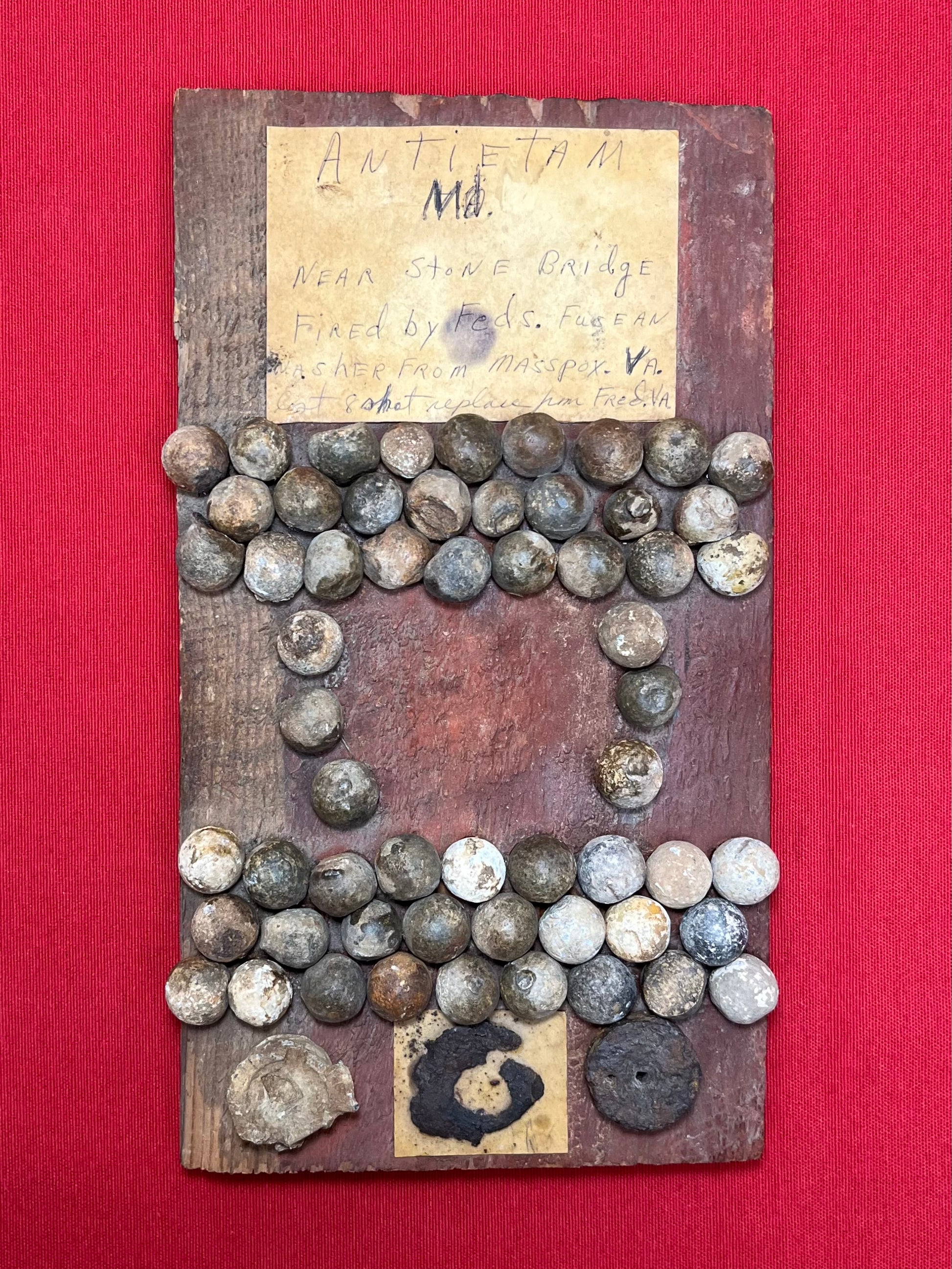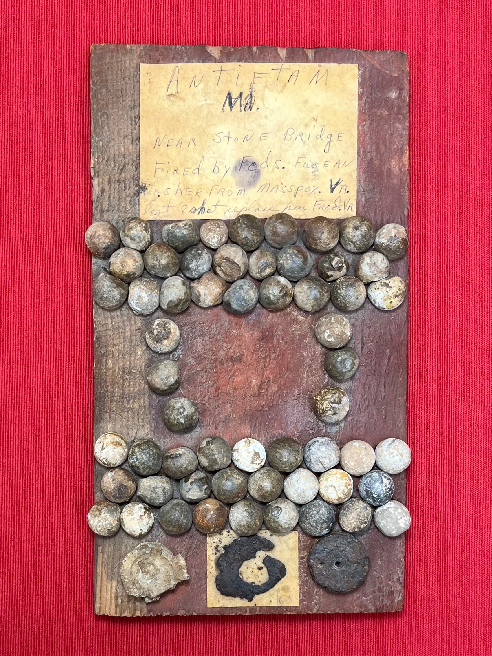 Early relic board made from The Battle of Antietam artifacts recovered near the (stonebridge) in Maryland along with other artifacts found in Virginia. Full explanation is found on the original paper label mounted to its wooden base is as follows…