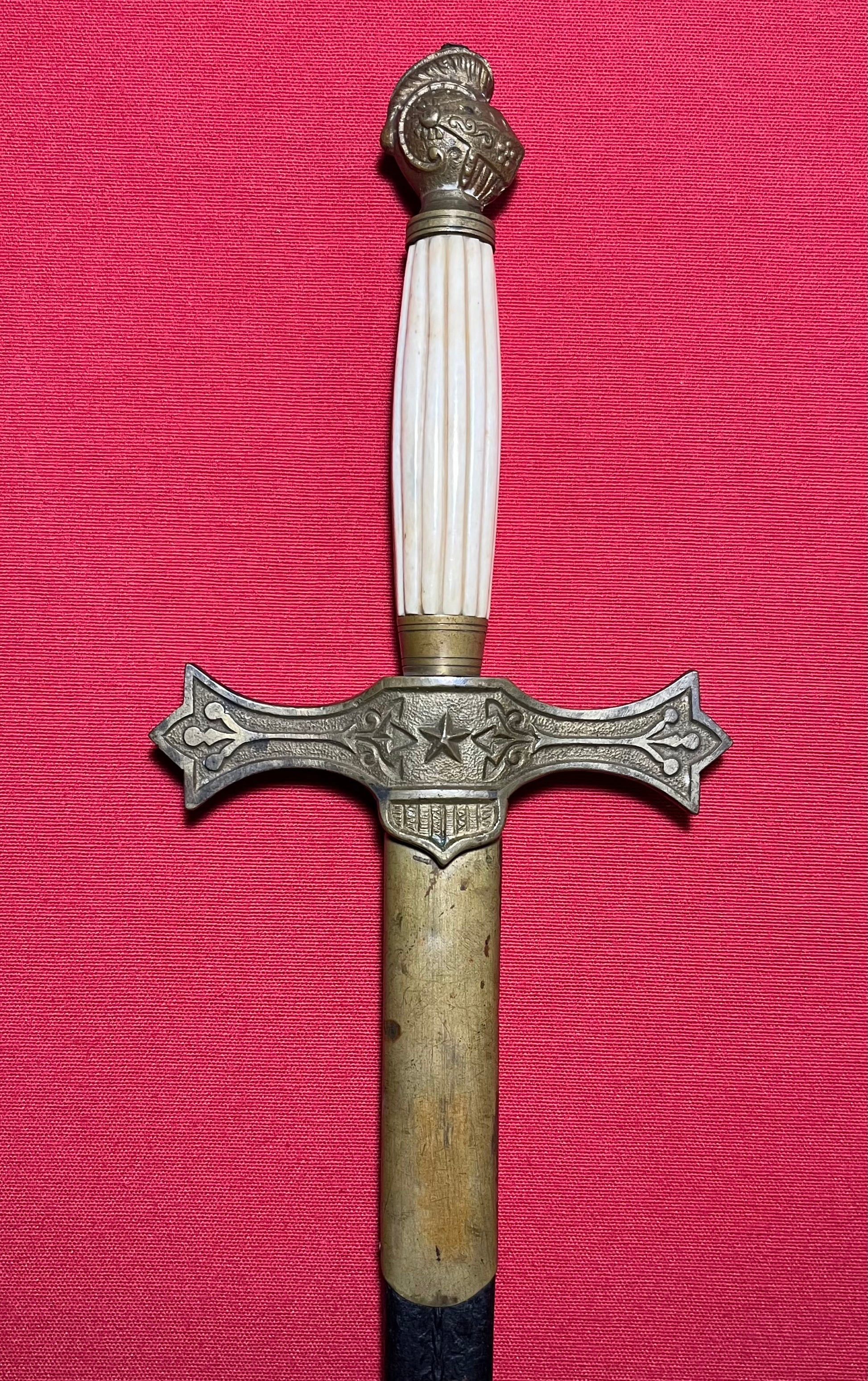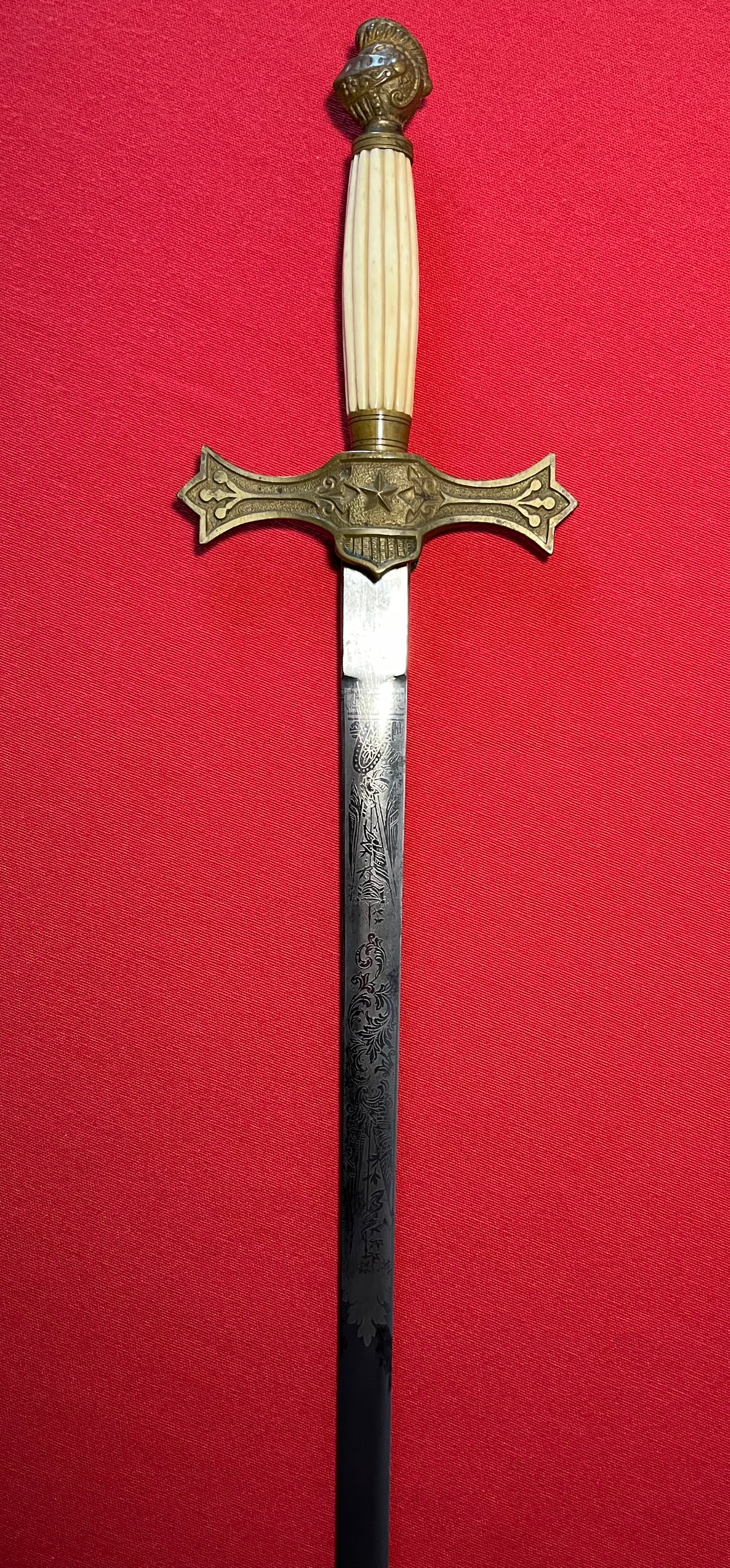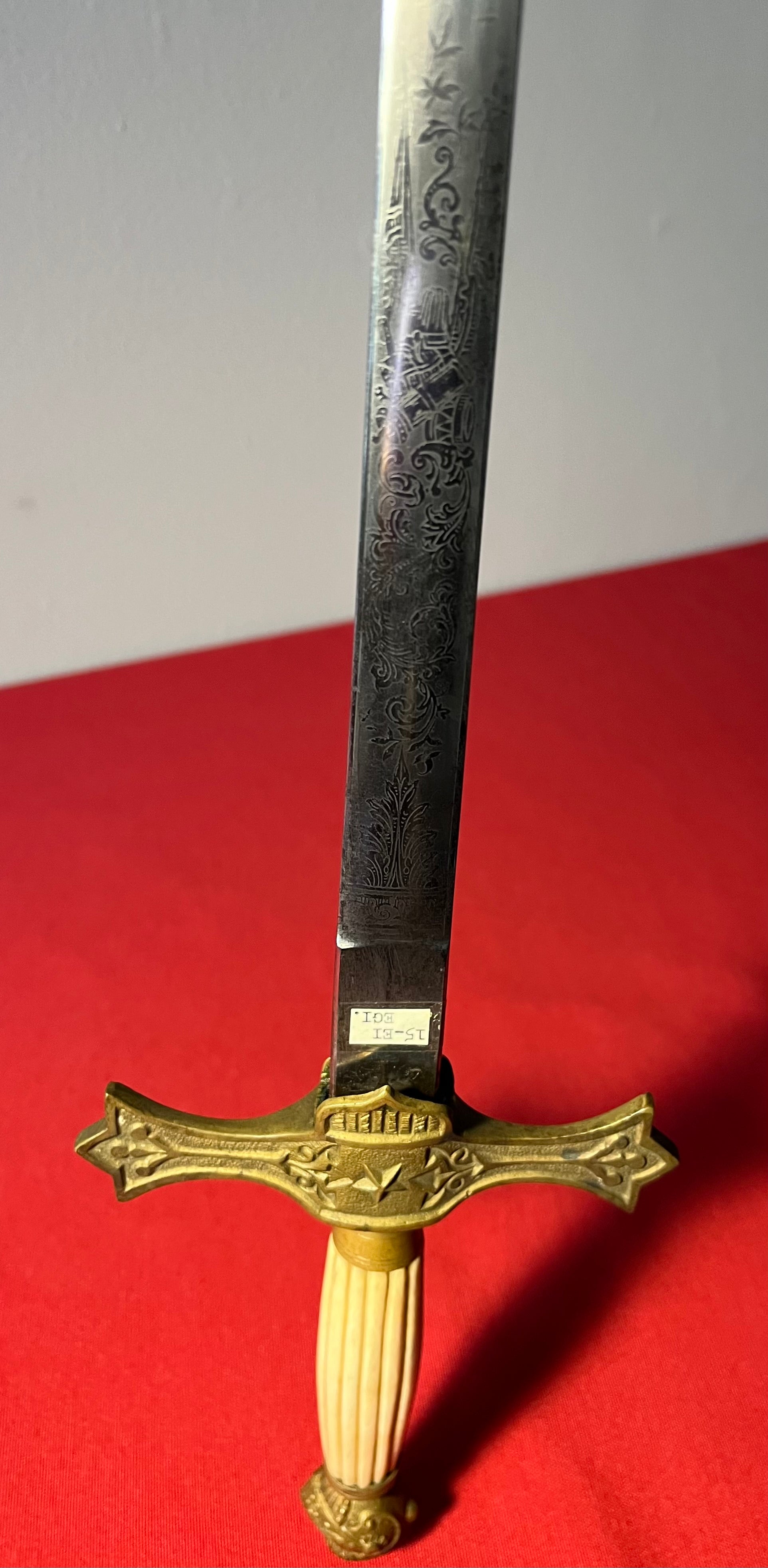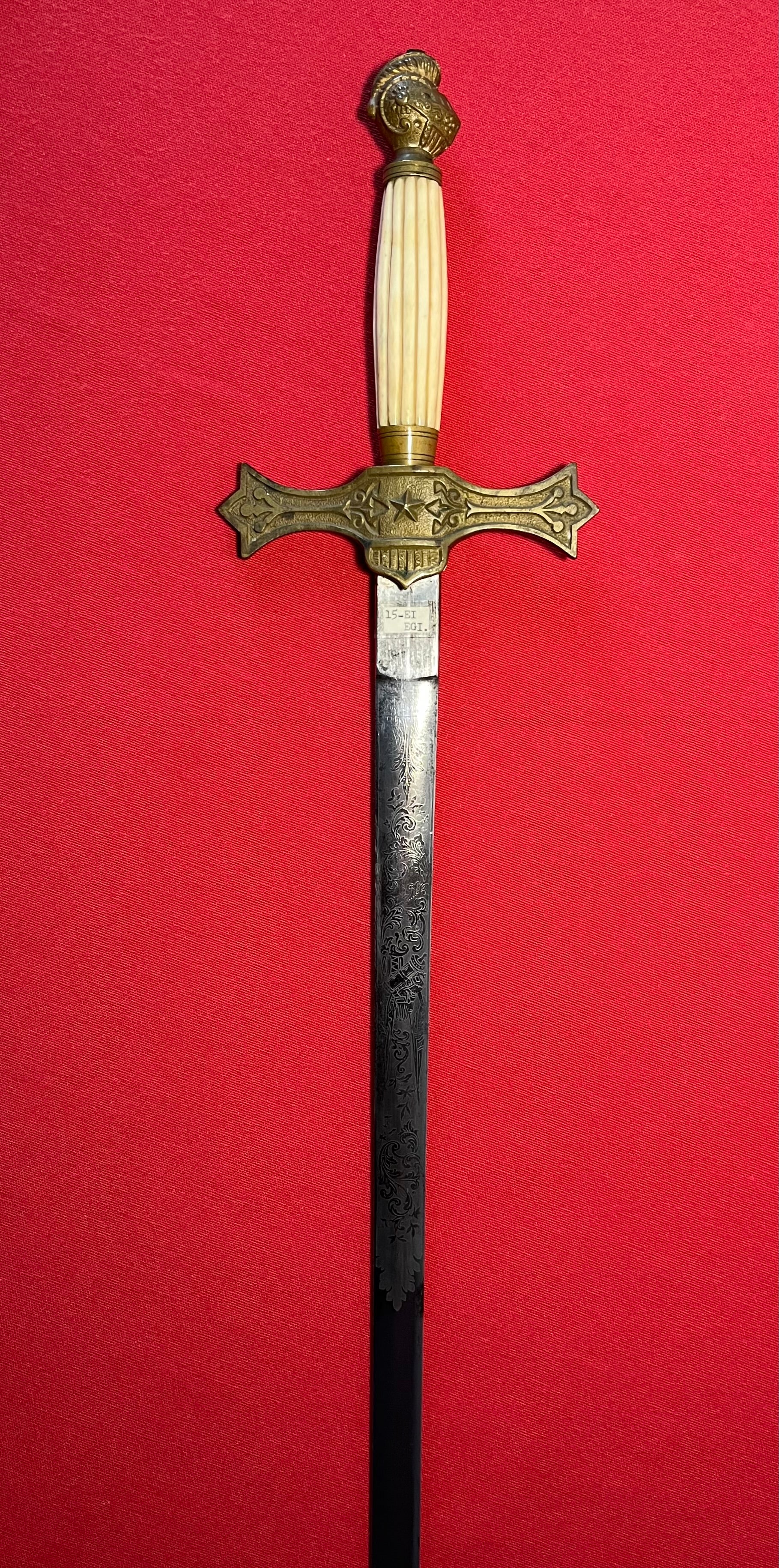 Authentic / Civil War Era / 1840-1860 / N.C.O Officers Sword / The blade has been beautifully etched on both sides with a patriotic theme and measures 27 inches / Overall sword length is 33 ¾ inches / Taped label on blade reads 15-EI EGI. / Brass knights head pommel / Cross guard features a star and shield motif / Bone handle / Leather scabbard is fully intact and sturdy / General wear with age / There are some dark patches near the swords tip where finish has come off over the years / This sword was displayed in the Battlefield Military Museum in Gettysburg, Pa from 1996 to 2021 with a cataloged number of #43 / The museum closed this year (2024) It was purchased from the auction house charged with the liquidation / The sword comes with its museum description card and a copy of the auction flyer showing its listing number and classification / Please inquire with any questions