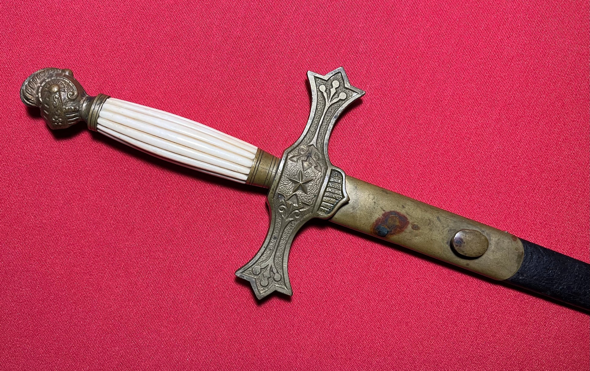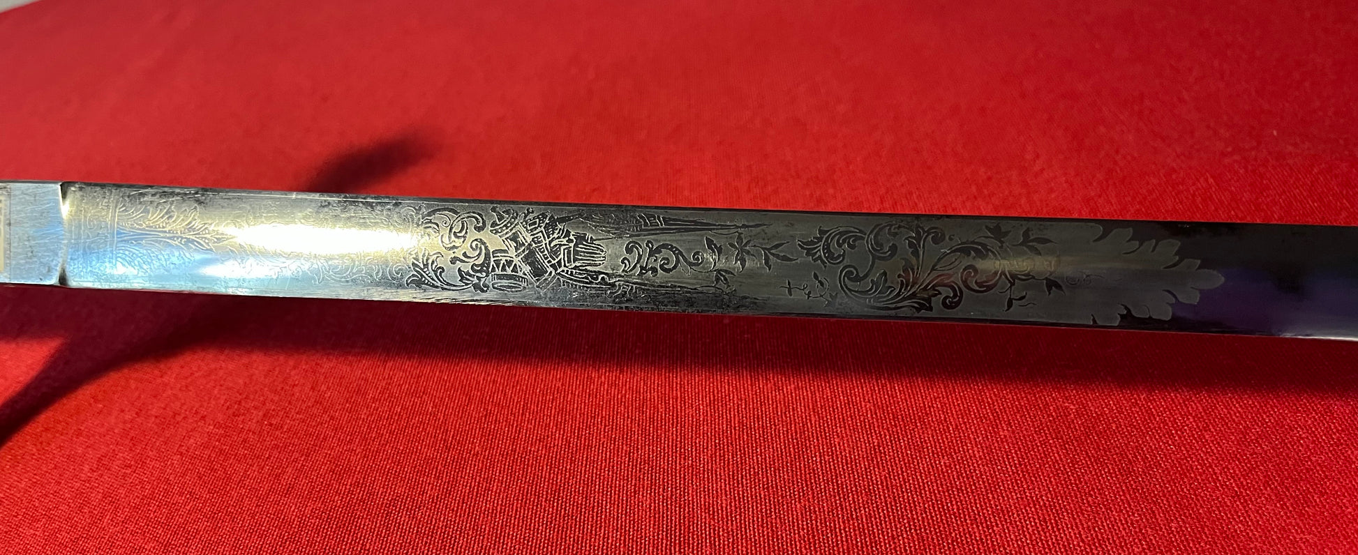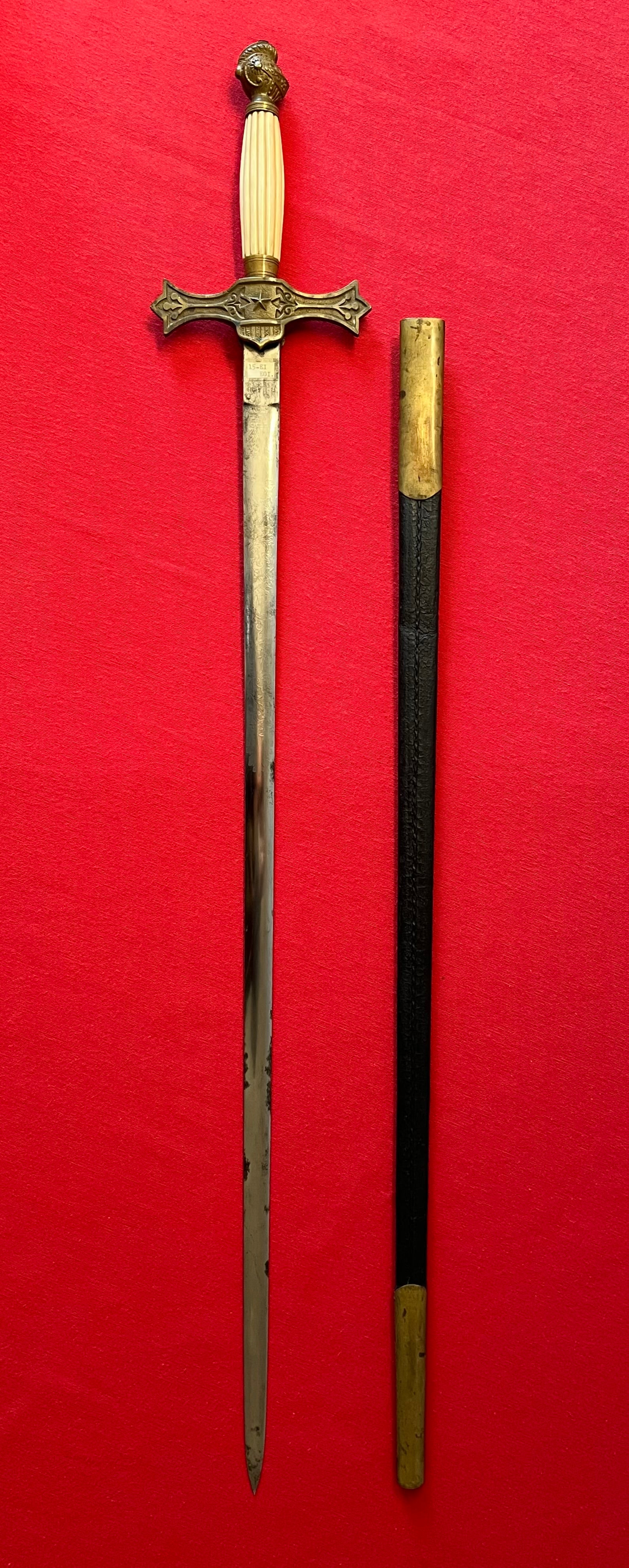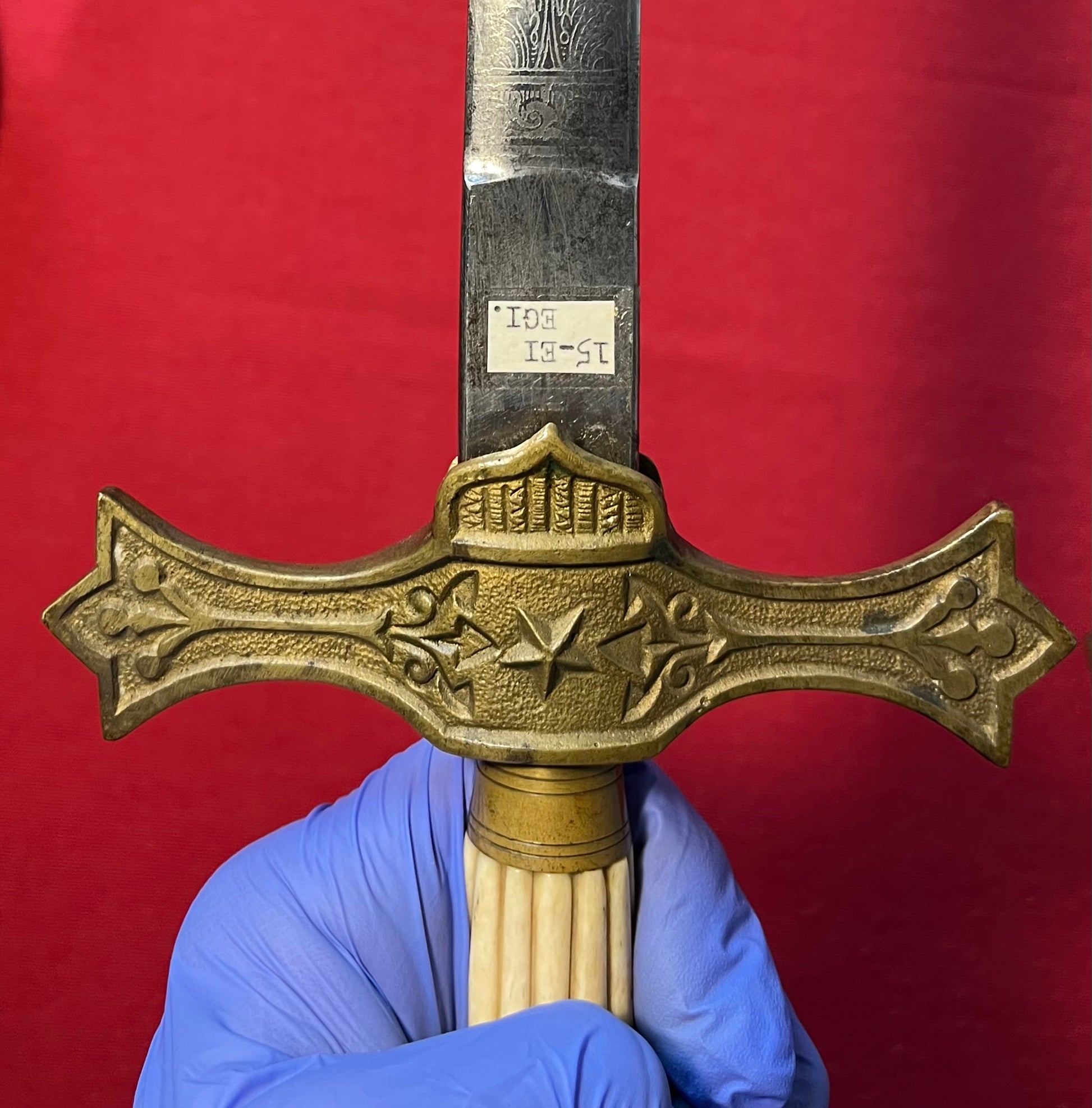 Authentic / Civil War Era / 1840-1860 / N.C.O Officers Sword / The blade has been beautifully etched on both sides with a patriotic theme and measures 27 inches / Overall sword length is 33 ¾ inches / Taped label on blade reads 15-EI EGI. / Brass knights head pommel / Cross guard features a star and shield motif / Bone handle / Leather scabbard is fully intact and sturdy / General wear with age / There are some dark patches near the swords tip where finish has come off over the years / This sword was displayed in the Battlefield Military Museum in Gettysburg, Pa from 1996 to 2021 with a cataloged number of #43 / The museum closed this year (2024) It was purchased from the auction house charged with the liquidation / The sword comes with its museum description card and a copy of the auction flyer showing its listing number and classification / Please inquire with any questions
