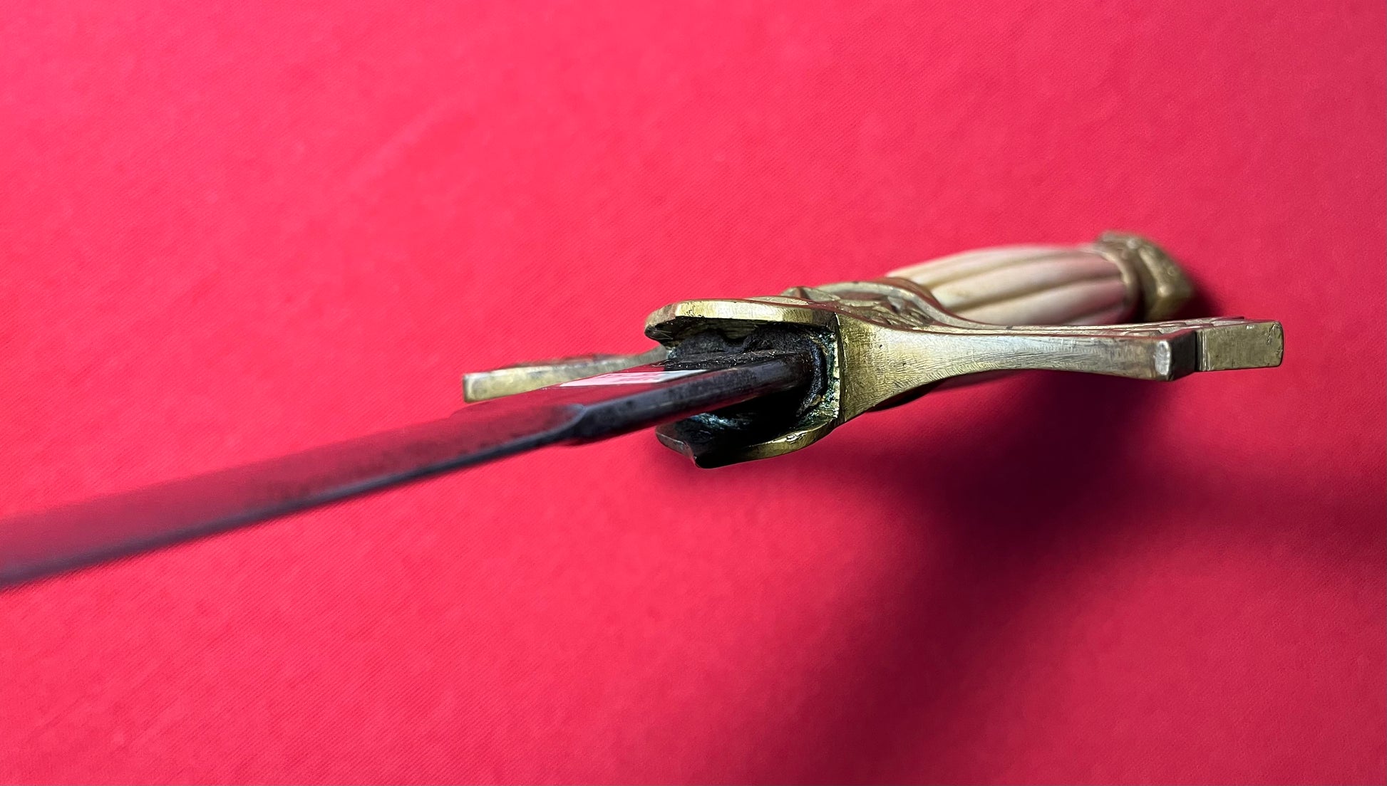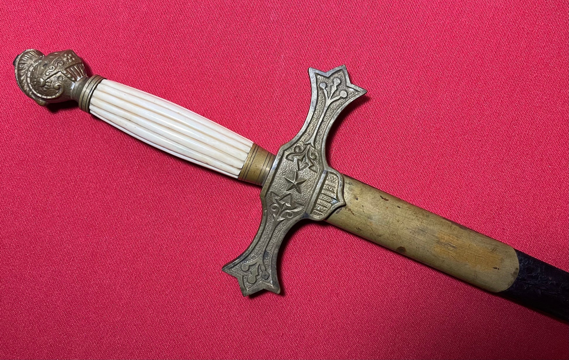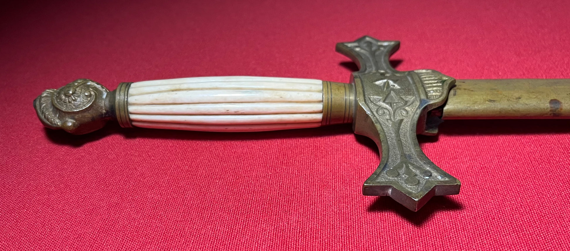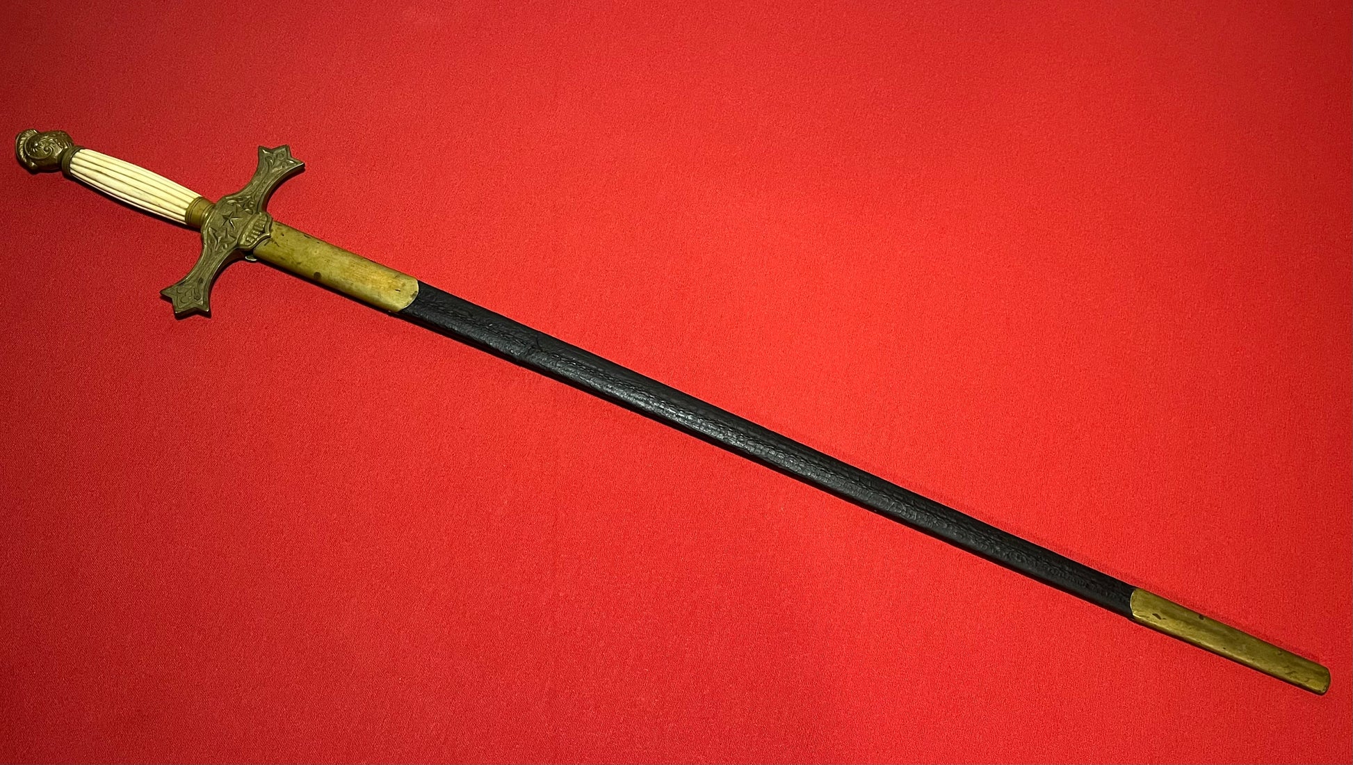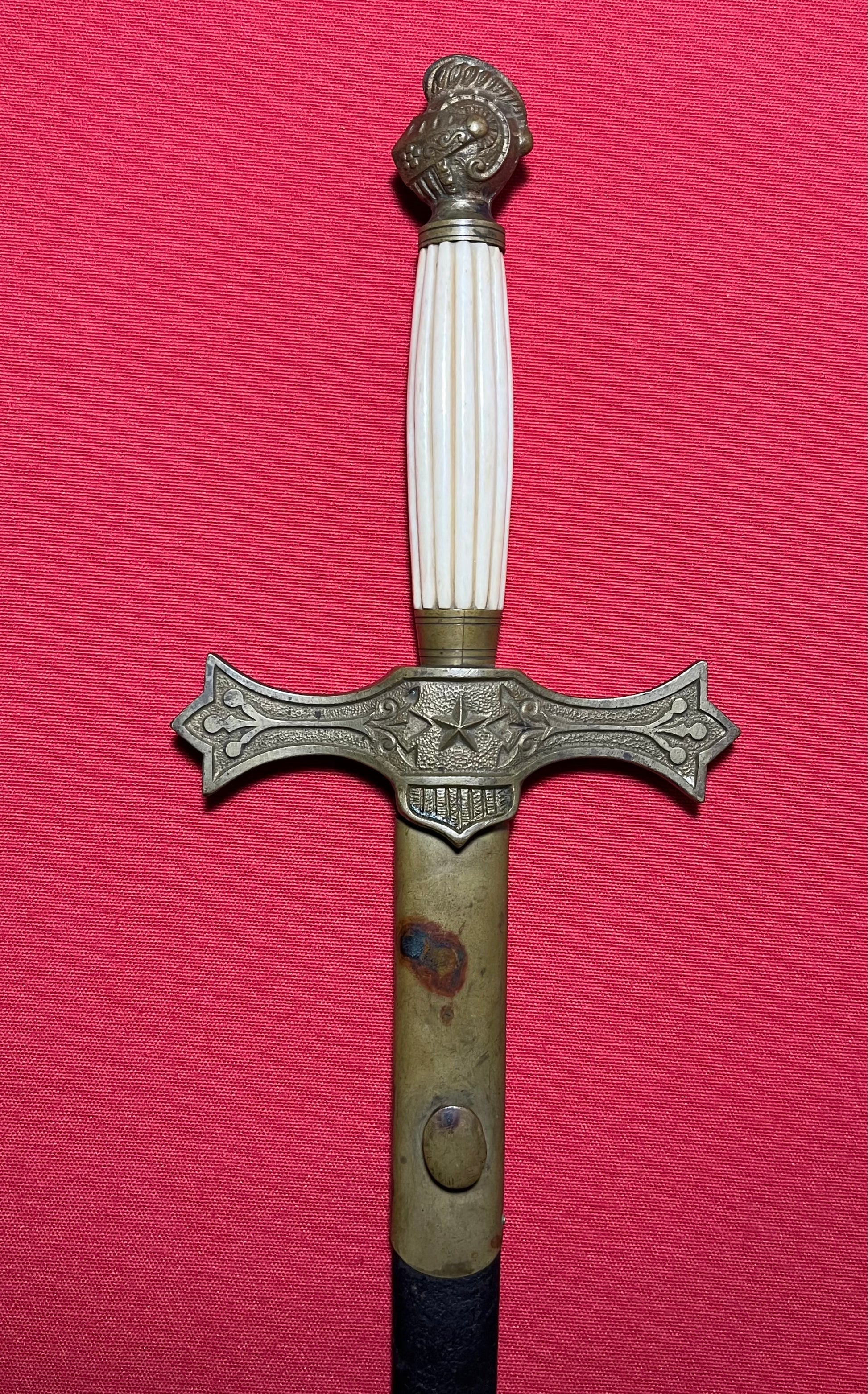 Authentic / Civil War Era / 1840-1860 / N.C.O Officers Sword / The blade has been beautifully etched on both sides with a patriotic theme and measures 27 inches / Overall sword length is 33 ¾ inches / Taped label on blade reads 15-EI EGI. / Brass knights head pommel / Cross guard features a star and shield motif / Bone handle / Leather scabbard is fully intact and sturdy / General wear with age / There are some dark patches near the swords tip where finish has come off over the years / This sword was displayed in the Battlefield Military Museum in Gettysburg, Pa from 1996 to 2021 with a cataloged number of #43 / The museum closed this year (2024) It was purchased from the auction house charged with the liquidation / The sword comes with its museum description card and a copy of the auction flyer showing its listing number and classification / Please inquire with any questions