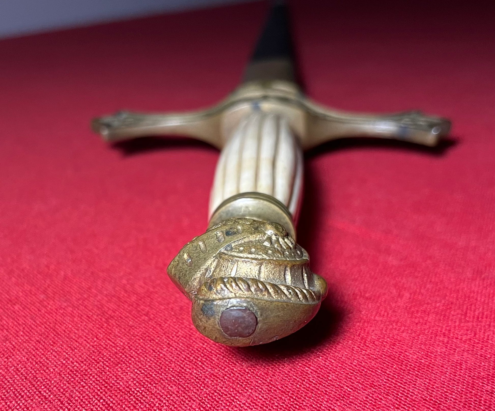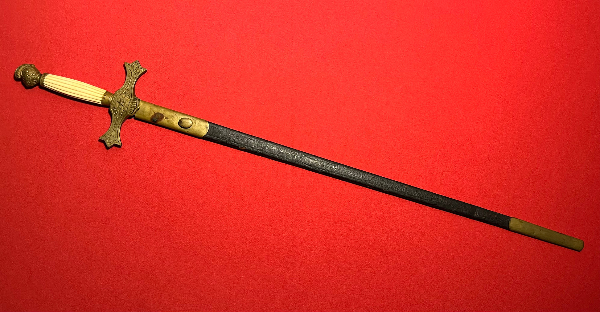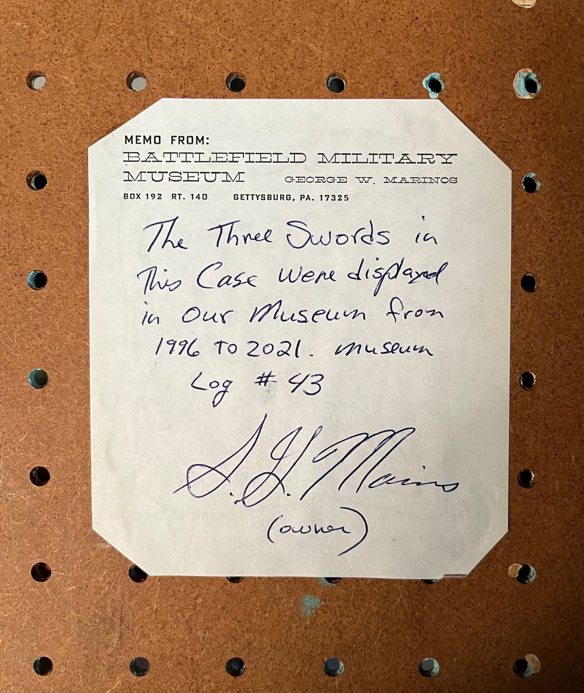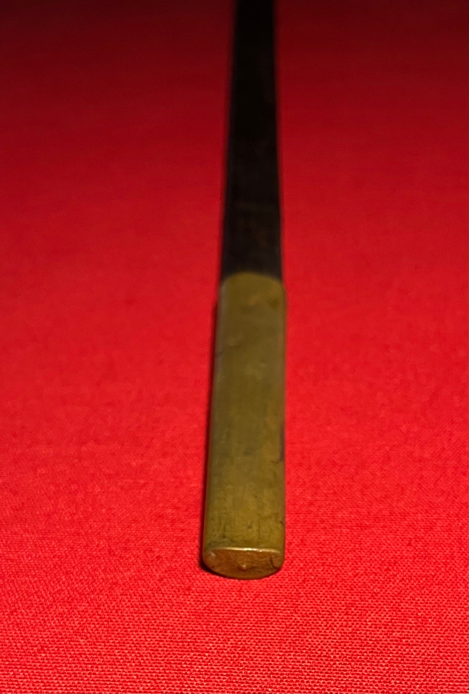 Authentic / Civil War Era / 1840-1860 / N.C.O Officers Sword / The blade has been beautifully etched on both sides with a patriotic theme and measures 27 inches / Overall sword length is 33 ¾ inches / Taped label on blade reads 15-EI EGI. / Brass knights head pommel / Cross guard features a star and shield motif / Bone handle / Leather scabbard is fully intact and sturdy / General wear with age / There are some dark patches near the swords tip where finish has come off over the years / This sword was displayed in the Battlefield Military Museum in Gettysburg, Pa from 1996 to 2021 with a cataloged number of #43 / The museum closed this year (2024) It was purchased from the auction house charged with the liquidation / The sword comes with its museum description card and a copy of the auction flyer showing its listing number and classification / Please inquire with any questions