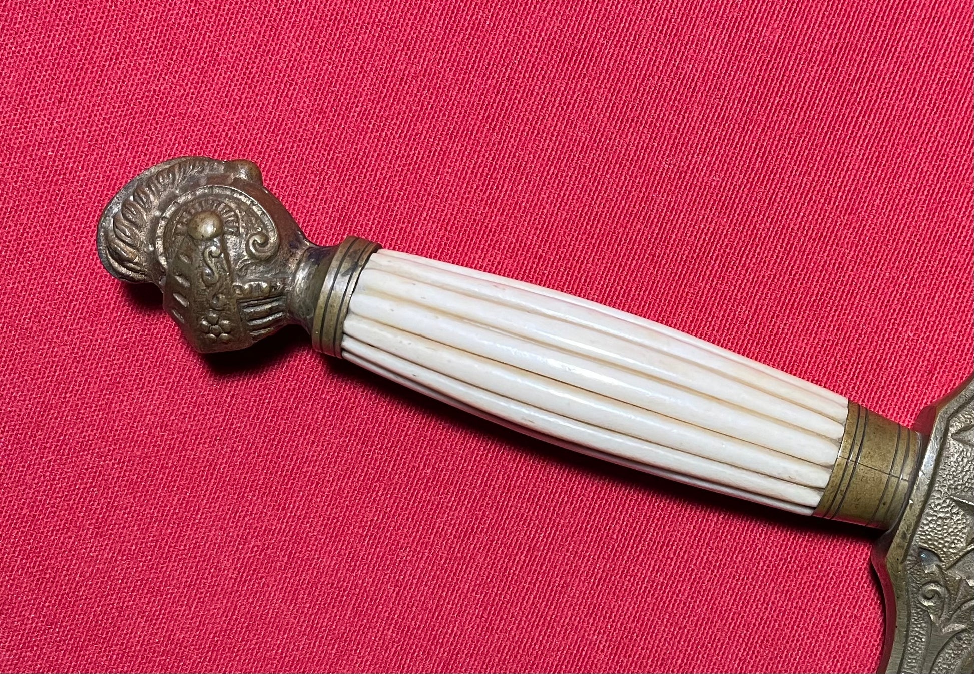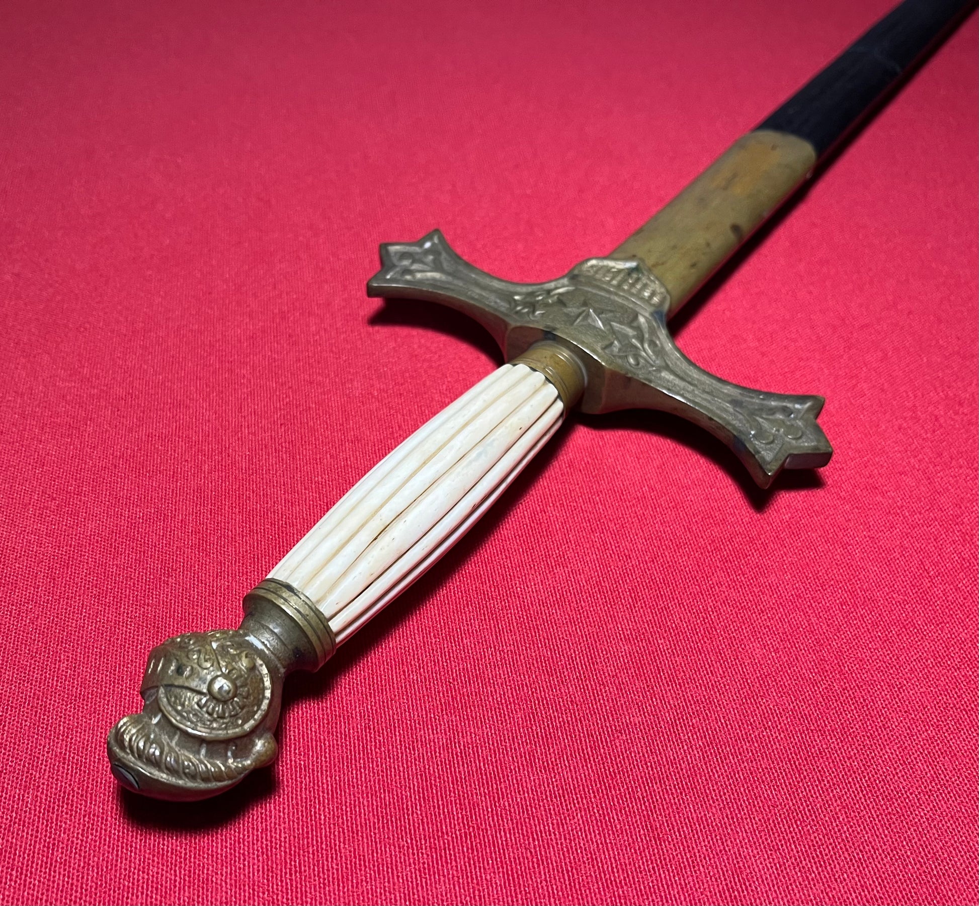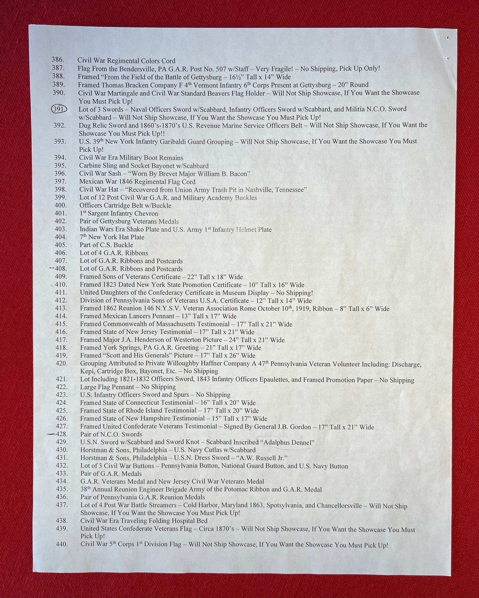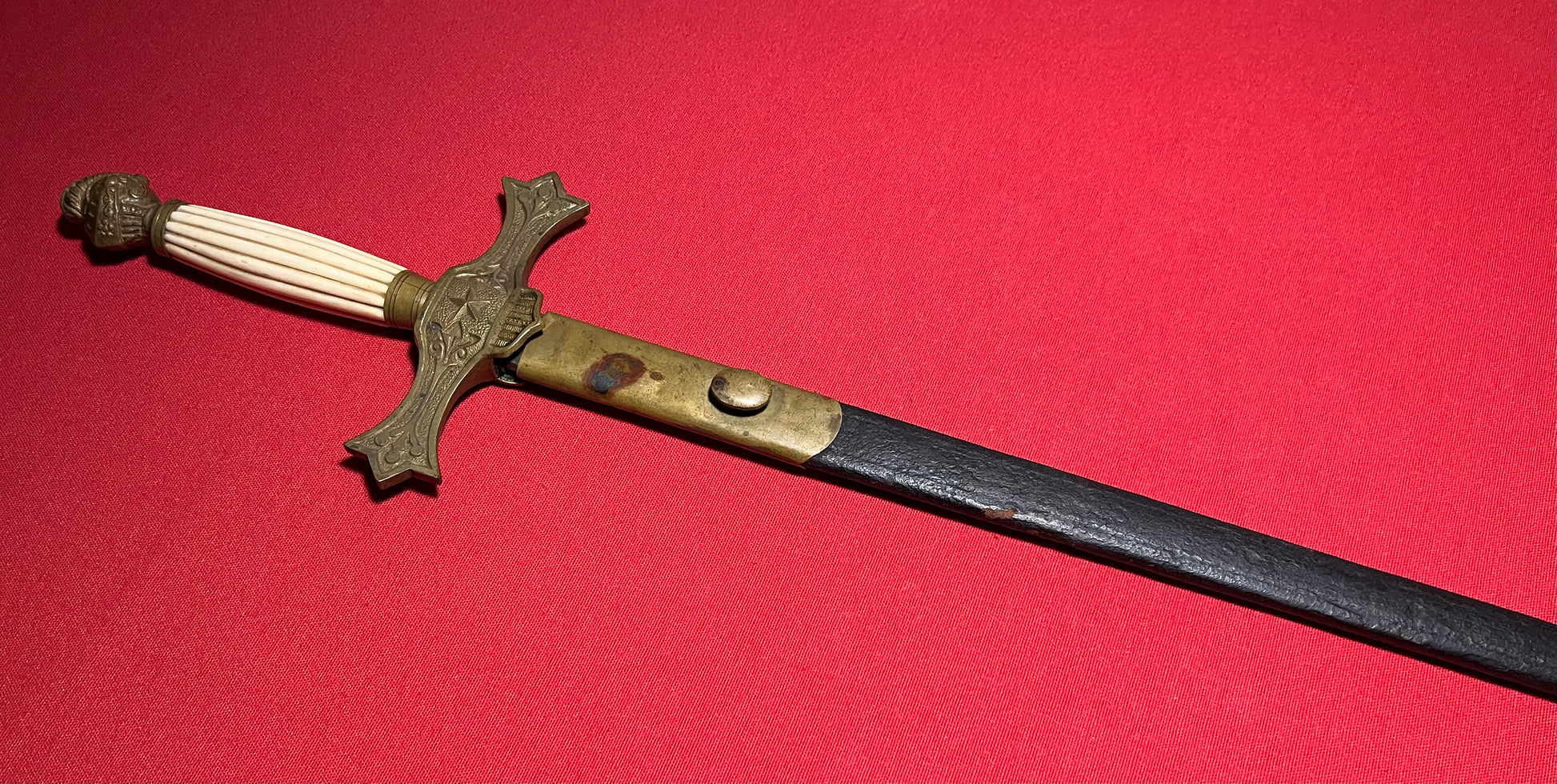 Authentic / Civil War Era / 1840-1860 / N.C.O Officers Sword / The blade has been beautifully etched on both sides with a patriotic theme and measures 27 inches / Overall sword length is 33 ¾ inches / Taped label on blade reads 15-EI EGI. / Brass knights head pommel / Cross guard features a star and shield motif / Bone handle / Leather scabbard is fully intact and sturdy / General wear with age / There are some dark patches near the swords tip where finish has come off over the years / This sword was displayed in the Battlefield Military Museum in Gettysburg, Pa from 1996 to 2021 with a cataloged number of #43 / The museum closed this year (2024) It was purchased from the auction house charged with the liquidation / The sword comes with its museum description card and a copy of the auction flyer showing its listing number and classification / Please inquire with any questions