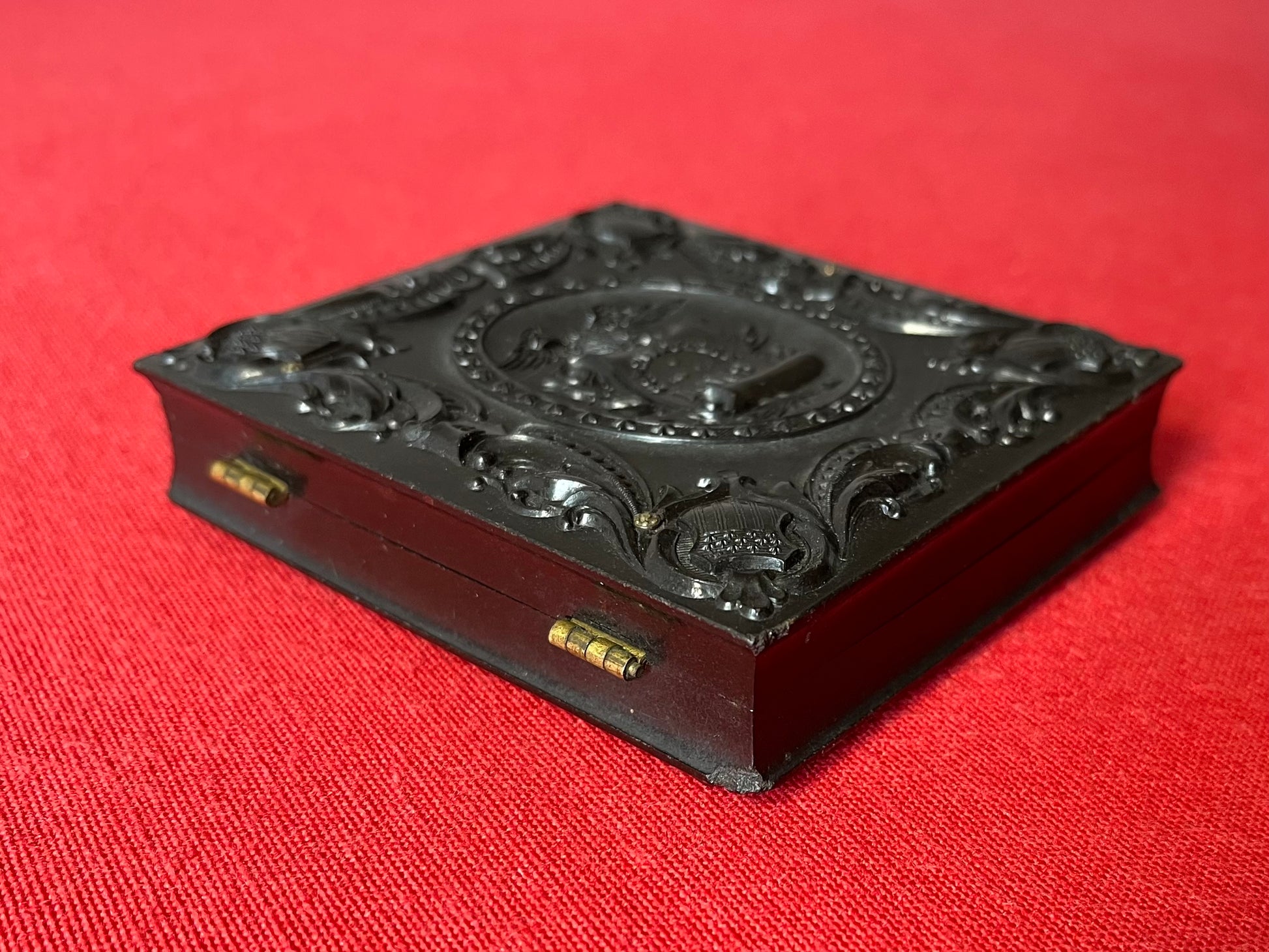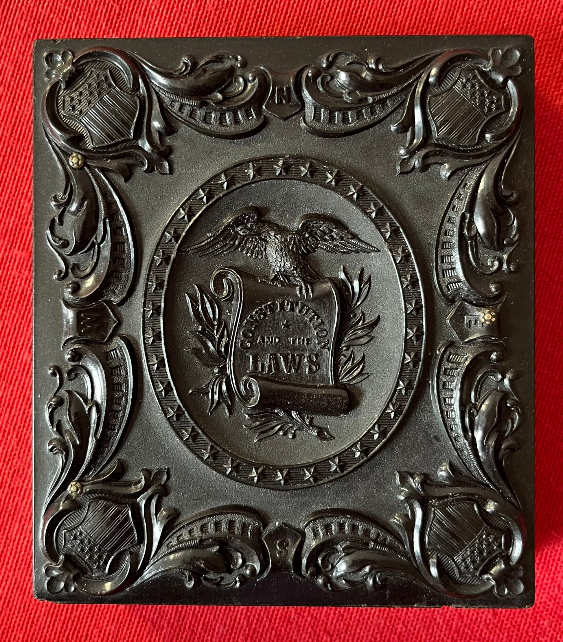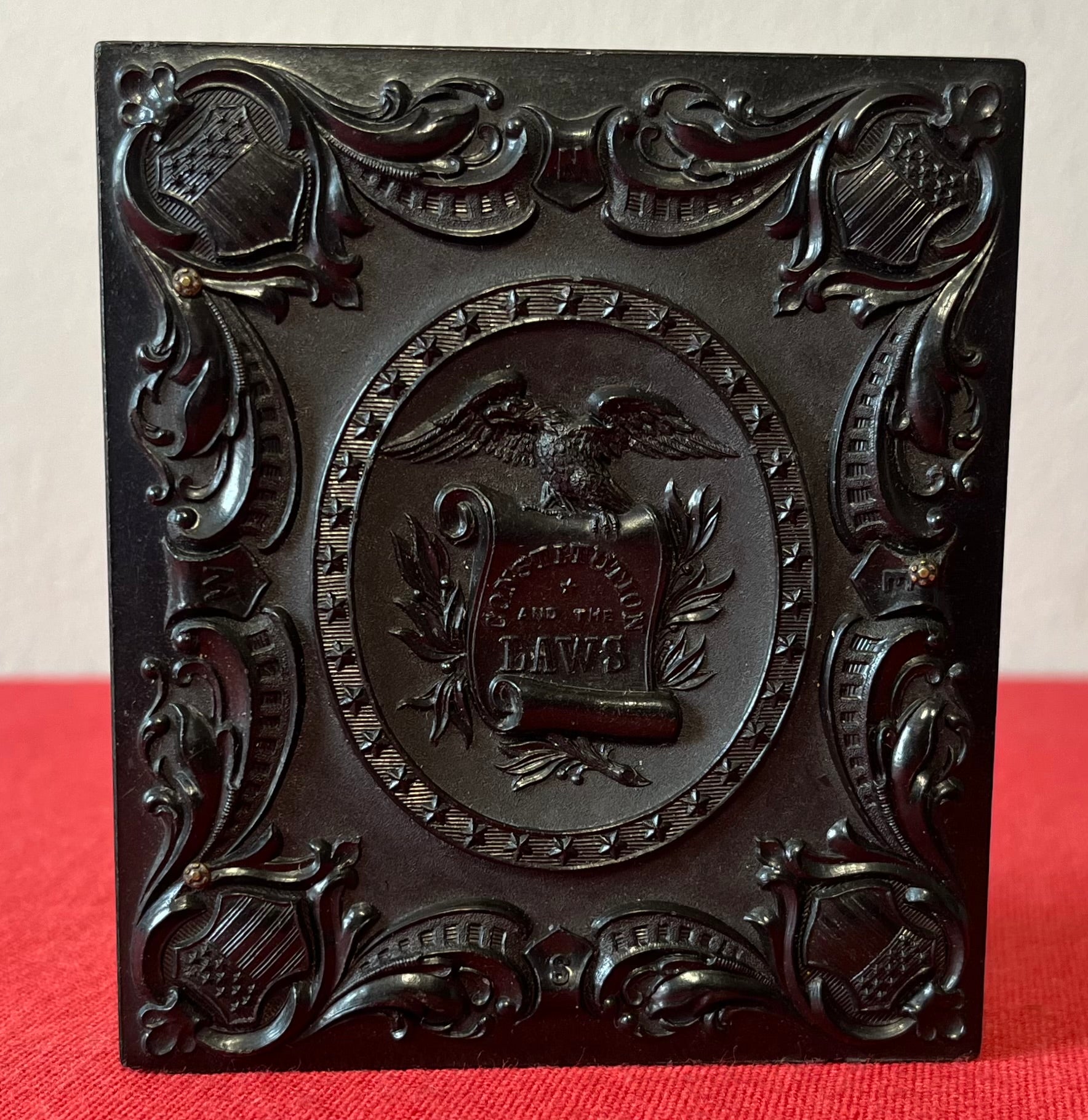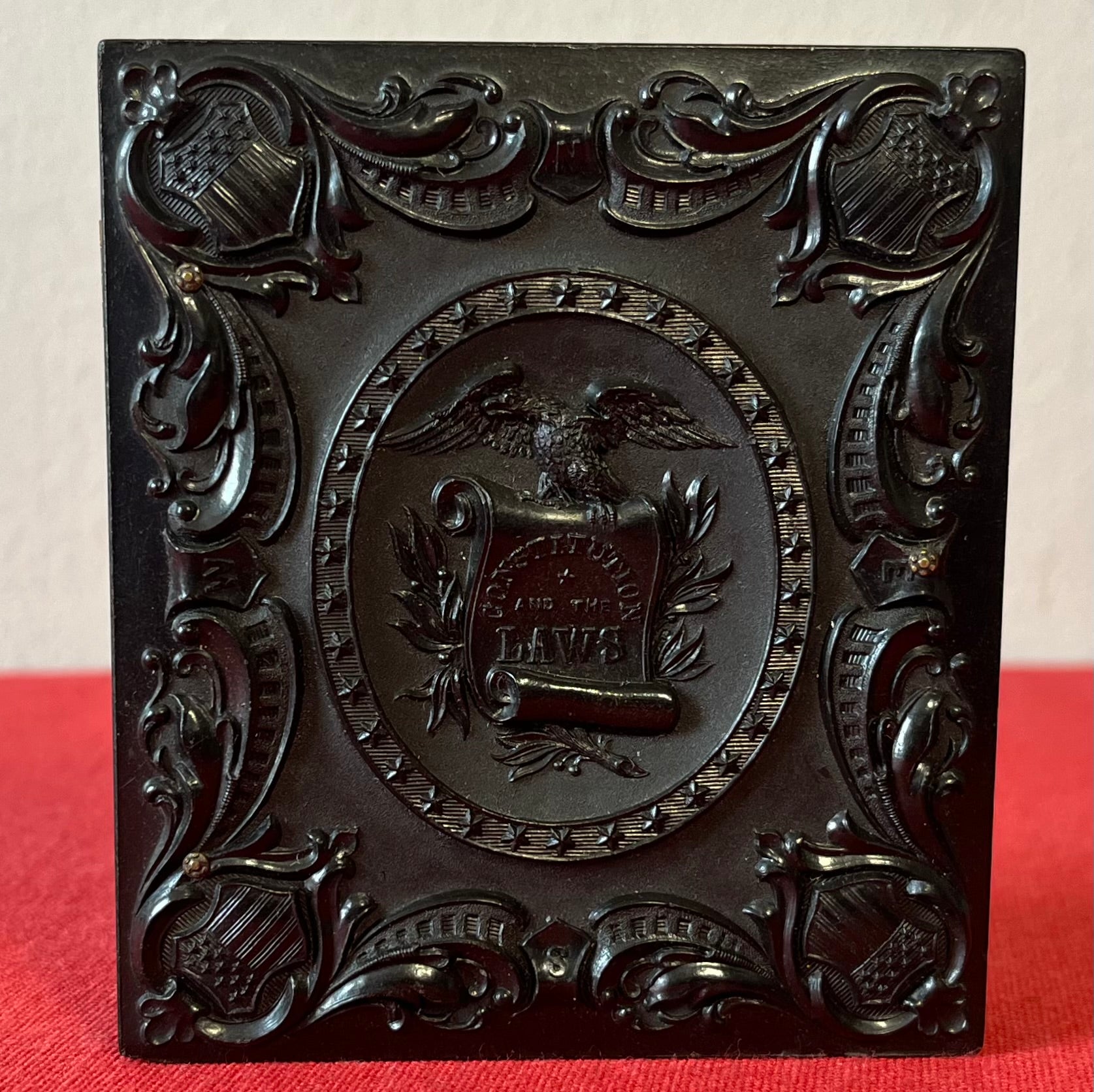 Civil War Soldier Image (Sixth Plate) in "Scarce” Constitution Case Case Scarce / Civil War 1850’s Patriotic Daguerreotype Image Case Featuring the Constitution by Littlefield, Parsons & Co. / Sixth Plate - Size (2 ¾ x 3 ¼) Material - Gutta Percha Image Civil War soldier photographed sitting in coat and kepi / Sixth plate size / Patriotic matting “Union 76-61” |
