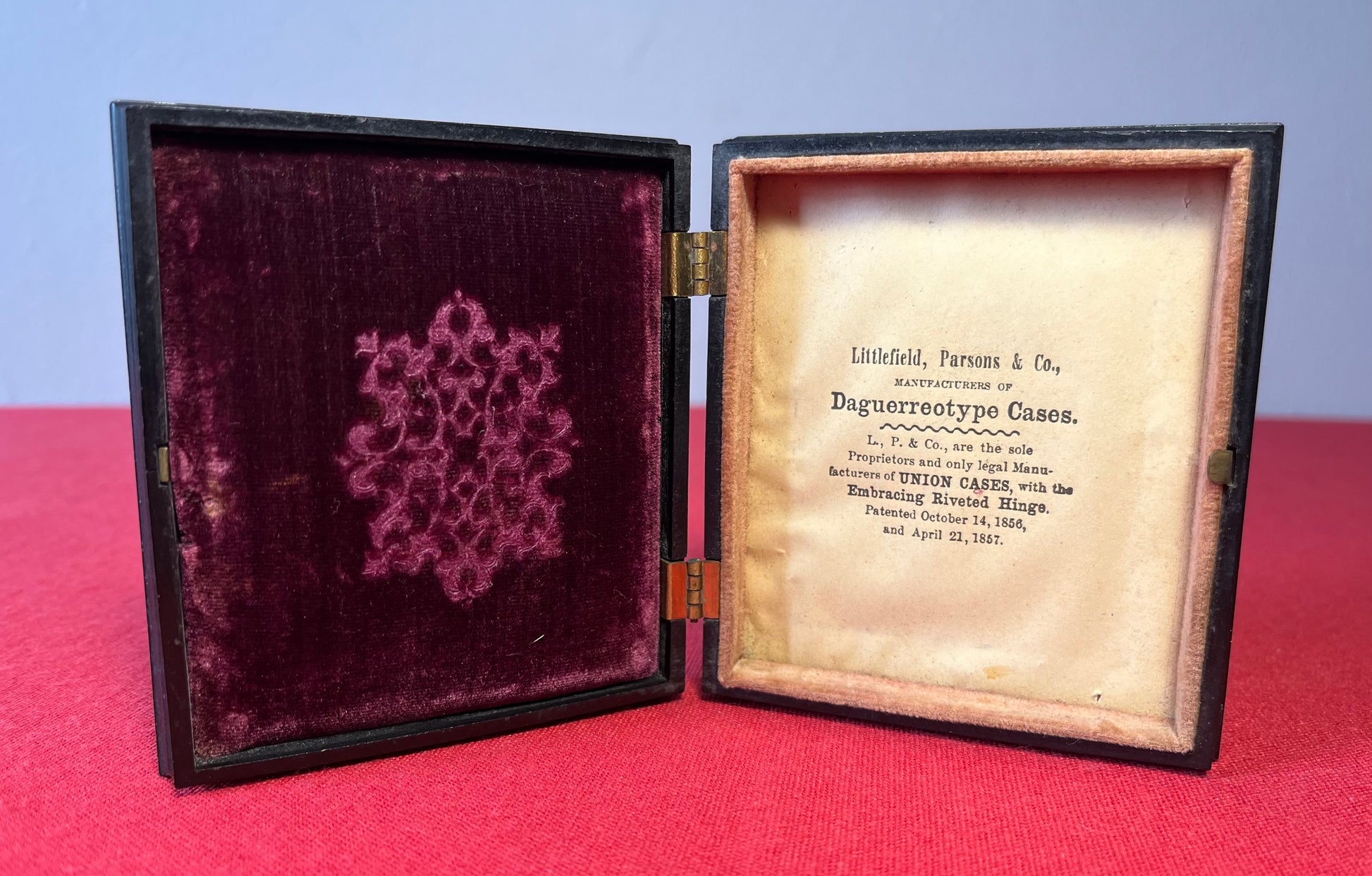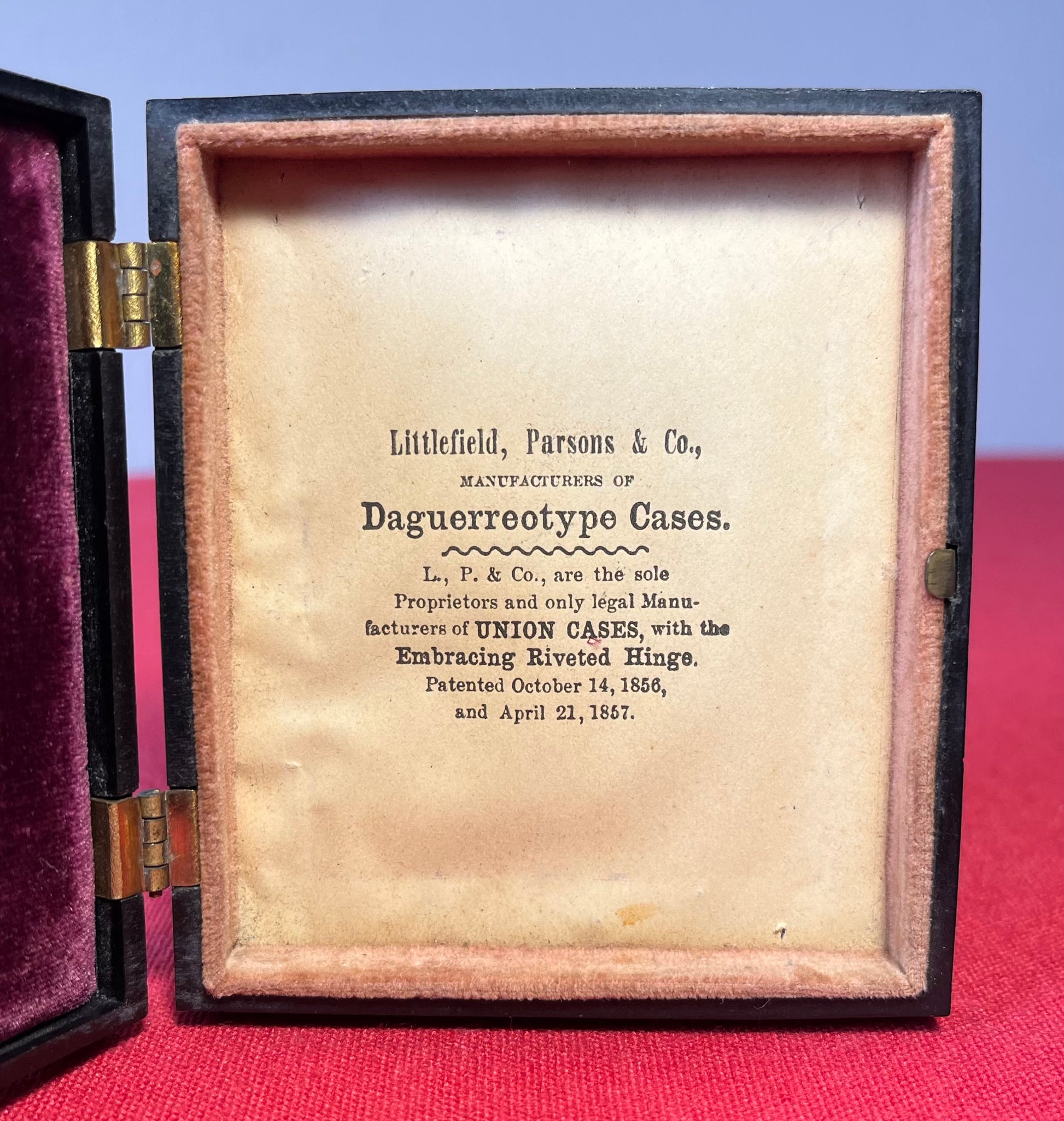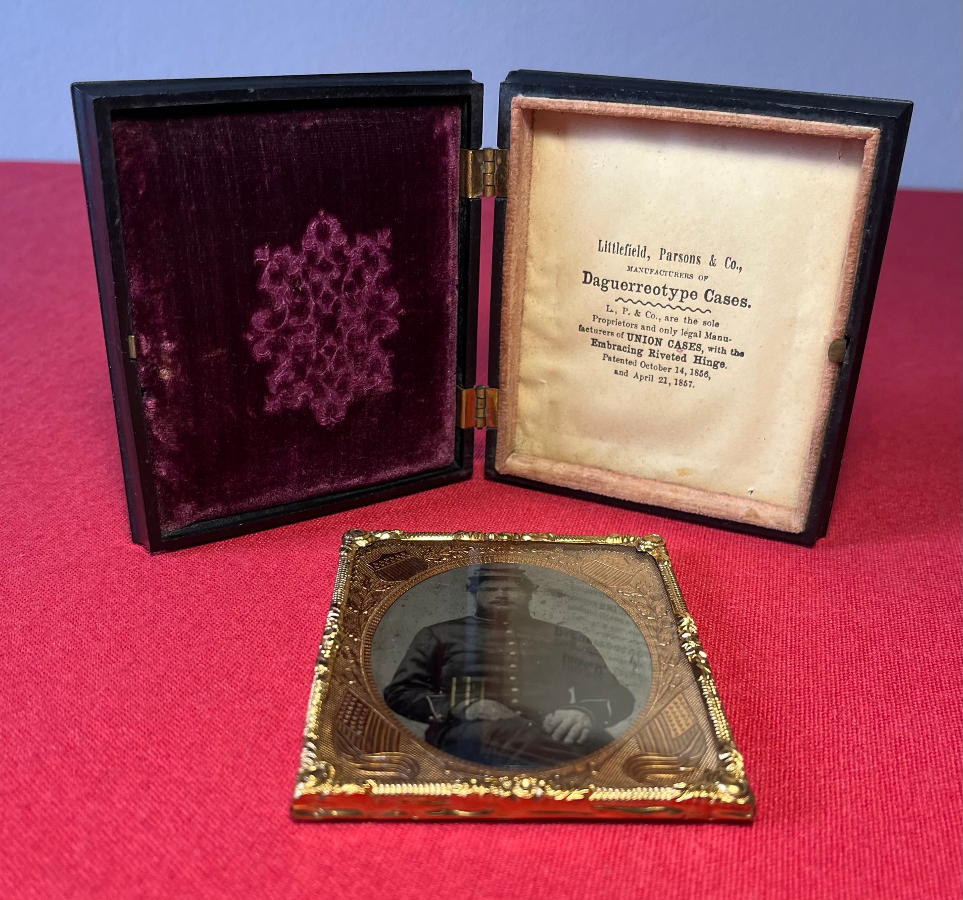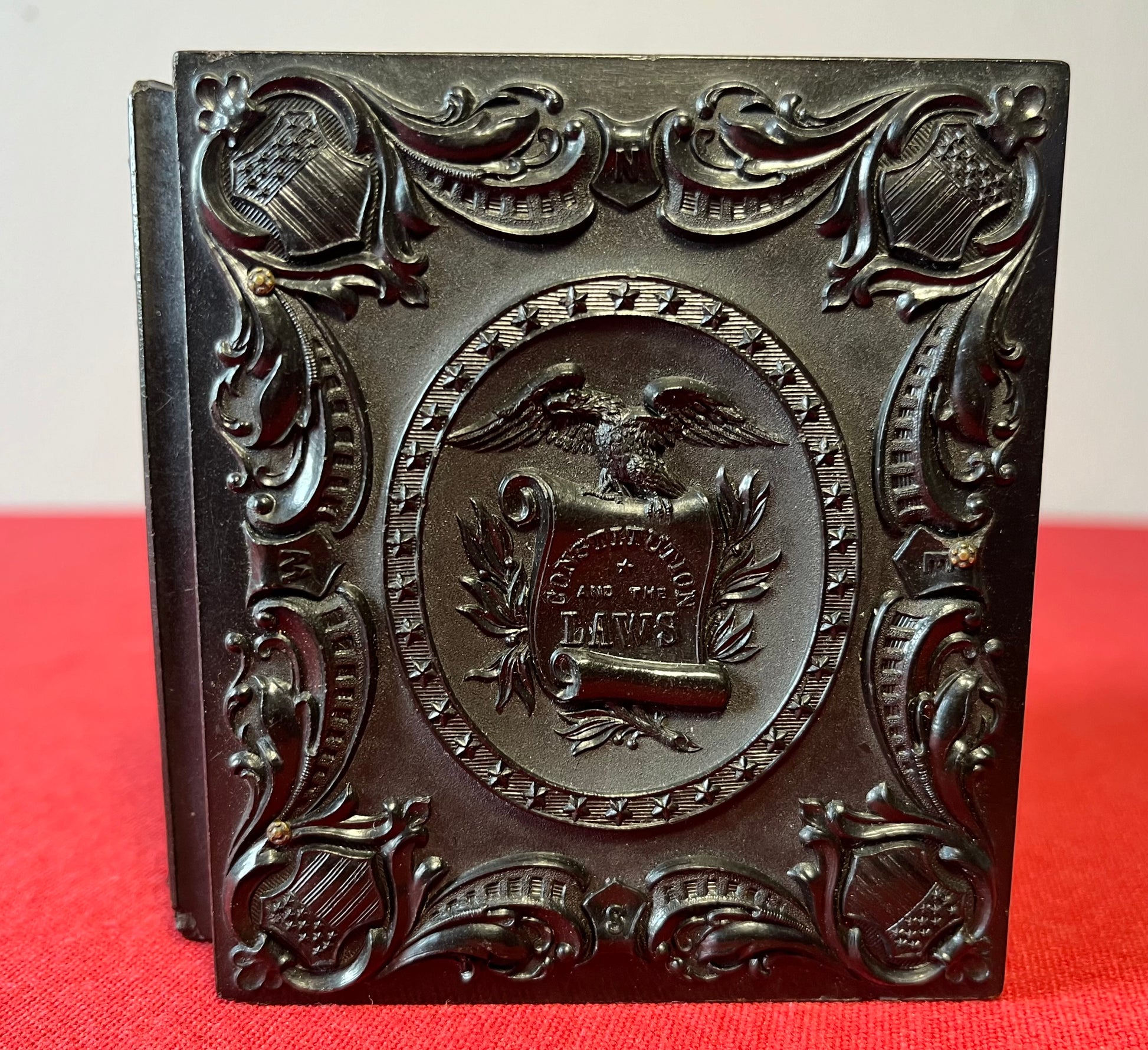 Civil War Soldier Image (Sixth Plate) in "Scarce” Constitution Case Case Scarce / Civil War 1850’s Patriotic Daguerreotype Image Case Featuring the Constitution by Littlefield, Parsons & Co. / Sixth Plate - Size (2 ¾ x 3 ¼) Material - Gutta Percha Image Civil War soldier photographed sitting in coat and kepi / Sixth plate size / Patriotic matting “Union 76-61” |