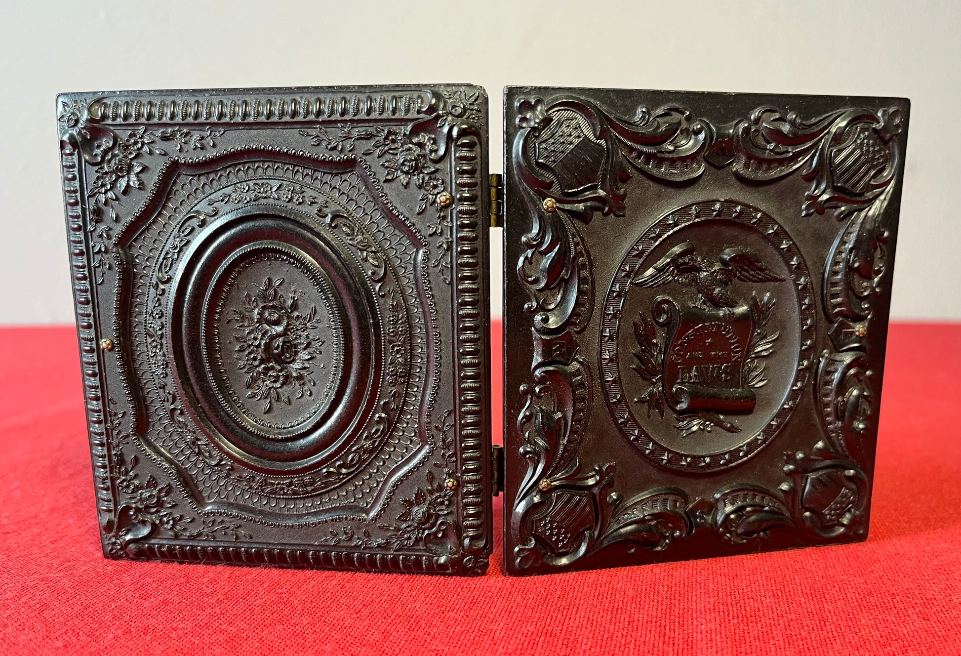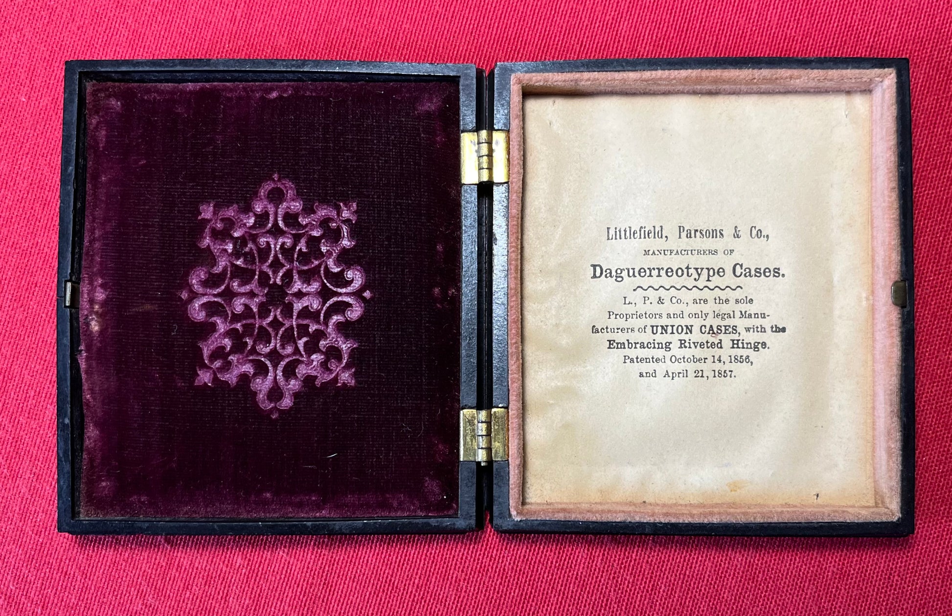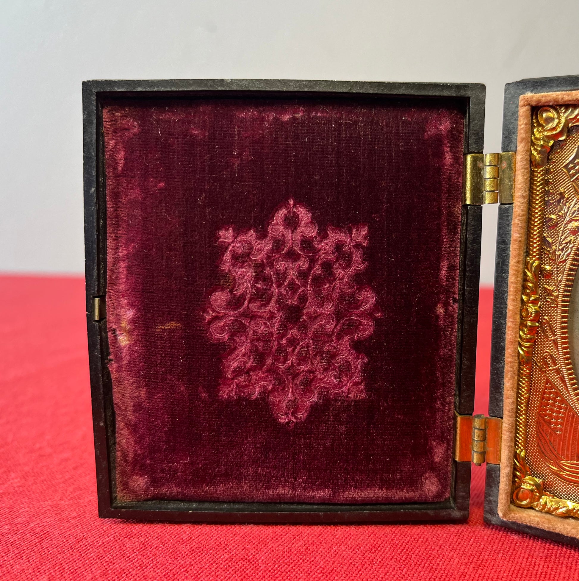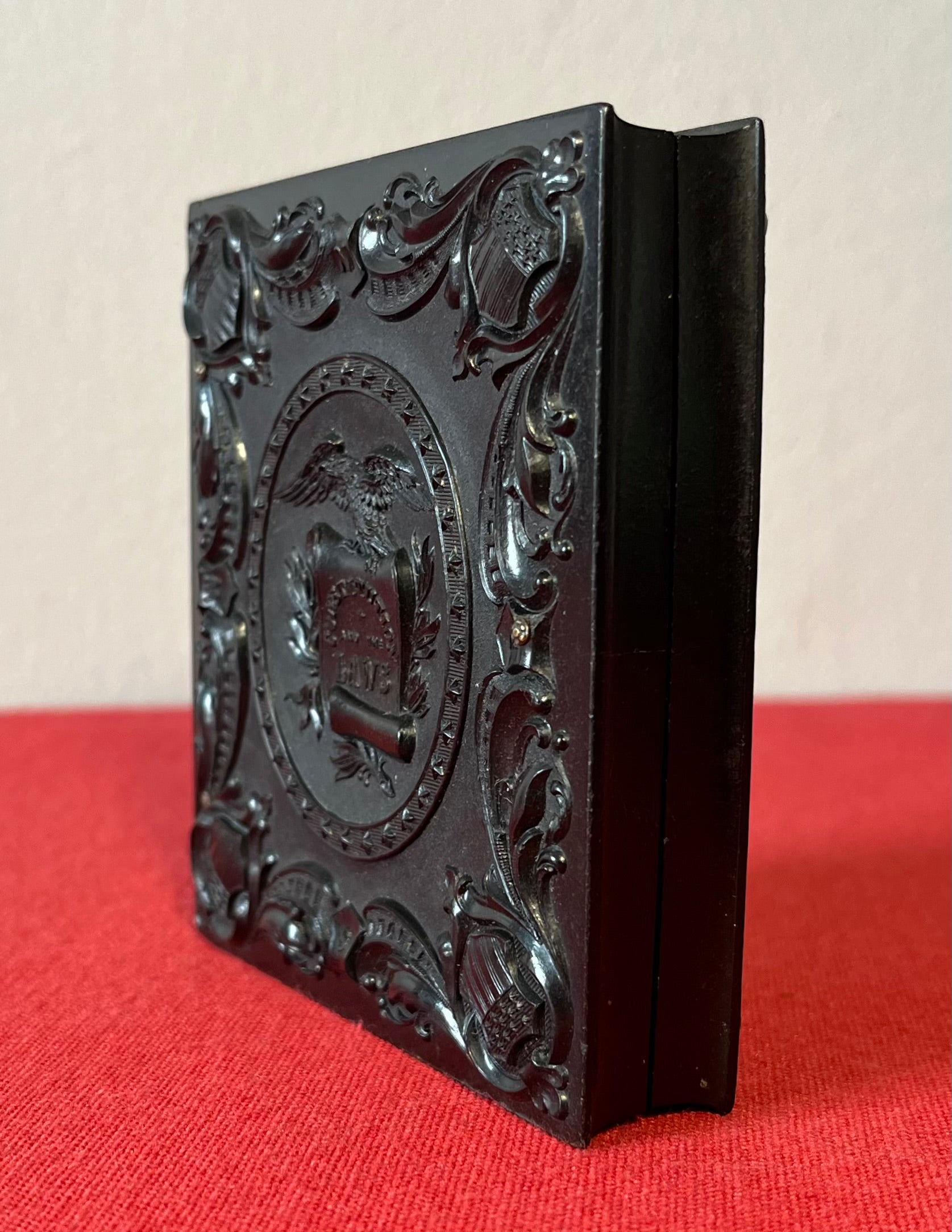 Civil War Soldier Image (Sixth Plate) in "Scarce” Constitution Case Case Scarce / Civil War 1850’s Patriotic Daguerreotype Image Case Featuring the Constitution by Littlefield, Parsons & Co. / Sixth Plate - Size (2 ¾ x 3 ¼) Material - Gutta Percha Image Civil War soldier photographed sitting in coat and kepi / Sixth plate size / Patriotic matting “Union 76-61” |