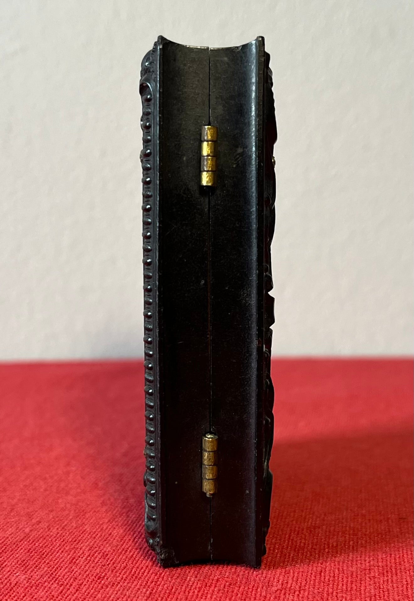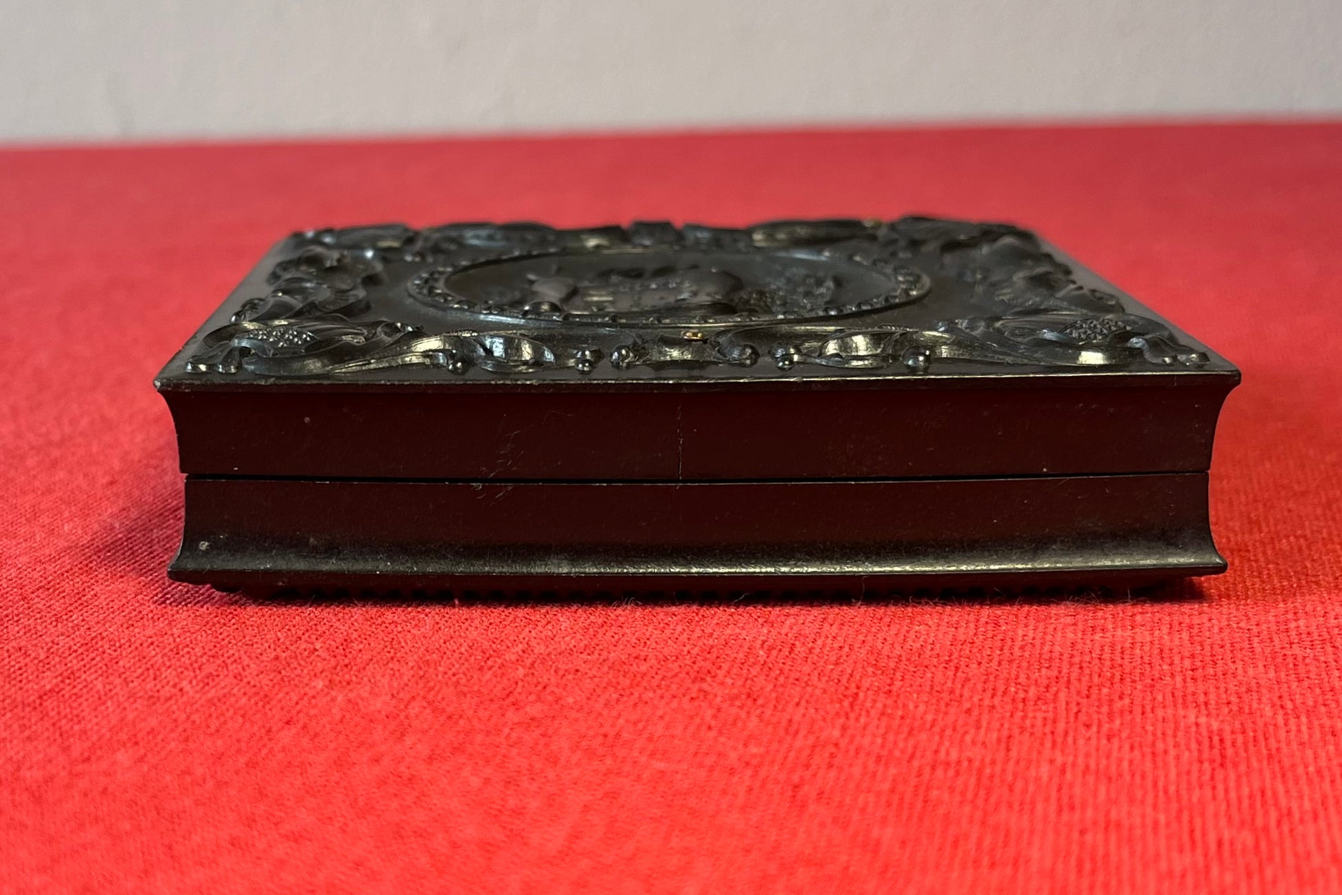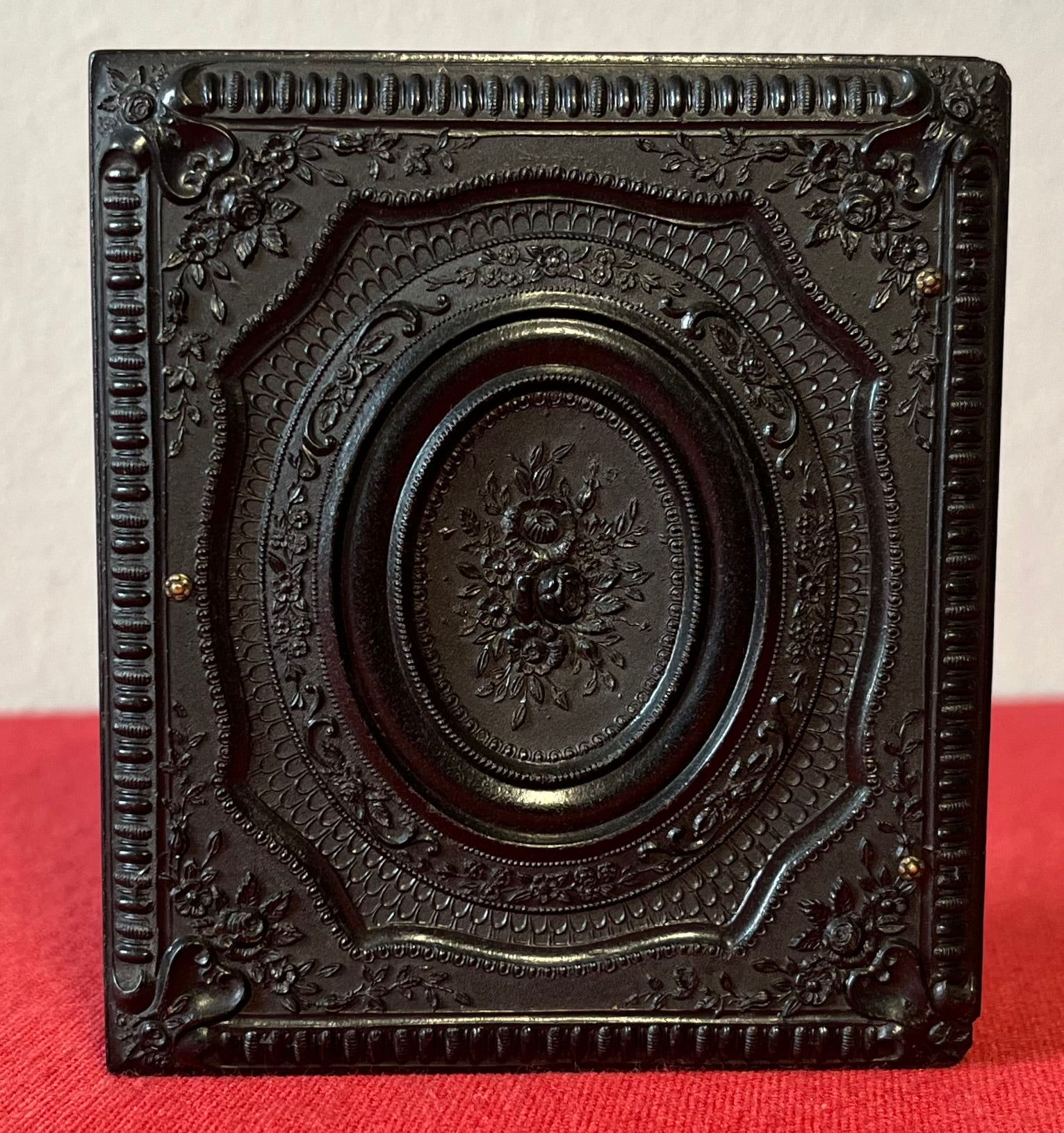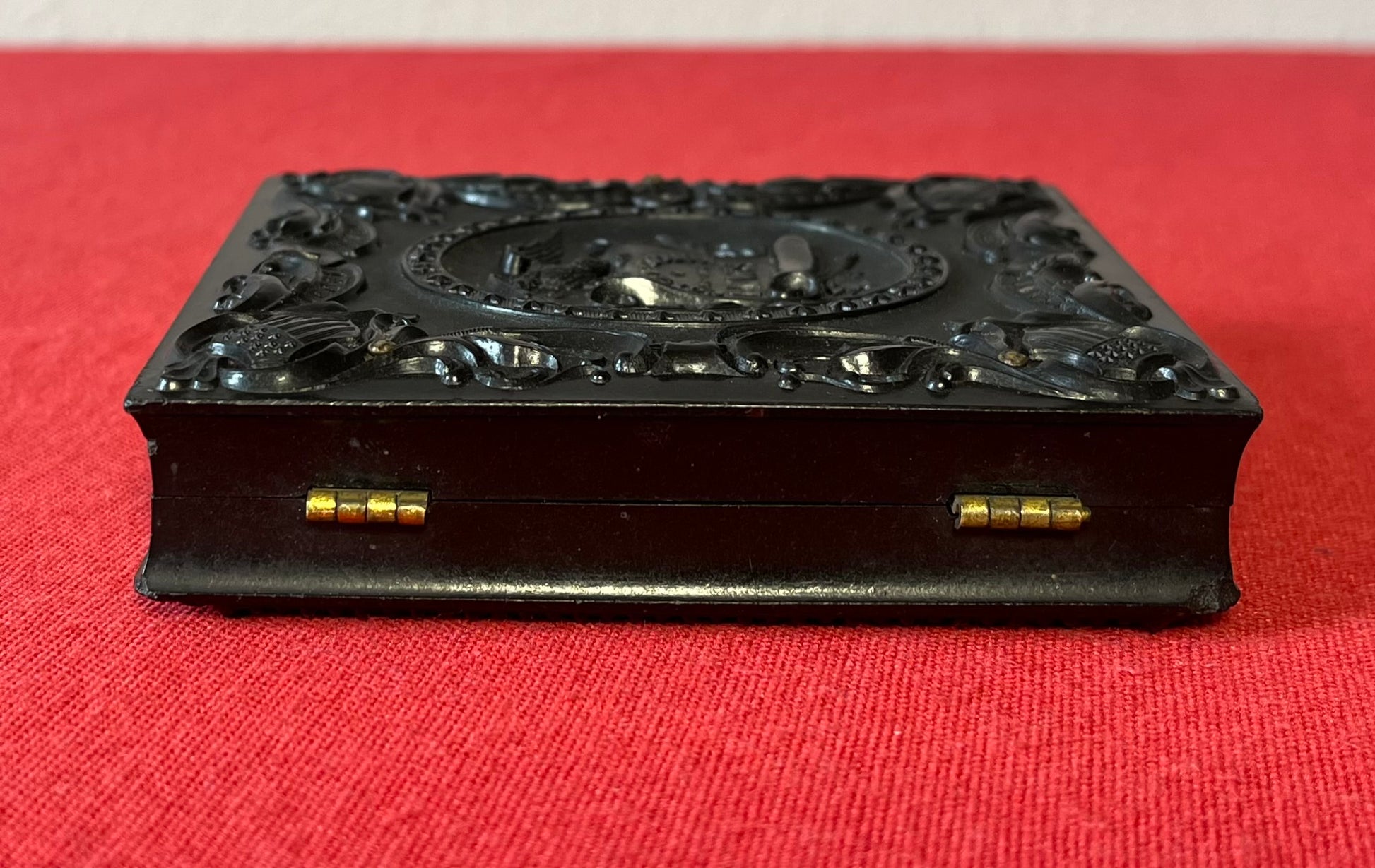 Civil War Soldier Image (Sixth Plate) in "Scarce” Constitution Case Case Scarce / Civil War 1850’s Patriotic Daguerreotype Image Case Featuring the Constitution by Littlefield, Parsons & Co. / Sixth Plate - Size (2 ¾ x 3 ¼) Material - Gutta Percha Image Civil War soldier photographed sitting in coat and kepi / Sixth plate size / Patriotic matting “Union 76-61” |