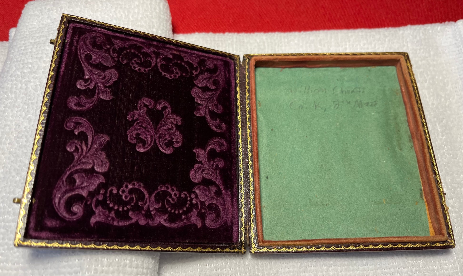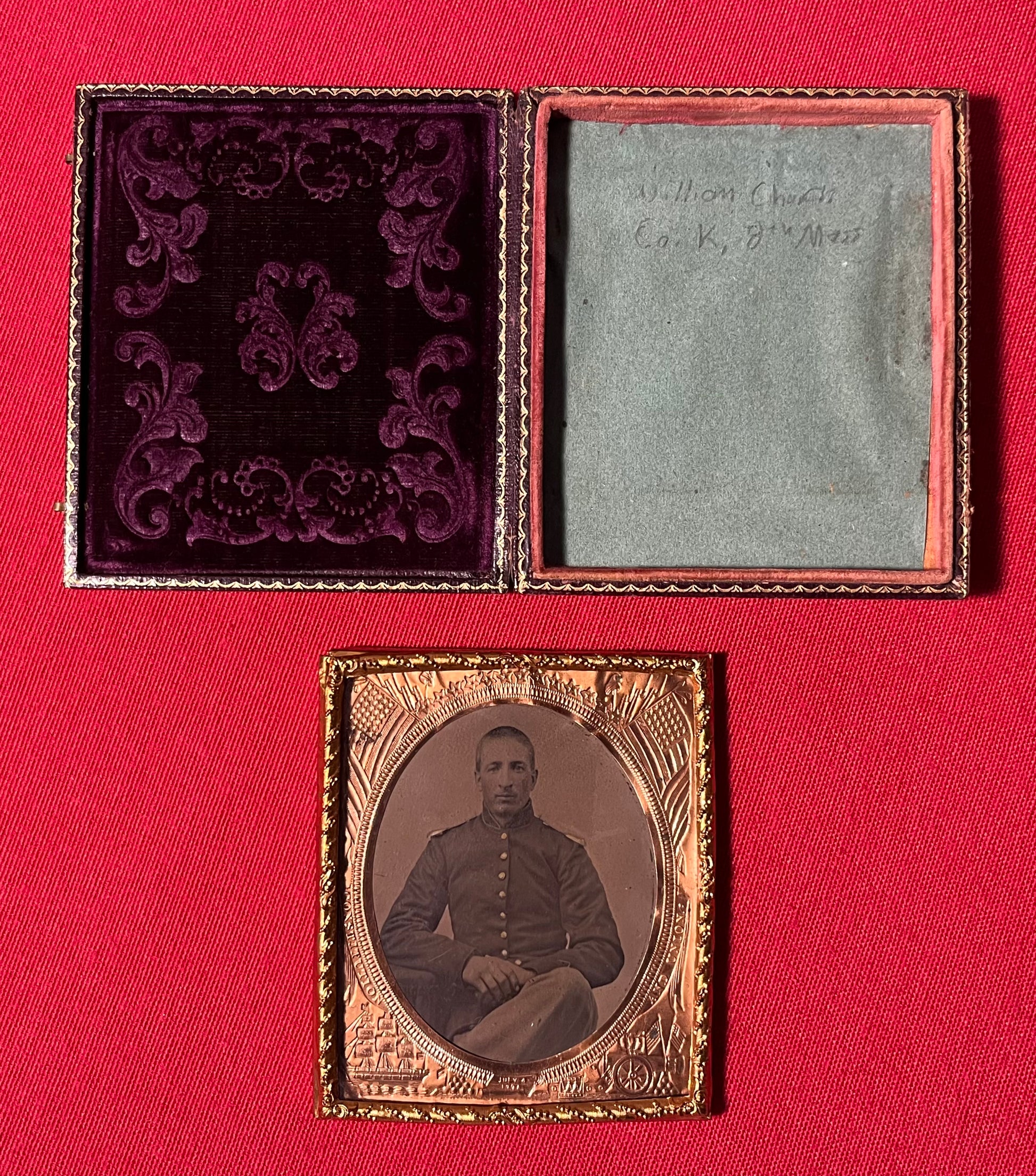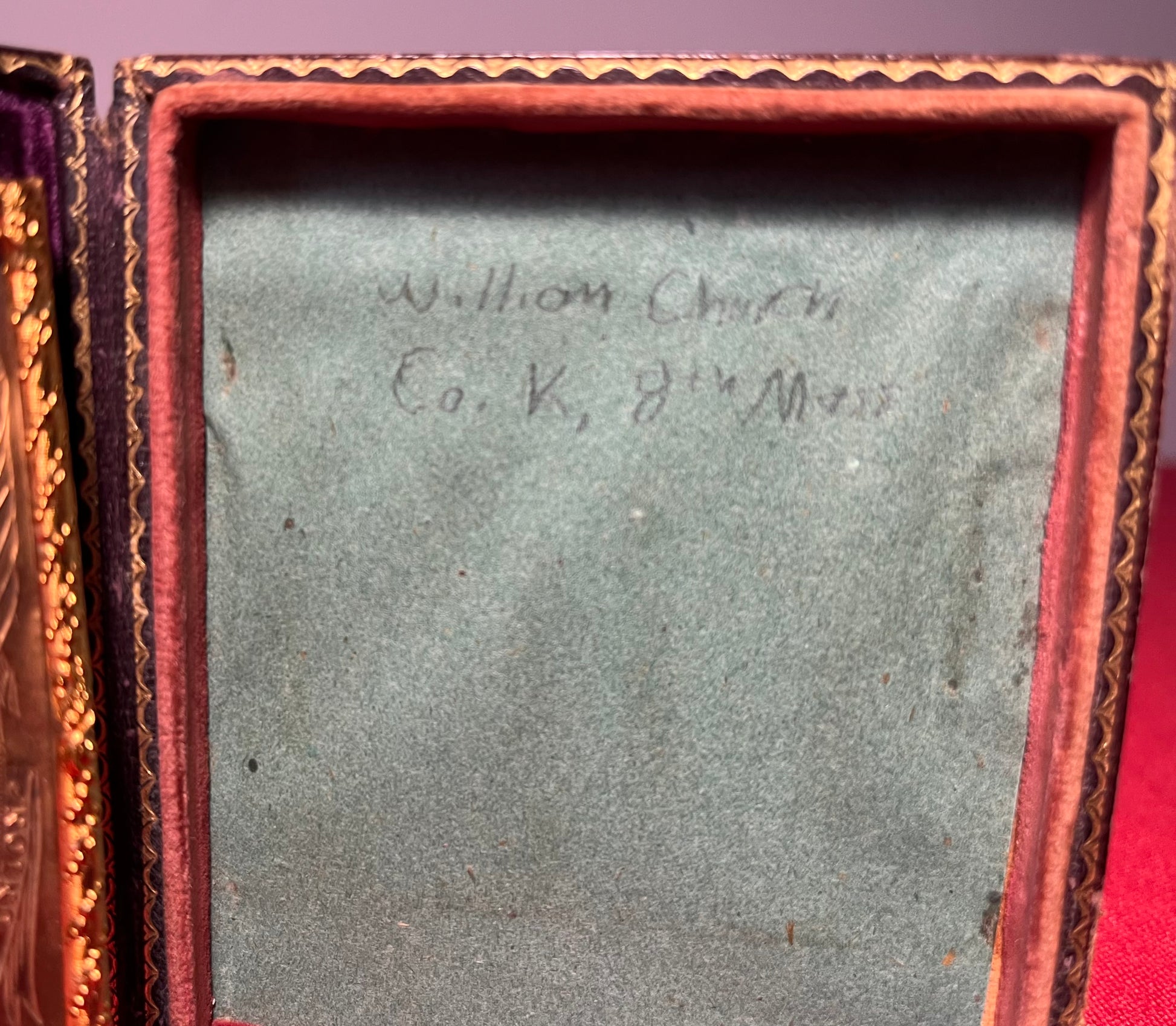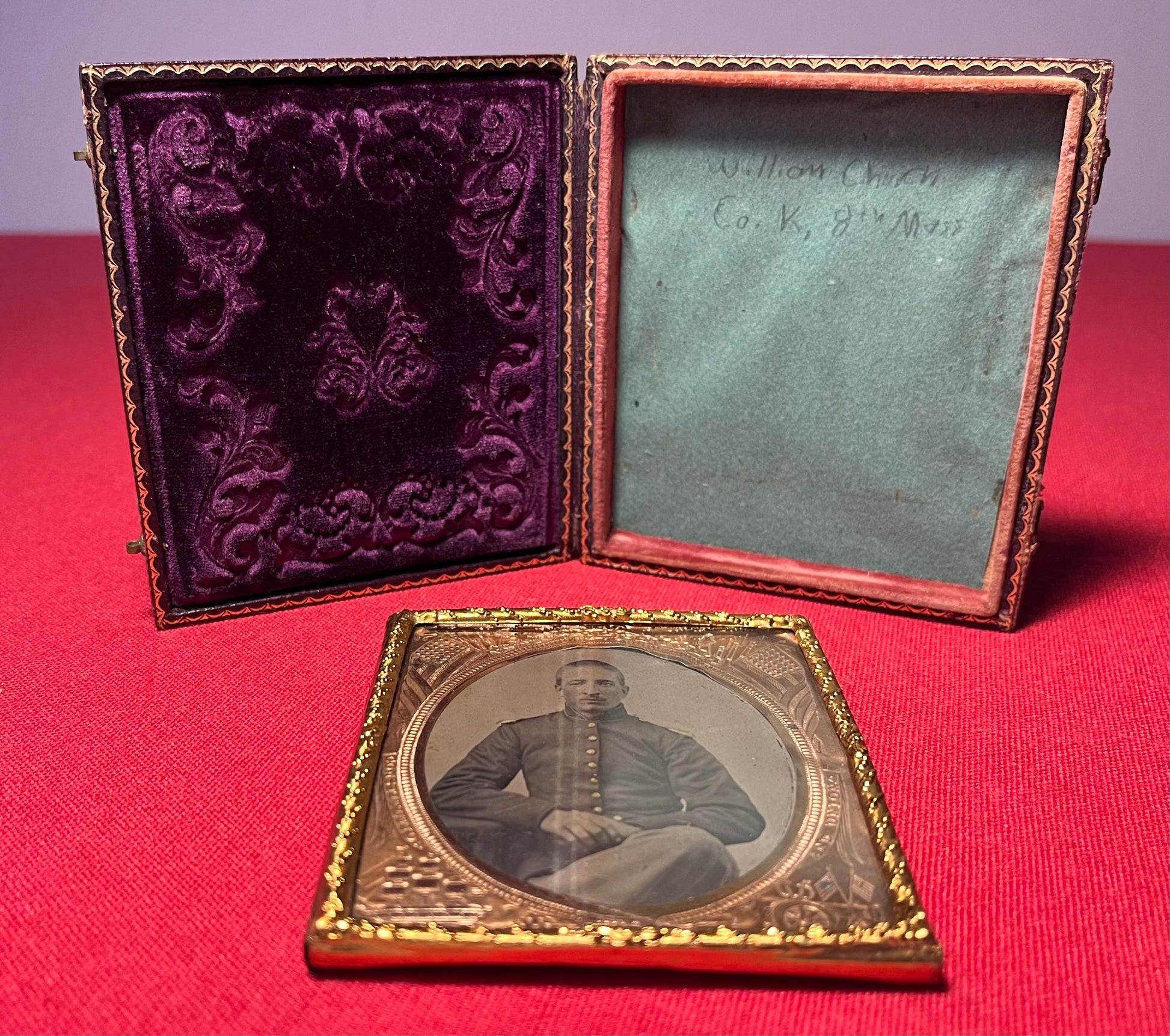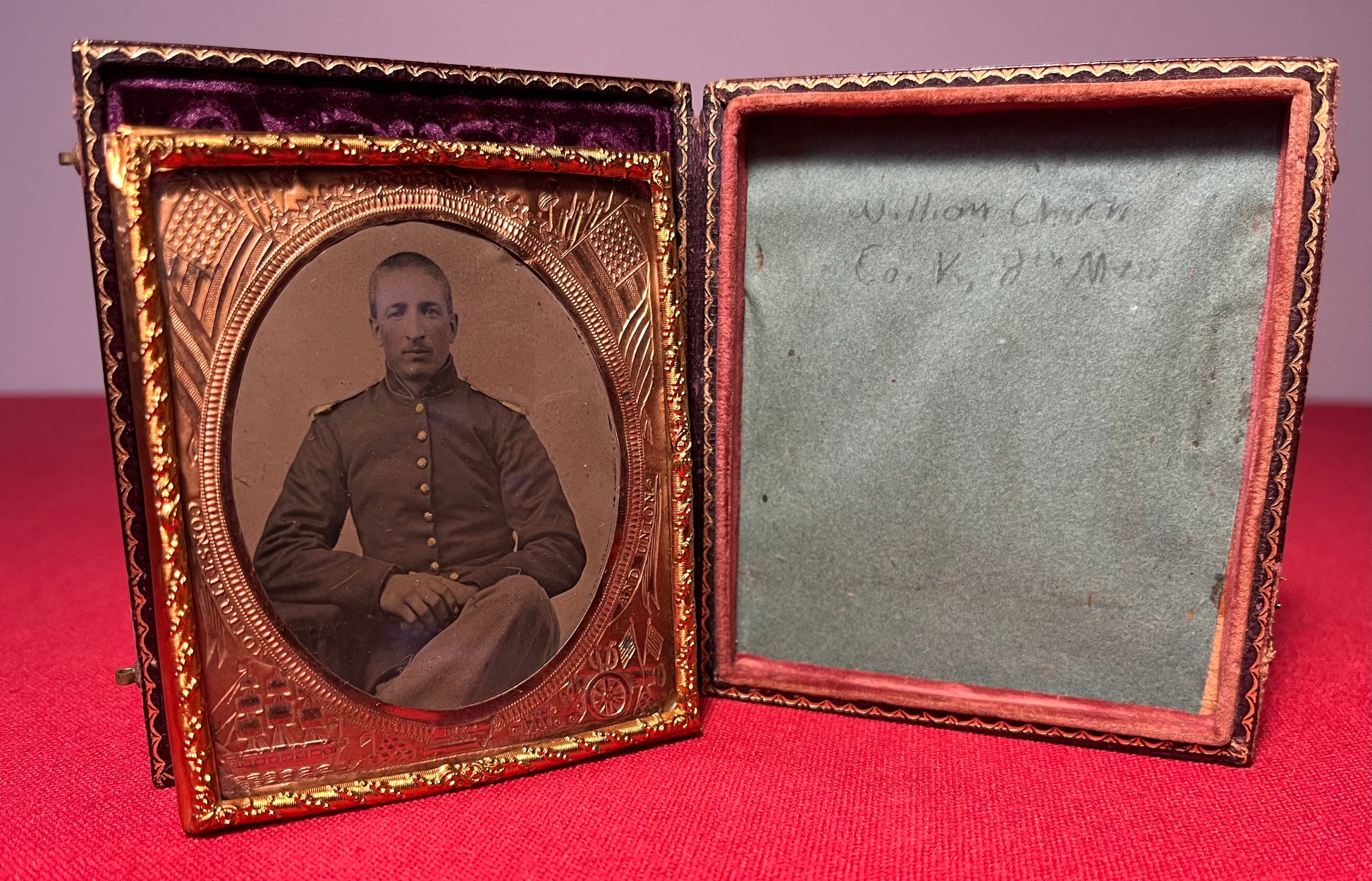 Civil War Soldier (William Church) photographed sitting with an “unusual” shaved head / Name, company and regiment found inside case / Sixth Plate size (2 ¾ x 3 ¼ ) The images case is made of leather and still partially attached / Outer binding has split and retains traces of tape residue / Image sits in a patriotic matte