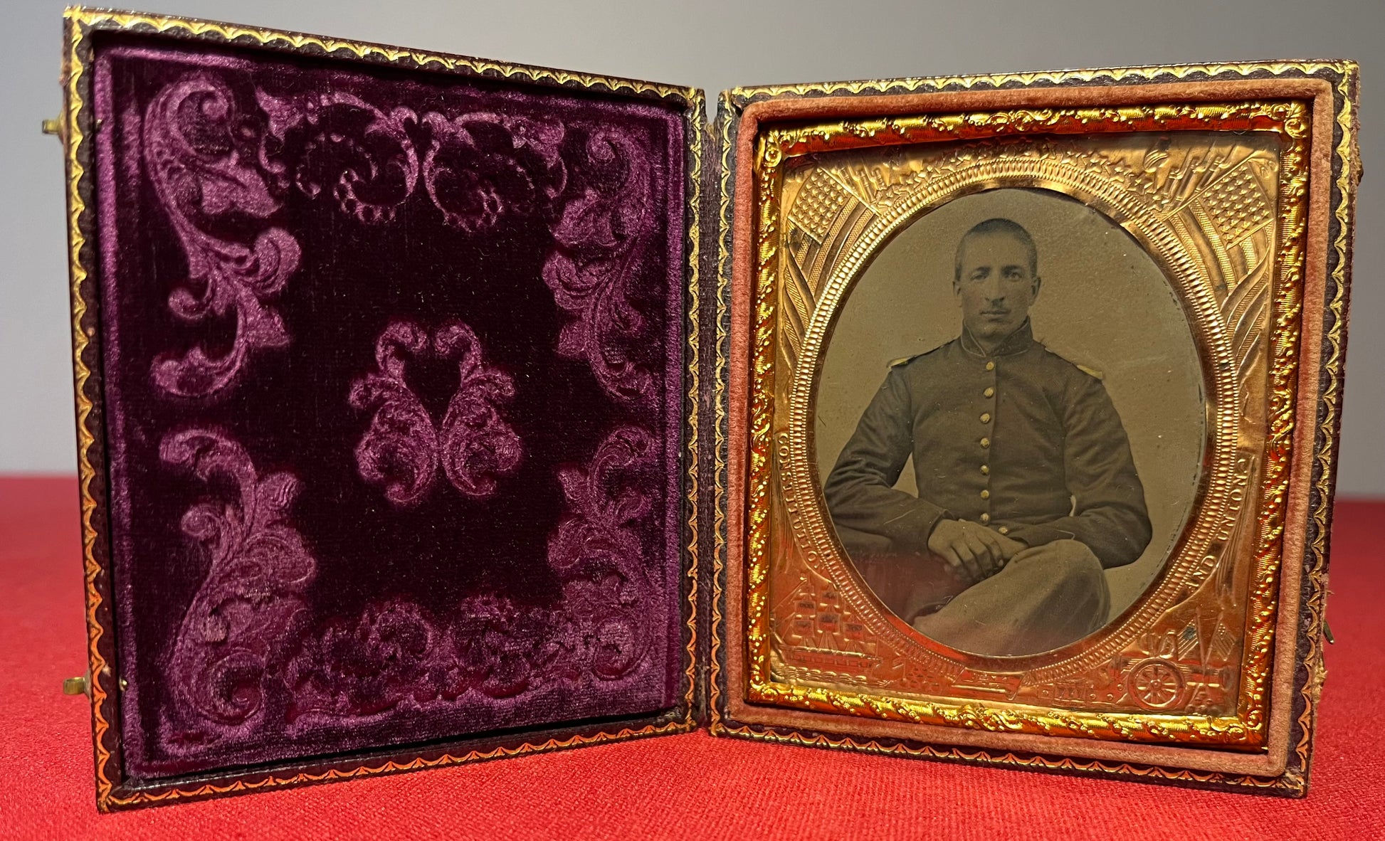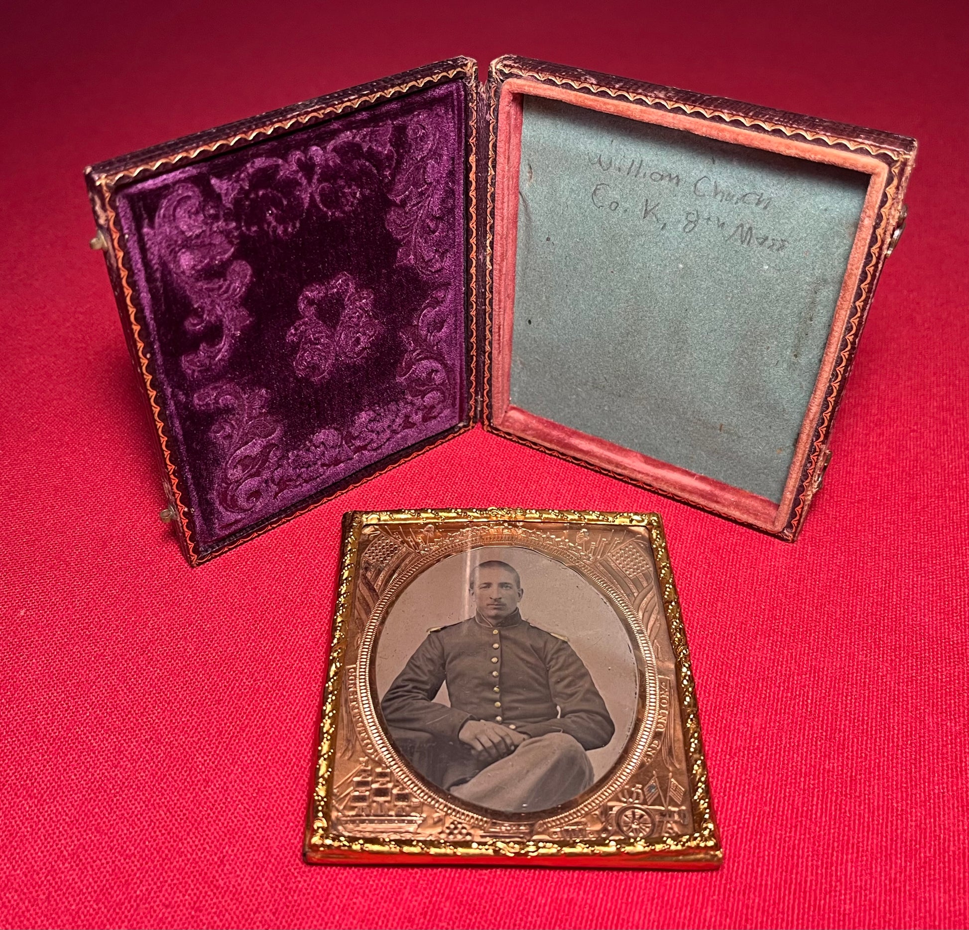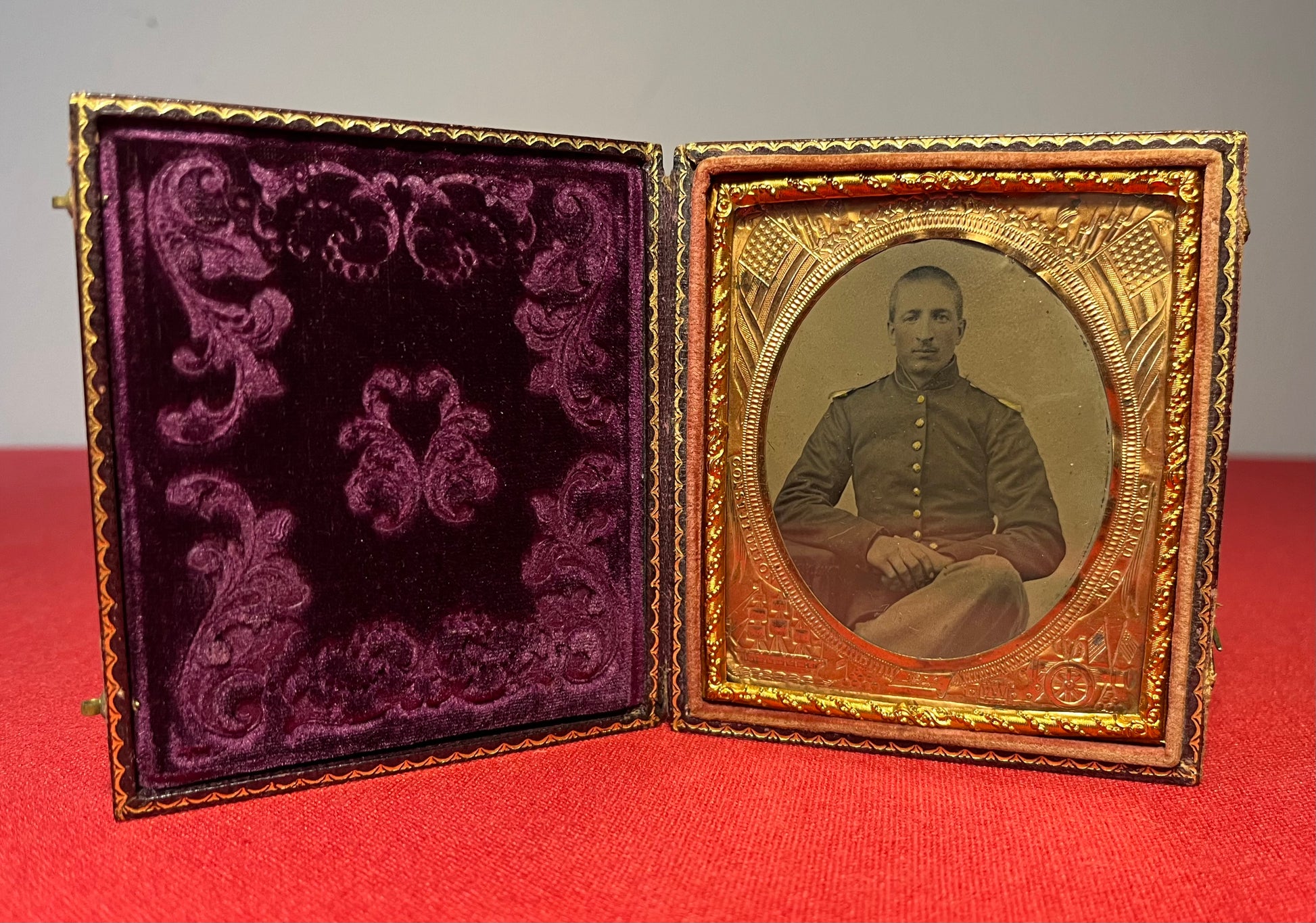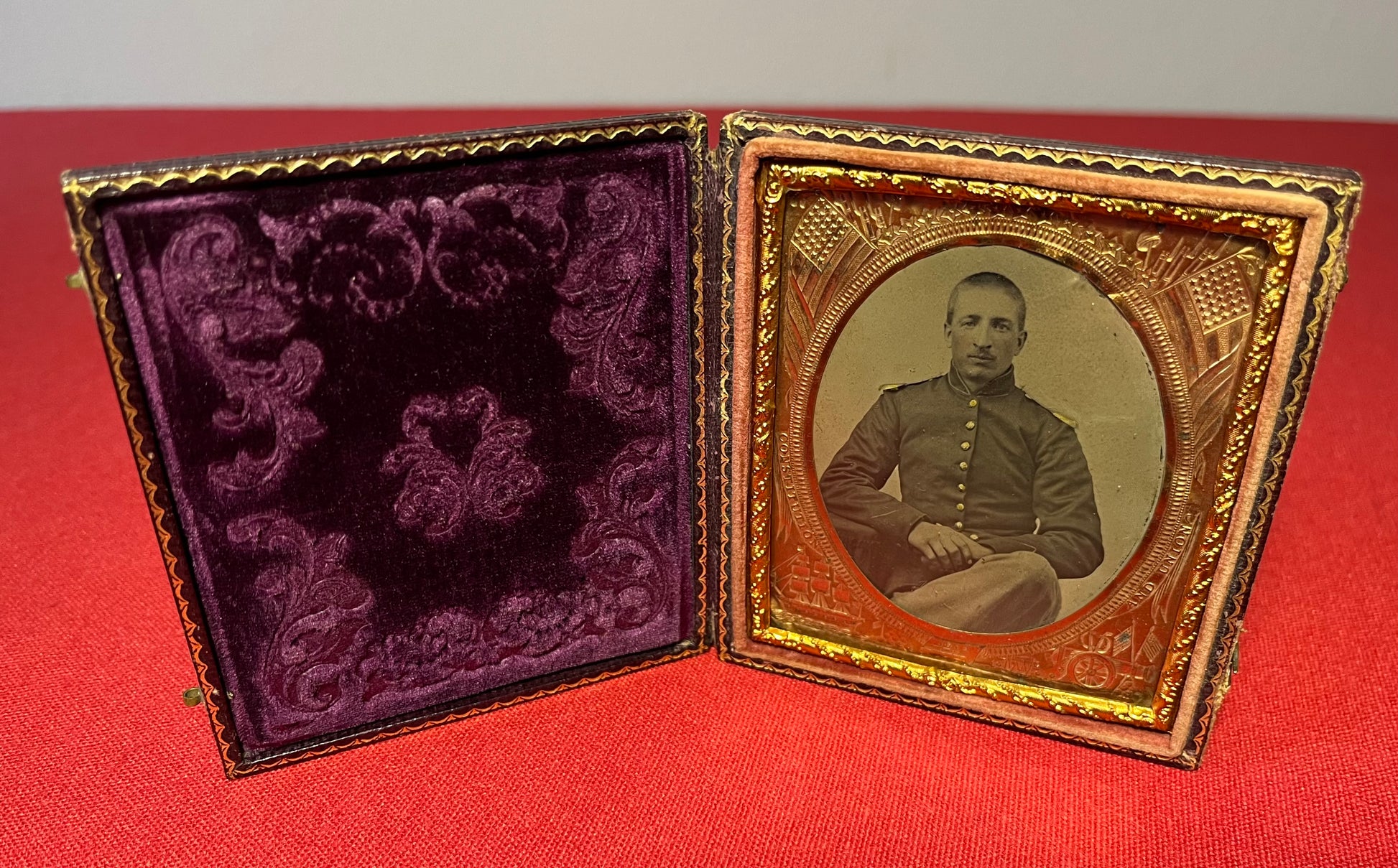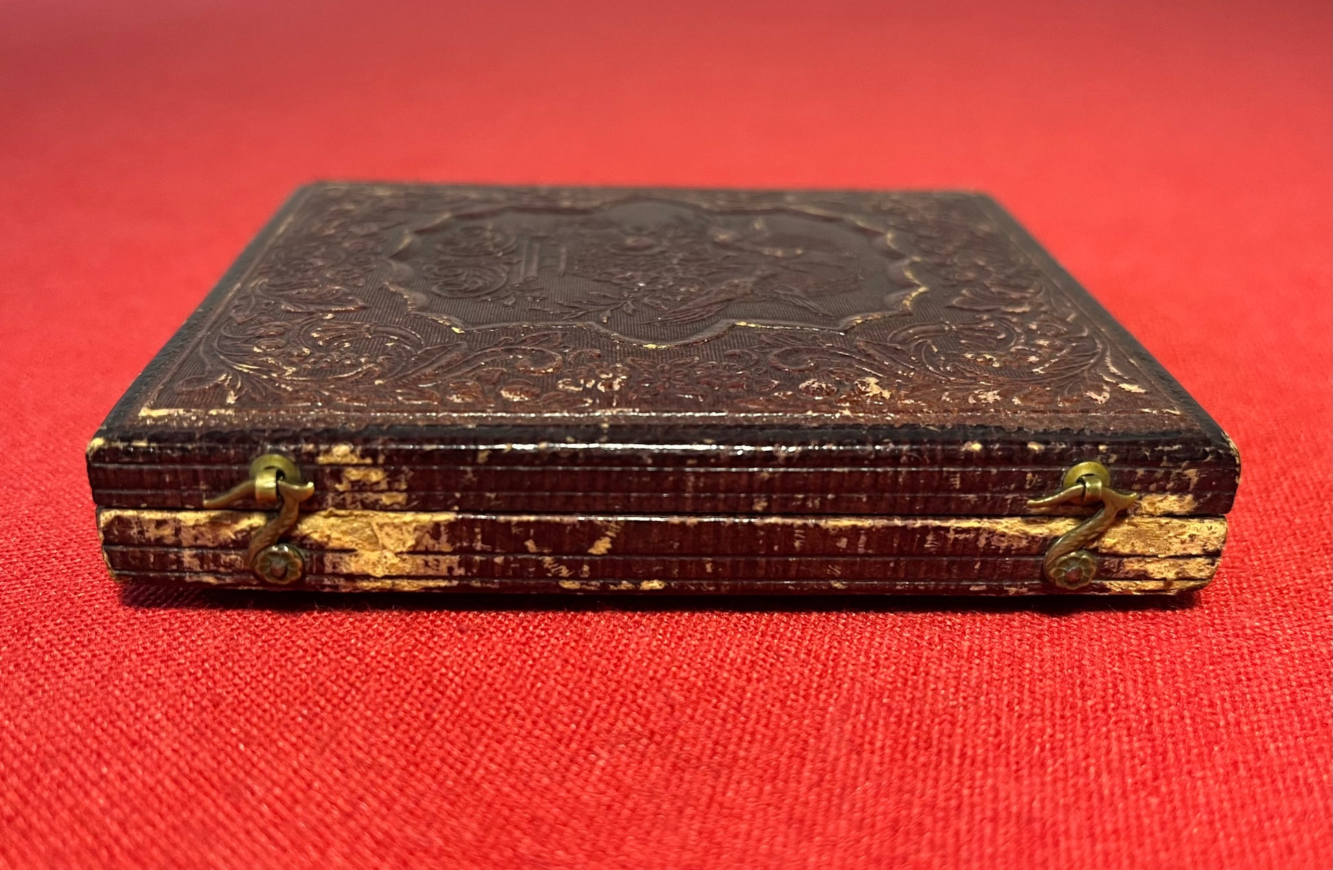 Civil War Soldier (William Church) photographed sitting with an “unusual” shaved head / Name, company and regiment found inside case / Sixth Plate size (2 ¾ x 3 ¼ ) The images case is made of leather and still partially attached / Outer binding has split and retains traces of tape residue / Image sits in a patriotic matte