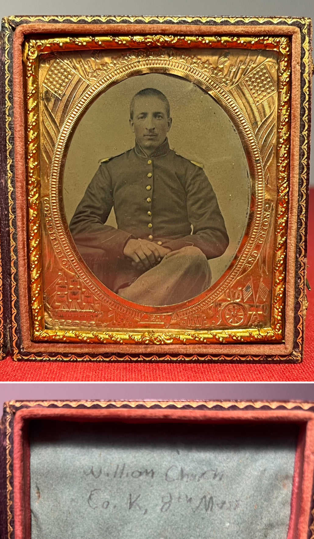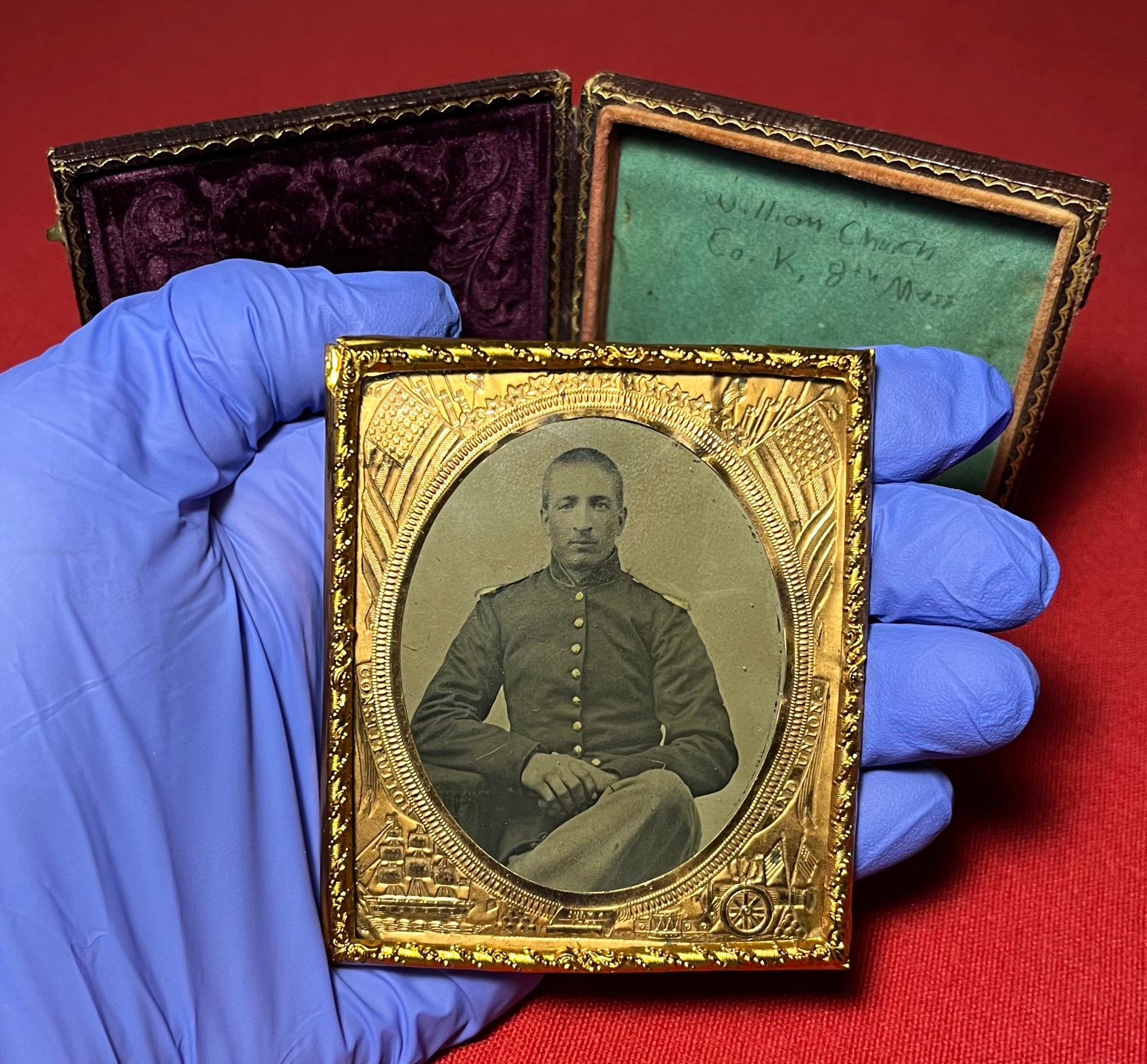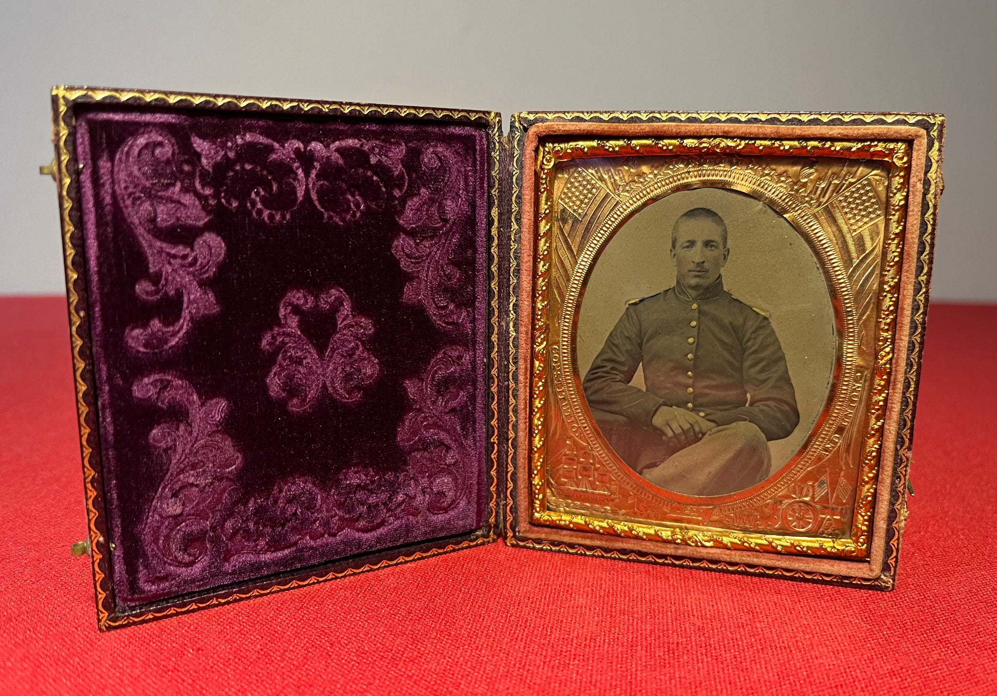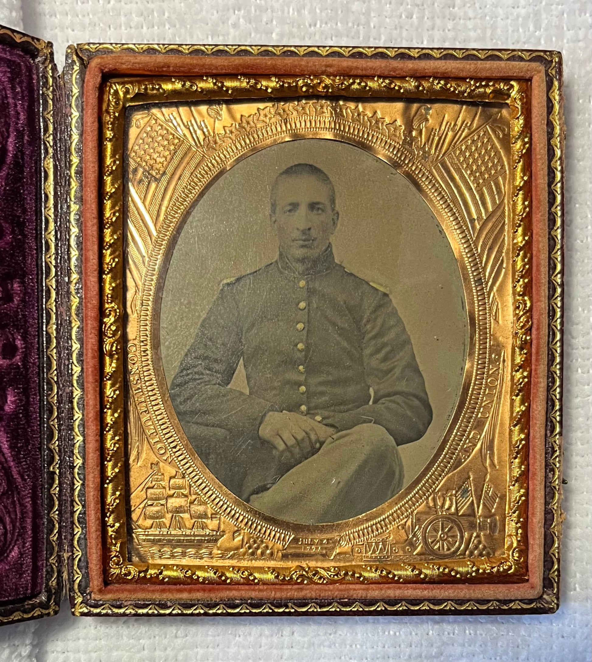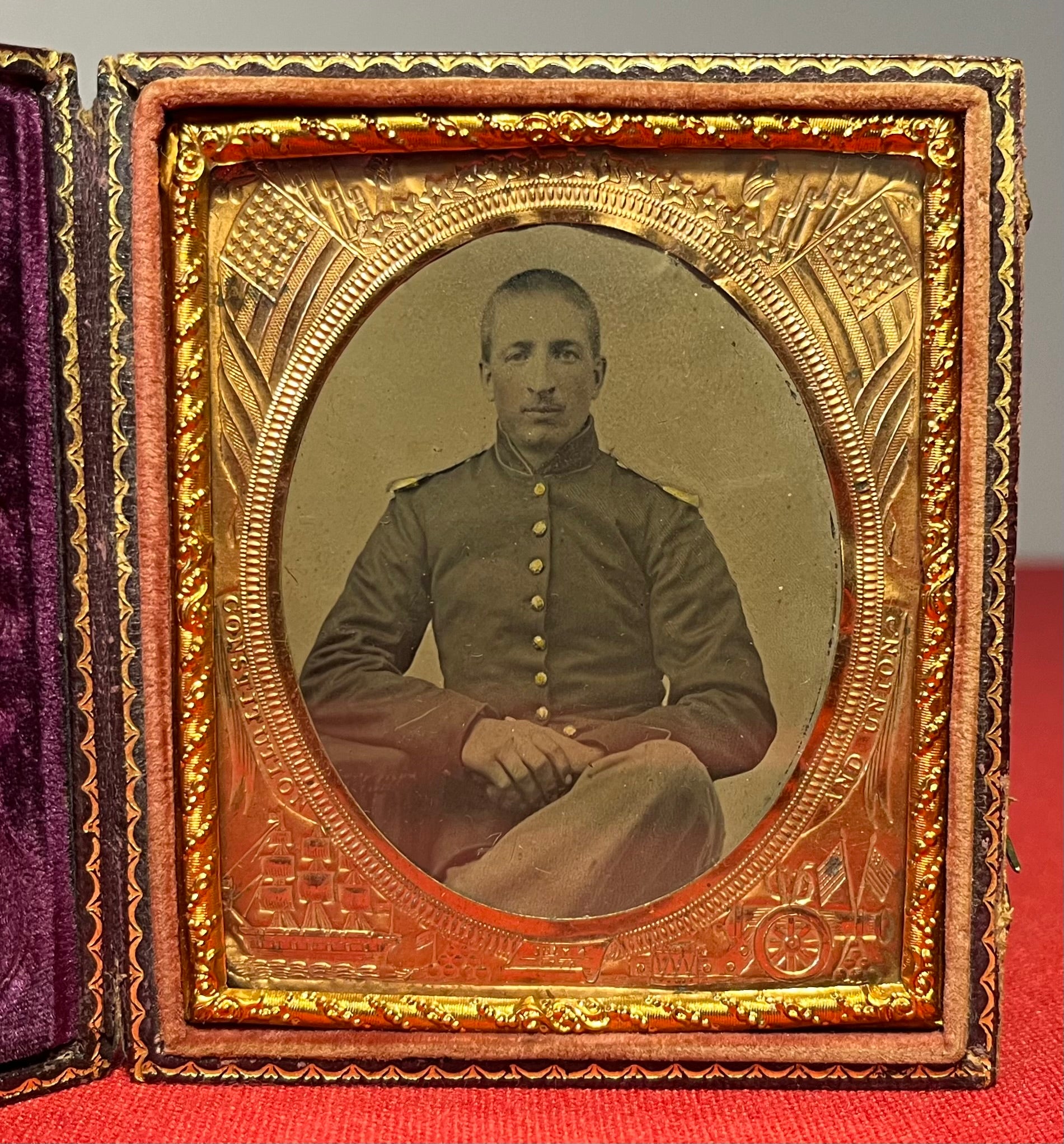 Civil War Soldier (William Church) photographed sitting with an “unusual” shaved head / Name, company and regiment found inside case / Sixth Plate size (2 ¾ x 3 ¼ ) The images case is made of leather and still partially attached / Outer binding has split and retains traces of tape residue / Image sits in a patriotic matte