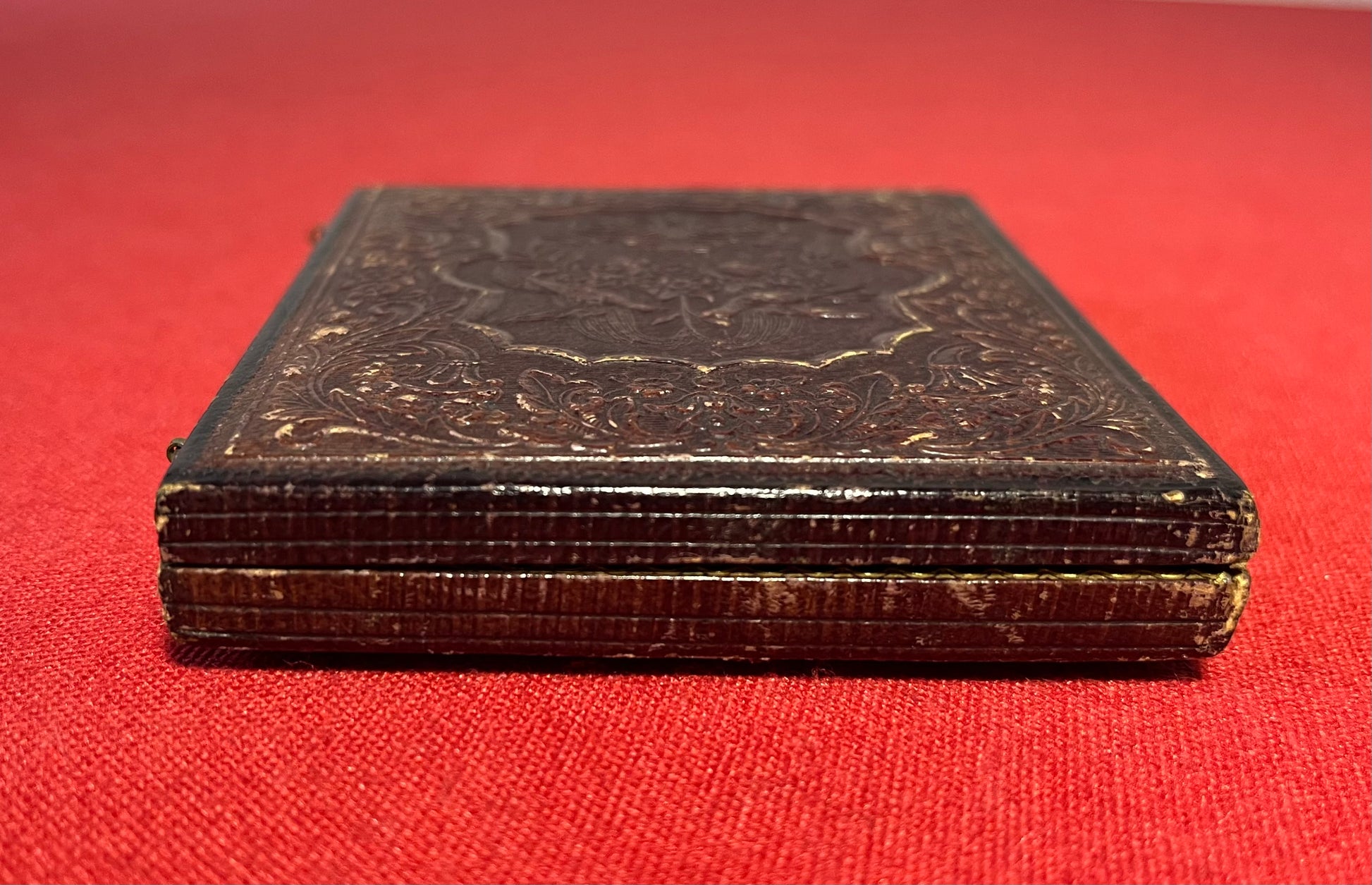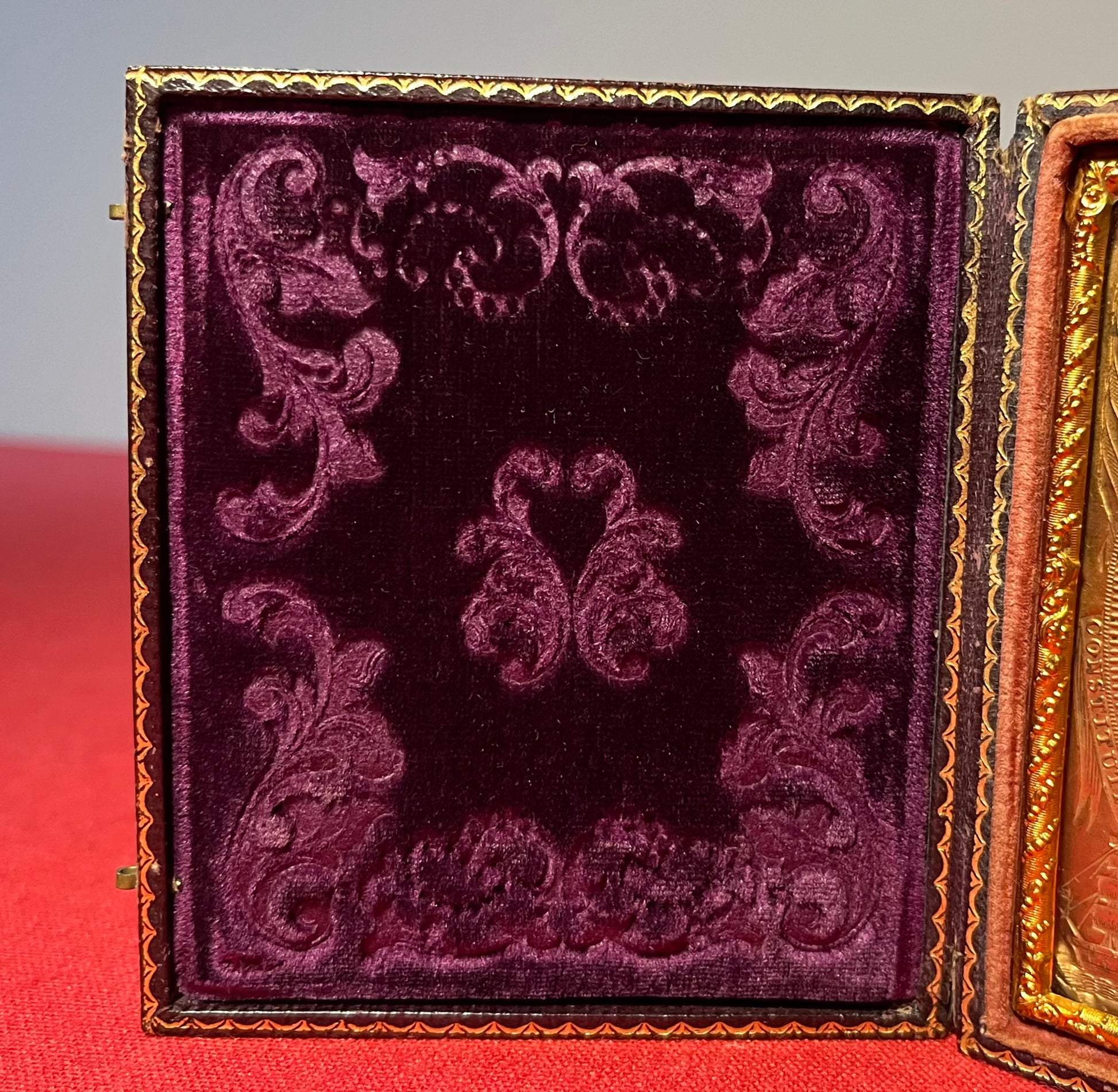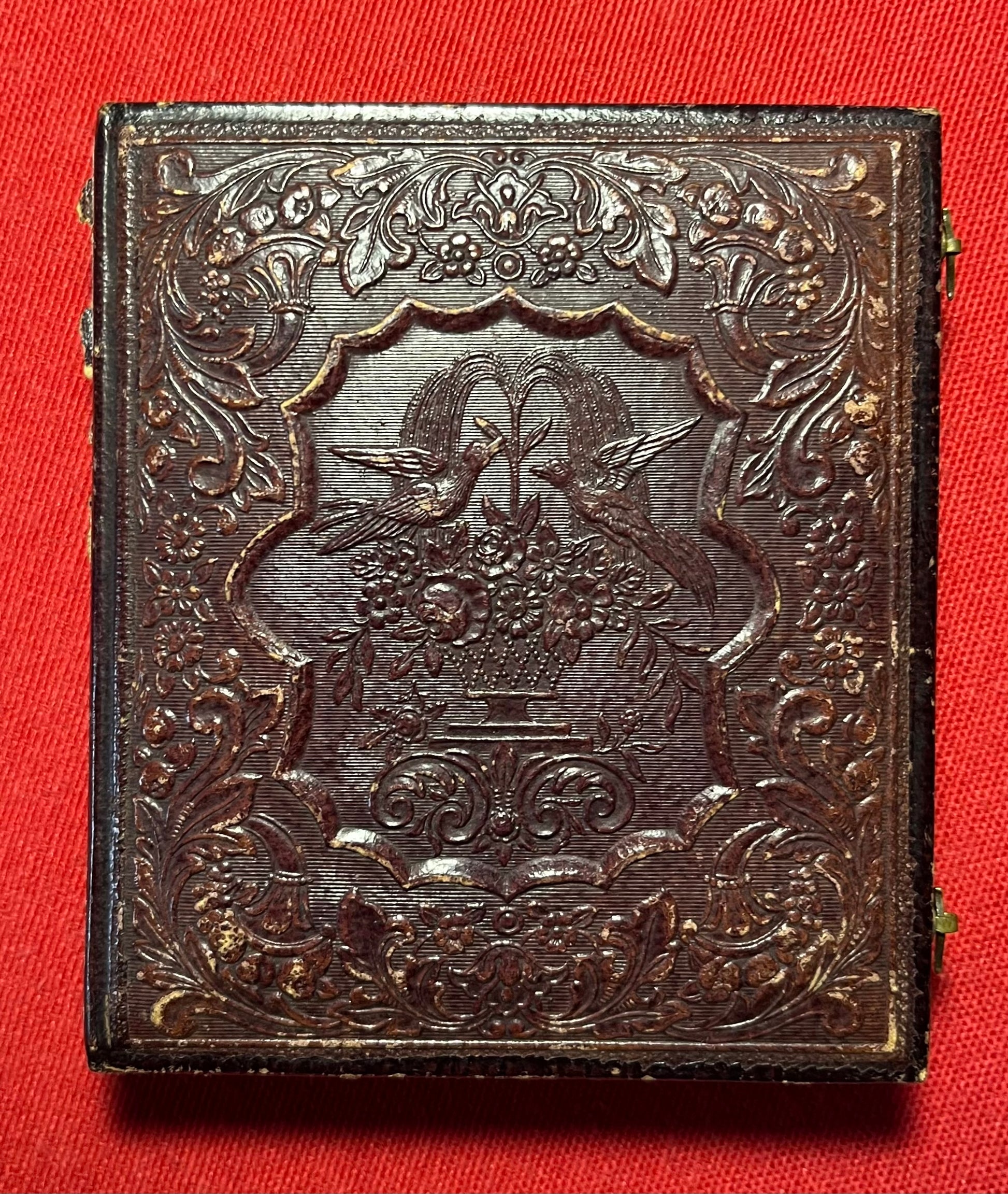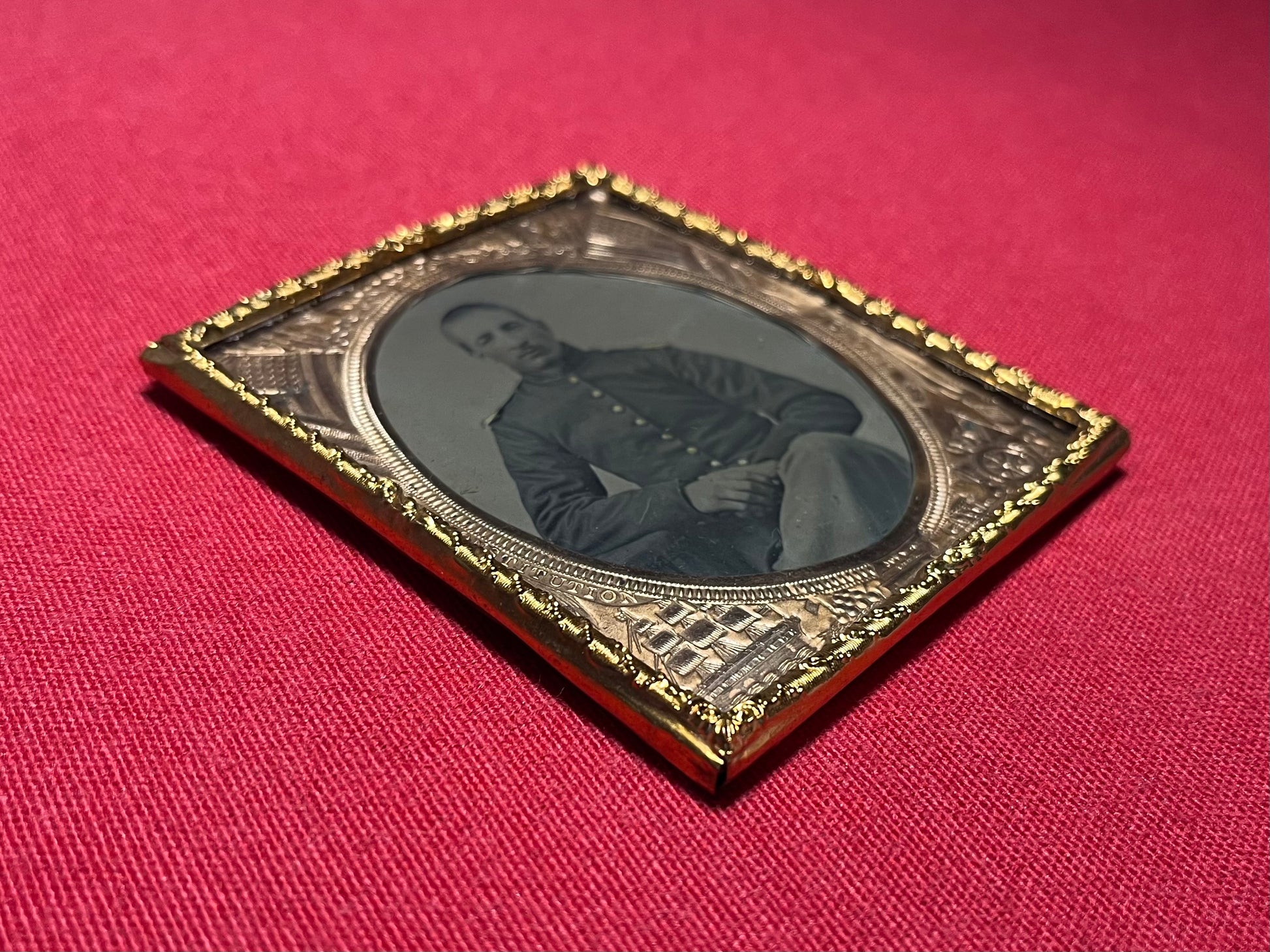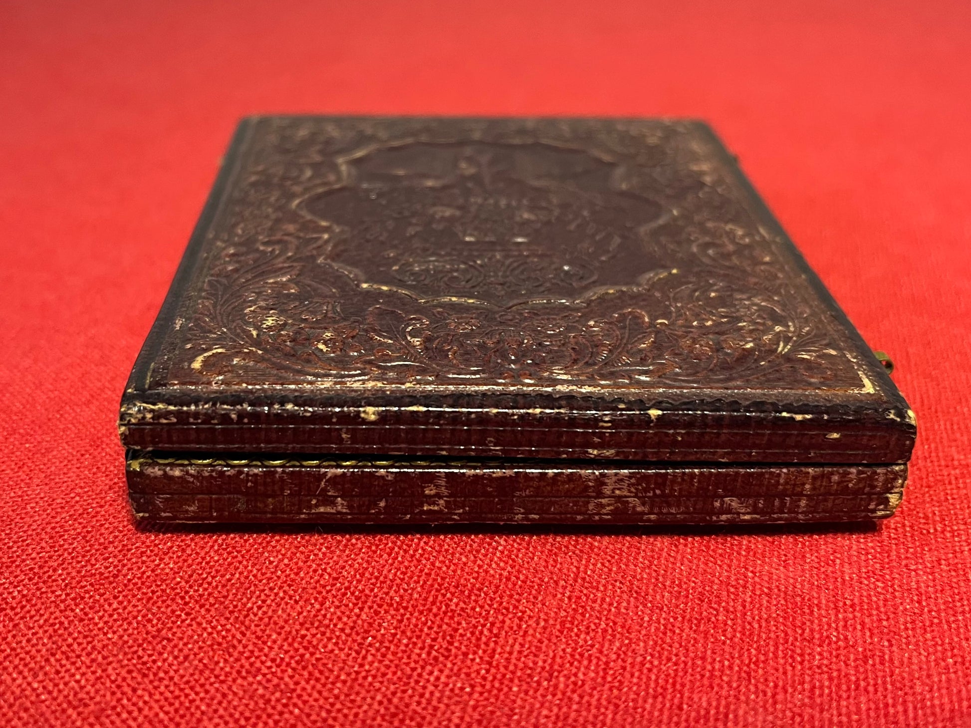 Civil War Soldier (William Church) photographed sitting with an “unusual” shaved head / Name, company and regiment found inside case / Sixth Plate size (2 ¾ x 3 ¼ ) The images case is made of leather and still partially attached / Outer binding has split and retains traces of tape residue / Image sits in a patriotic matte