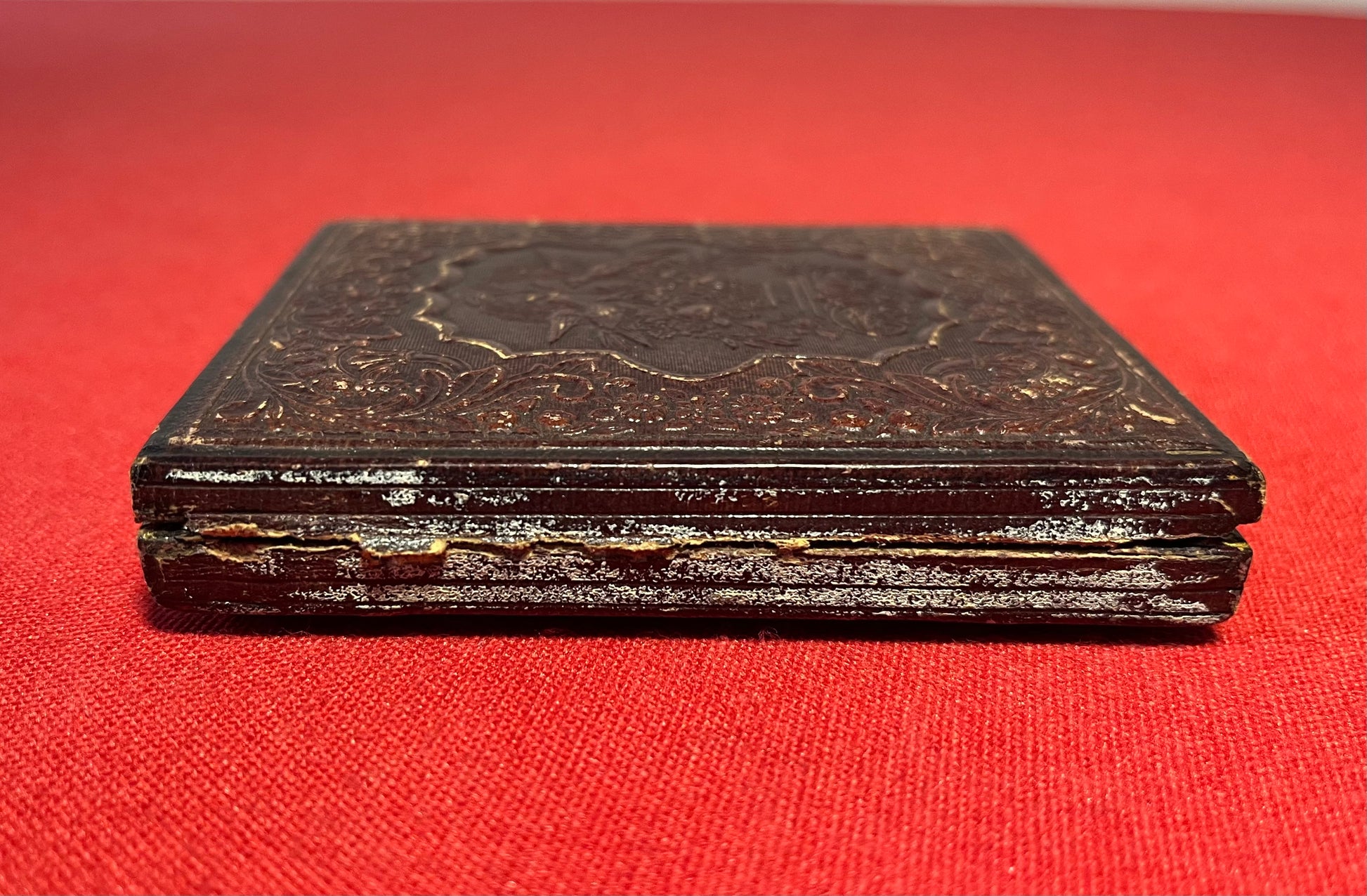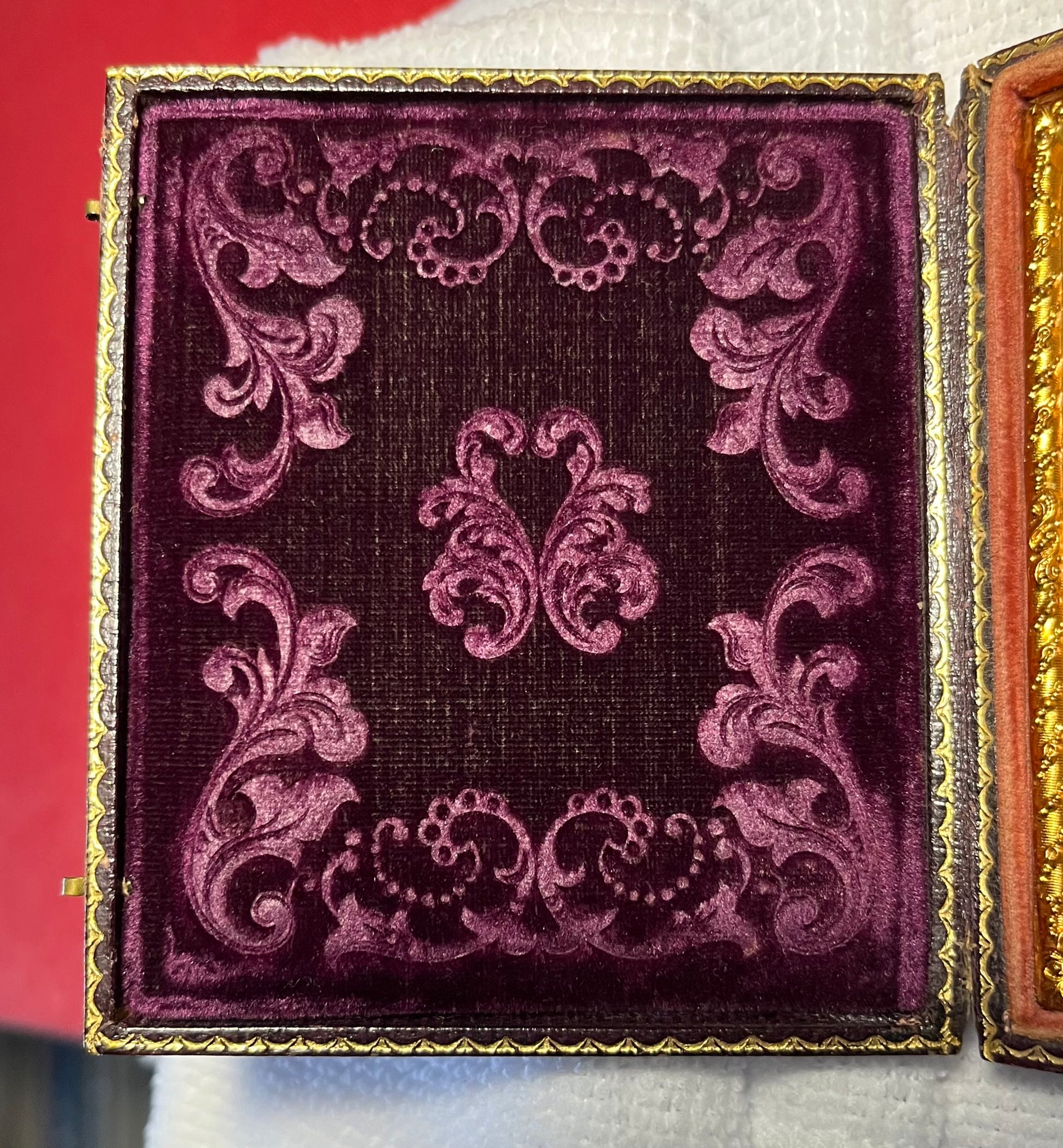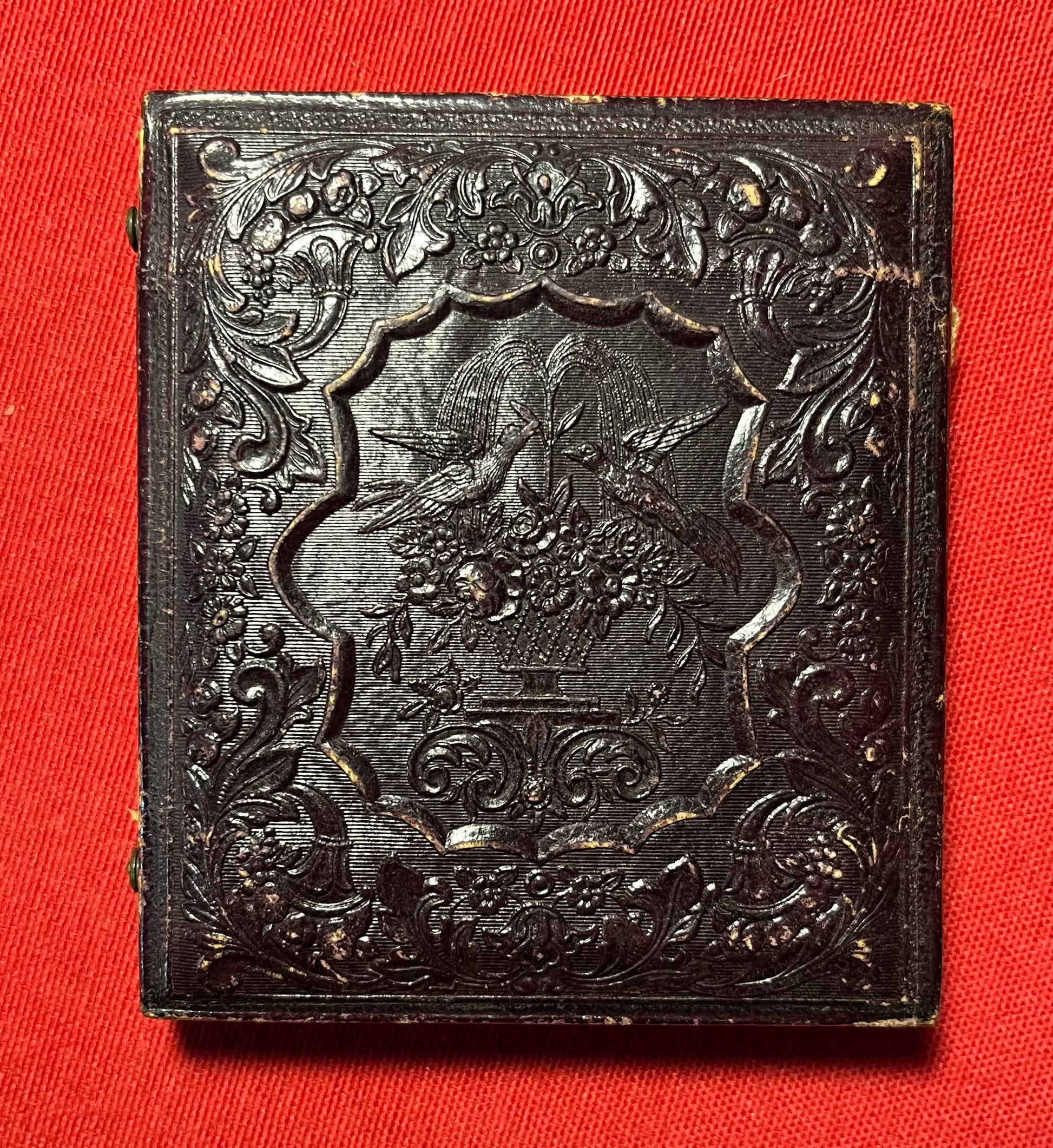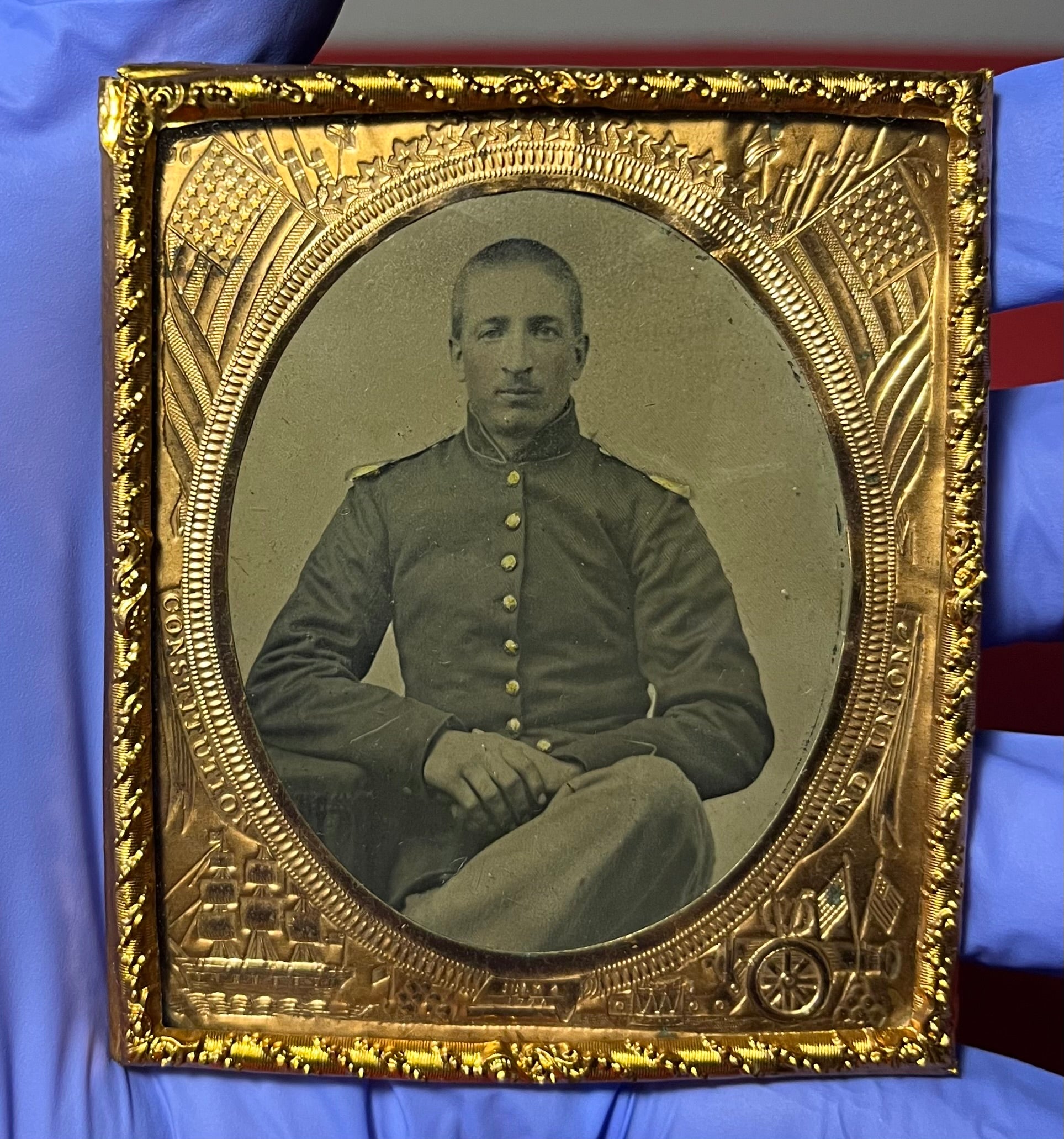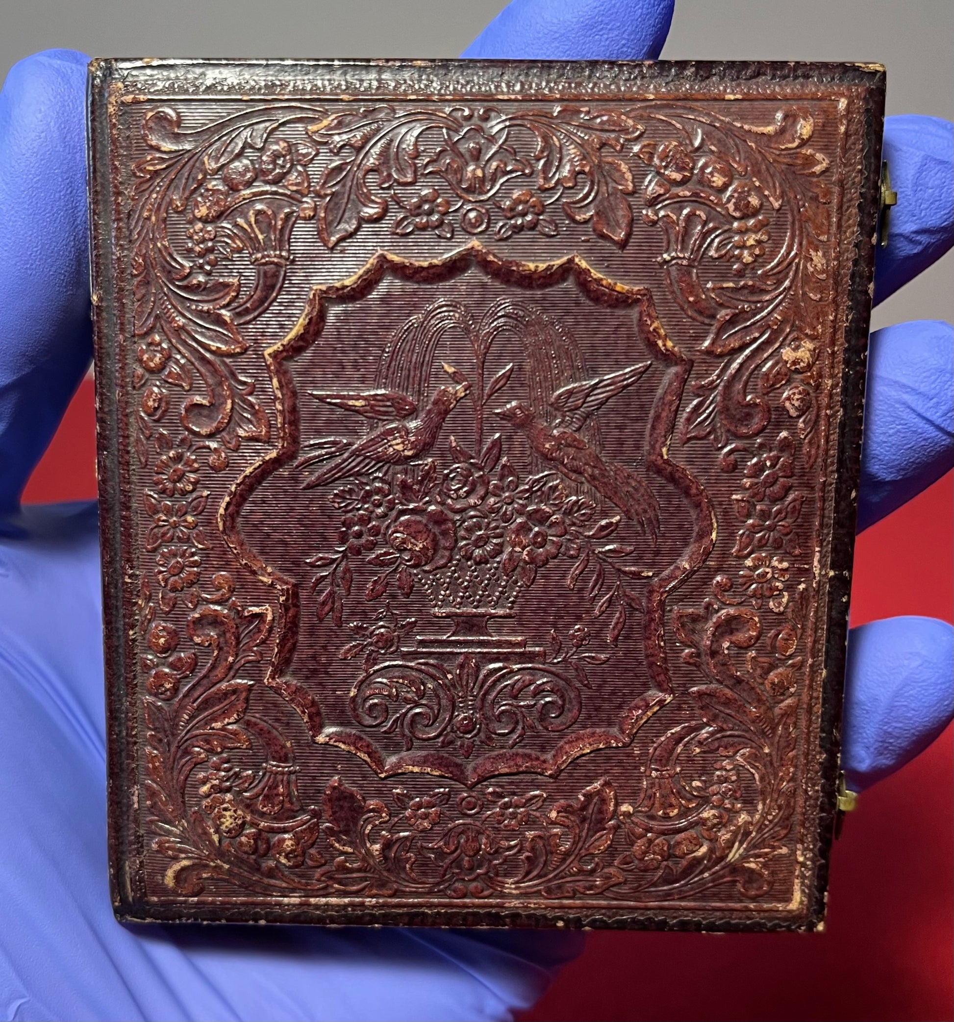 Civil War Soldier (William Church) photographed sitting with an “unusual” shaved head / Name, company and regiment found inside case / Sixth Plate size (2 ¾ x 3 ¼ ) The images case is made of leather and still partially attached / Outer binding has split and retains traces of tape residue / Image sits in a patriotic matte