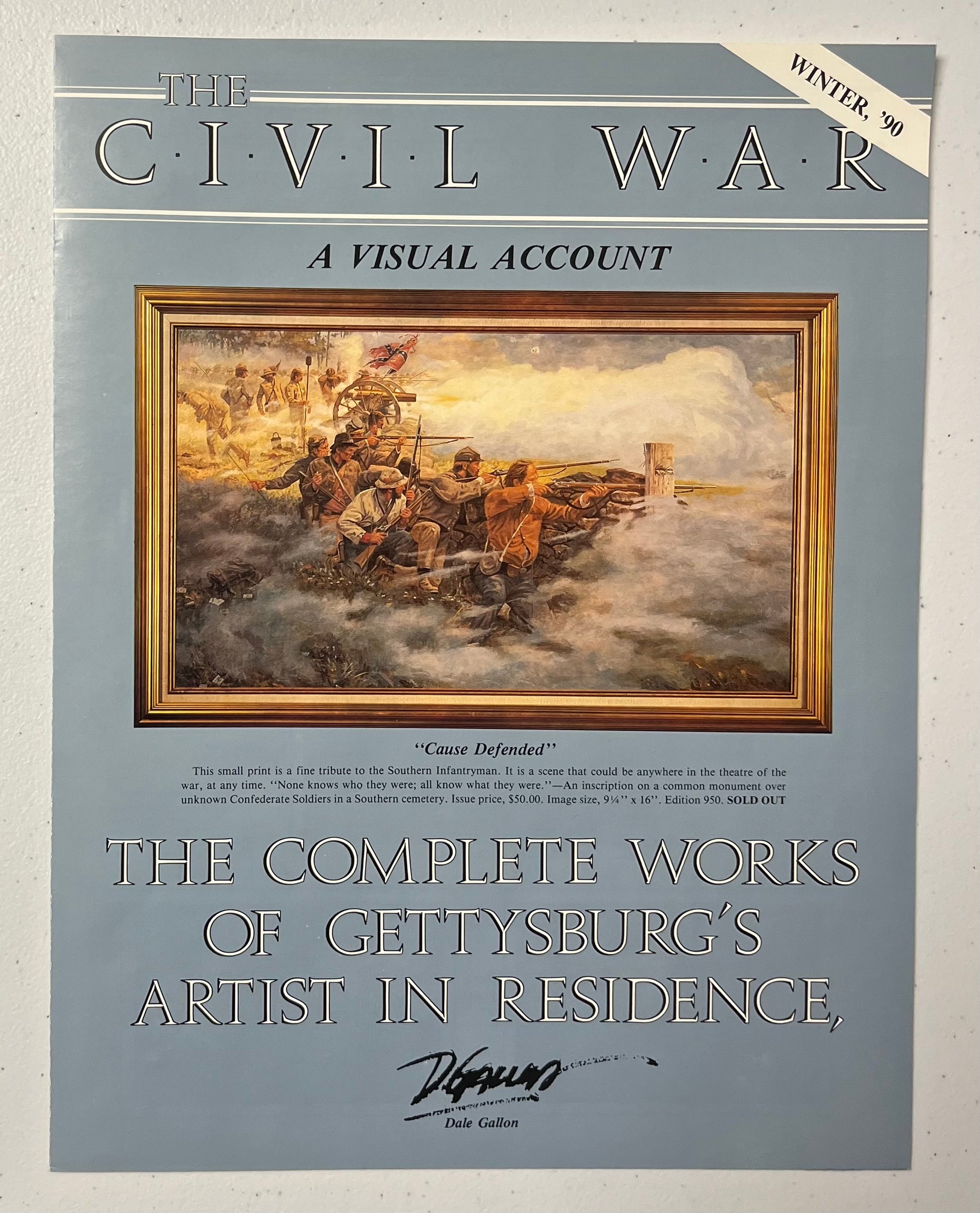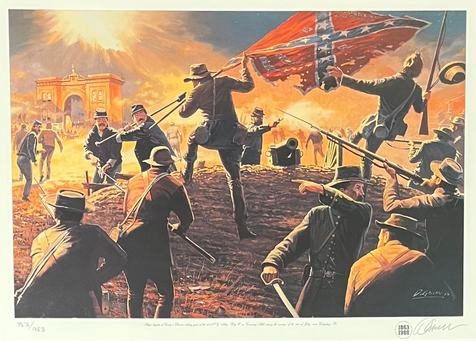 10 1/2 x 15 3/4 limited edition signed & numbered (1863 in edition) civil war framed print of General Harry T. Hays Louisiana Brigade attacking the First New York Artillery by artist Dale Gallon