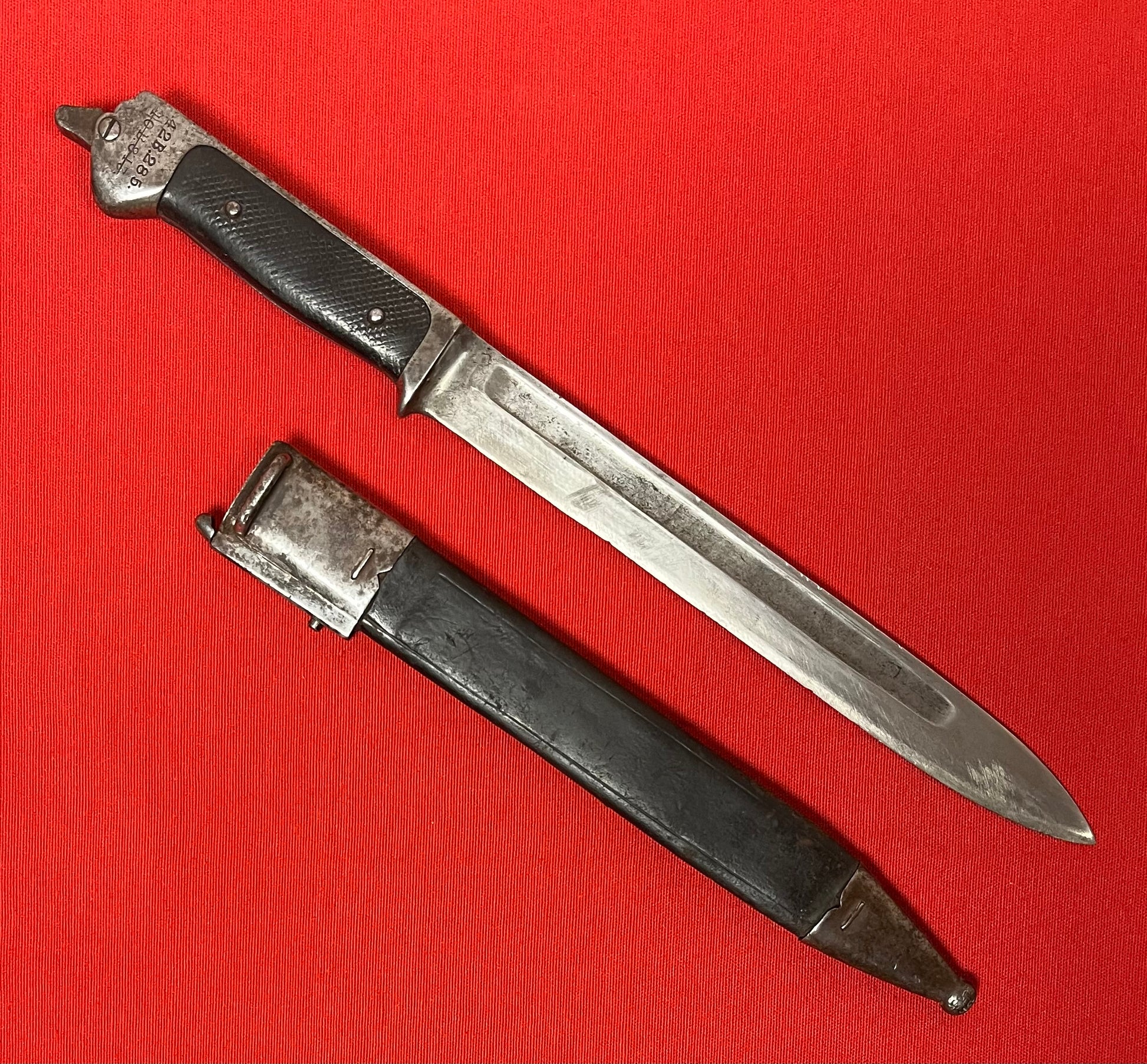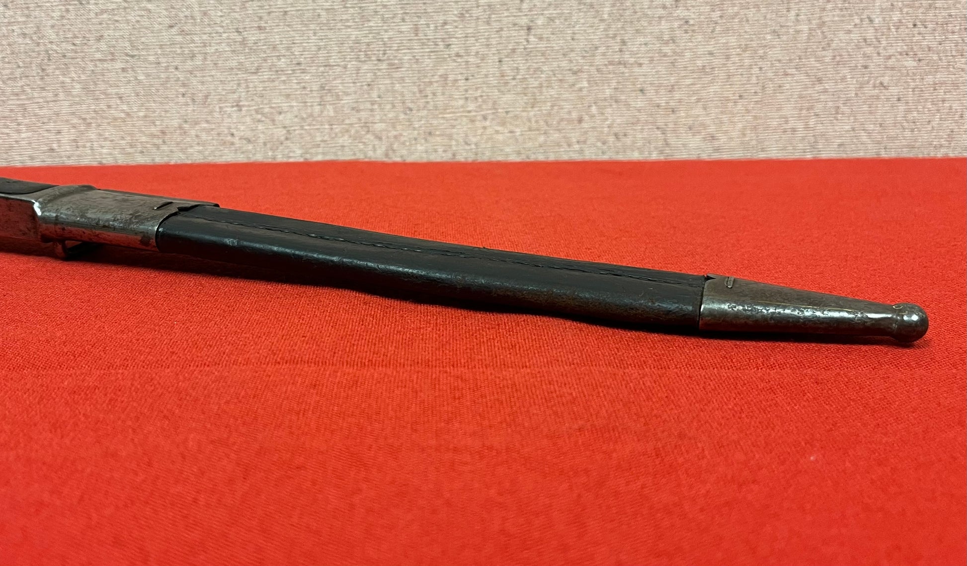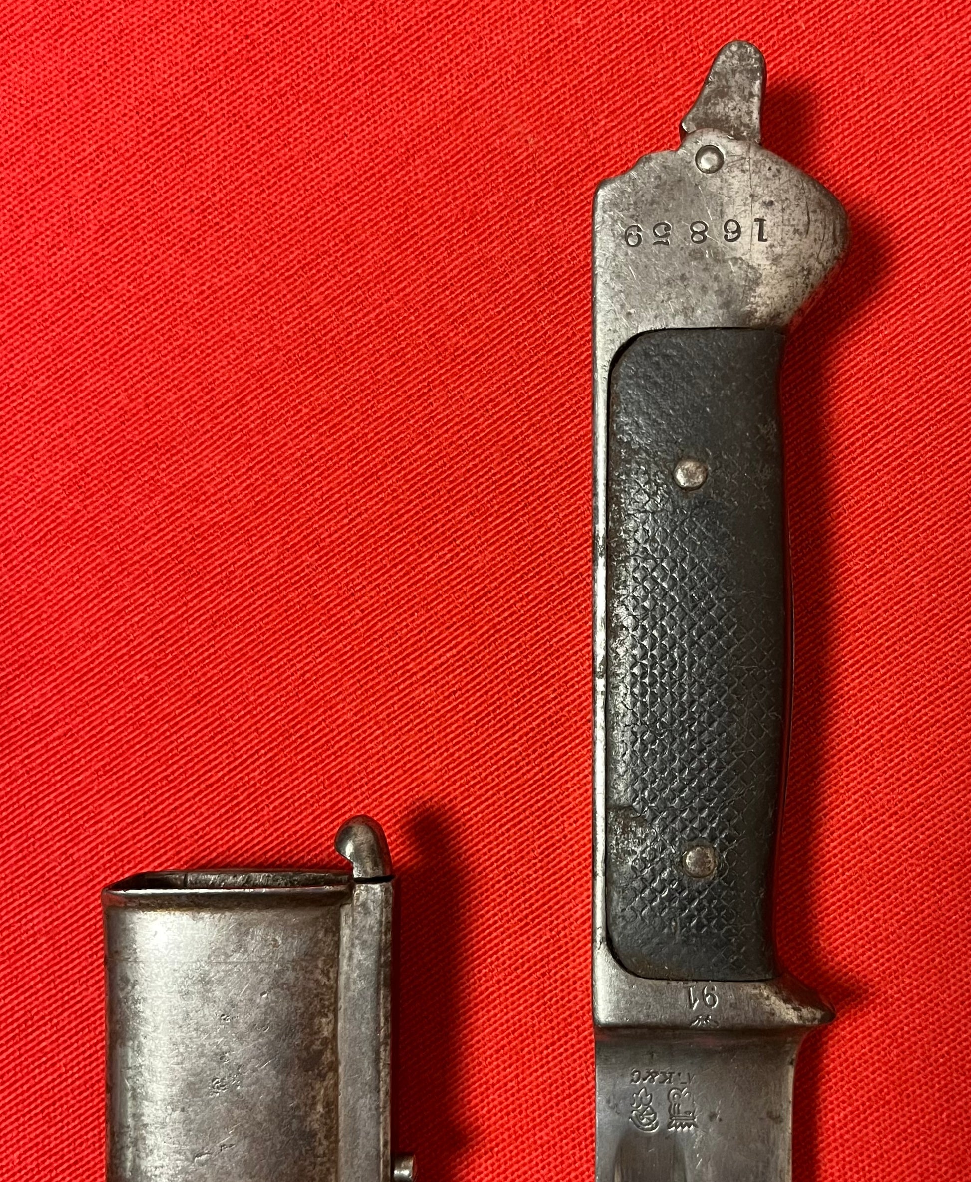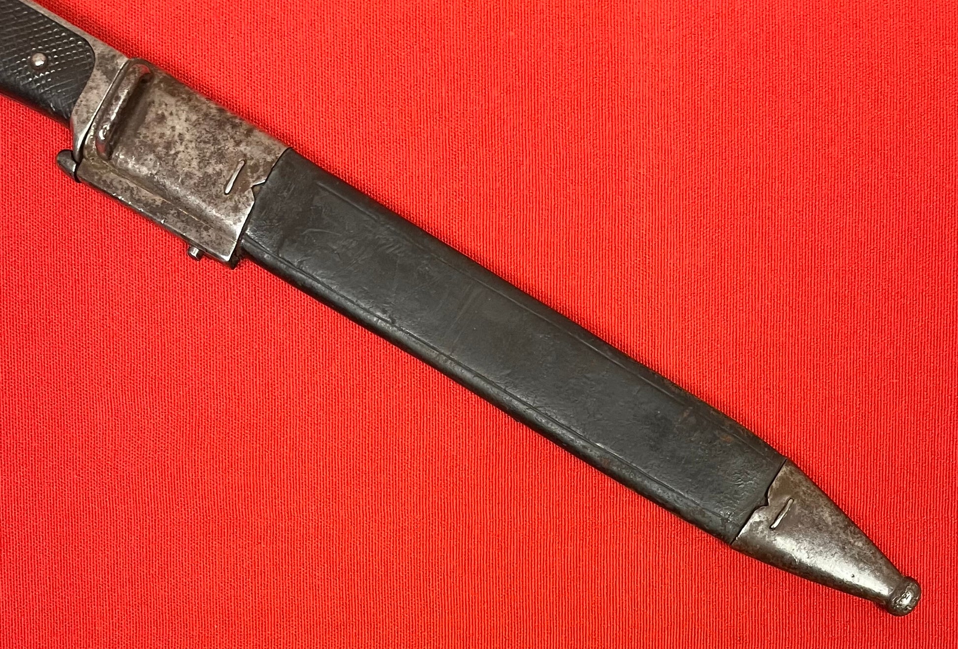 This is quite rare, and is a very nice example of a Danish Model 1889 Bayonet, intended for use on the Krag–Jørgensen Gevær M/1889 Rifle. This is the original Model 1889 bayonet version, with a checkered leather grip. This was later improved in 1893 with a new version having a wood grips secured by brass rivets. Many were retrofitted, so finding a bayonet with intact leather grips is quite rare.