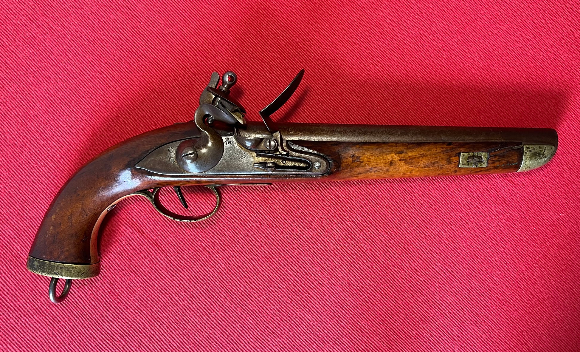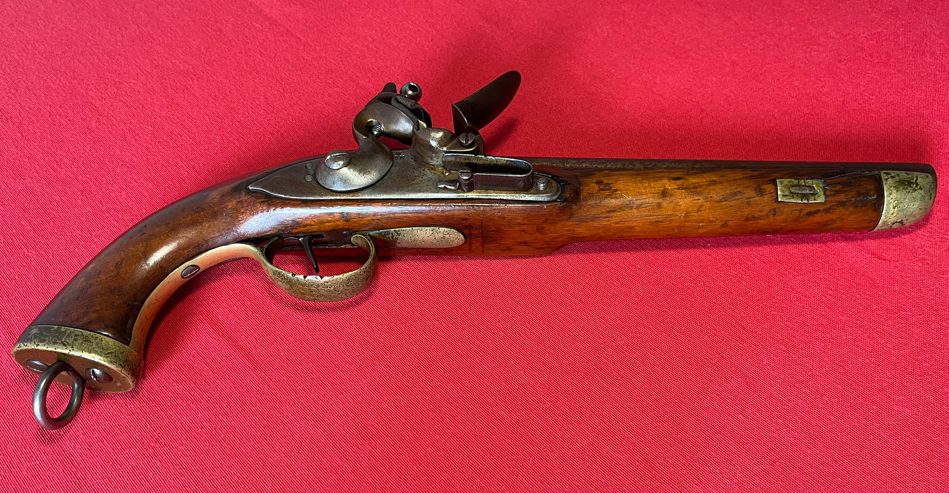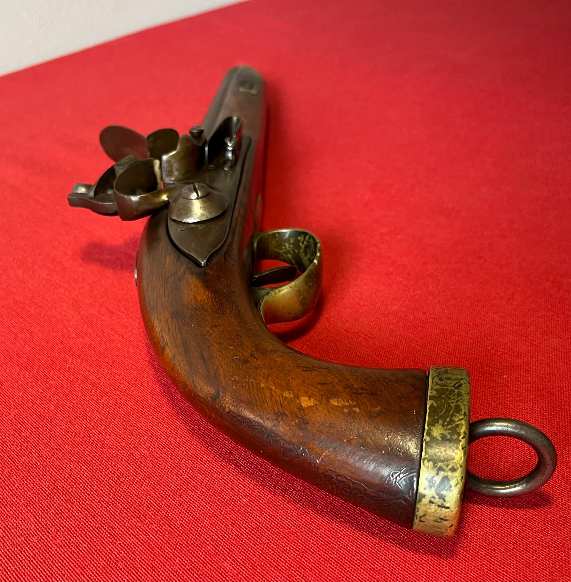 Here we present an antique Dutch Flintlock Pistol, made circa the 1830s in Liege. Today we know that Liege is a city in Belgium, perhaps most famous for its centuries of arms manufacture; but at this time, Belgium was not yet independent, and was a parcel of the United Kingdom of the Netherlands until recognized in 1839. Revolution and the push for independence began in earnest in 1830. This pistol features a large .70 caliber bore, typical of a military small arm of the period. The pommel is a flat one with a lanyard ring. There is a crowned “DN” for Delft Nederlandse on the lock. No provision for a ramrod was made as the user carried one secured to his belt. This would have been one of the last large, smooth bore flintlock pistols to be made for official service before pistols in the percussion firing system were introduced and adopted. The overall condition is good. General wear with age. Pictures provided for overall condition and quality. The bore is smooth. The action remains strong and functional. Own the original! This is a legitimate antique and not a reproduction. Barrel is 9 inches. Caliber: .70
