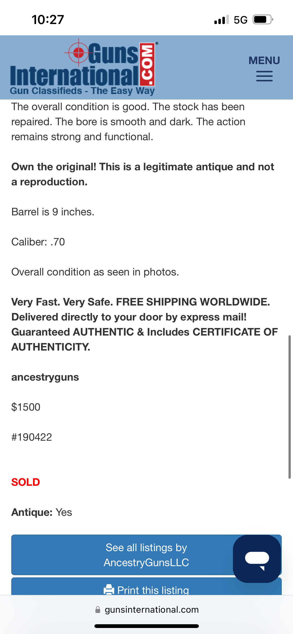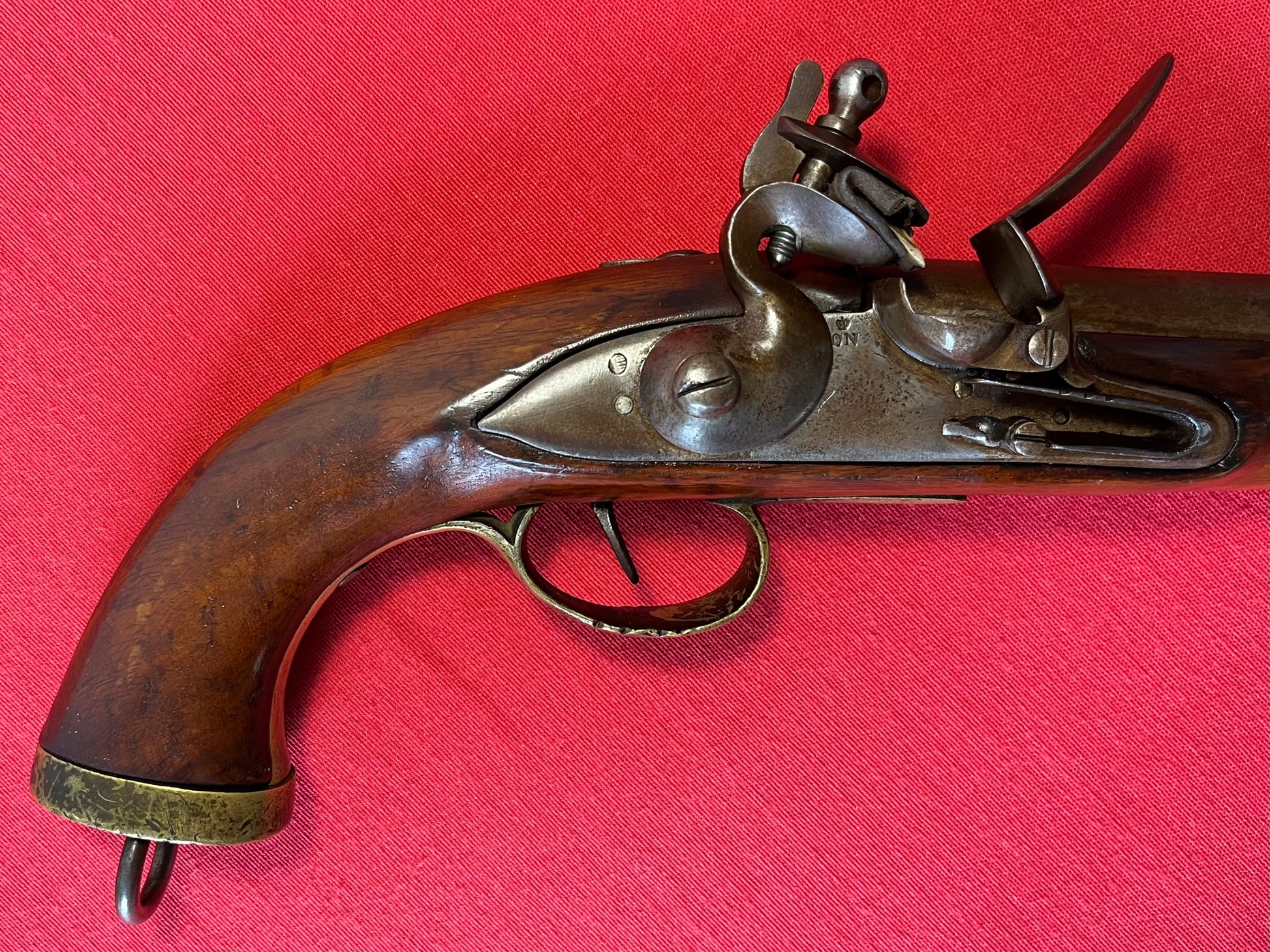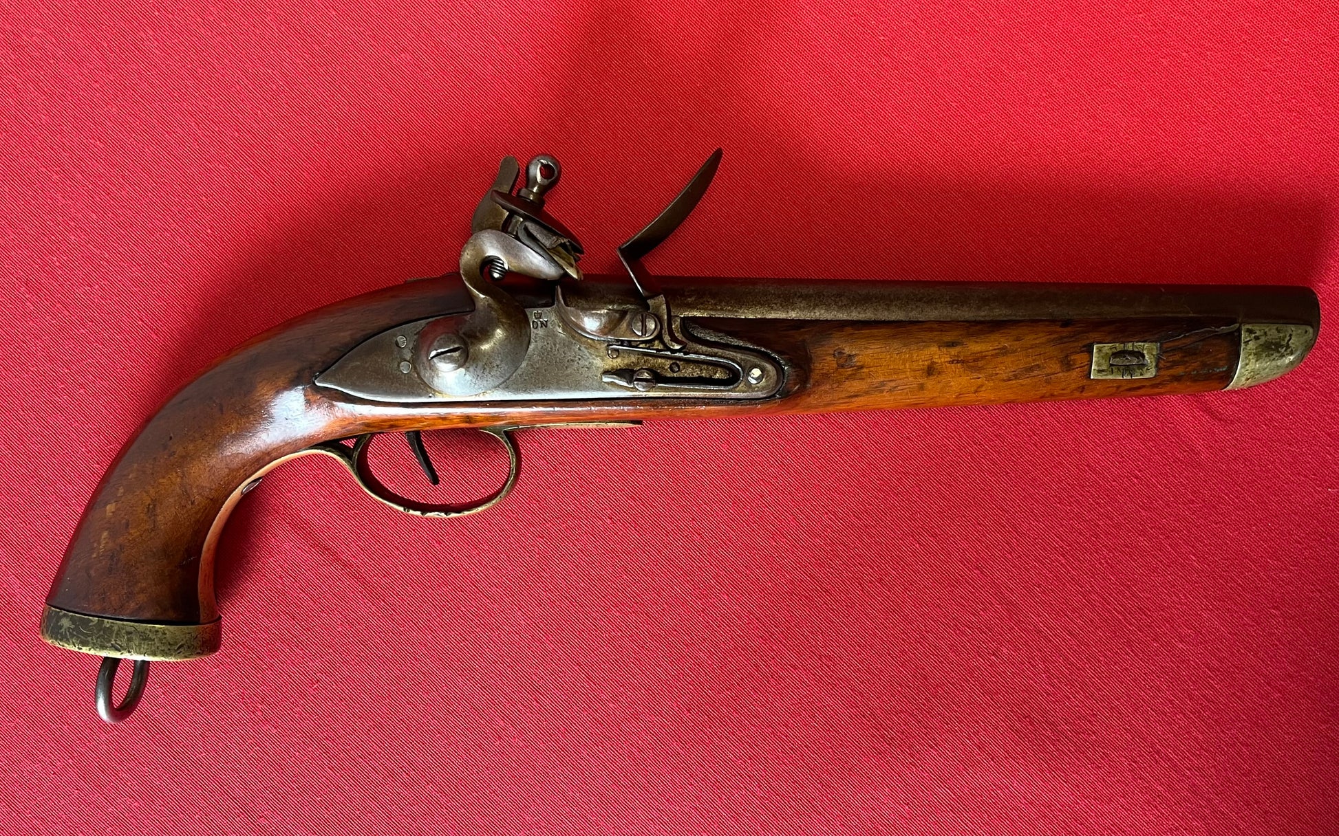 Here we present an antique Dutch Flintlock Pistol, made circa the 1830s in Liege. Today we know that Liege is a city in Belgium, perhaps most famous for its centuries of arms manufacture; but at this time, Belgium was not yet independent, and was a parcel of the United Kingdom of the Netherlands until recognized in 1839. Revolution and the push for independence began in earnest in 1830. This pistol features a large .70 caliber bore, typical of a military small arm of the period. The pommel is a flat one with a lanyard ring. There is a crowned “DN” for Delft Nederlandse on the lock. No provision for a ramrod was made as the user carried one secured to his belt. This would have been one of the last large, smooth bore flintlock pistols to be made for official service before pistols in the percussion firing system were introduced and adopted. The overall condition is good. General wear with age. Pictures provided for overall condition and quality. The bore is smooth. The action remains strong and functional. Own the original! This is a legitimate antique and not a reproduction. Barrel is 9 inches. Caliber: .70