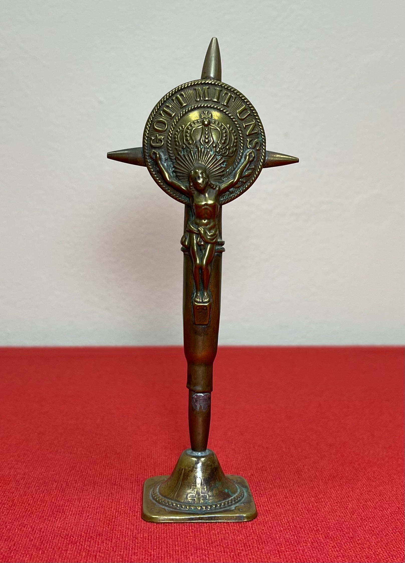 Soldered at the point where all the cartridges meet is a medallion removed from a German enlisted man’s belt buckle displaying a crown at center surrounded by the motto “GOTT MIT UNS”. The figure of the crucified Christ is placed on the cross so the crown on the German medallion and its motto are just above His head.