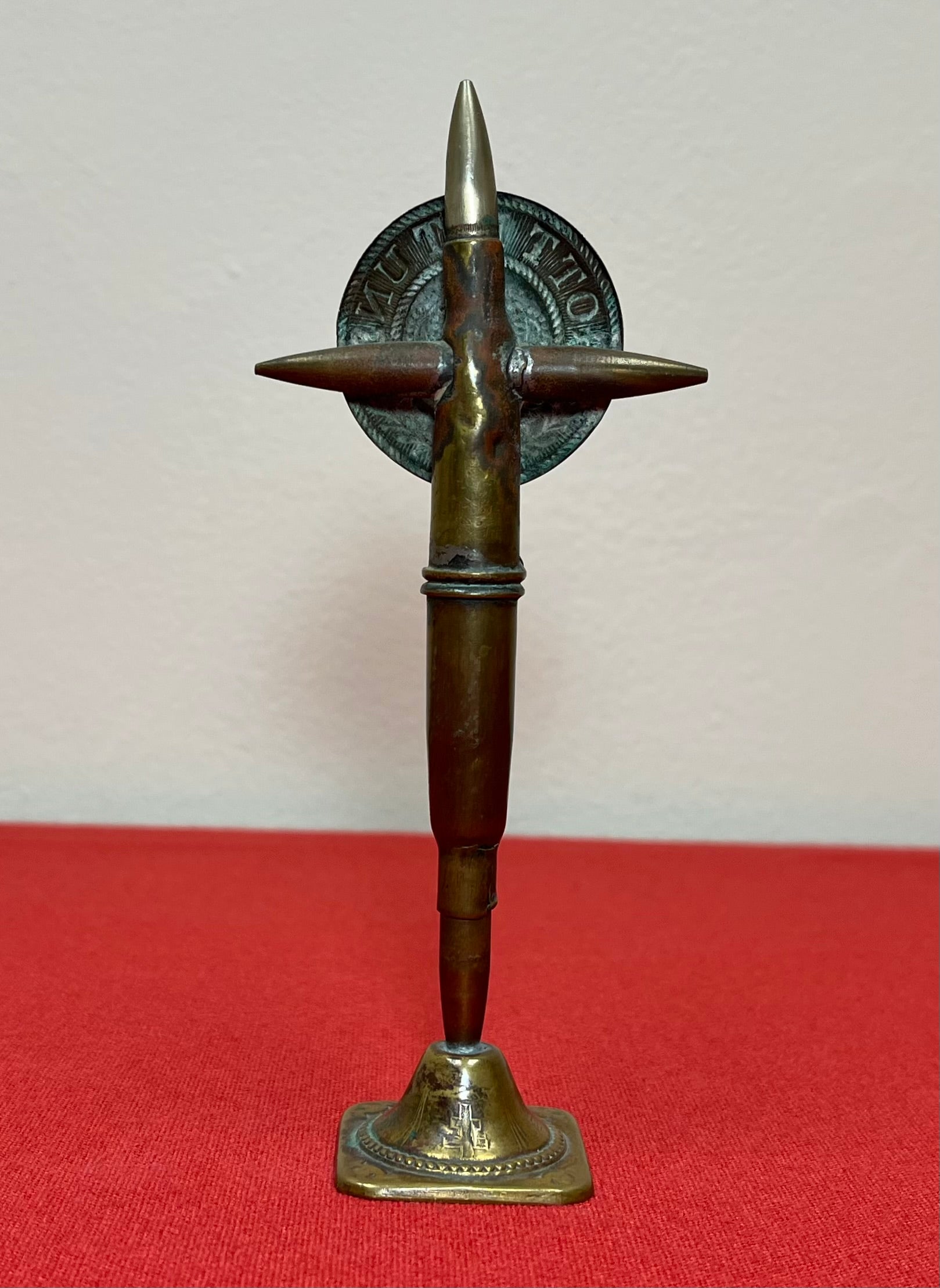 The cross stands approx. 7.00 inches high with a crossbeam approx. 3.00 inches wide. The main spar of the cross is made of two .30 caliber cartridges end to end. The nose of the bullet on the lower cartridge is soldered to a very nicely formed brass stand. The bullet on the upper cartridge forms the top of the cross.