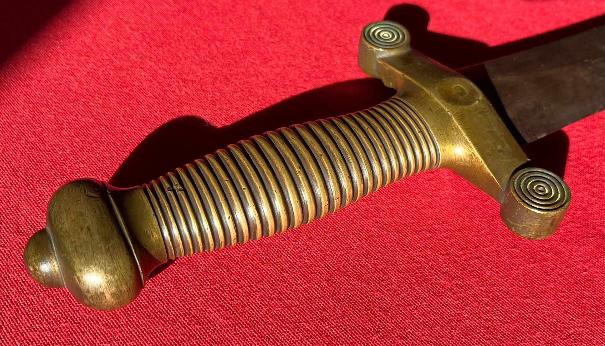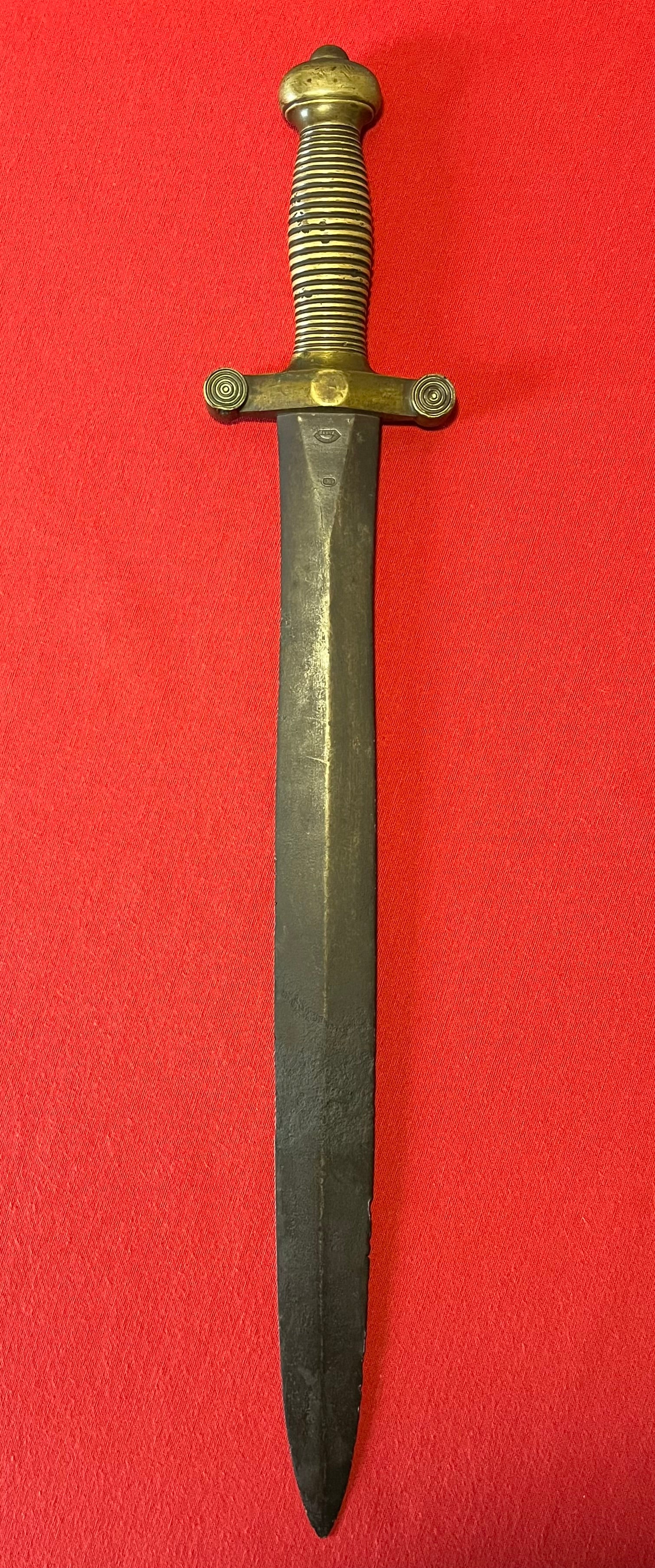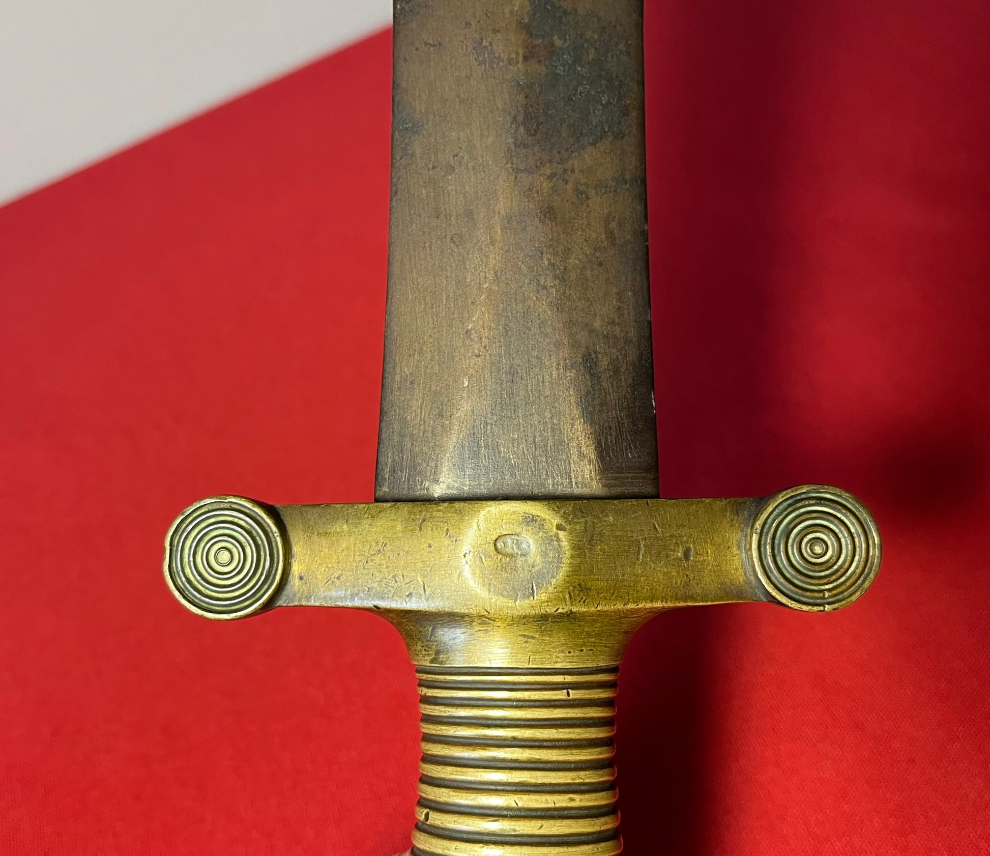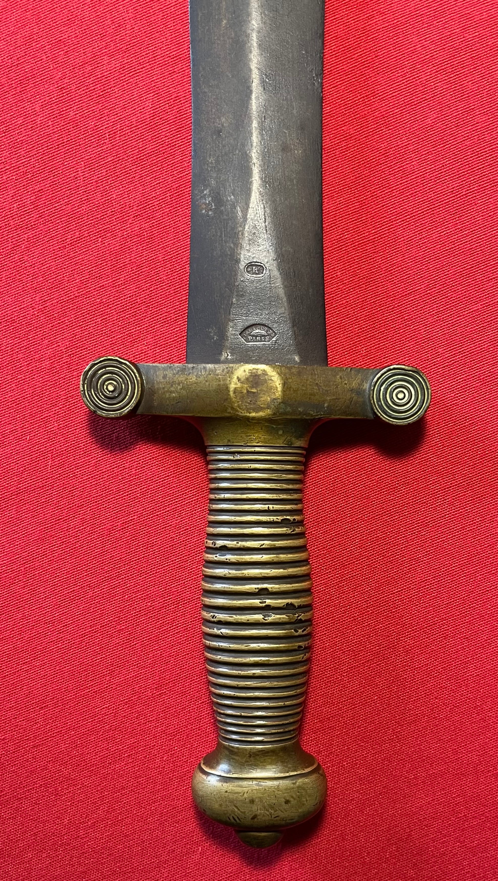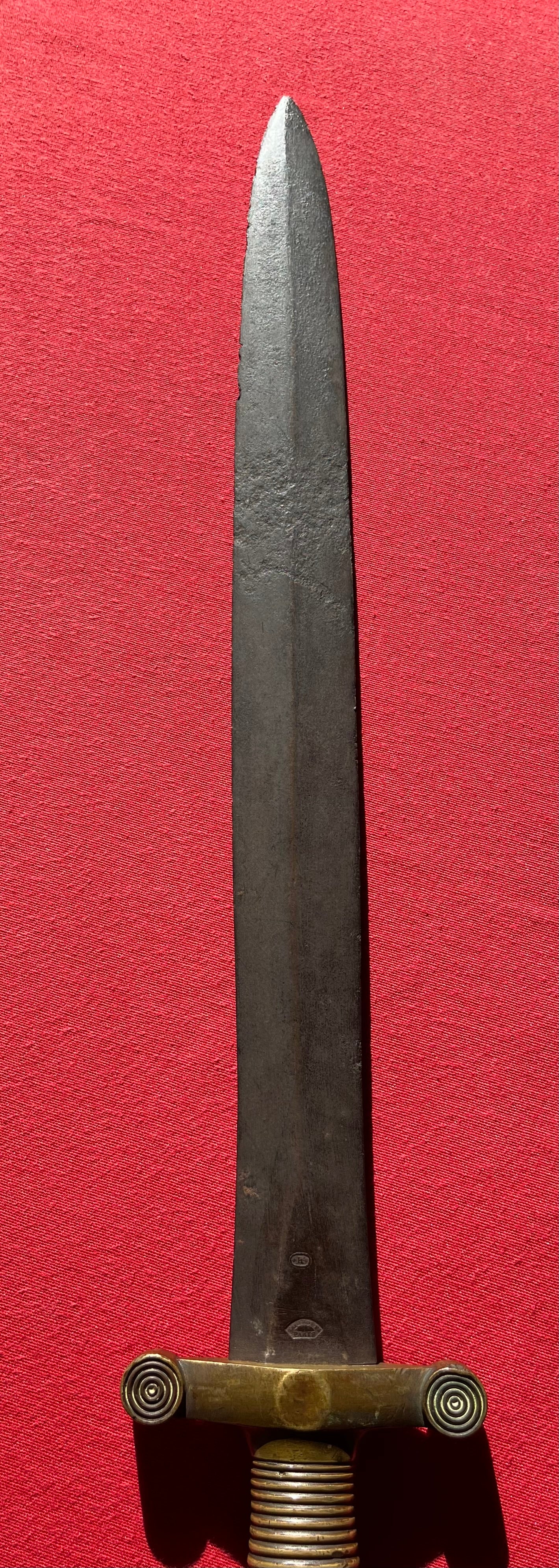 It features a 19 inch long gladius style blade and an overall length of 25". The brass handle has stamps (Shown in pictures) The letter "R" is marked on the cross guard and blade as well as other foundry or approval stamps / The blade has an awesome dark patina and double-edged cutting surface / Maker marked Talabot Paris / 27 rings on handle / These short swords were used by artillerymen in the U.S. Civil War by both U.S. & C.S.A forces / The blade's cutting edge has seen active engagement with signs of pitting and protective "golden" toning indicating possible GAR hall display / Truly one of a kind