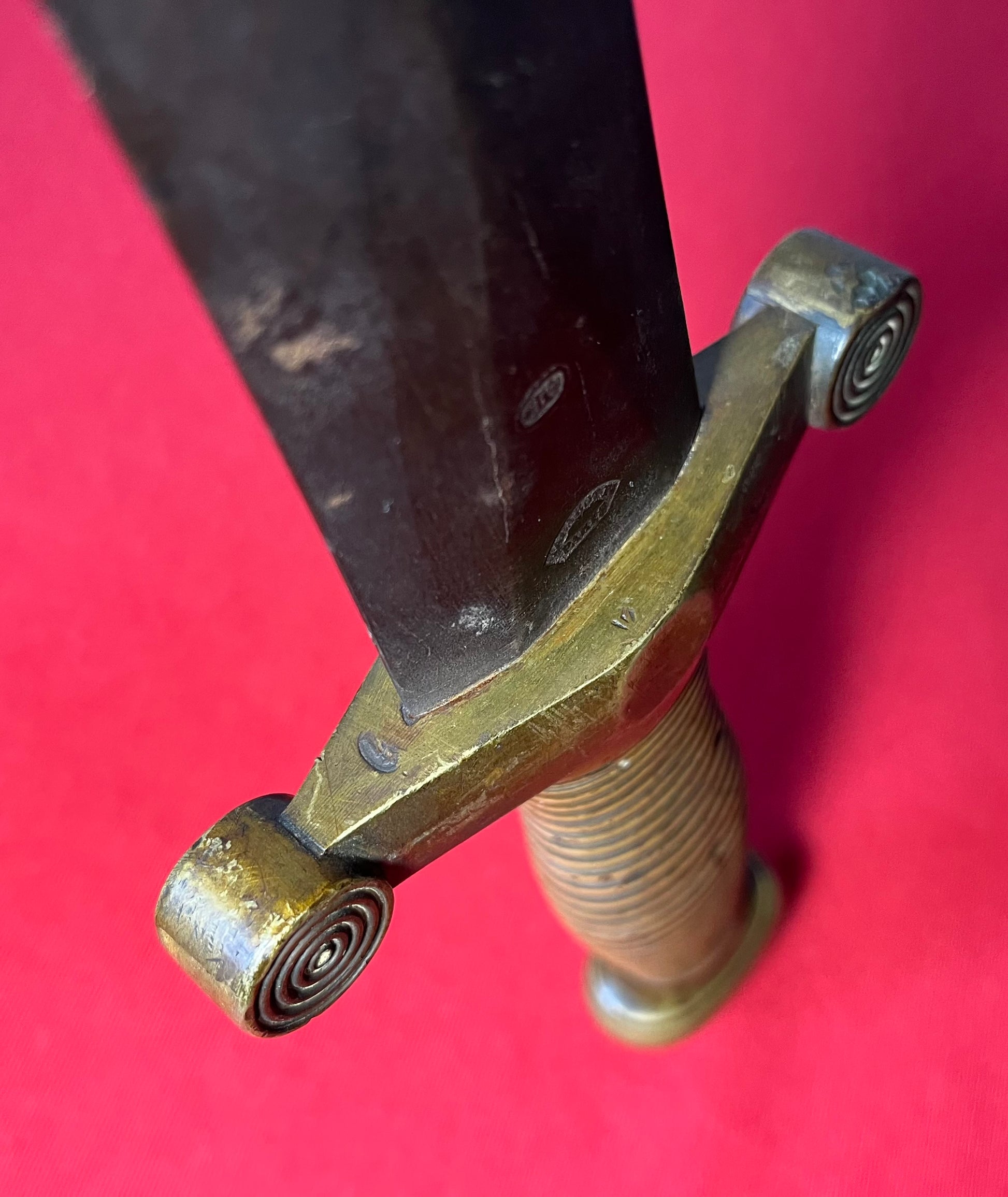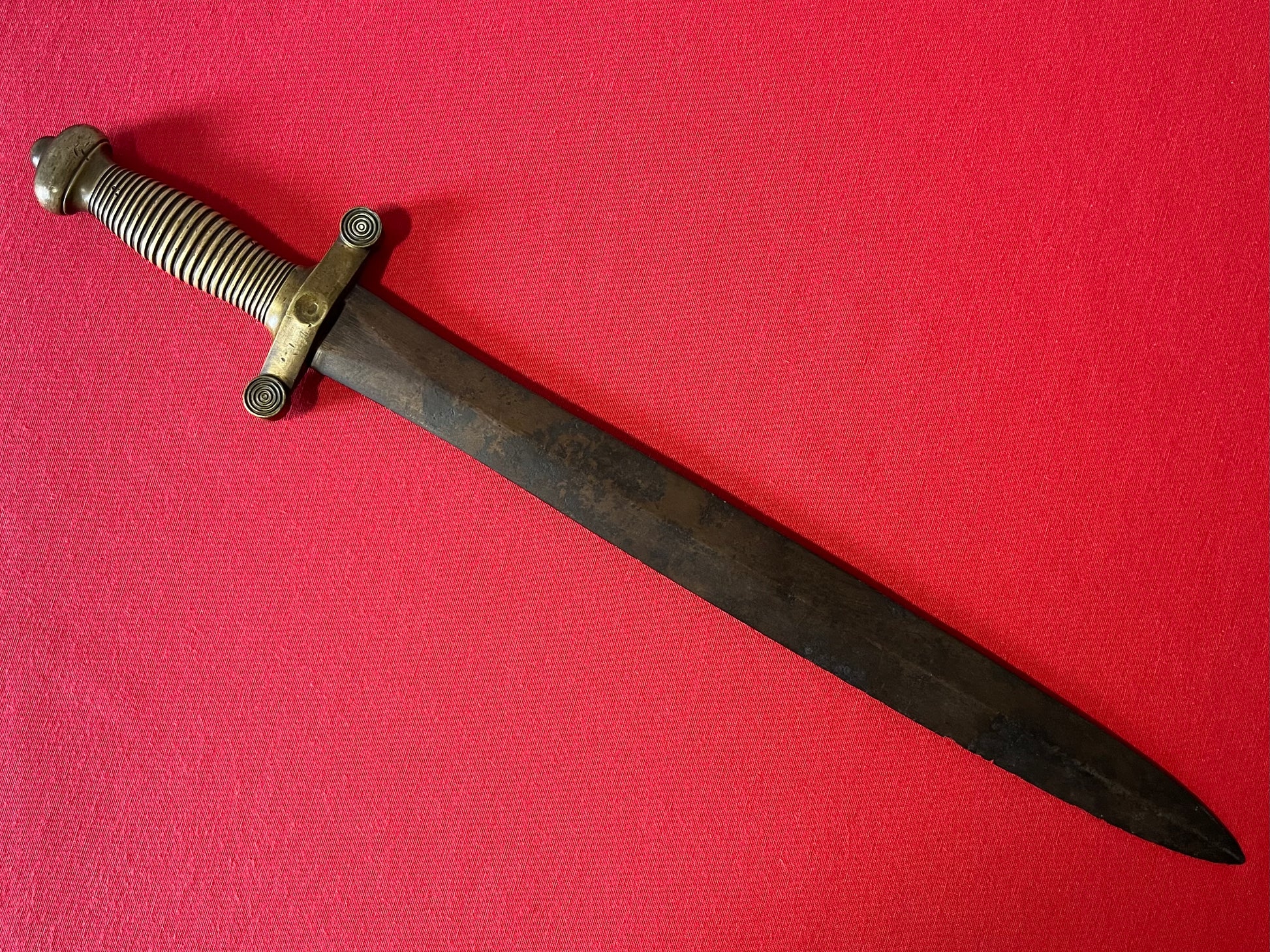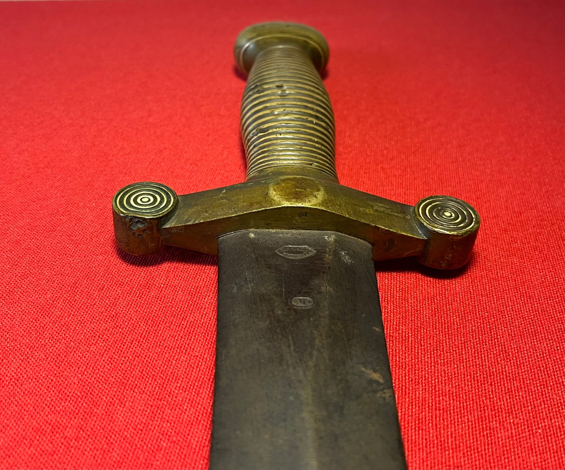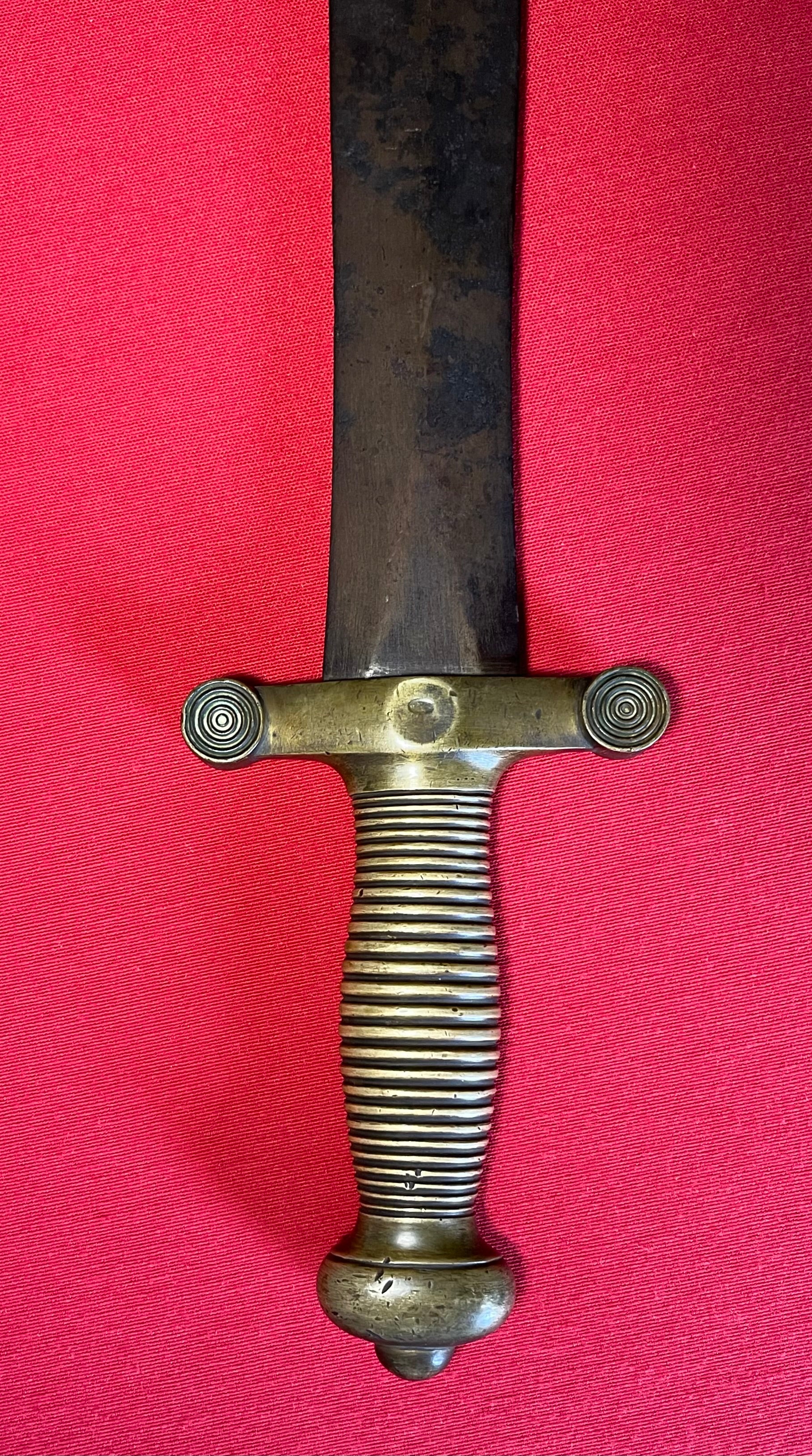 It features a 19 inch long gladius style blade and an overall length of 25". The brass handle has stamps (Shown in pictures) The letter "R" is marked on the cross guard and blade as well as other foundry or approval stamps / The blade has an awesome dark patina and double-edged cutting surface / Maker marked Talabot Paris / 27 rings on handle / These short swords were used by artillerymen in the U.S. Civil War by both U.S. & C.S.A forces / The blade's cutting edge has seen active engagement with signs of pitting and protective "golden" toning indicating possible GAR hall display / Truly one of a kind