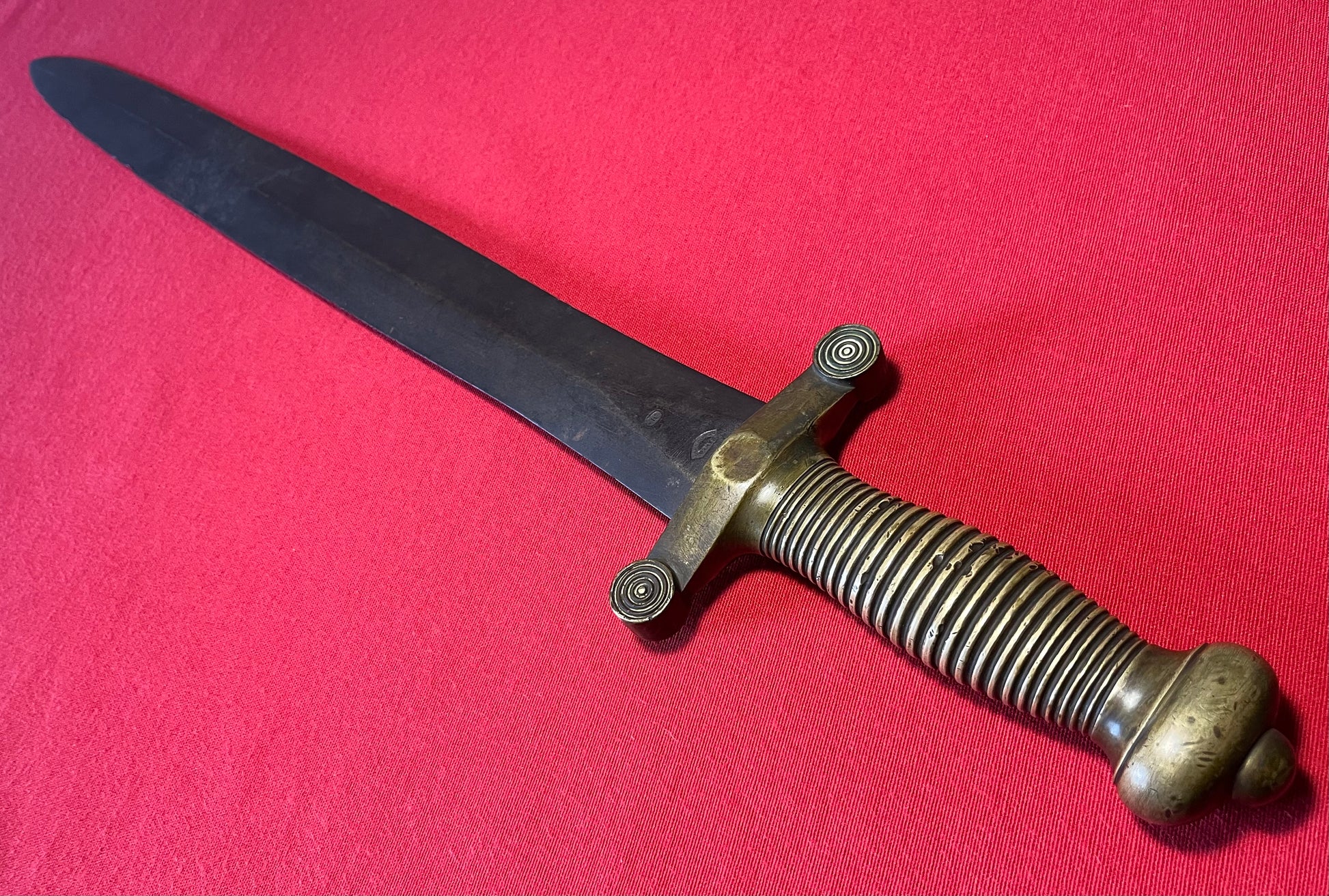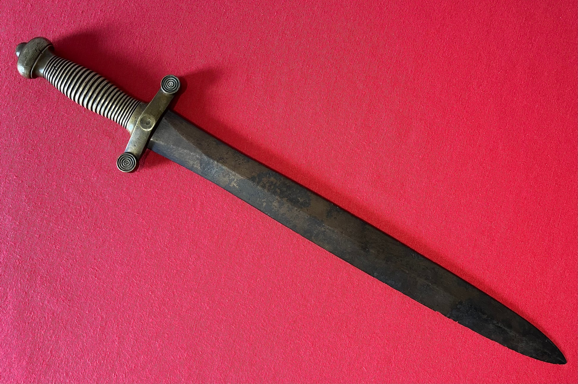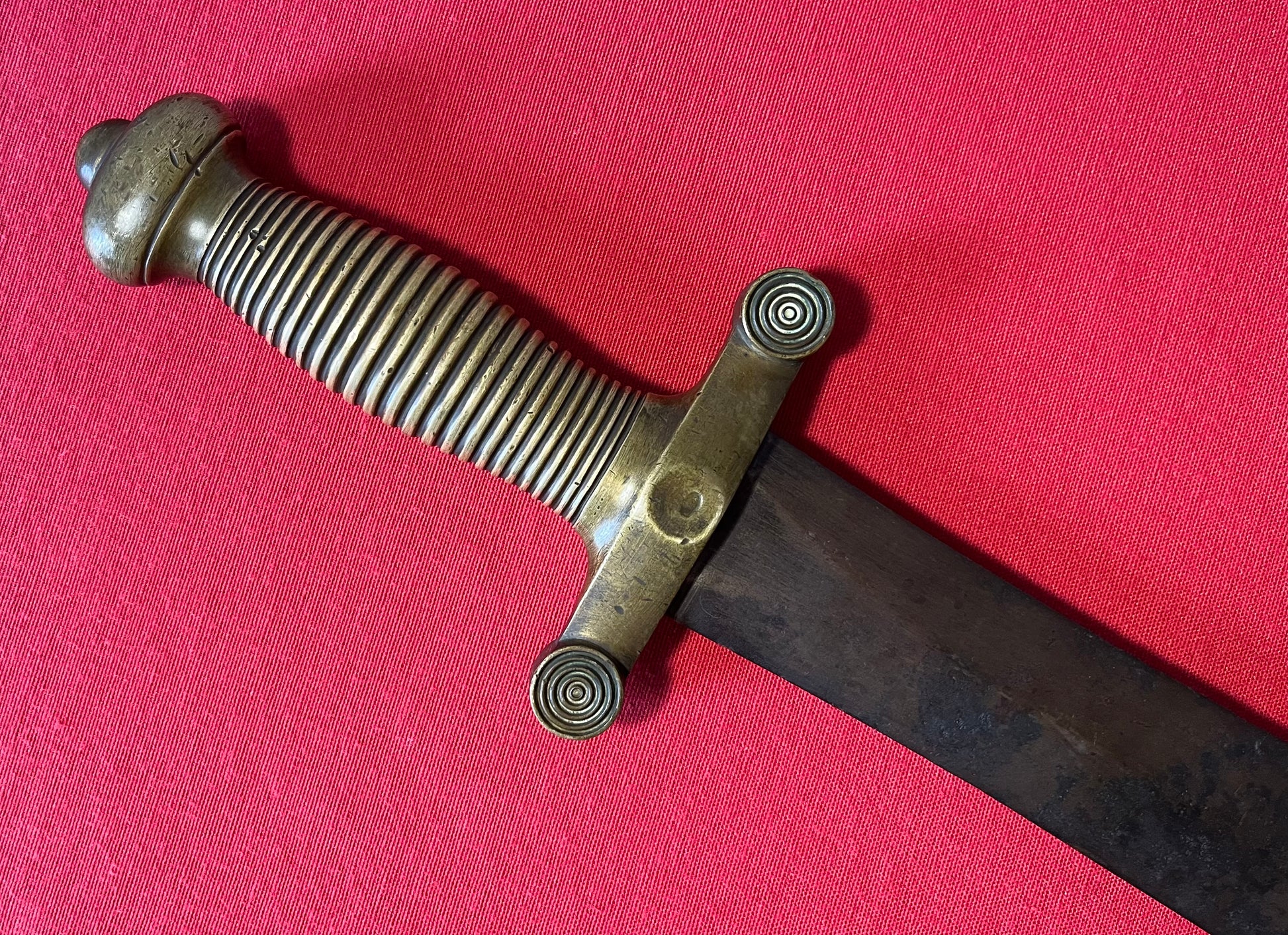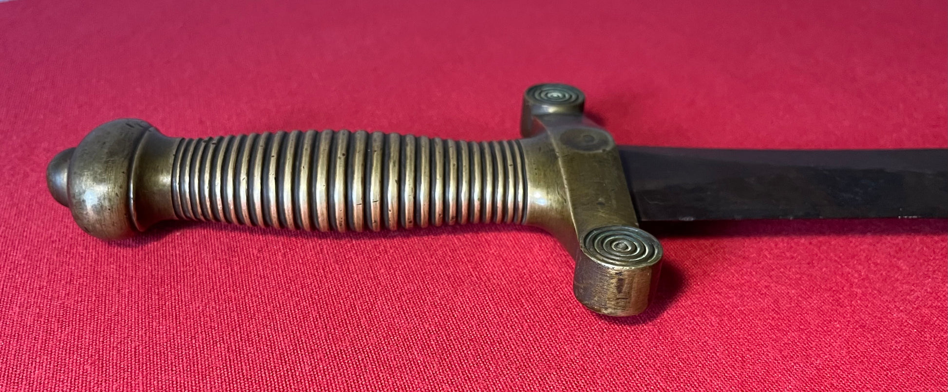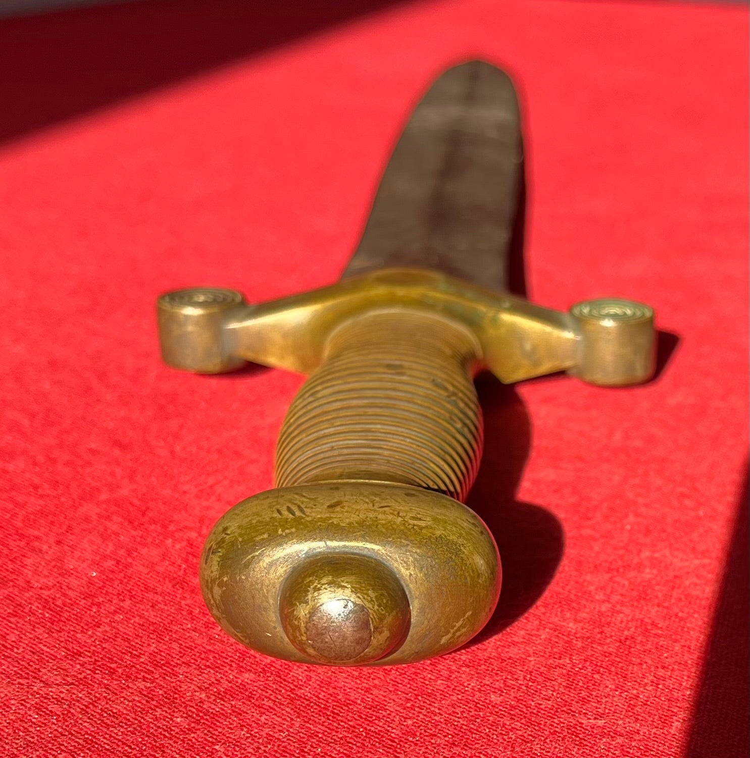 It features a 19 inch long gladius style blade and an overall length of 25". The brass handle has stamps (Shown in pictures) The letter "R" is marked on the cross guard and blade as well as other foundry or approval stamps / The blade has an awesome dark patina and double-edged cutting surface / Maker marked Talabot Paris / 27 rings on handle / These short swords were used by artillerymen in the U.S. Civil War by both U.S. & C.S.A forces / The blade's cutting edge has seen active engagement with signs of pitting and protective "golden" toning indicating possible GAR hall display / Truly one of a kind