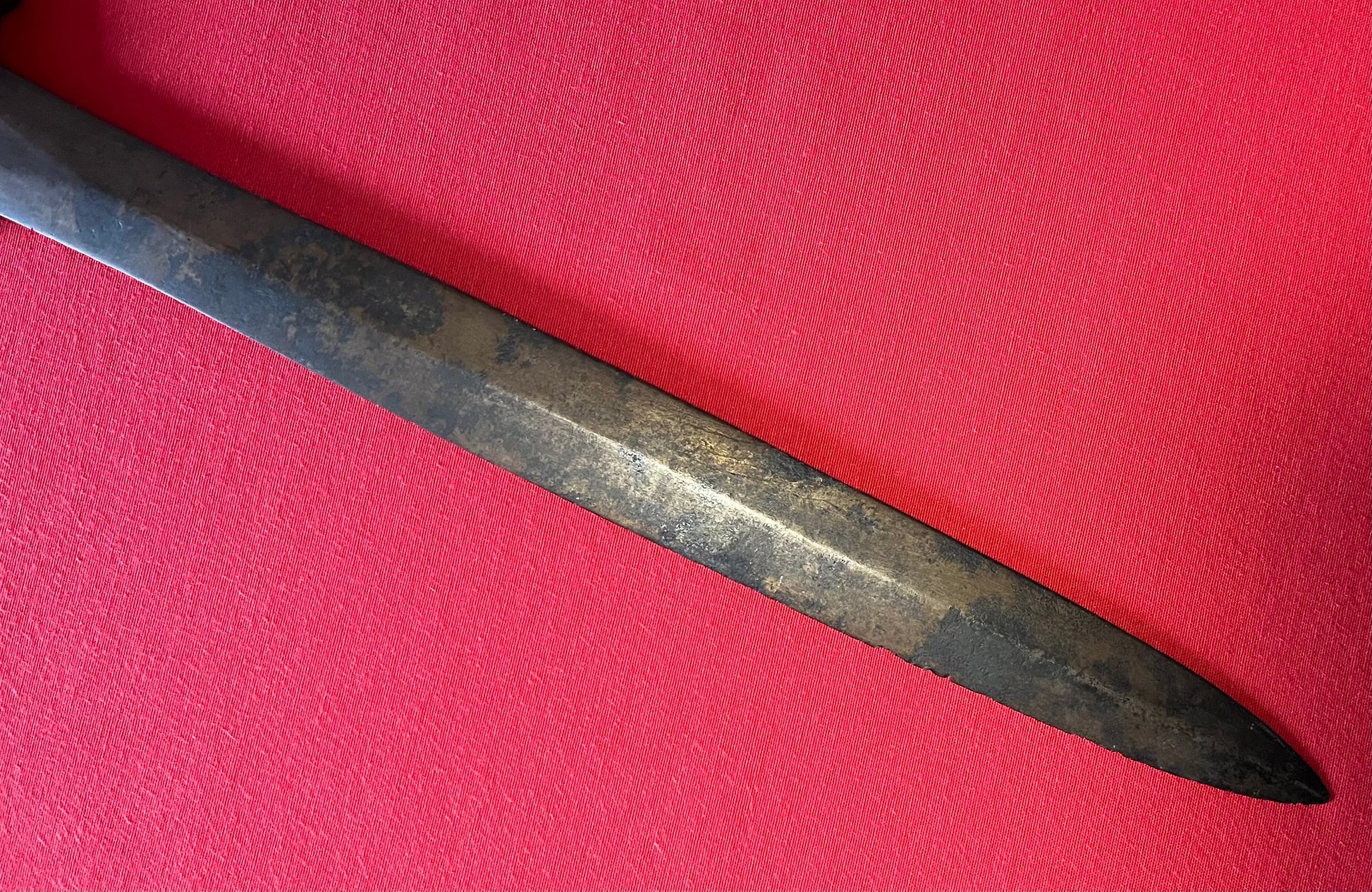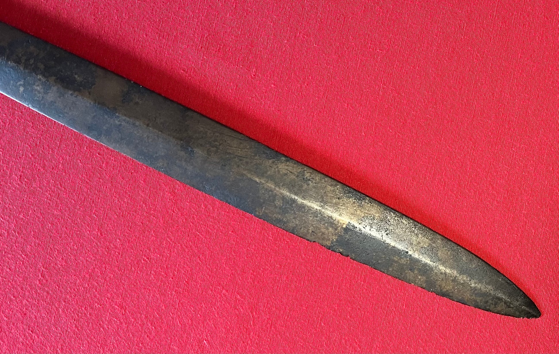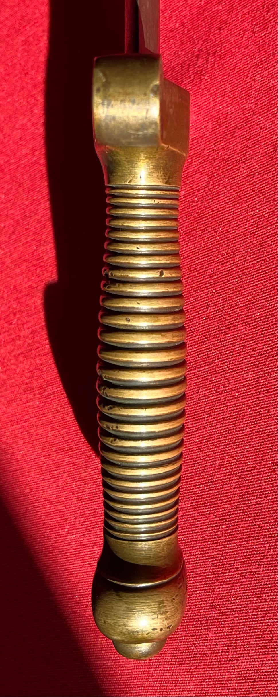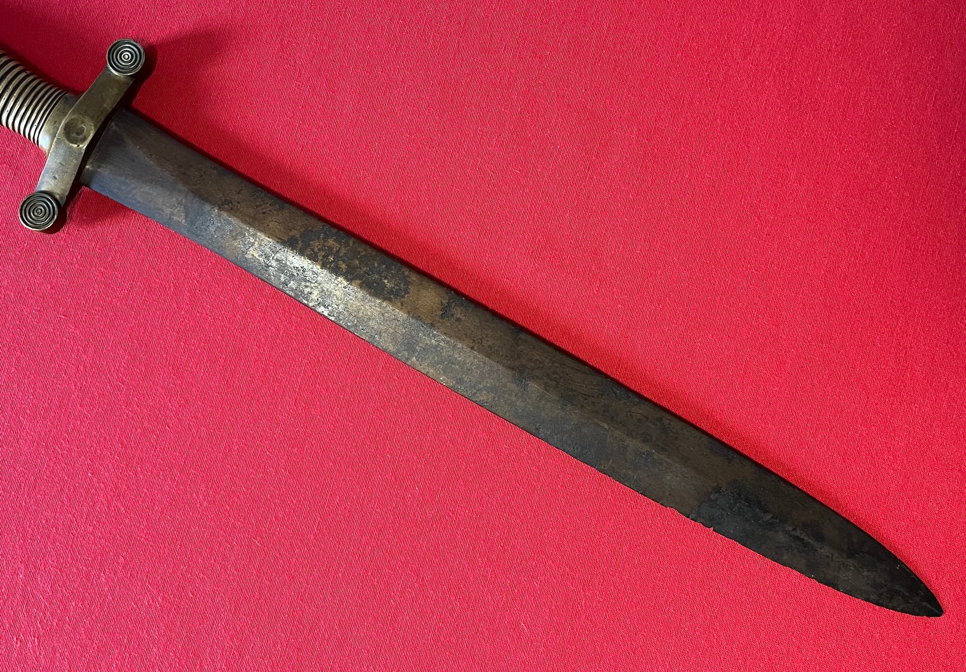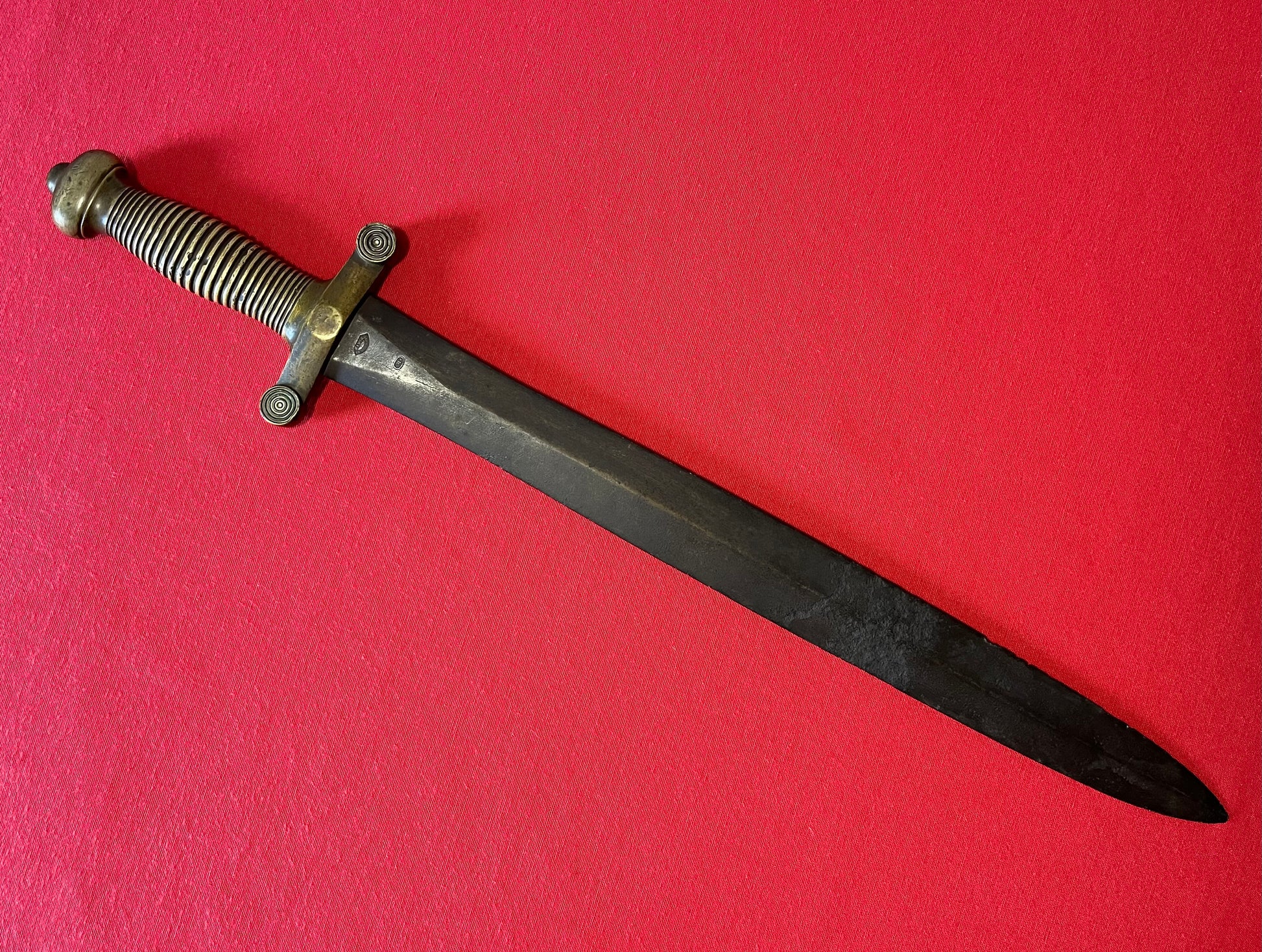 It features a 19 inch long gladius style blade and an overall length of 25". The brass handle has stamps (Shown in pictures) The letter "R" is marked on the cross guard and blade as well as other foundry or approval stamps / The blade has an awesome dark patina and double-edged cutting surface / Maker marked Talabot Paris / 27 rings on handle / These short swords were used by artillerymen in the U.S. Civil War by both U.S. & C.S.A forces / The blade's cutting edge has seen active engagement with signs of pitting and protective "golden" toning indicating possible GAR hall display / Truly one of a kind