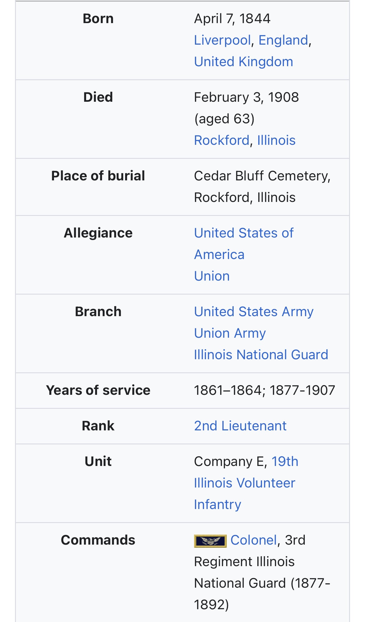 Known for being the “ First man of the 19th Illinois infantry over the Confederate works at the Battle of Missionary Ridge while carrying the regiment's colors.”