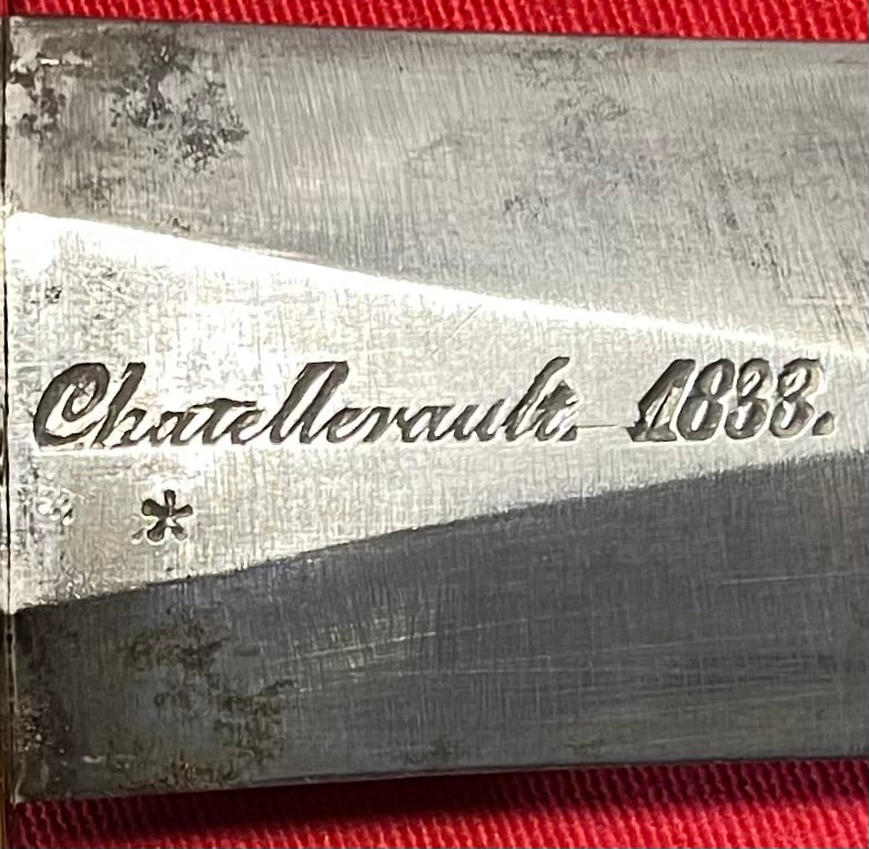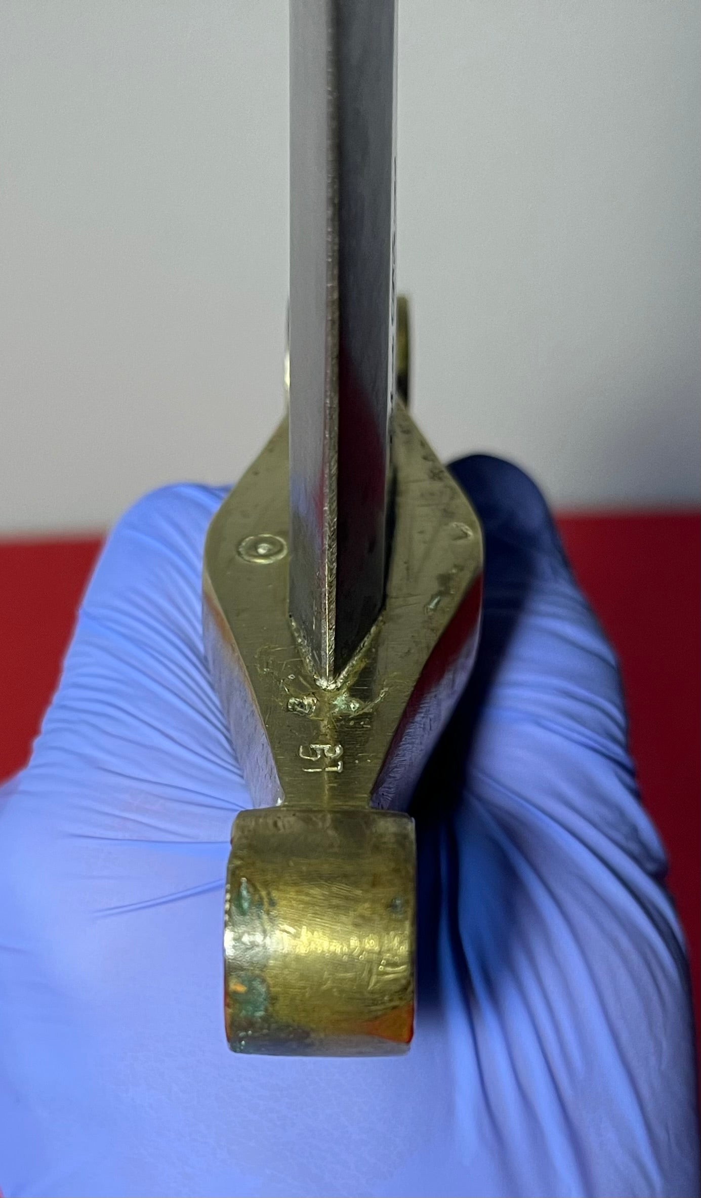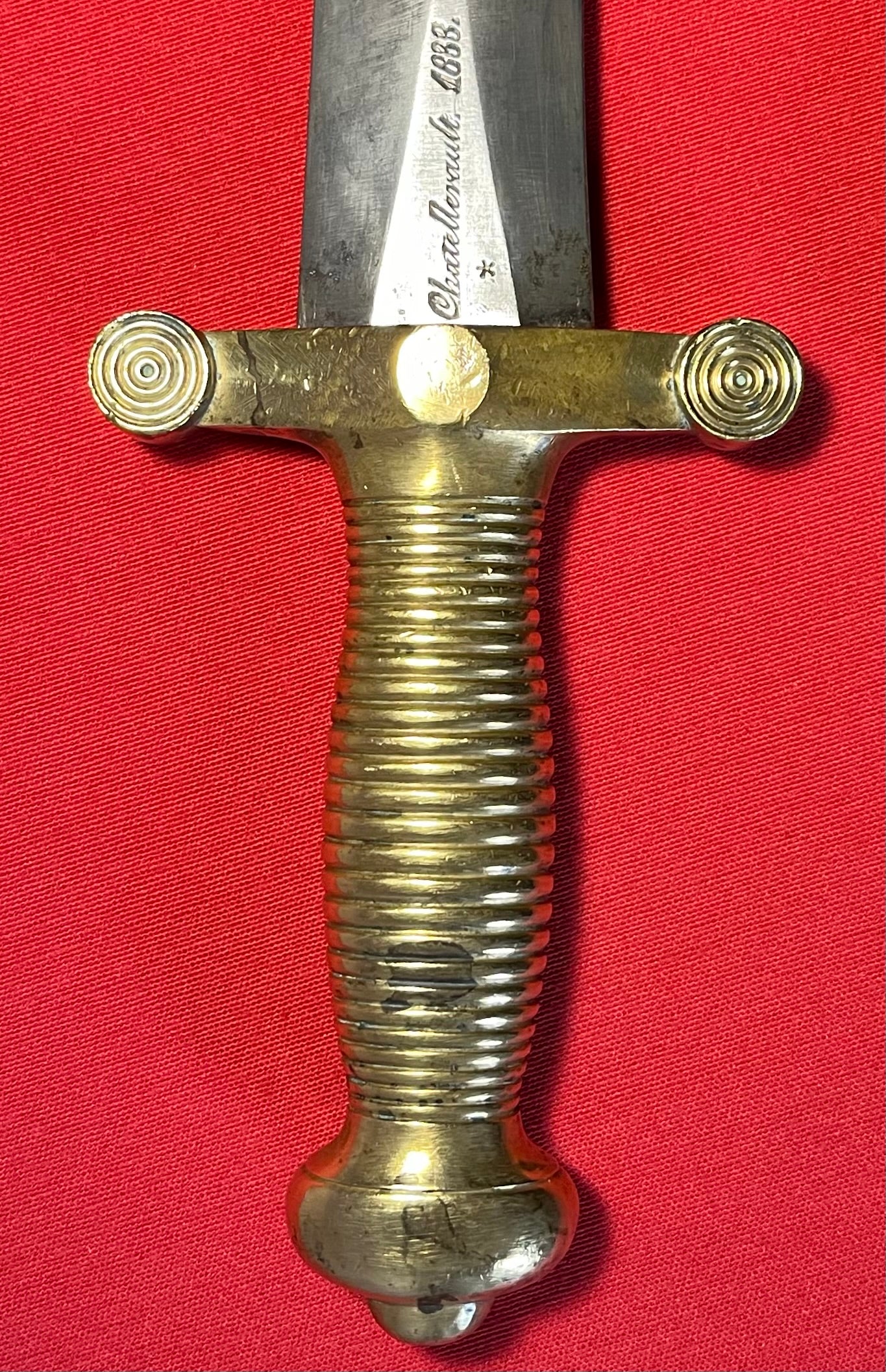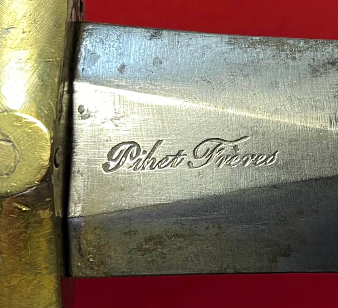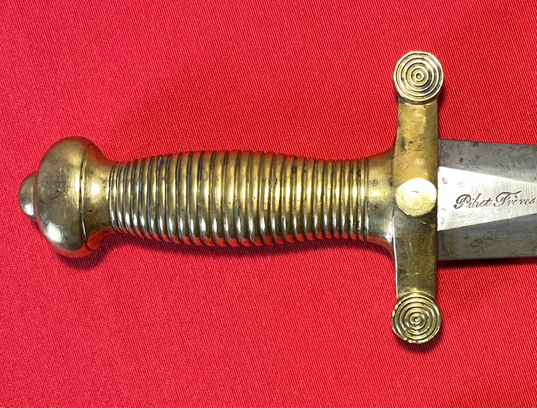 It features a 19.25 inch long gladius style blade with an overall length of 25.25 inches and a width of 1.75 inches. The brass handle has markings “Shown in pictures" on the cross guard (approval stamps most likely) The blade has an amazing patina with some darker tones scattered about and a double-edged cutting surface / French arsenal markings Chatellerault 1933 & Pihet Freves are located on the blade / This is a hard to find government arsenal made piece, opposed to being made by an independent contractor / 27 rings on the handle with signs of previous cleaning / These short swords where used by artillerymen in the U.S. Civil War by both U.S. & C.S.A forces / Pictures provided for overall condition and quality / Please inquire with any questions / Thanks for looking