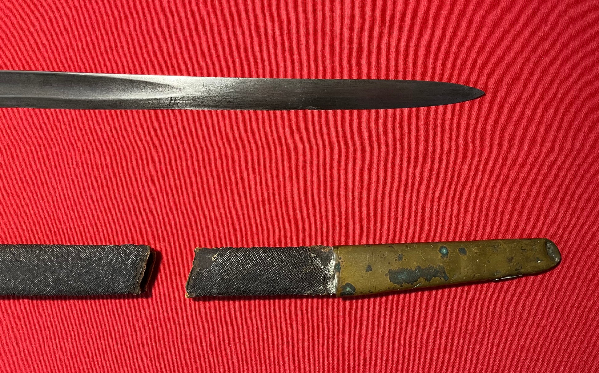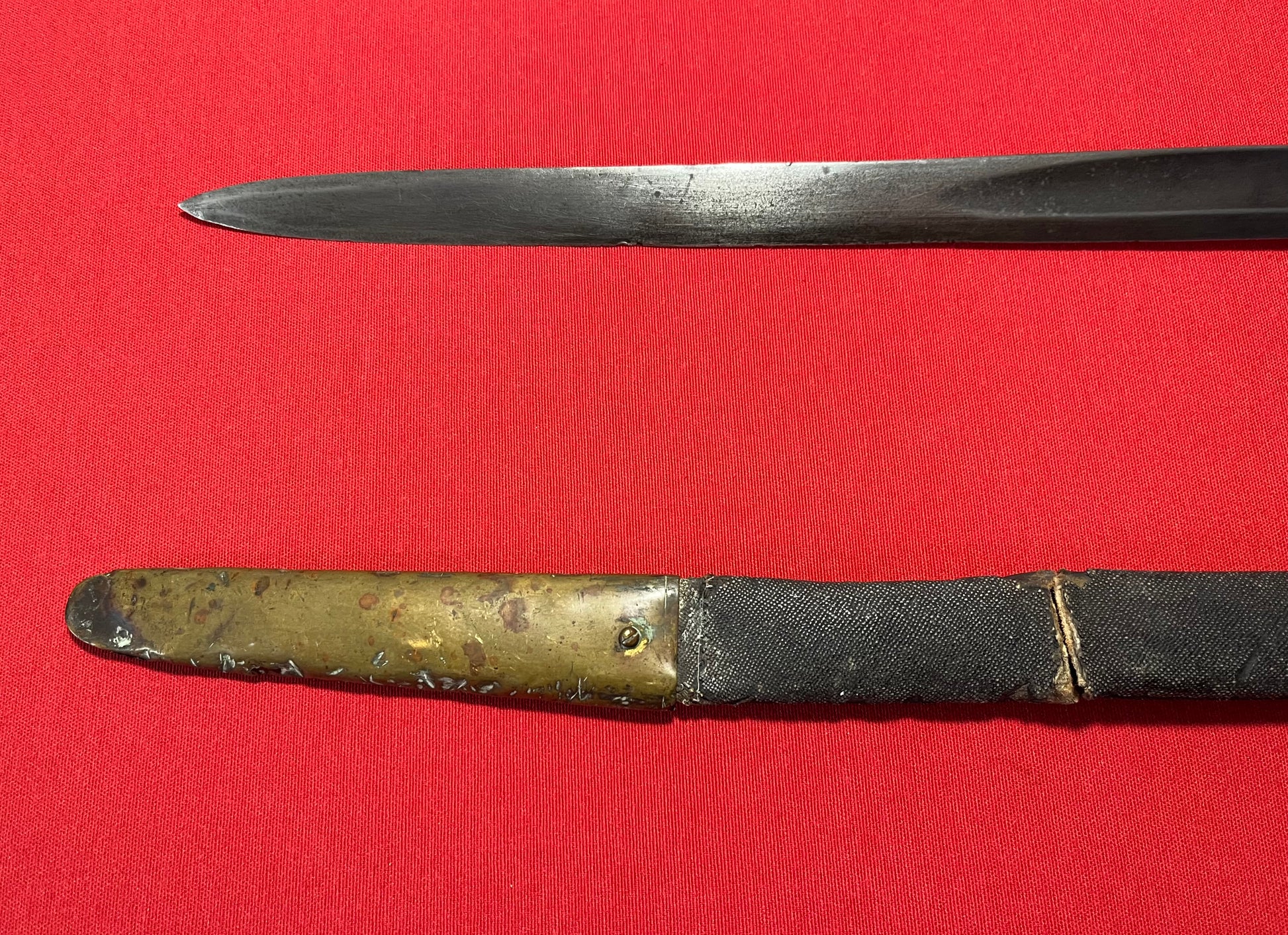 Scarce "sharkskin" scabbard / Civil War foot officer's sword / No maker mark (except for some hard to identify marks on the blades spin) German Import (Typically seen on swords with sharkskin scabbards) Blade is nice and clean / Overall length is 35.50 Inches / Blade is 30 inches / Leather handle is missing wire wrap / Scabbard has brass fittings (end has broken off during active engagement) could be repaired / Please inquire with any questions