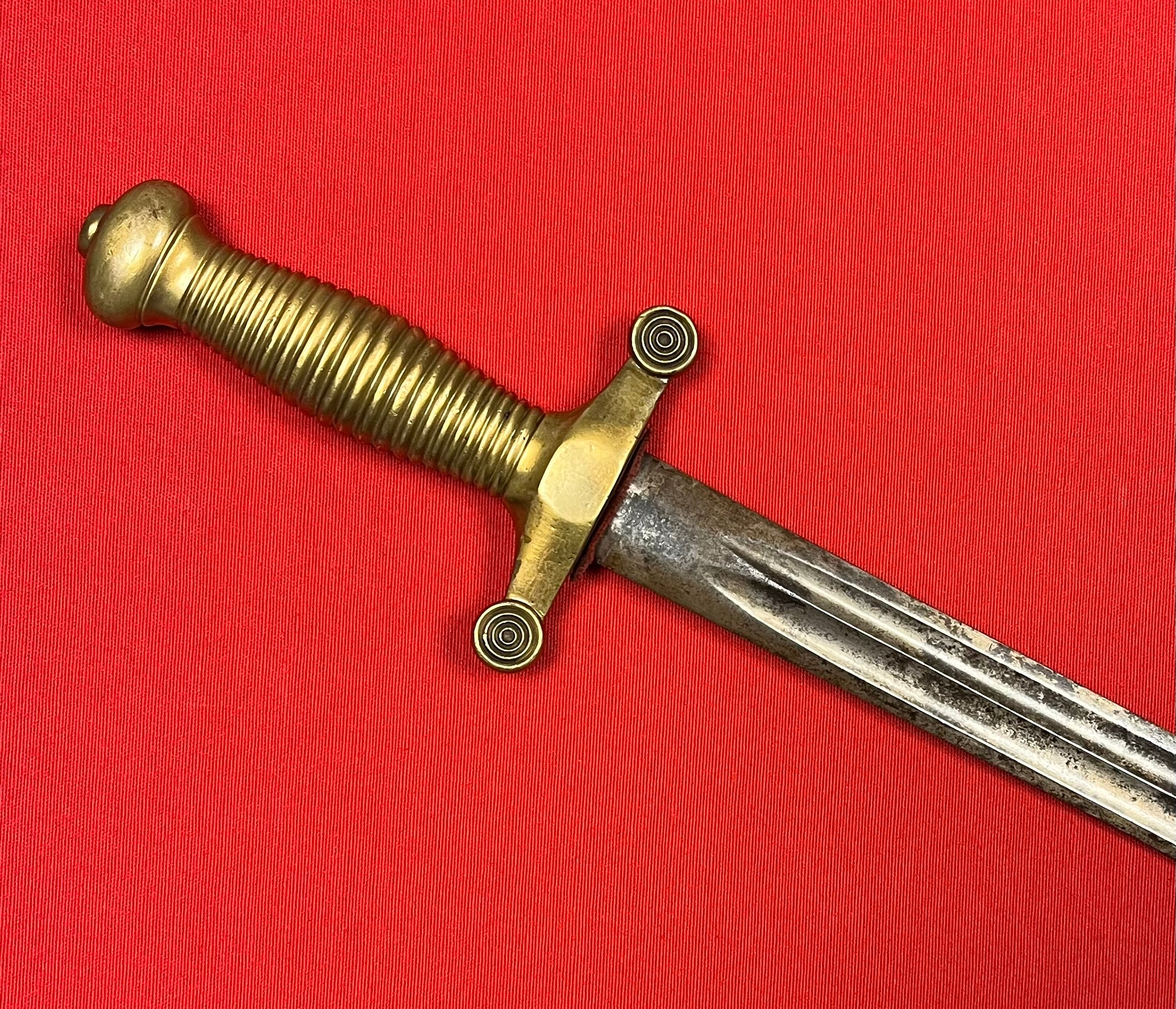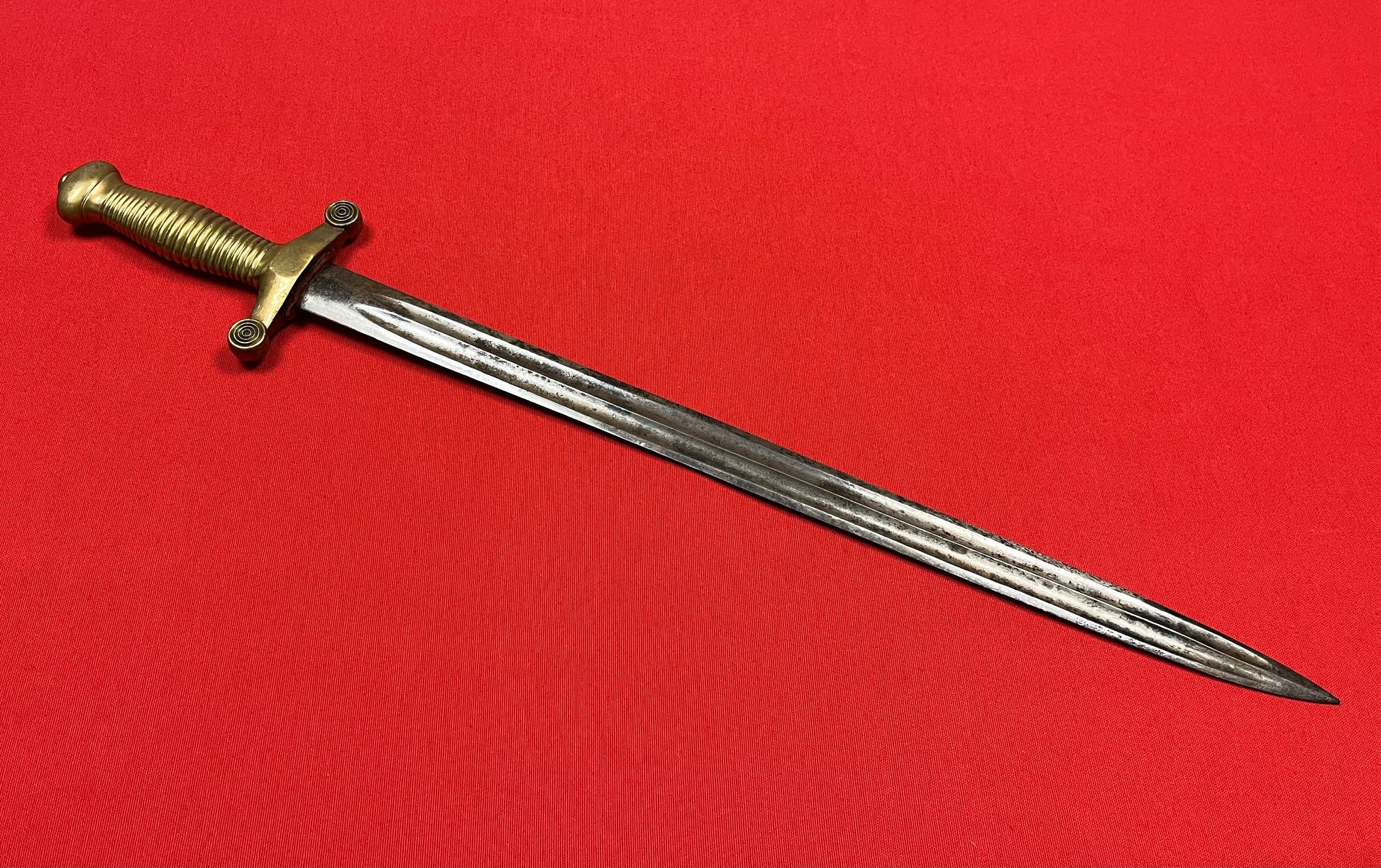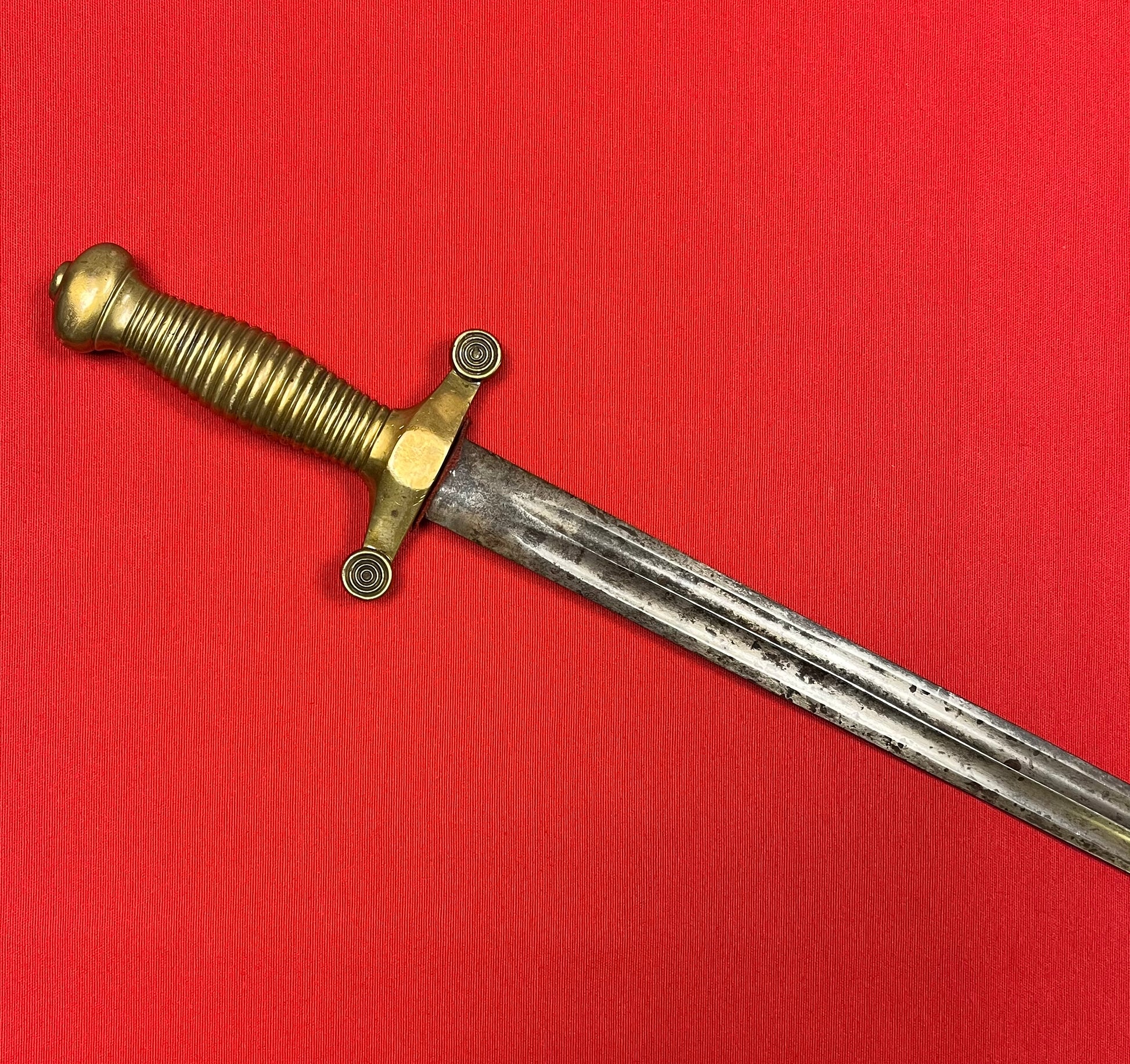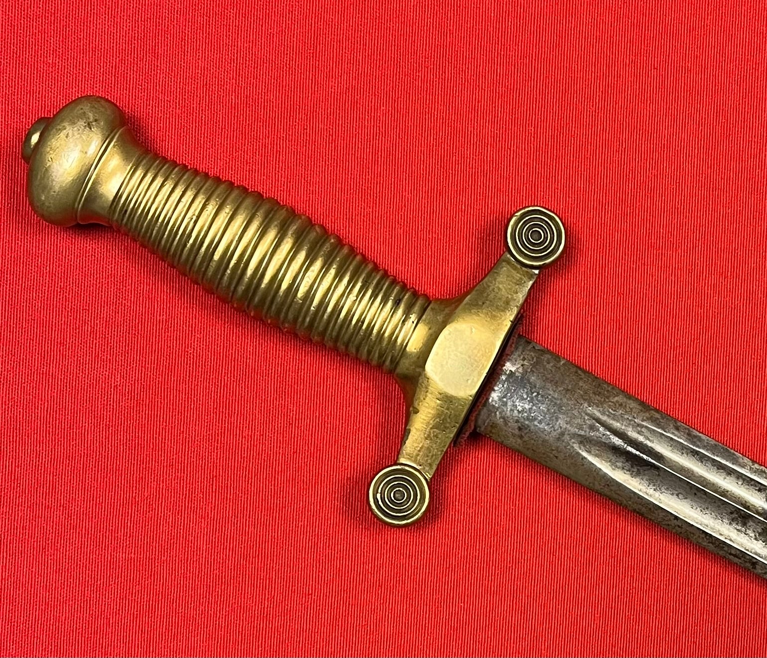 Model 1855 / Russian / Crimean War Era / Brass hilt / 19 1/4 inch blade with a double fuller / Overall length 24 3/4 inches / Piece of fabric on cross guard / No identifying maker marks