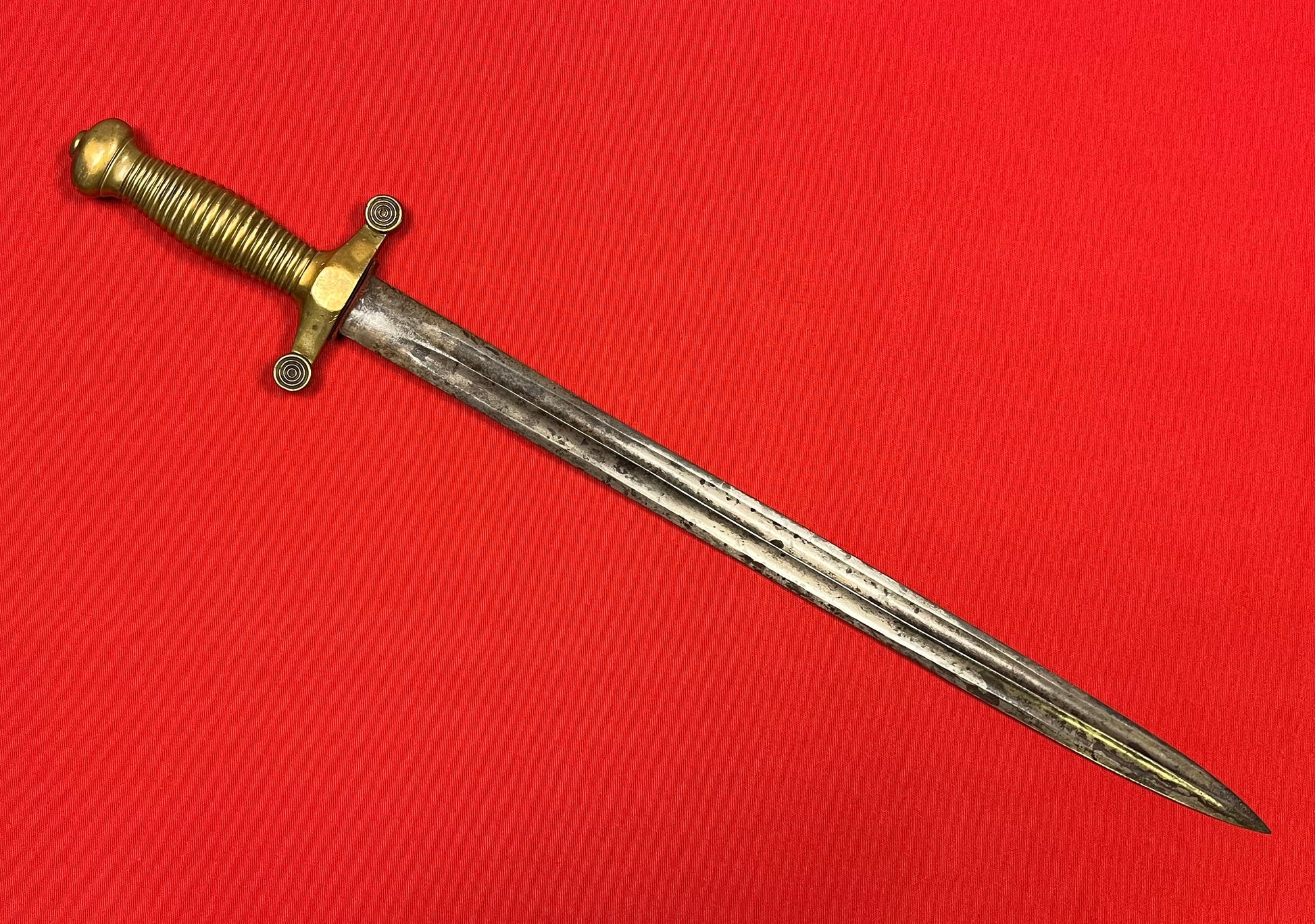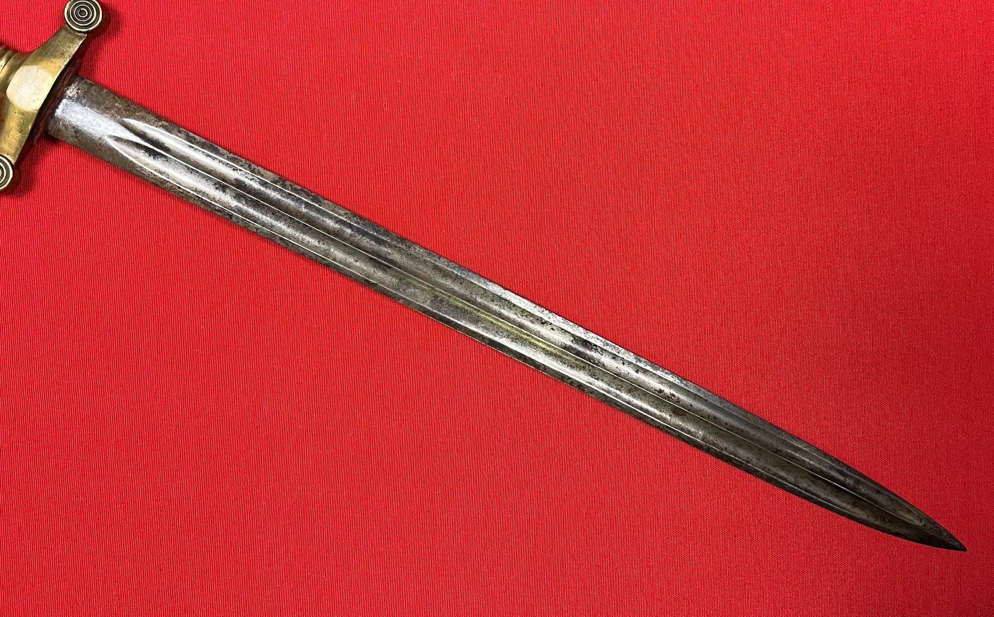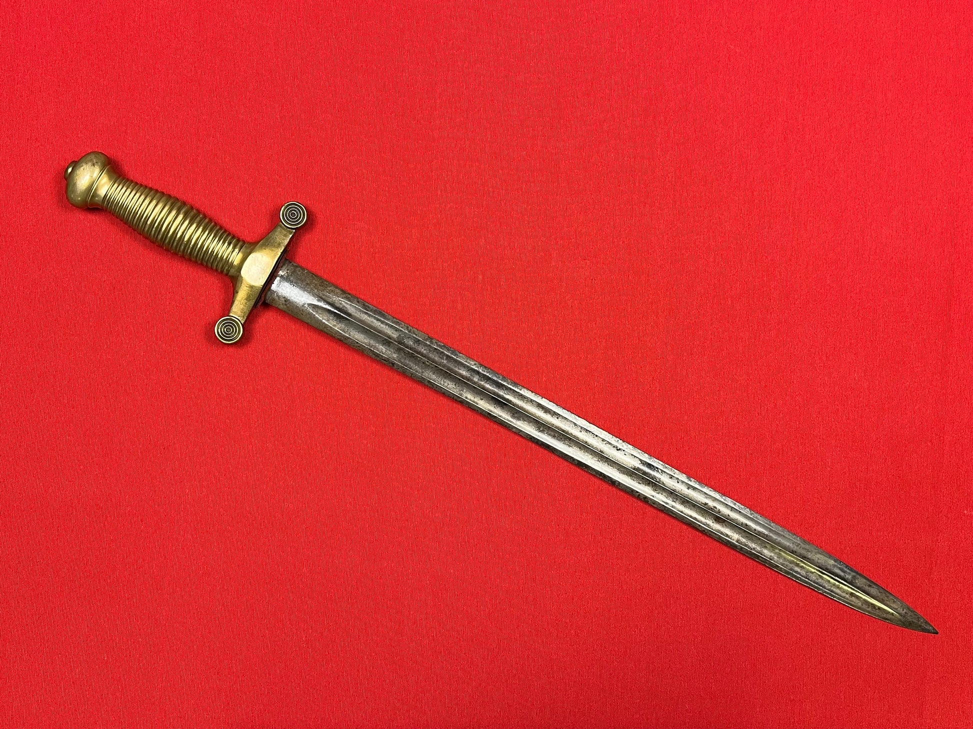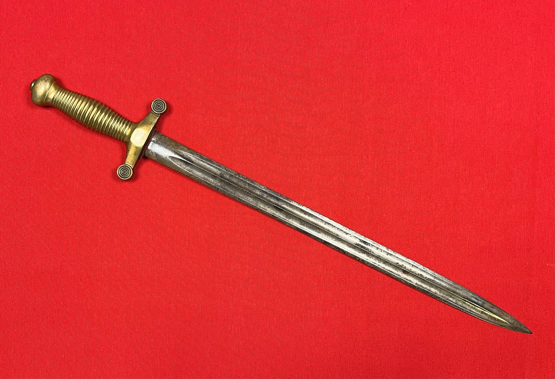Model 1855 / Russian / Crimean War Era / Brass hilt / 19 1/4 inch blade with a double fuller / Overall length 24 3/4 inches / Piece of fabric on cross guard / No identifying maker marks