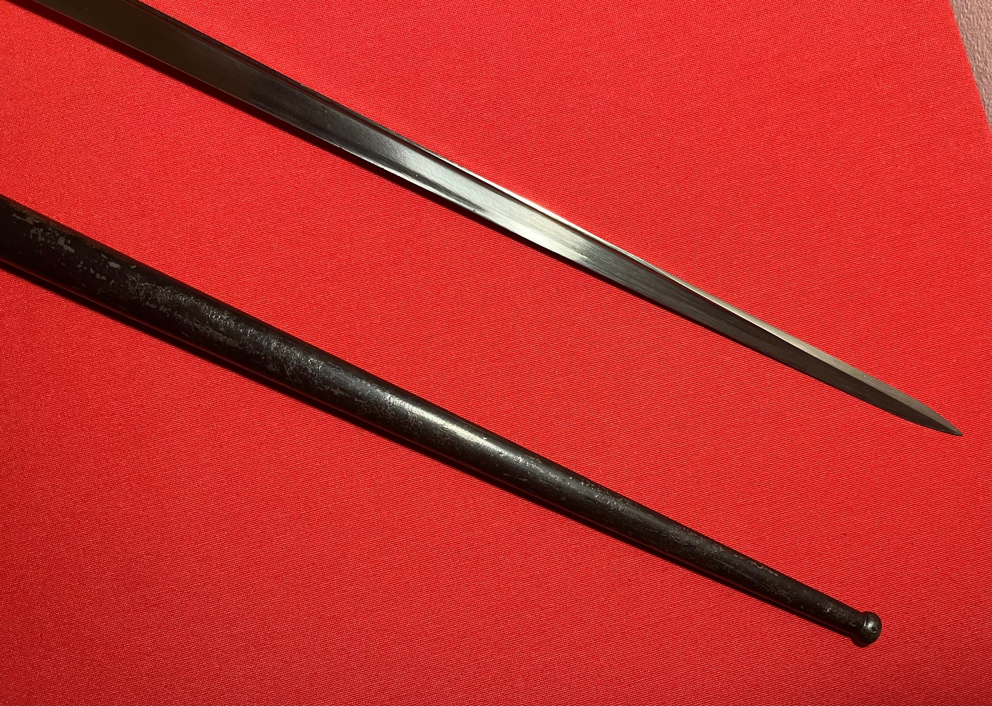 Matching numbers FJ 75314 / Lots of maker & arsenal markings all over this piece!!! Blade is very clan and measures 20 3/4 inches with an overall length of 25 2/4 inches / Scabbard is panted blade