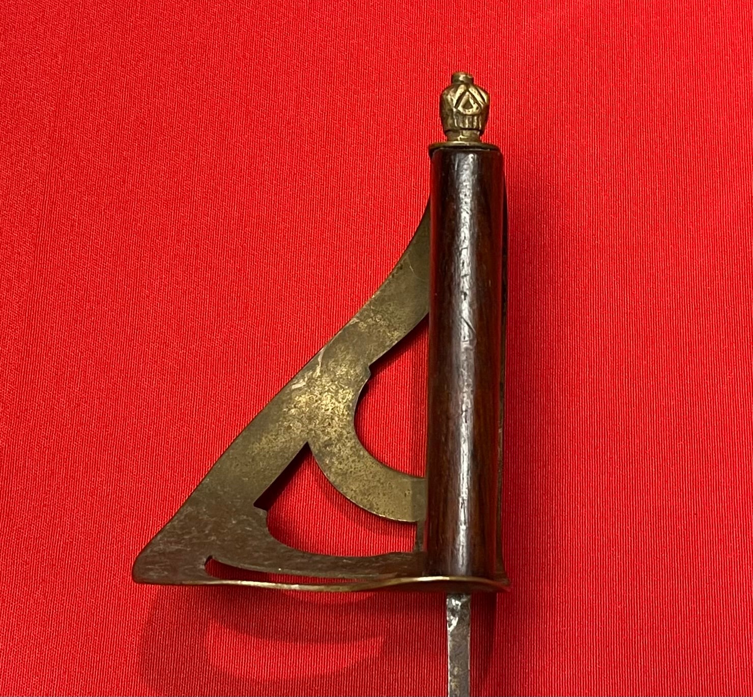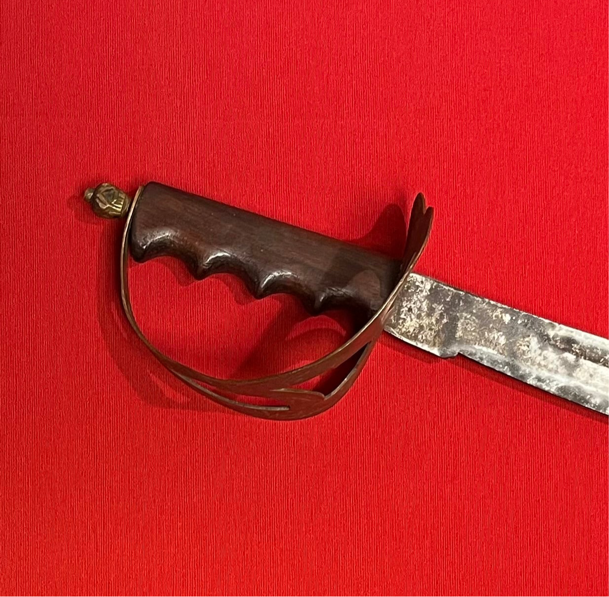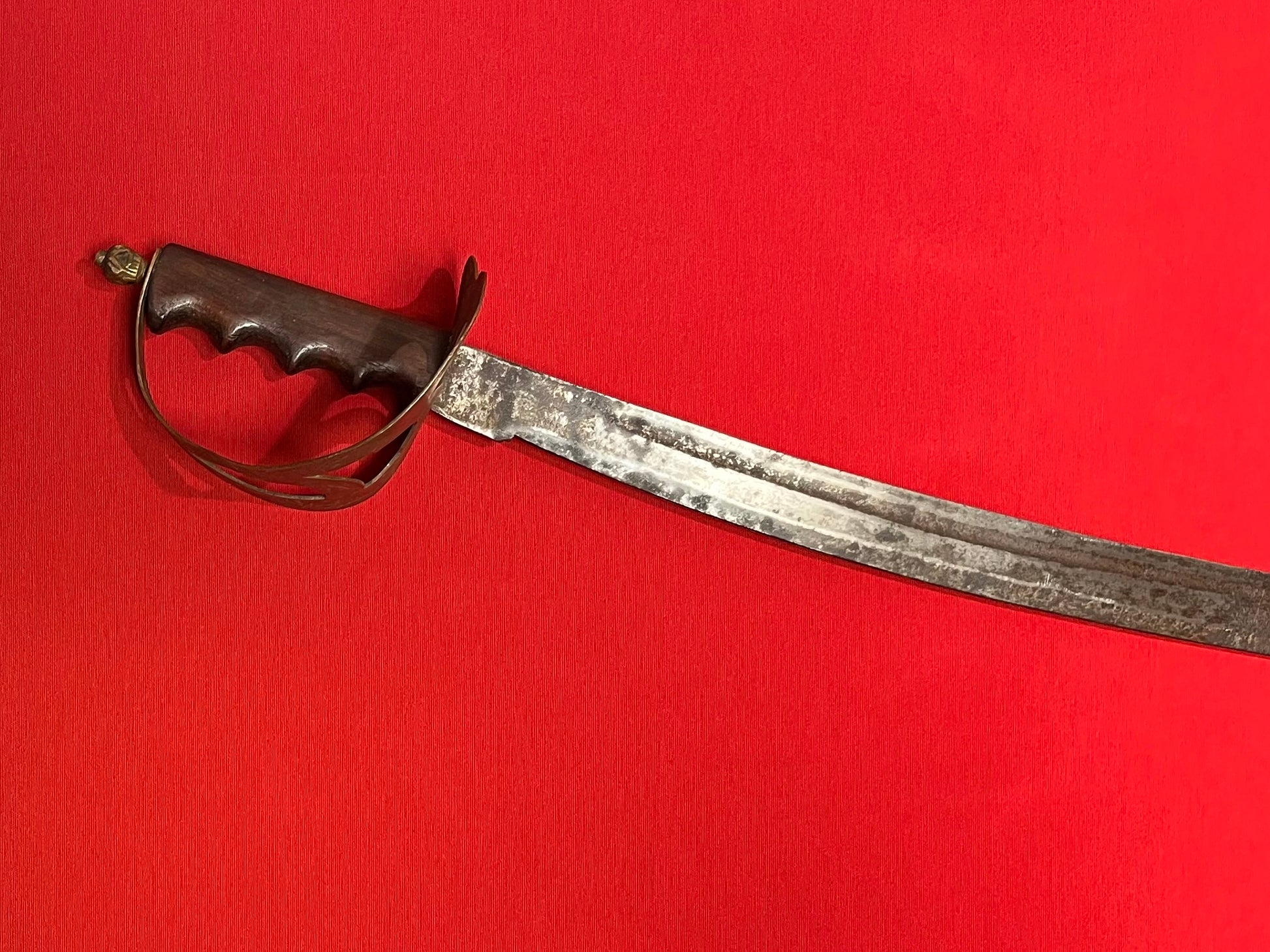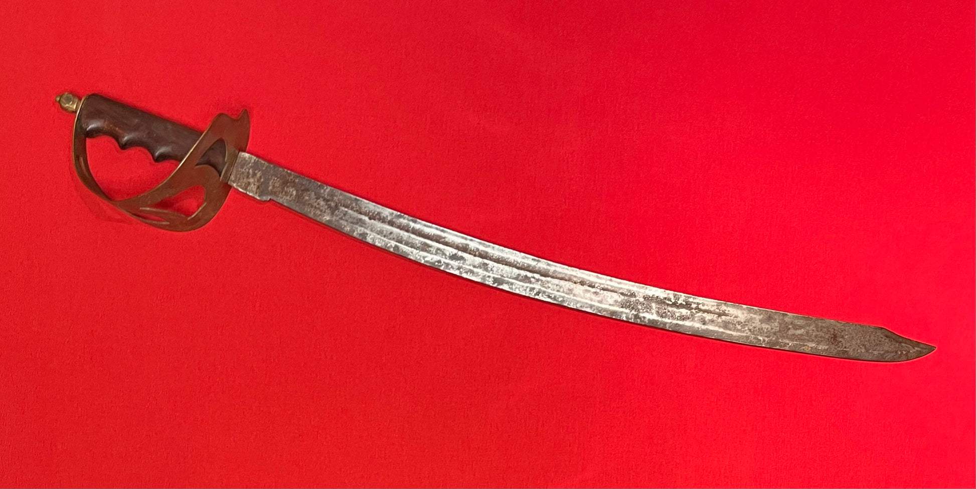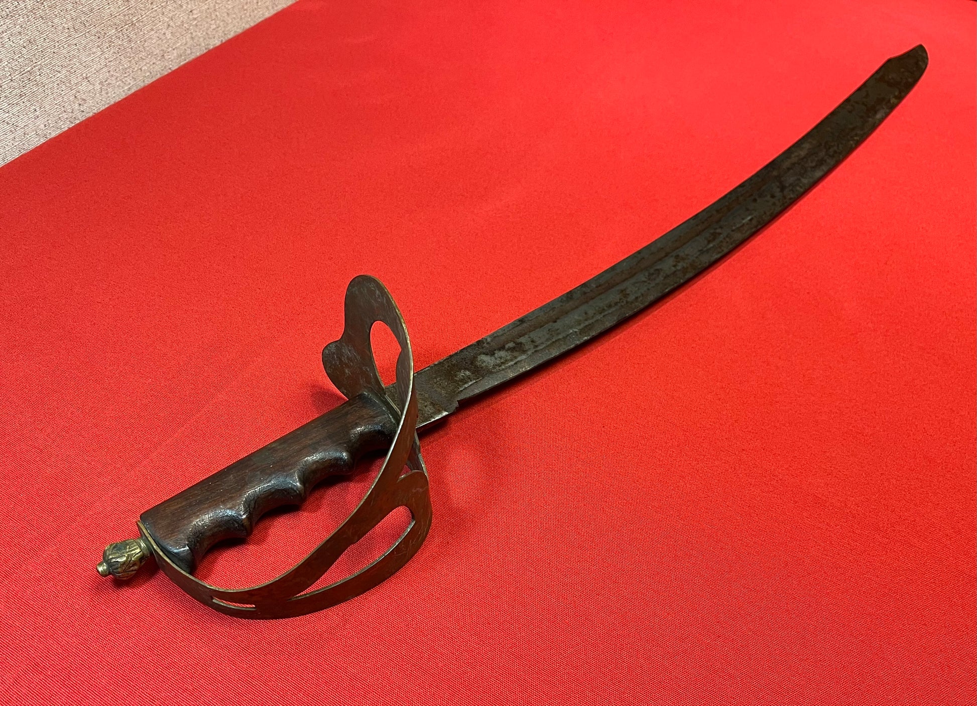 Widely used against the Japanese in WW2 / European (Manufactured by the Dutch) WW1 Era / Dutch Hembrug Klewang Naval Cutlass M1898 / Heavy curved blade / 24 6/8 inches long and 2/8 inch thick / Clipped back point / Ricasso un-marked / Blade has controlled surface rust / Handle is nice and sturdy with "no wiggle" / A wooden handle with "finger groves " has replaced the typical riveted style handle, and a decretive brass pommel added "Trench art modification piece" WW2 era alteration / Overall length is 30 6/8 inches / Please inquire with any questions / Pictures provided