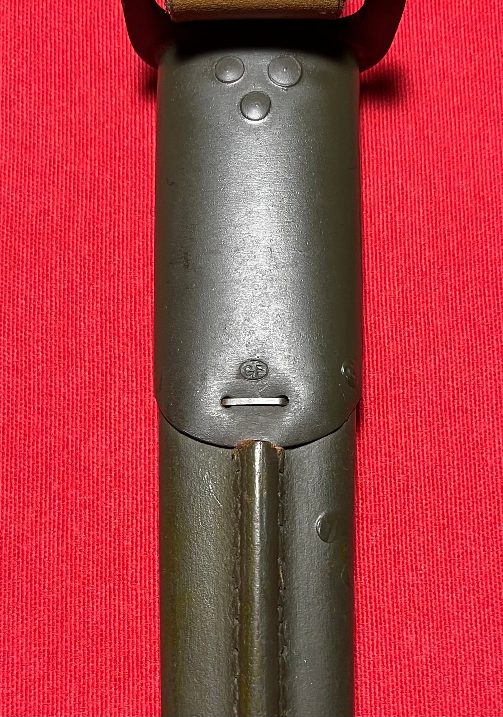 French Foreign Legion (P-17) Fighting Knife - Made by cutting down a WWI 1913 Remington bayonet for use by the French Foreign Legion and regular French Army / Unissued / NOS / Cut-Down / 12 inches overall / Blade 7 3/8 inches / Parkerized / Minty / 1913 5 17 Remington markings on the blades surface / No signs of use or wear / Scabbard is a cut-down M1917 original and "converted" to adapt the smaller modification / GF stamp located on scabbard
