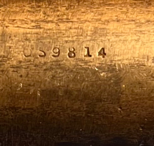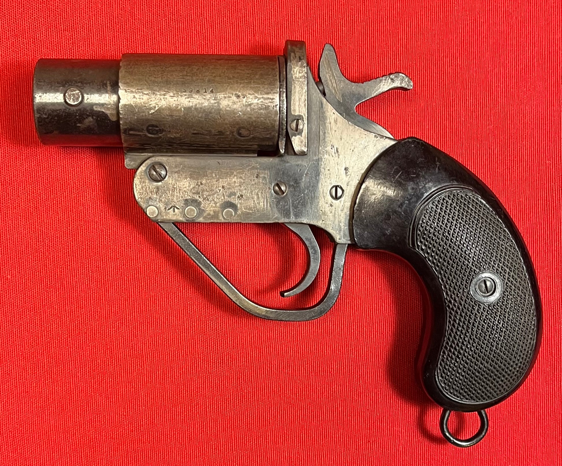 This example is in good condition, with very nice plastic/bakelite grips and intact lanyard ring. The side of the barrel is stamped with serial number 059814 and there are proof marks on the pistol. Pistol appears to be fully functional, with no mechanical issues. Does show age. Ready to display!