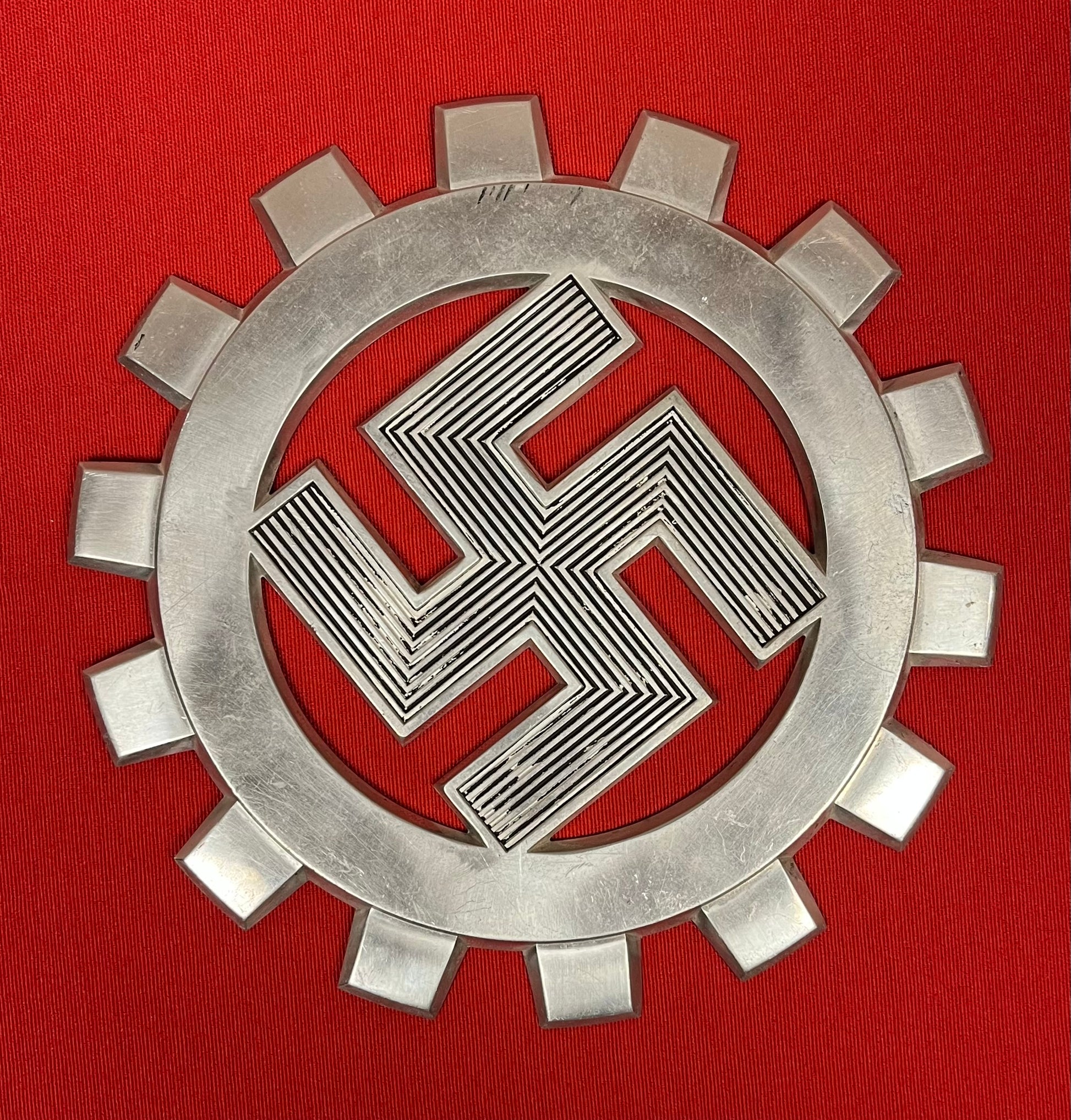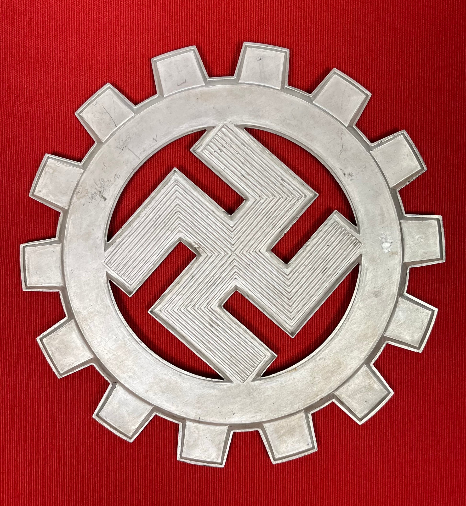 With the dissolution of all Free Trade Unions in Germany in May 1933 the Deutsche Arbeitsfront, (German Labor Front), was established to replace the unions and to educate the workers in industry and commerce for smooth and efficient operation of all labor in the Third Reich. In October 1934 the DAF was given official status as a sub-section of the NSDAP and in March 1936 it was recognized as an independent NSDAP affiliated association and granted control of its own monetary budget. With this money it was able to procure its own signs and other insignia.