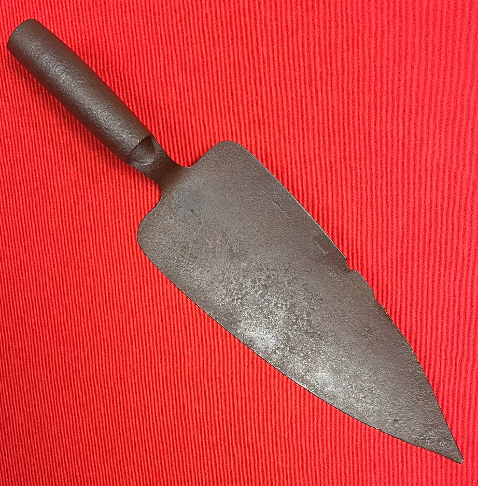 The trowel blade is 10-inch long and 3 3/8 inches wide, with a reinforced spine and overall length of 14 1/4 inches. The blade has some areas of controlled rust and damage to the right cutting edge.