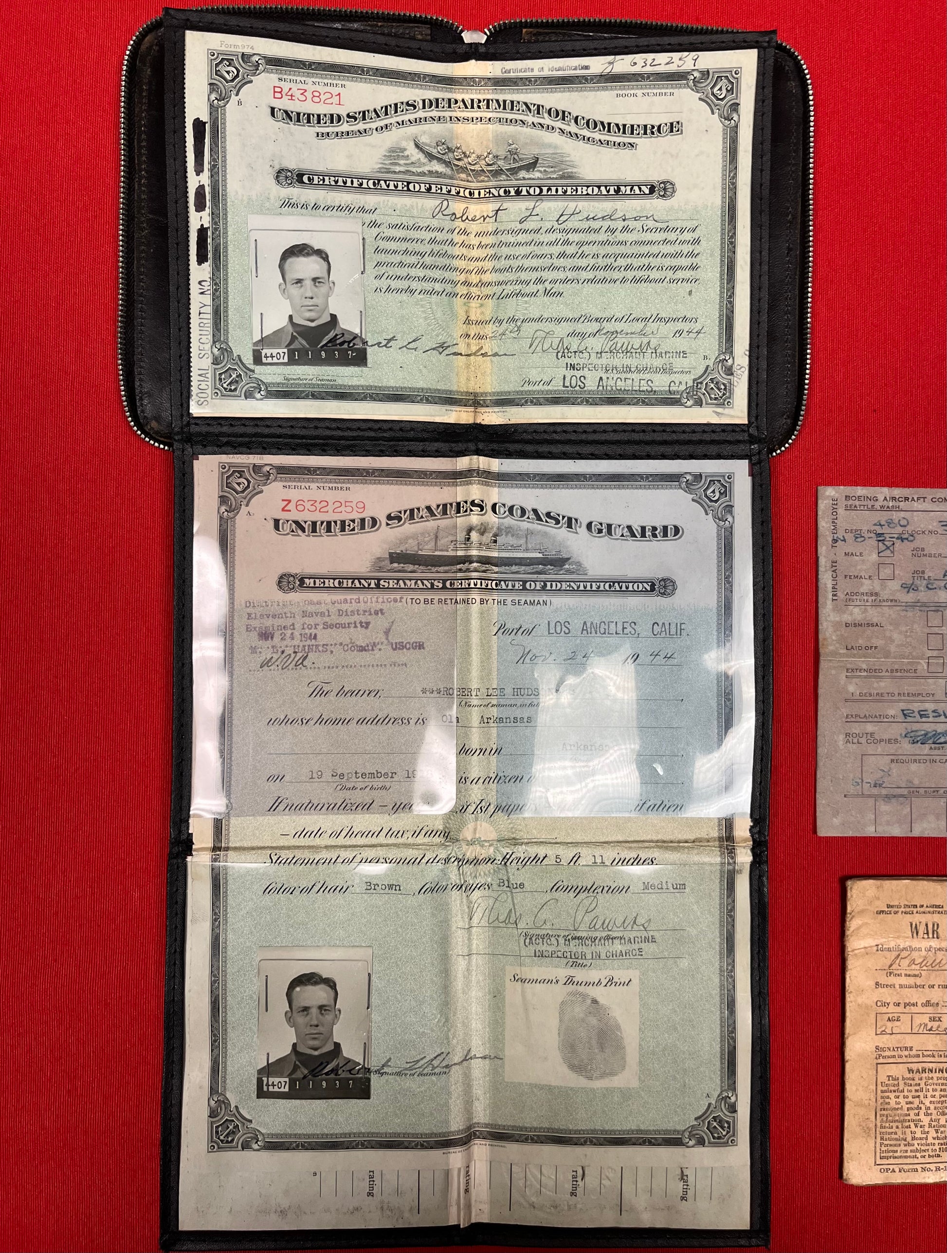 1944 / US Coast Guard / Merchant Marine / WW2 Era / Documents, photos, and seaman’s wallet of Robert L Hudson / Great display piece / Size 6 x 4.50 inches