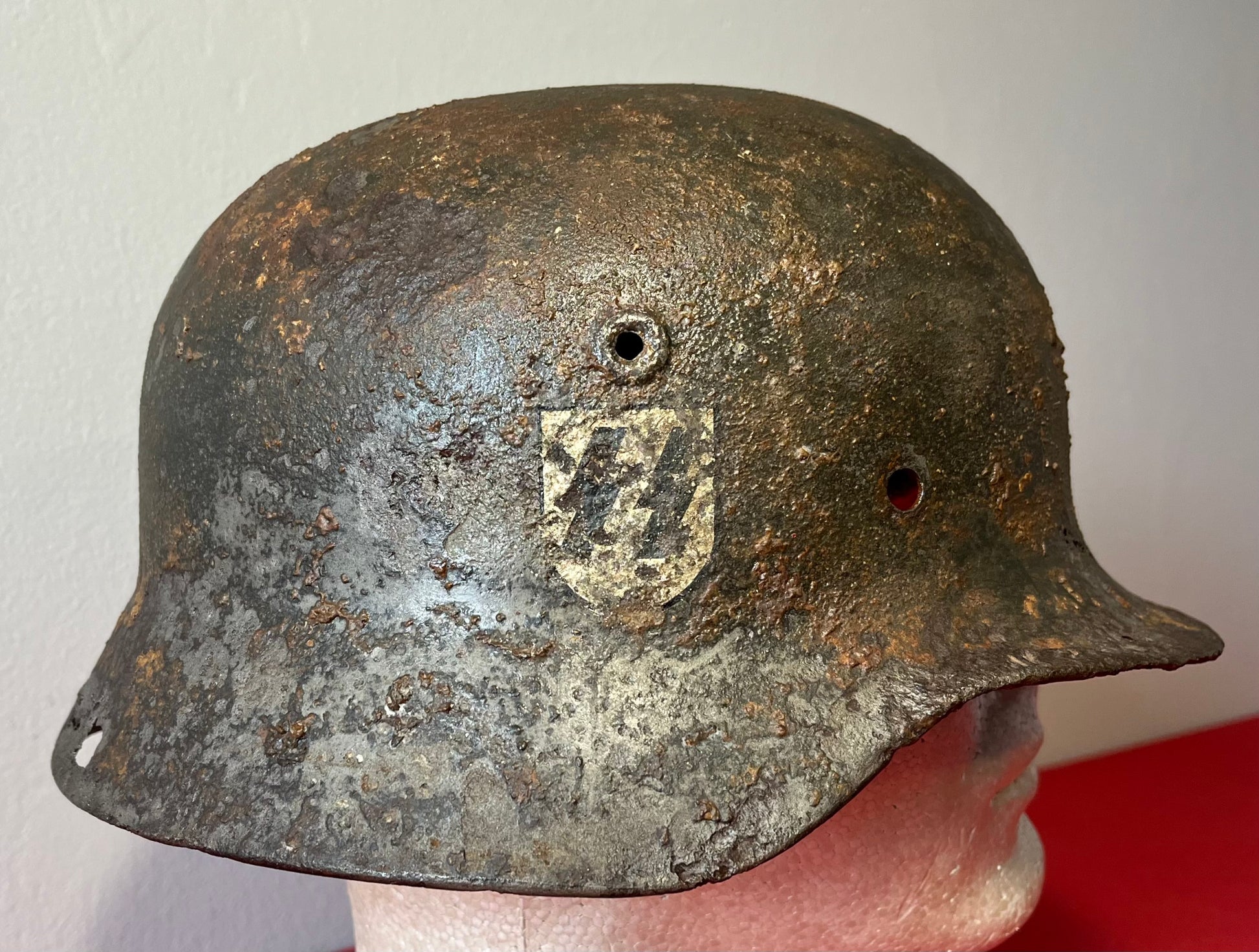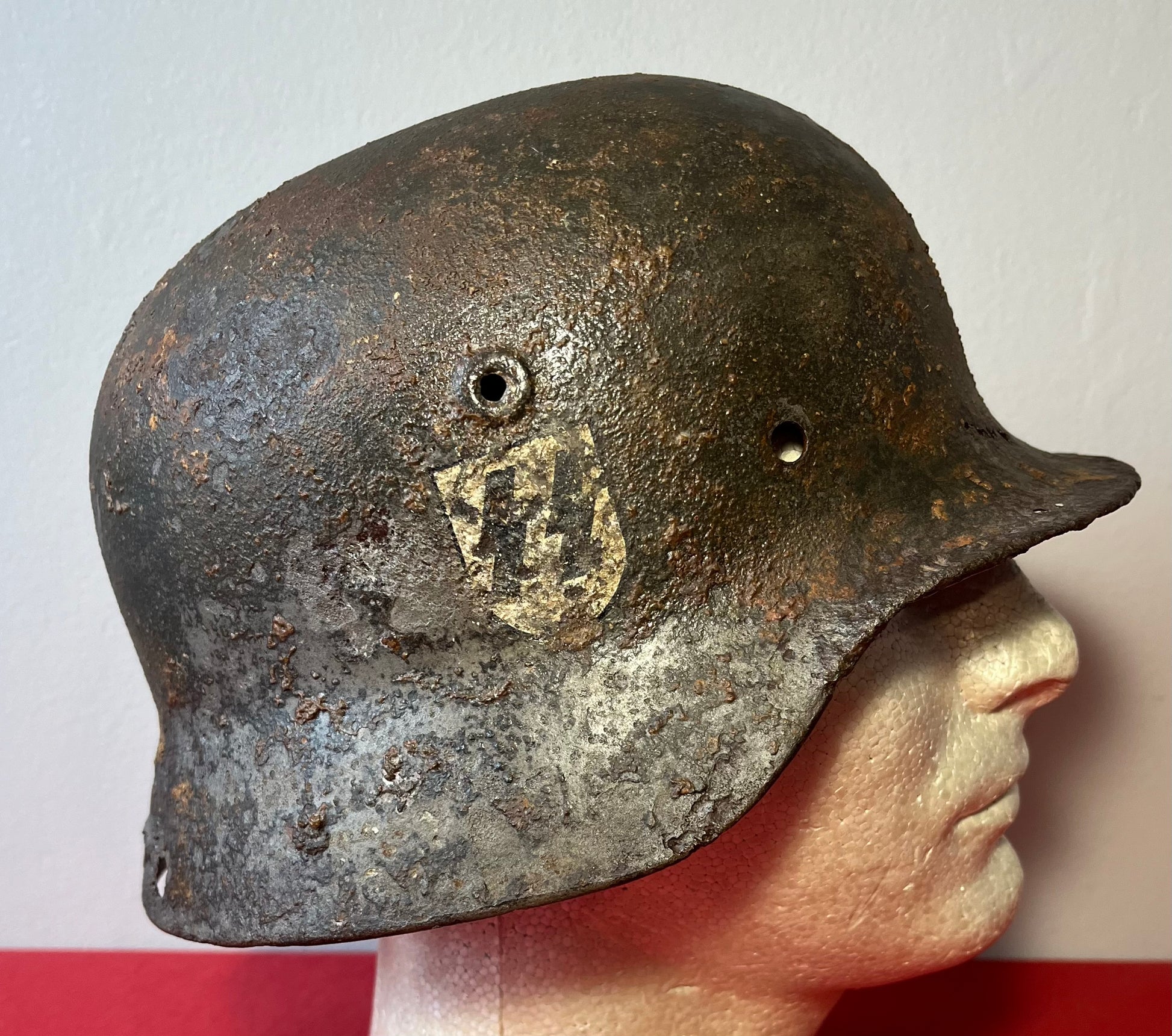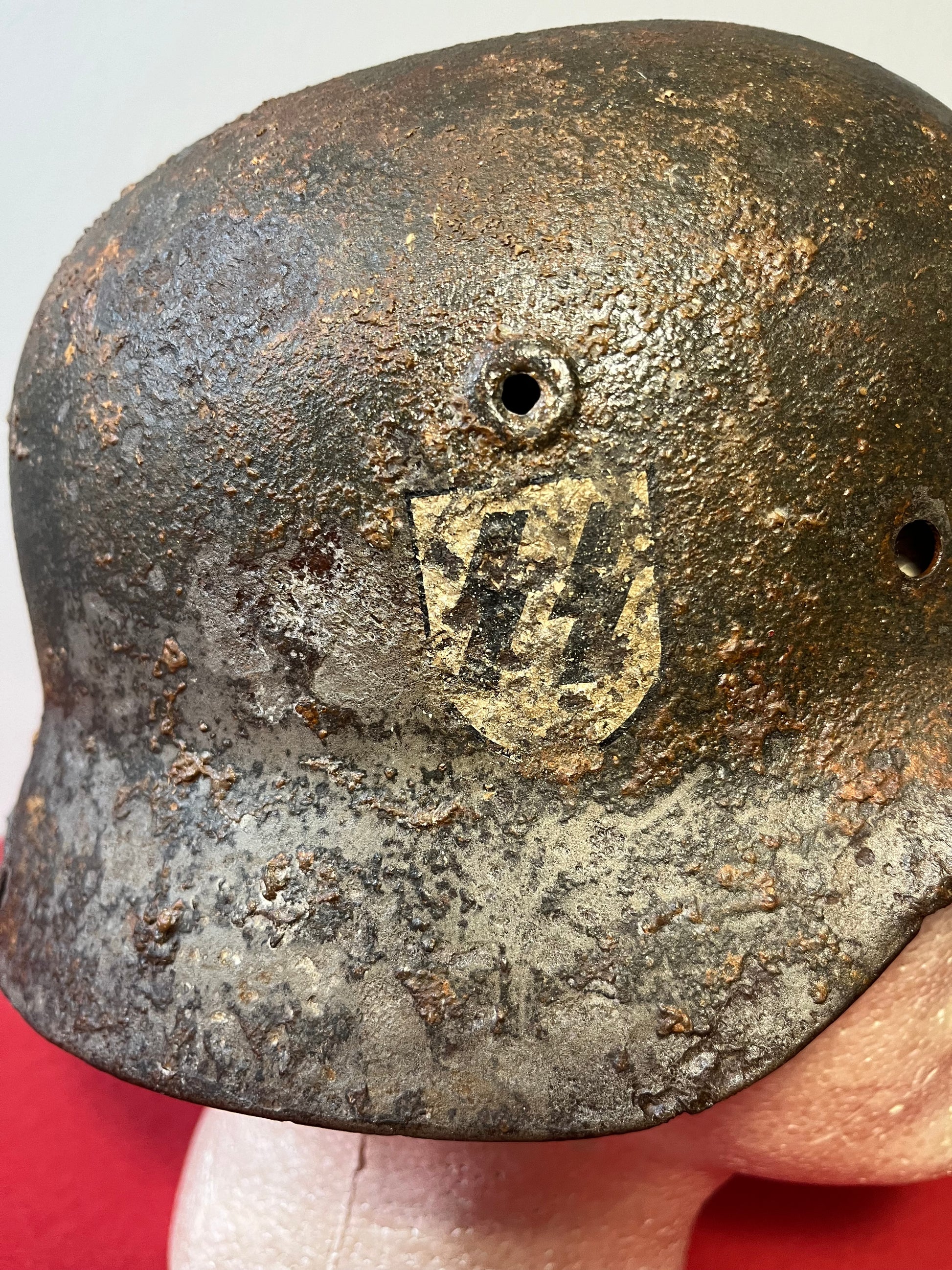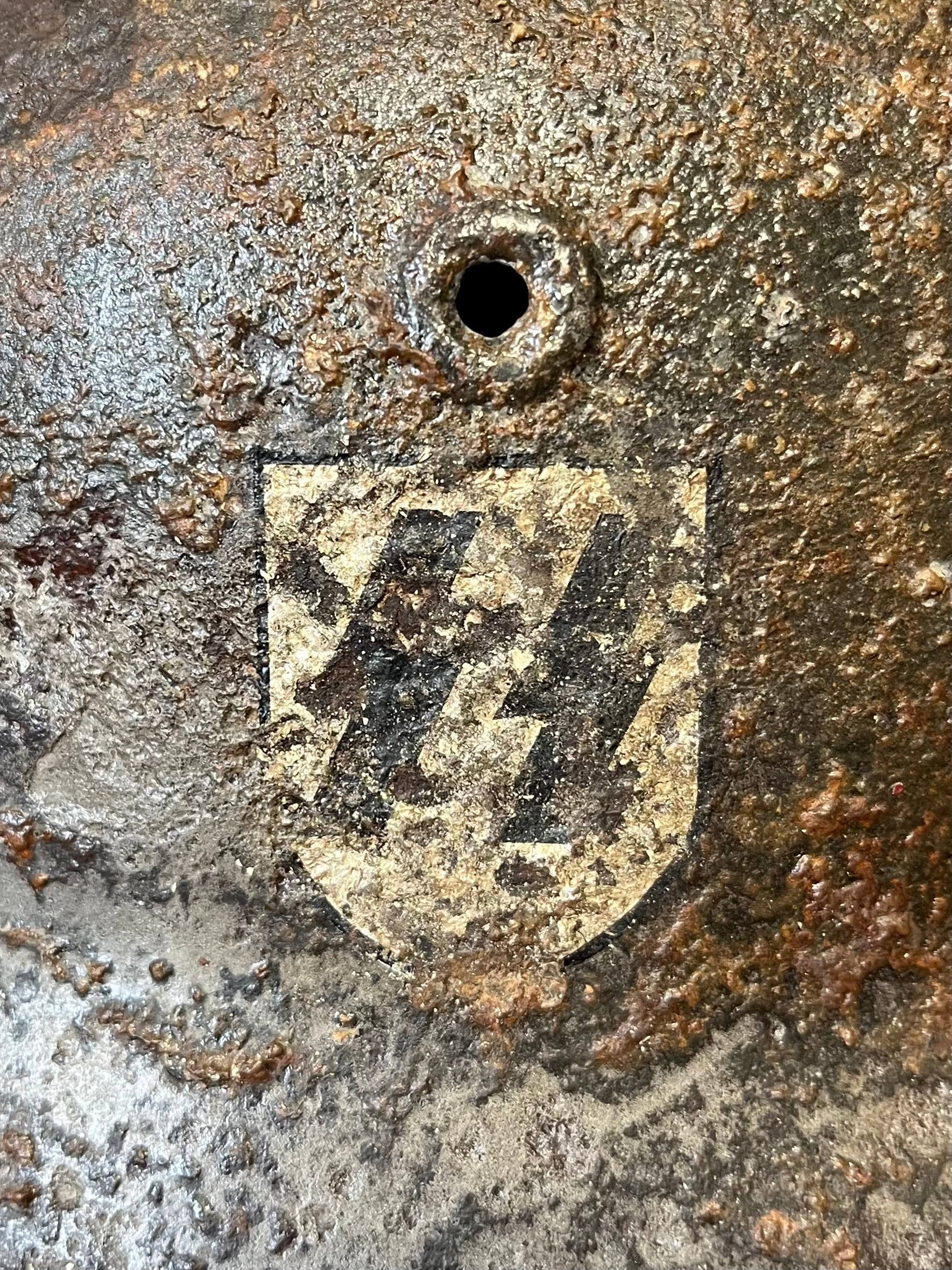Authentic / WW2 German helmet / Relic condition / Heat stamp numbers still slightly showing inside / Helmet is nice and solid with active rust areas controlled / A couple small holes / No Liner / SS insignia was applied post war for aesthetics
