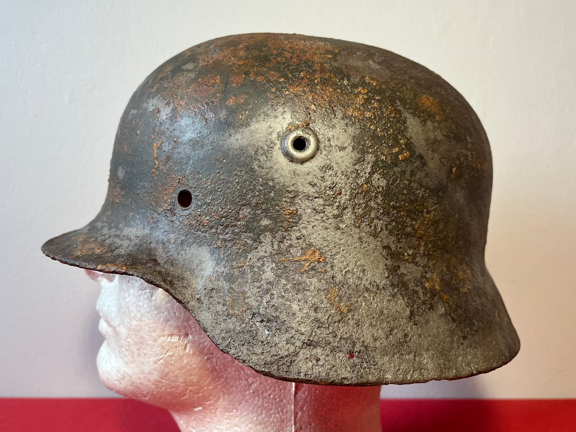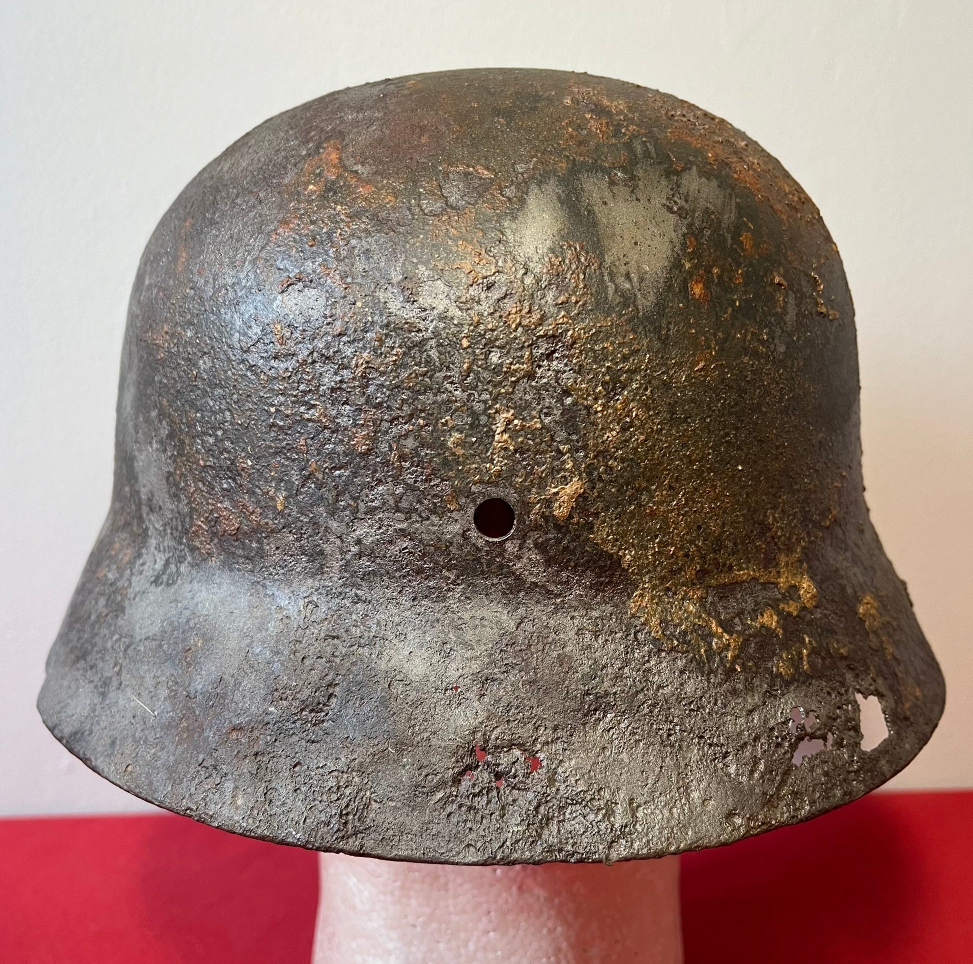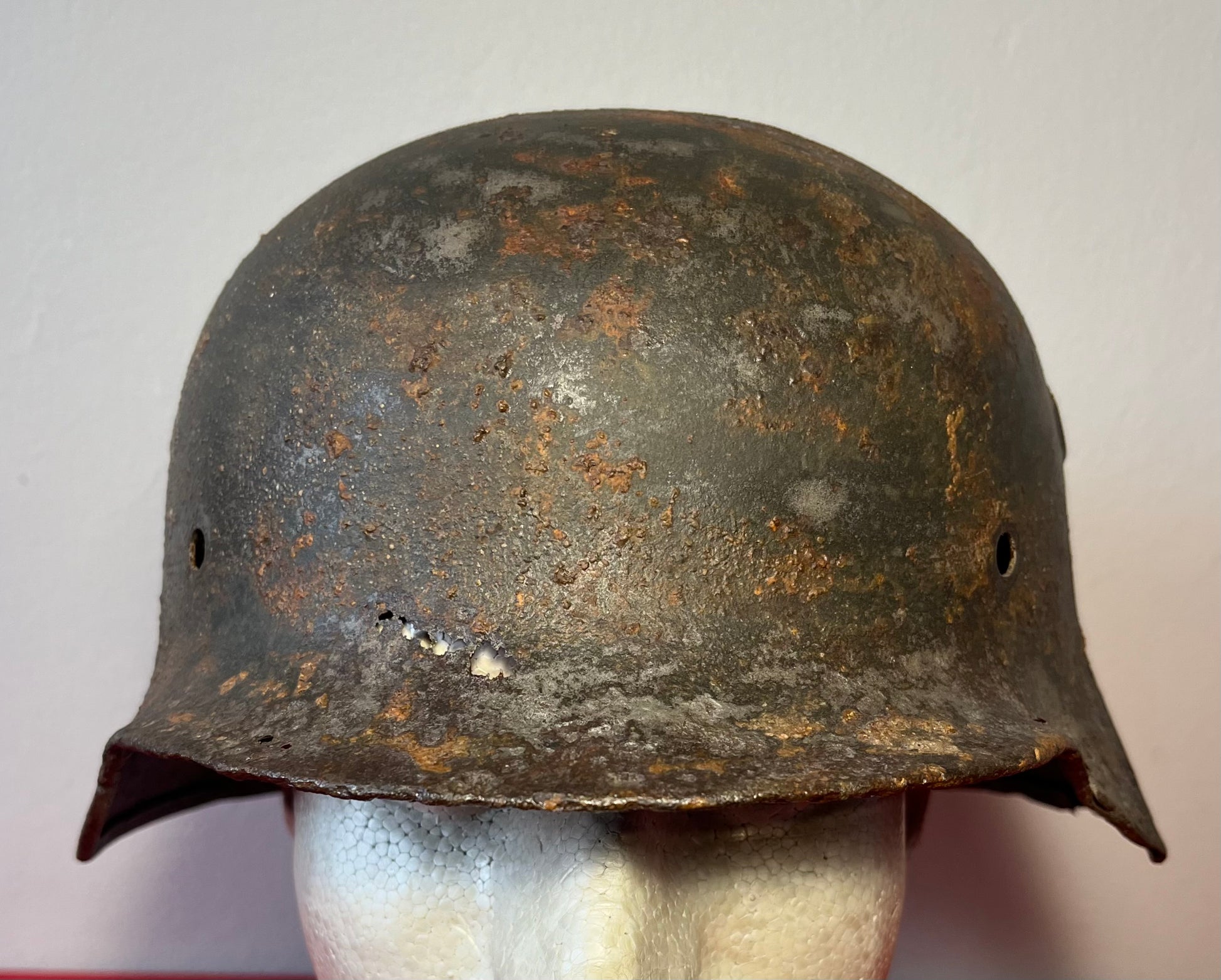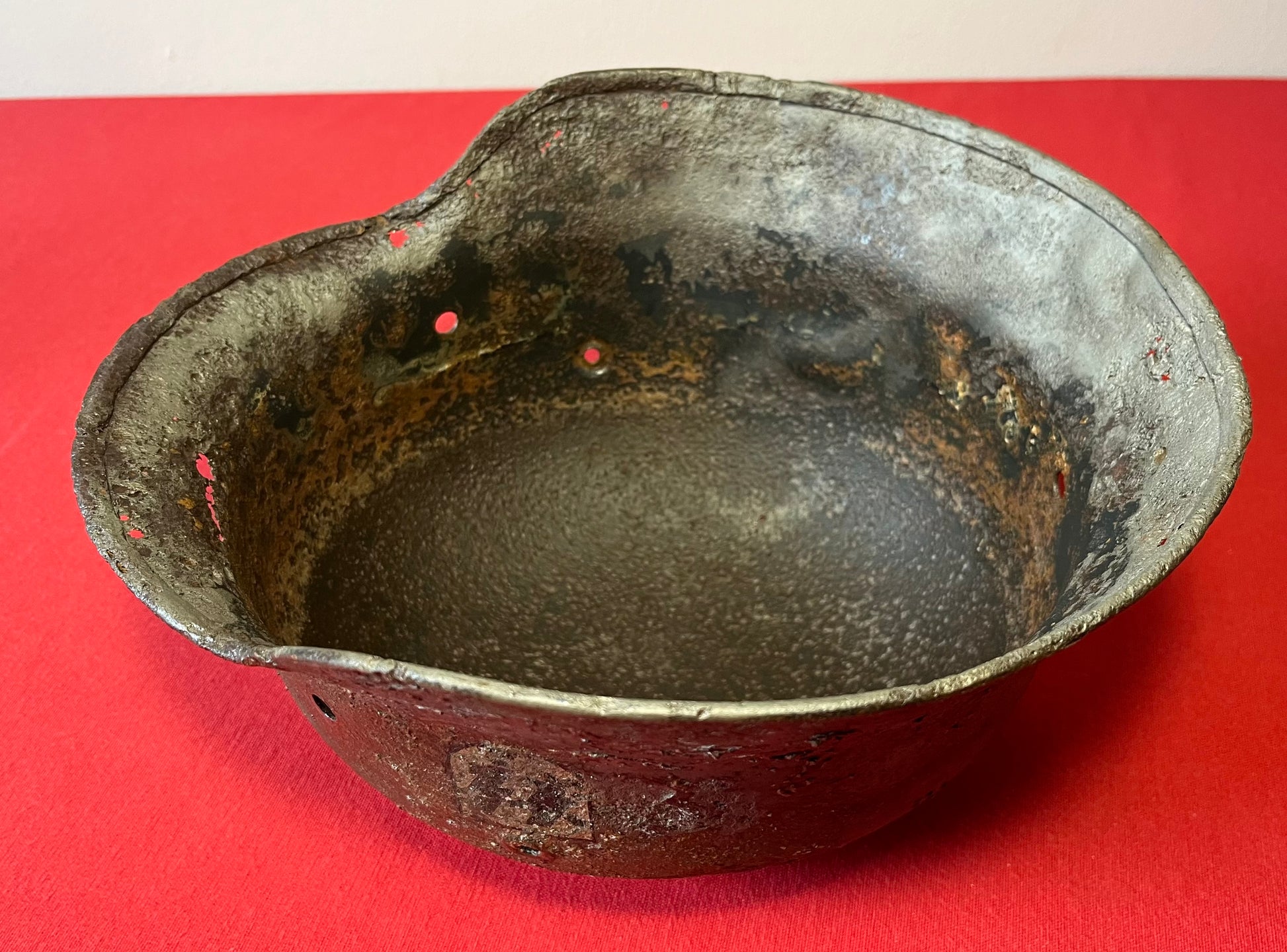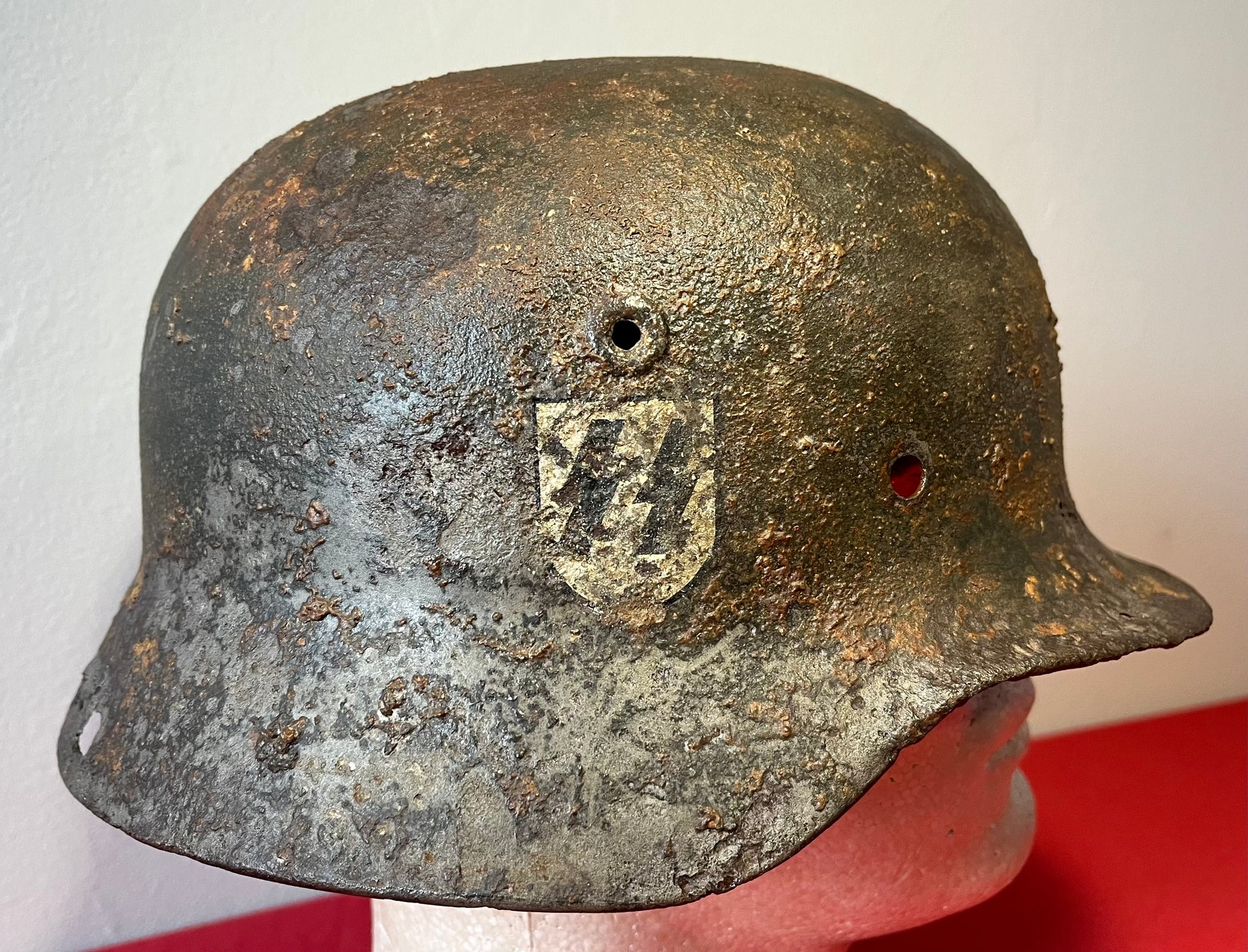 Authentic / WW2 German helmet / Relic condition / Heat stamp numbers still slightly showing inside / Helmet is nice and solid with active rust areas controlled / A couple small holes / No Liner / SS insignia was applied post war for aesthetics