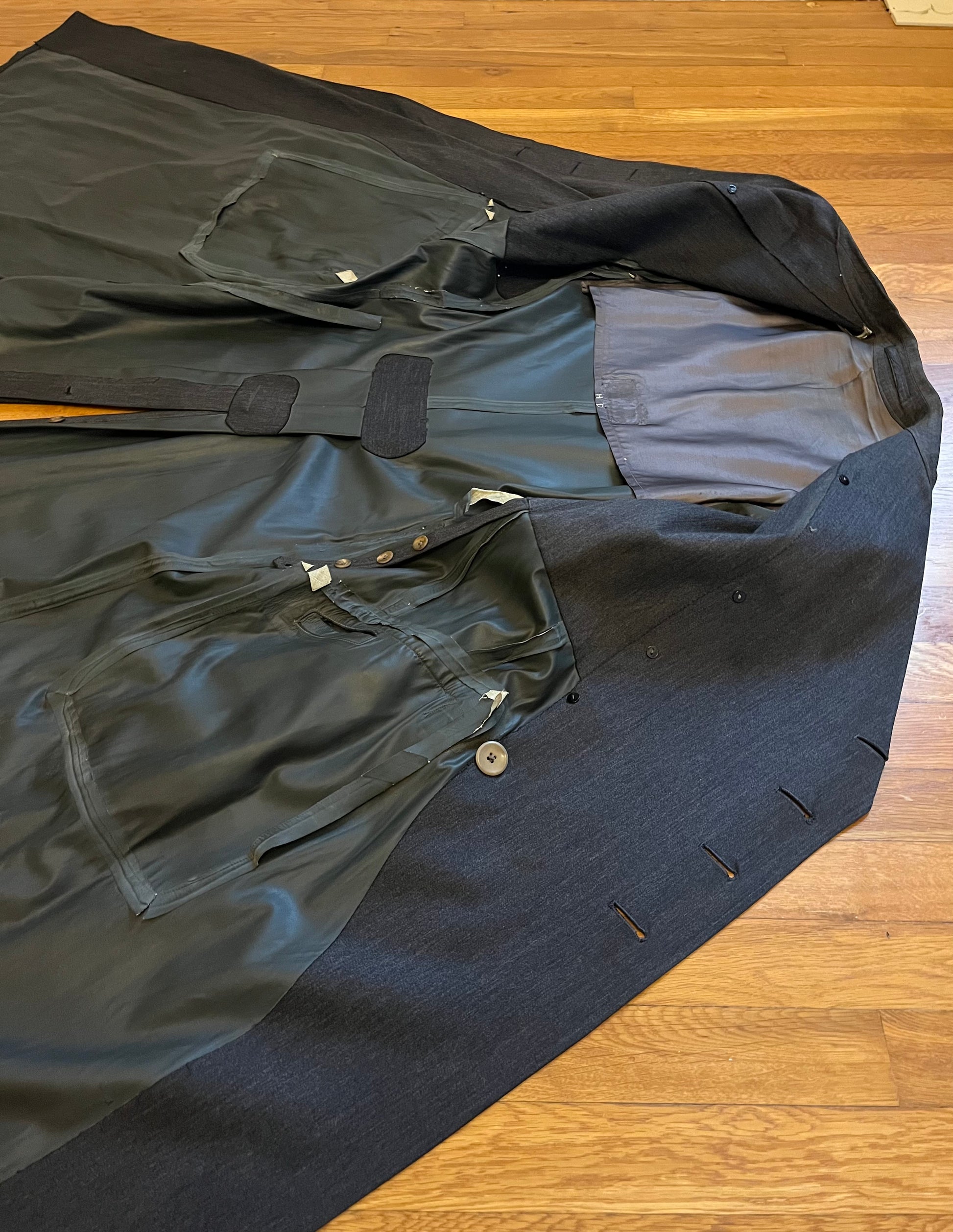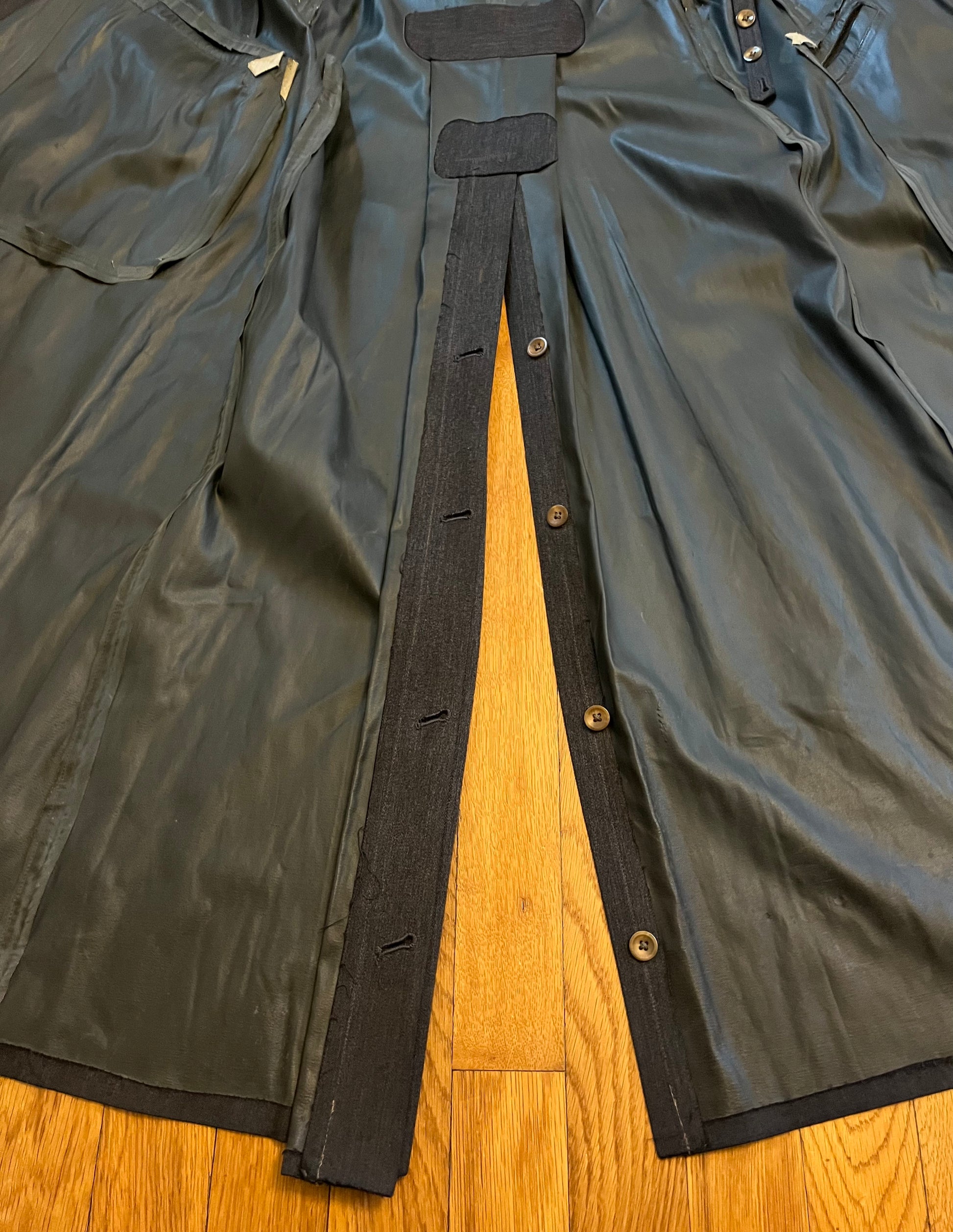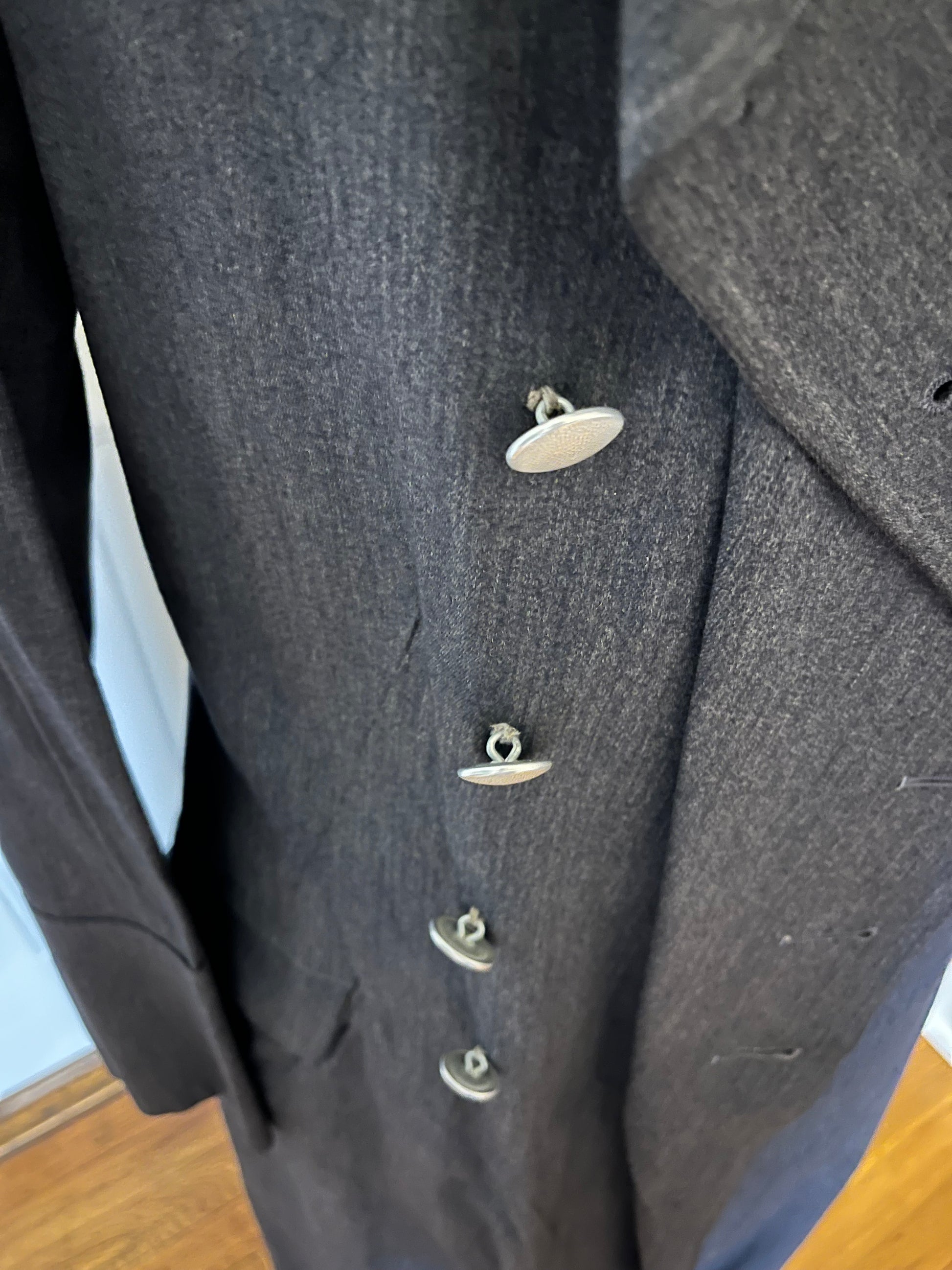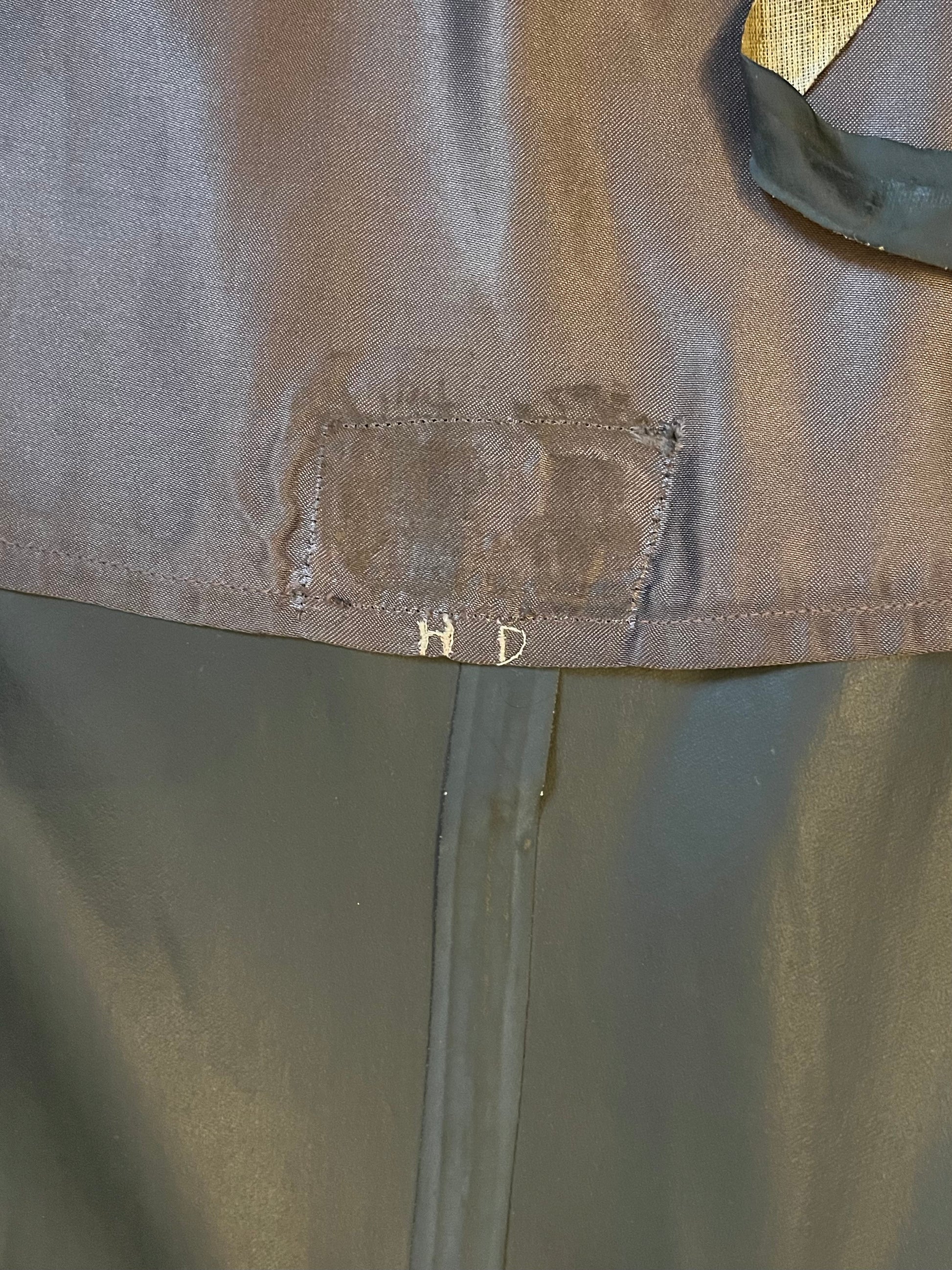 Original / WW2 German Luftwaffe (Air Force) Made of a rubberized material / Hand Sewn Initials where the tag once was, "H.D" as well as a name on the reverse side of the inner liner (shown in pictures) The buttons are all present and manufactured by Assmann Sohne Ludenscheid / Size - shoulder to shoulder seam 18 Inches / 52 Inches long / Arm 26 Inches / Chest 20 Inches "across" Condition - Inner liner has two waterproof strips hanging by a couple inches where the glue has release and a small wear spot on the right arm / The presence of existing shoulder boards are visible by some threads left around both shoulders / 100% Authenticity Guarantee / Please inquire with any questions